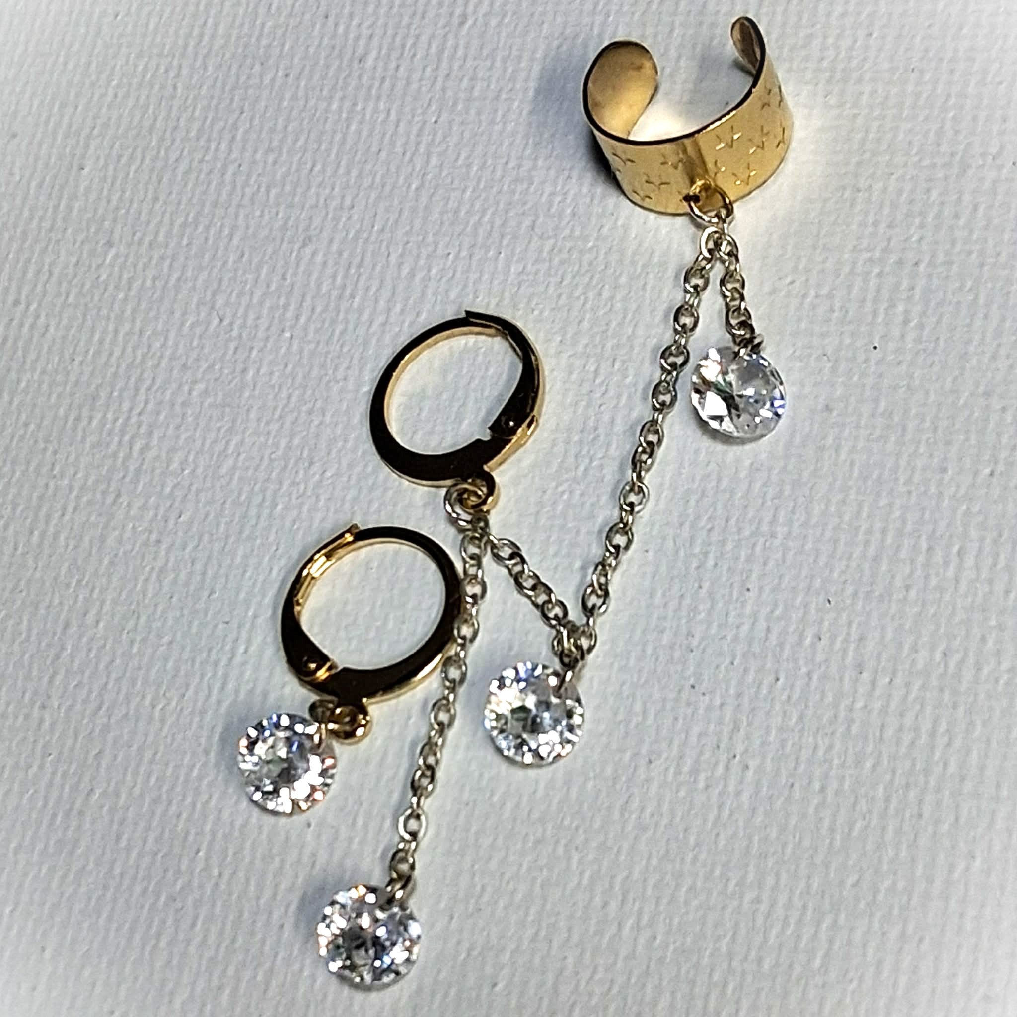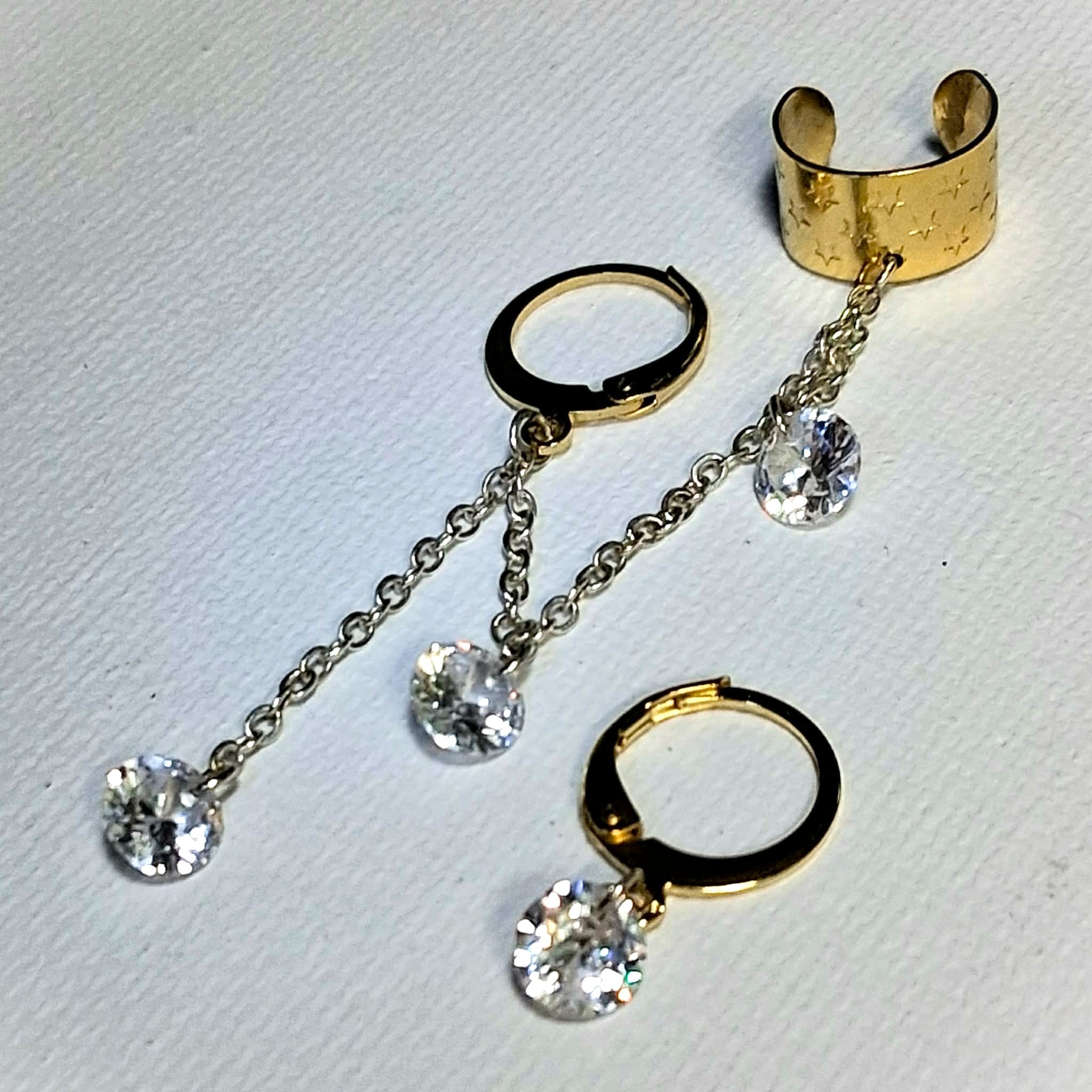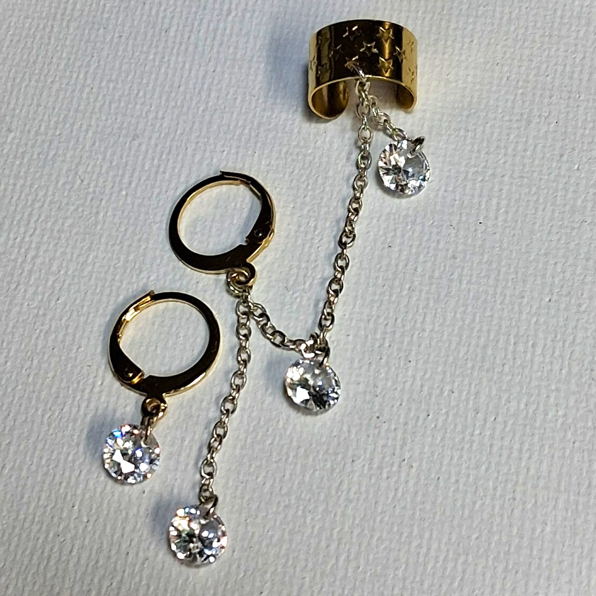 Description: Inspired by the hit song 'Twilight Zone' by Golden Earring.  Dangling from a 24k gold plated star embossed ear cuff is a sterling silver plated cable chain speckled with 3 sparkly 6mm clear crystals ending at an 18k gold plated leverback circle earring.  Wear along or use the accompanying matching 18k gold plated leverback circle earring w/ single 6mm clear crystal.