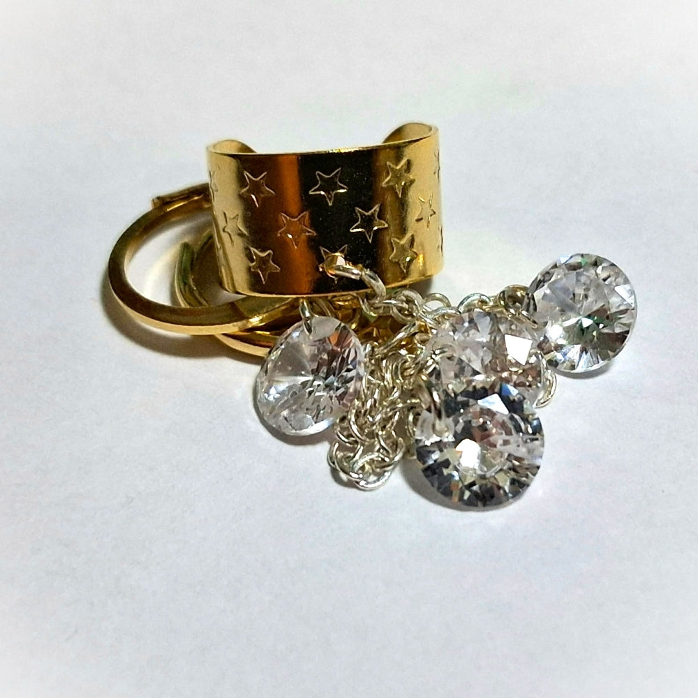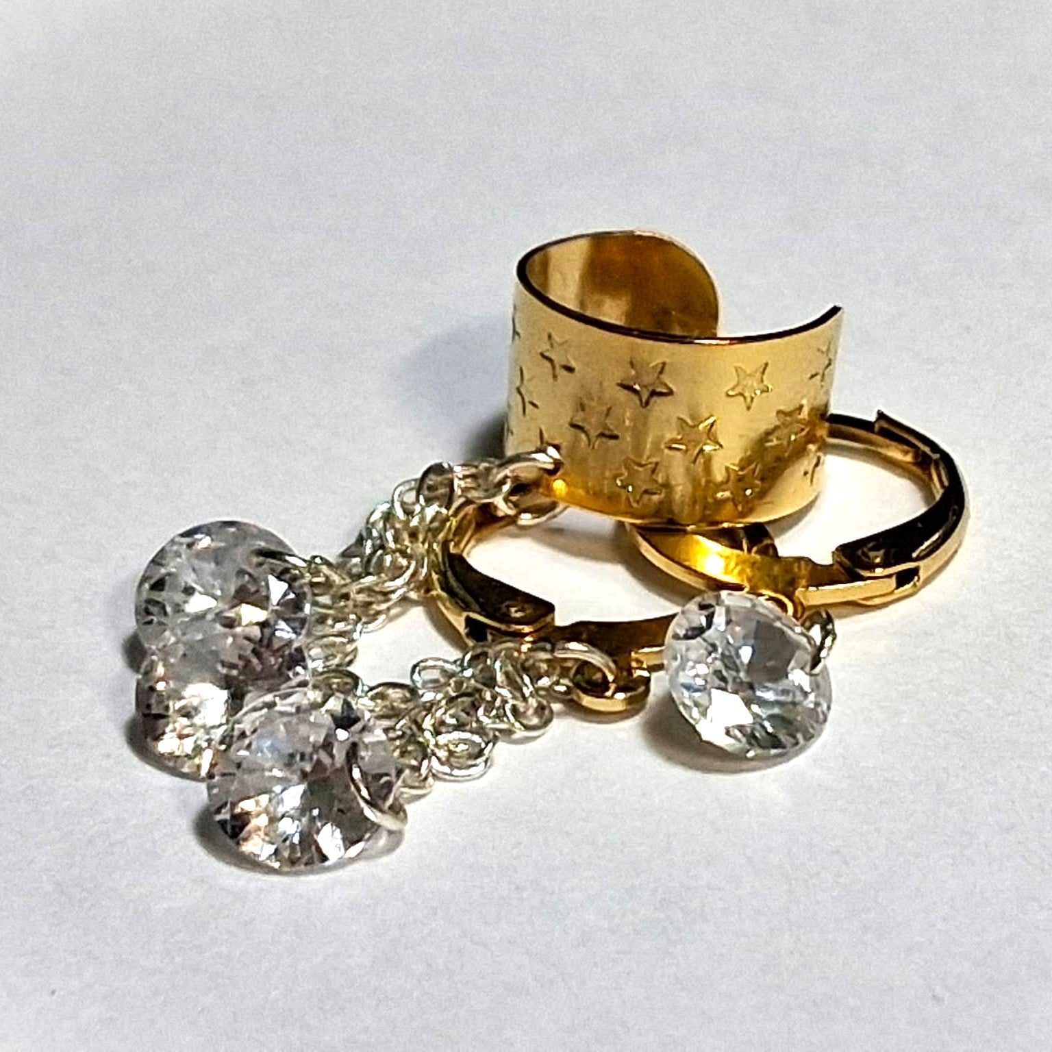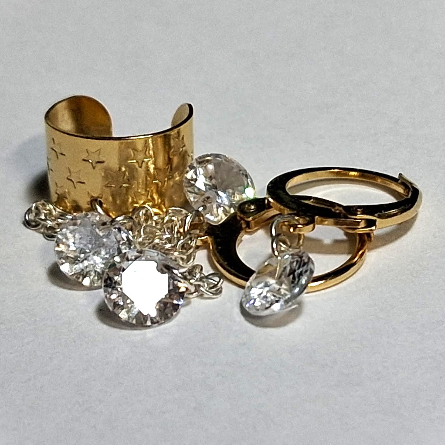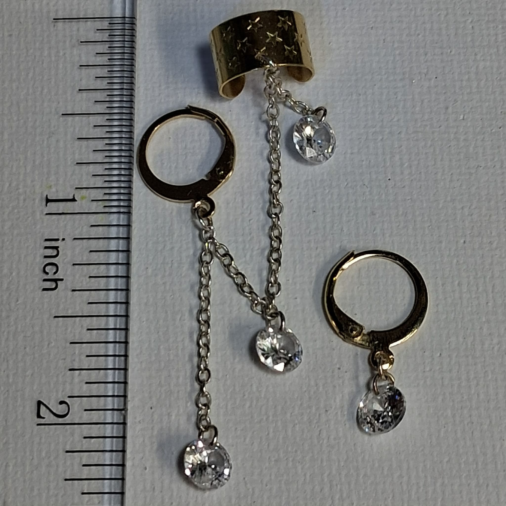 Description: Inspired by the hit song 'Twilight Zone' by Golden Earring.  Dangling from a 24k gold plated star embossed ear cuff is a sterling silver plated cable chain speckled with 3 sparkly 6mm clear crystals ending at an 18k gold plated leverback circle earring.  Wear along or use the accompanying matching 18k gold plated leverback circle earring w/ single 6mm clear crystal.