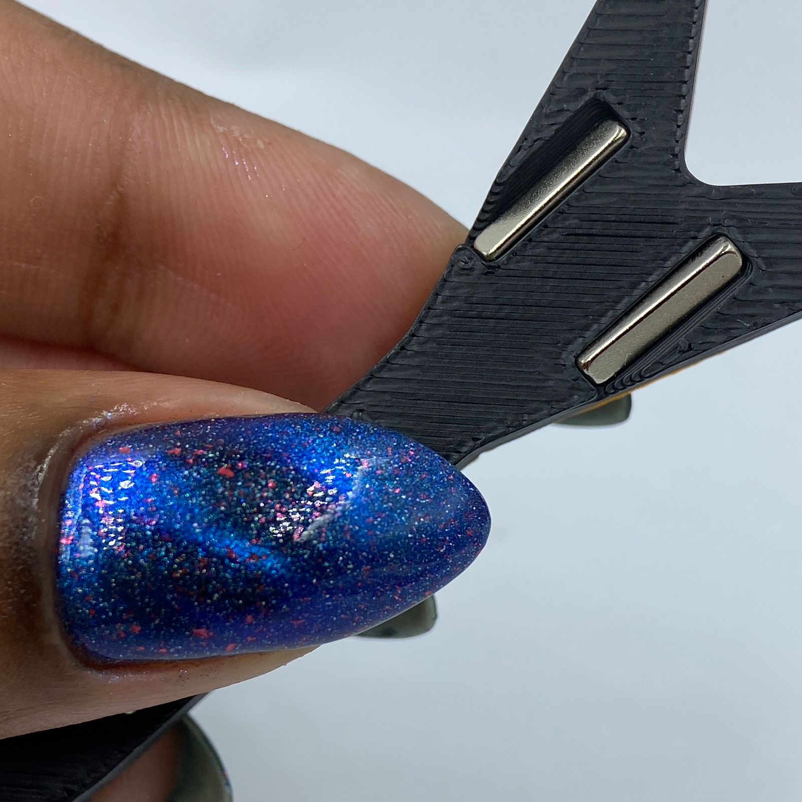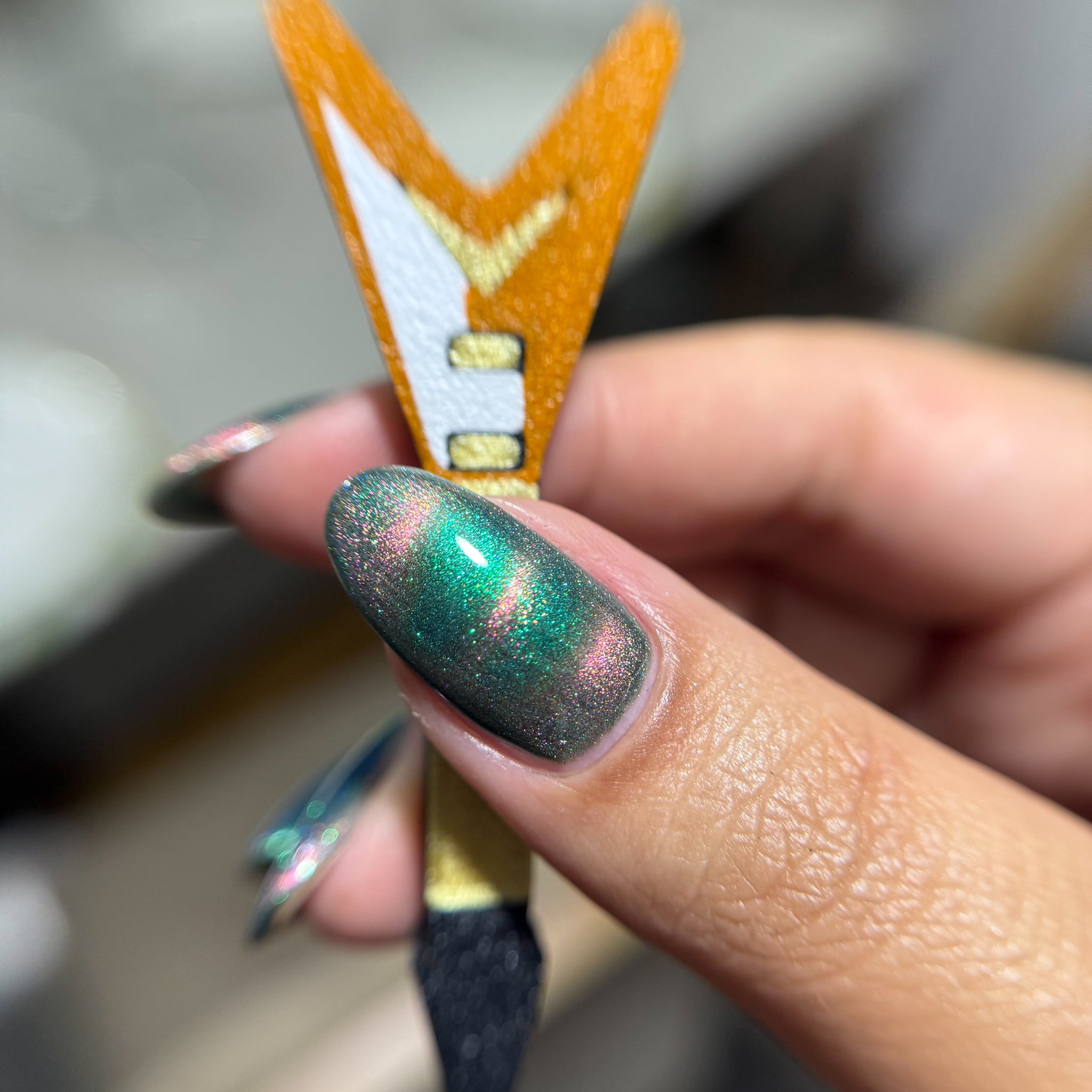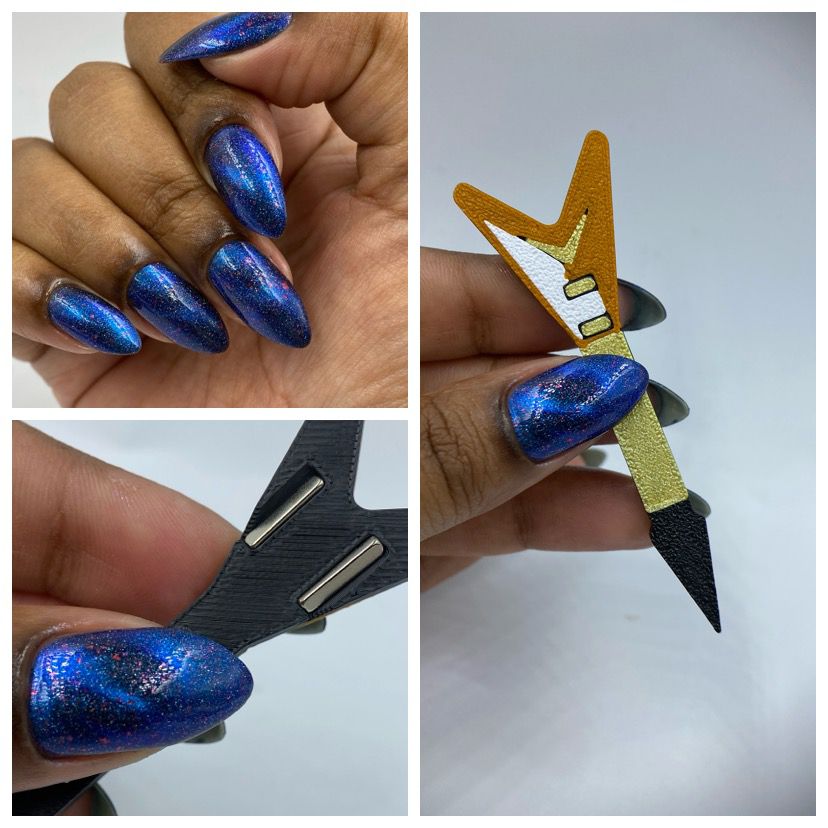 Perfect for anyone who loves a bold look and wants to explore the full potential of magnetic polishes, the Guitar Spell Magnet was designed to create three different effects, depending on which part of the guitar you use: