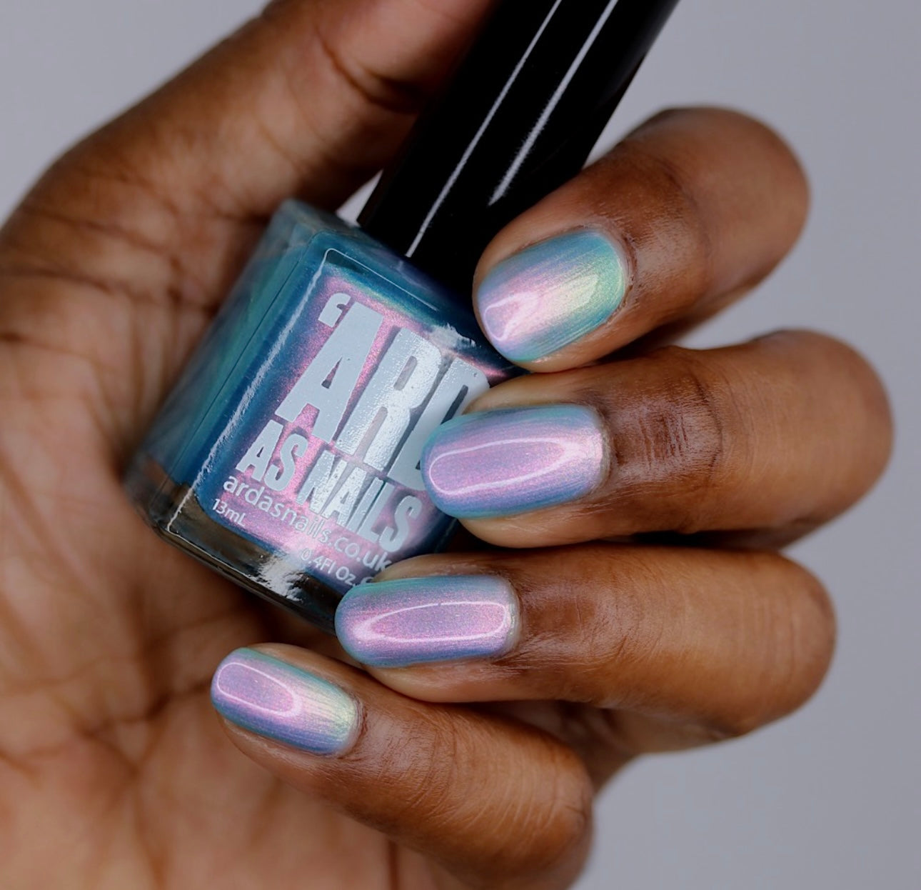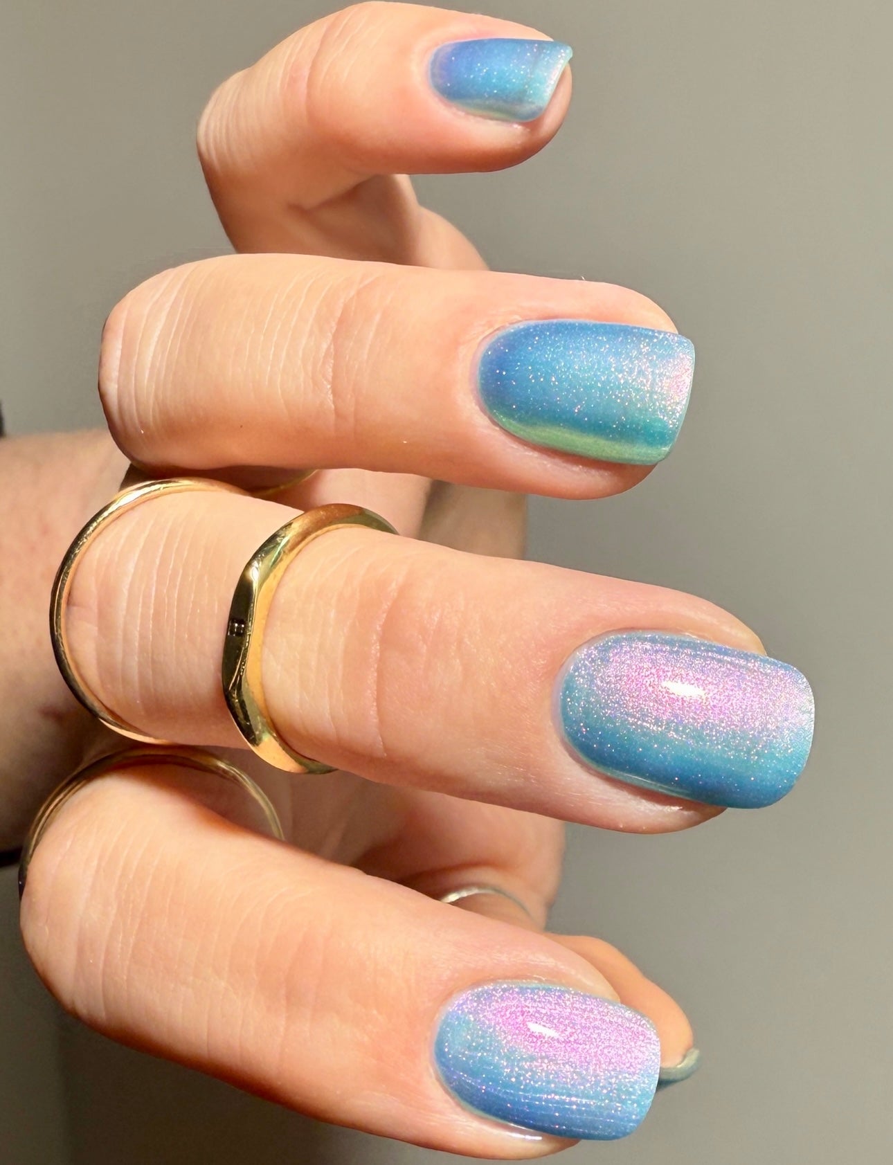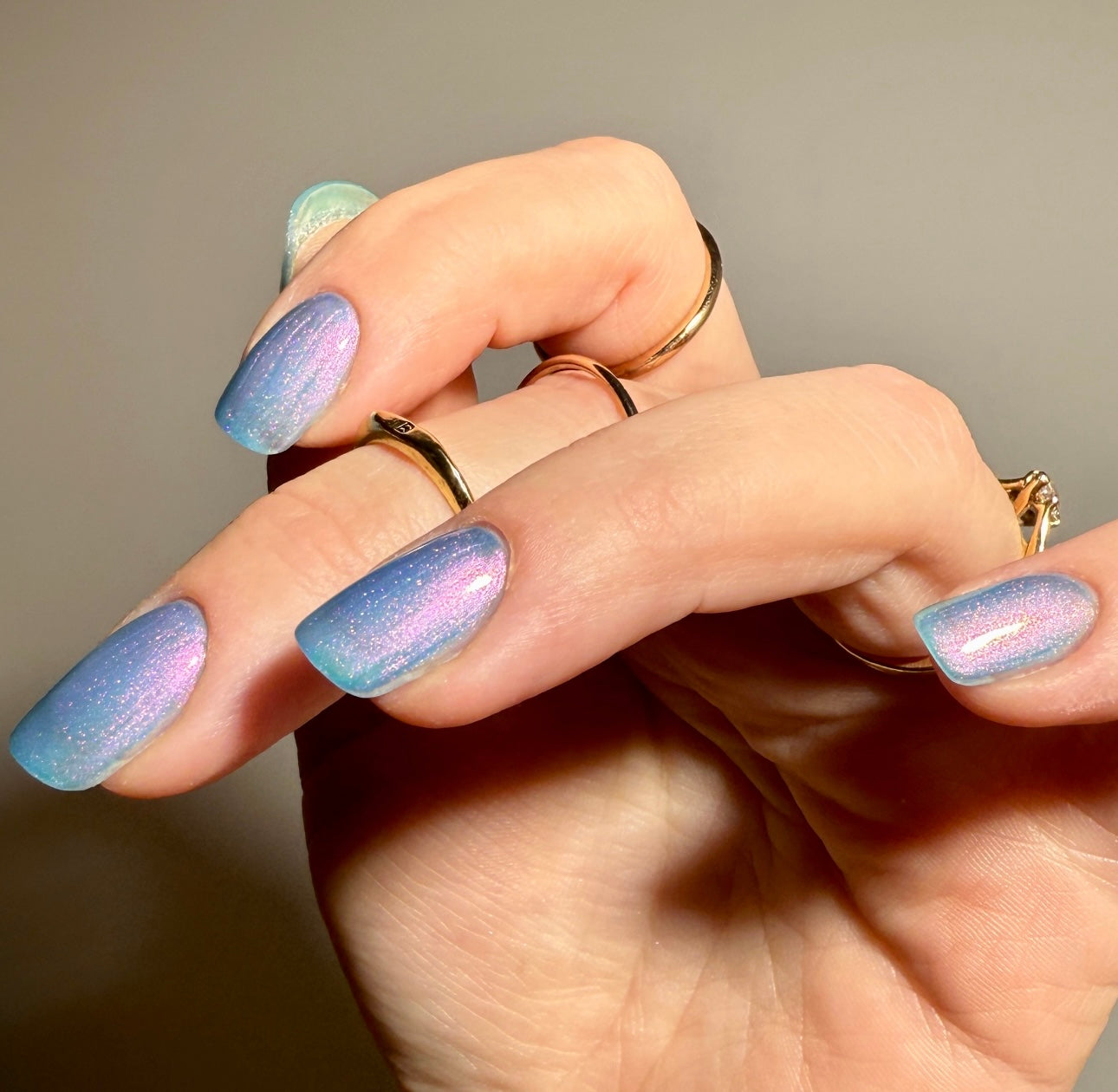 Description: This icy blue shimmer base has a strong pink shimmer with a hint of green