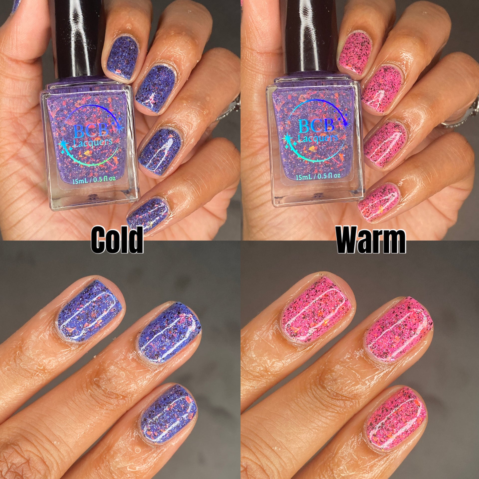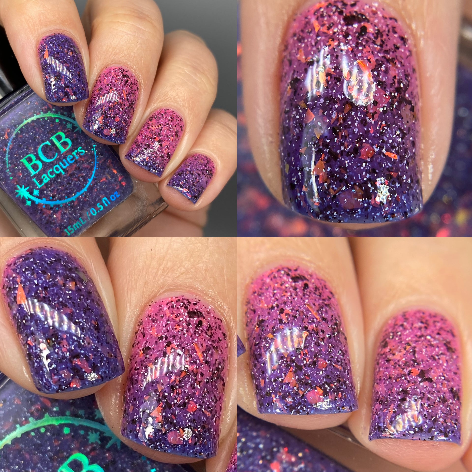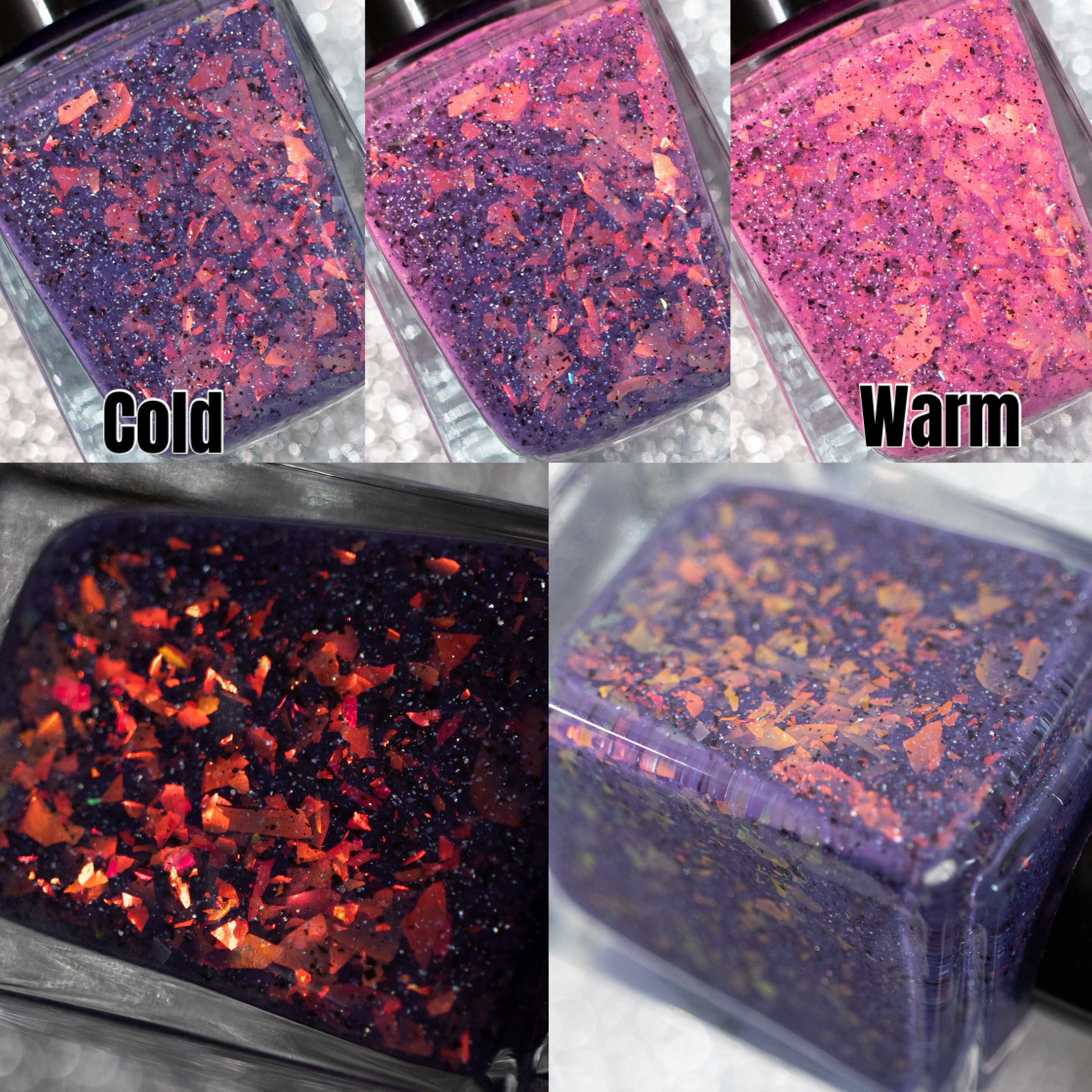 Description: *THERMAL* - A deepened blurple(cold) to a pink(warm) thermal with red/orange/gold flakes, black flakes and holo flakes.