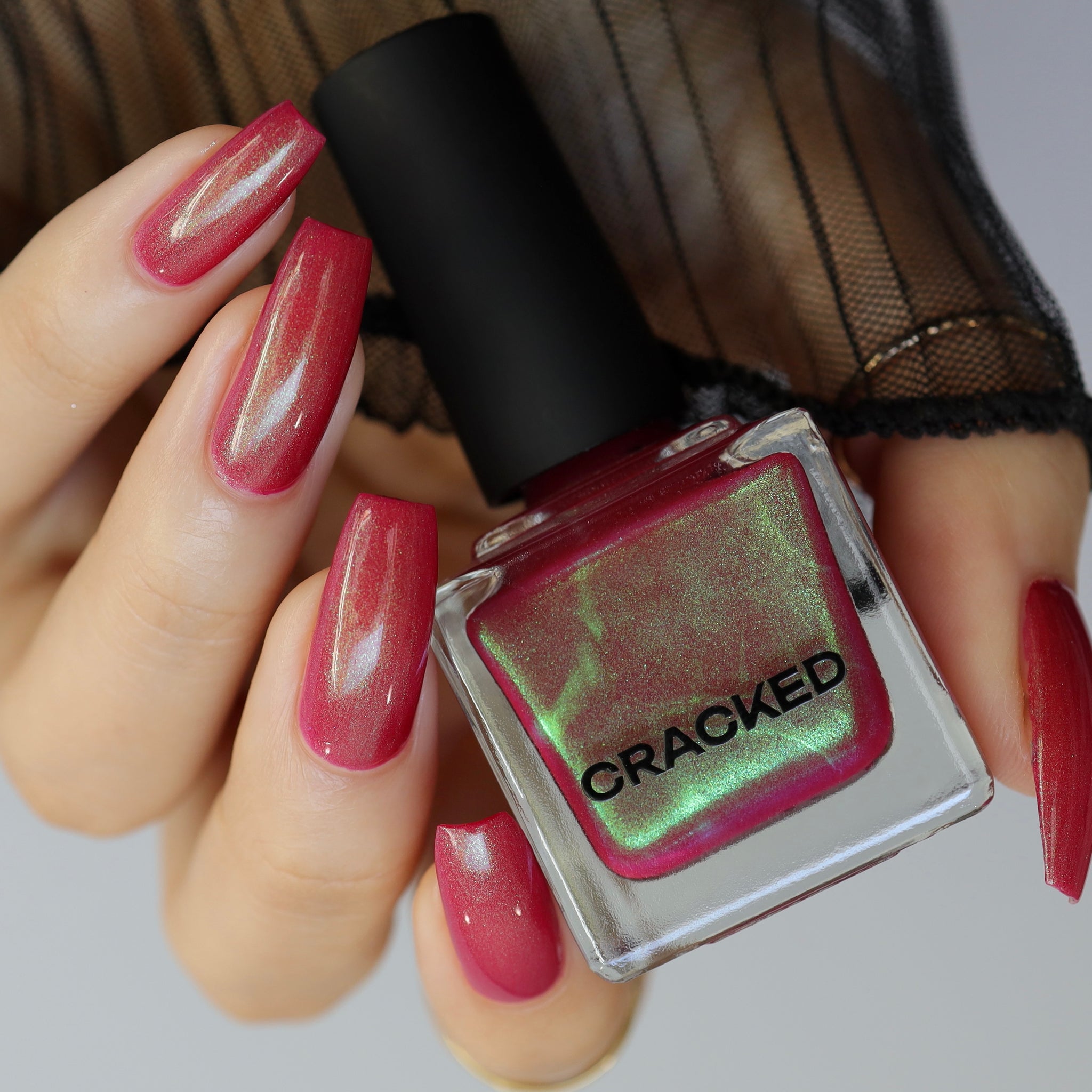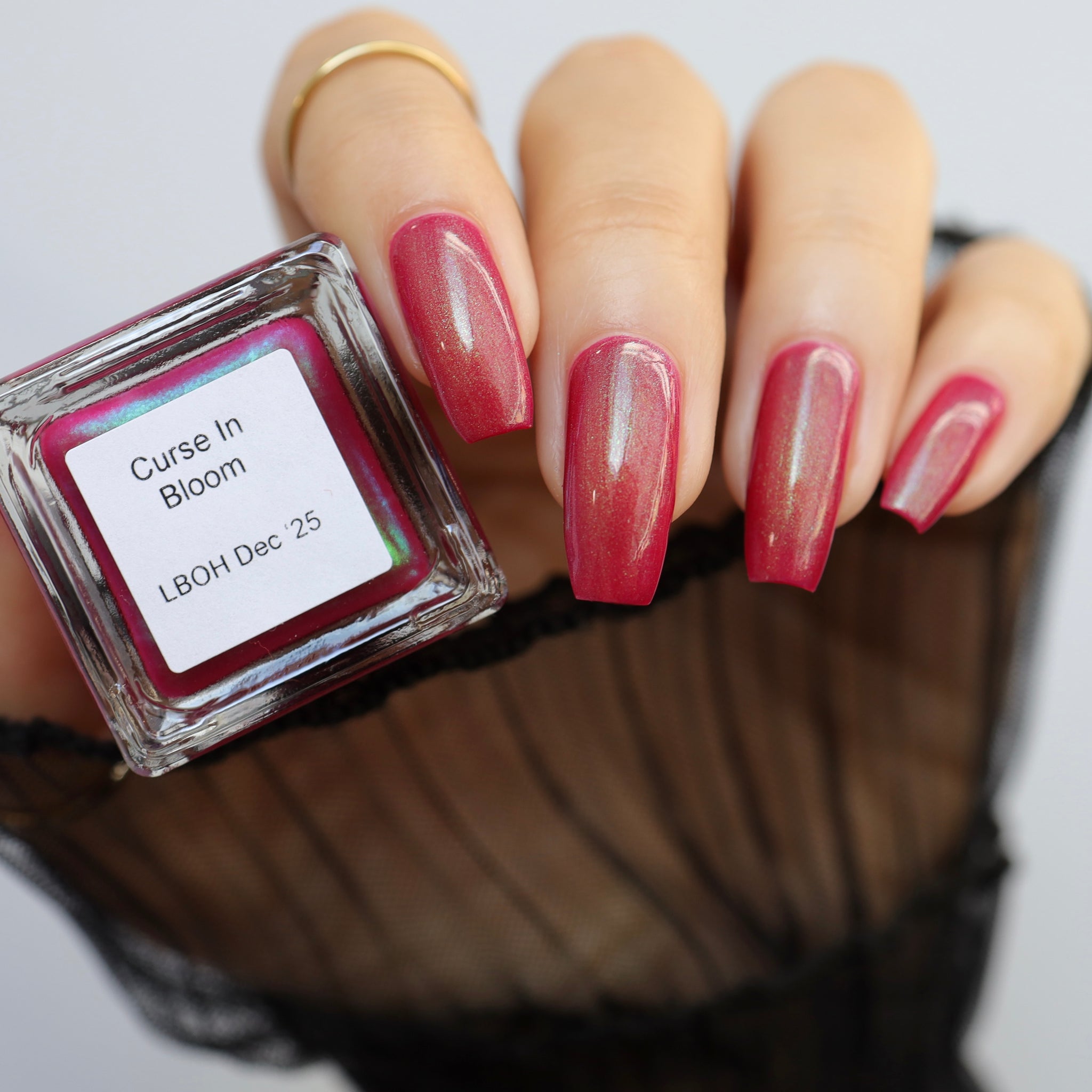 Inspiration-Curse In Bloom blooms in a pink-tinted red with eerie green shimmers, a shade born from fairy tales gone sour where enchantment twists and appearances deceive.