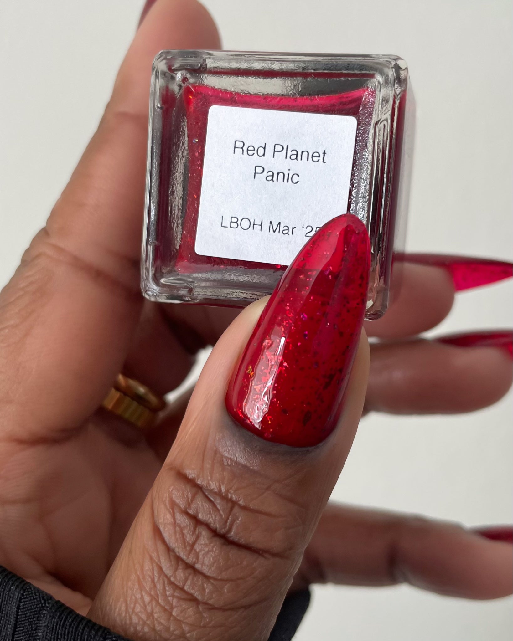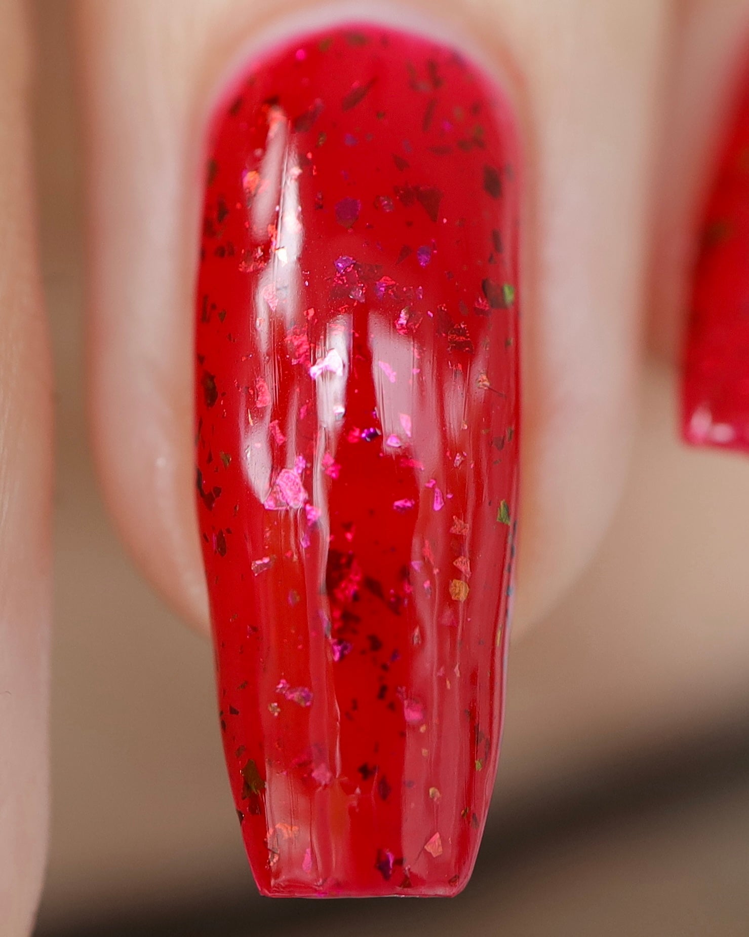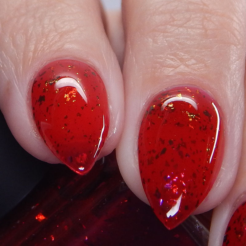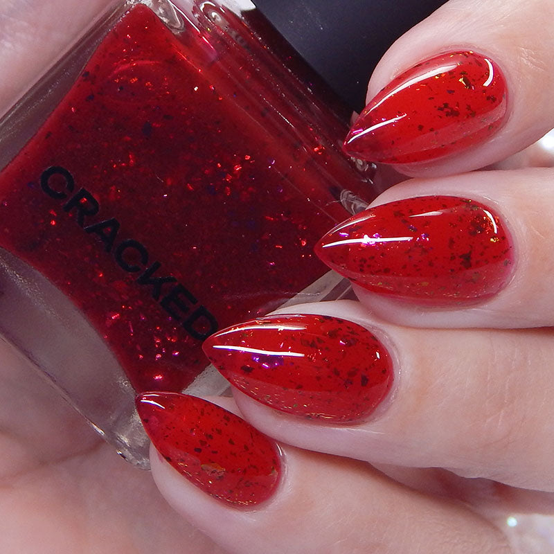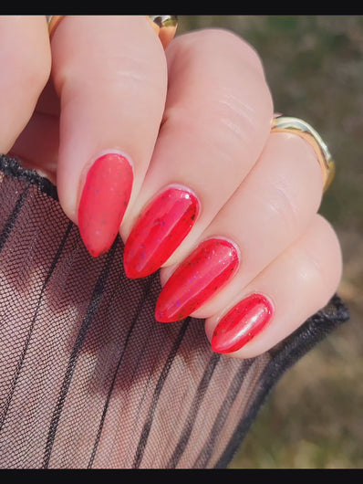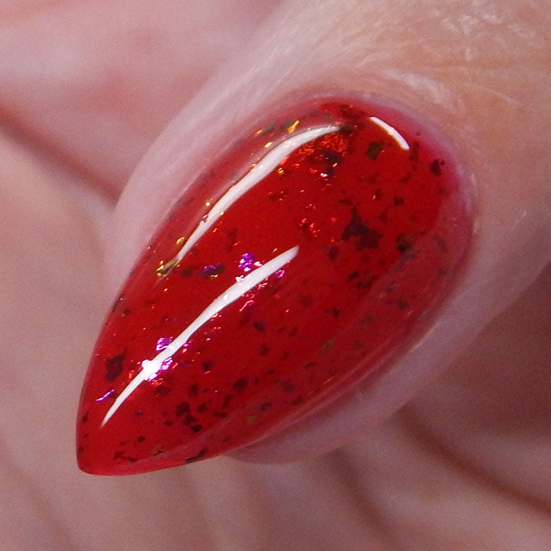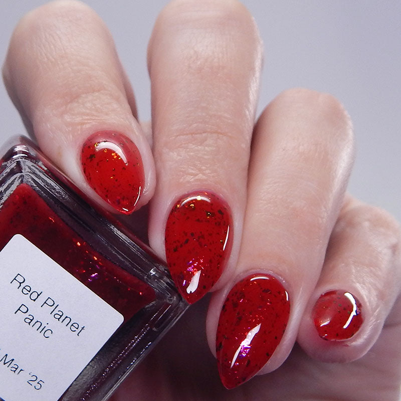 Description: Sound the alarms—Red Planet Panic has landed, and it's out-of-this-world stunning! This warm red jelly polish is packed with multichrome flakes that shift like a UFO in the night sky, flashing hints of green, gold, and magenta. It’s chaos, it’s beauty, it’s a red lover’s dream come true.