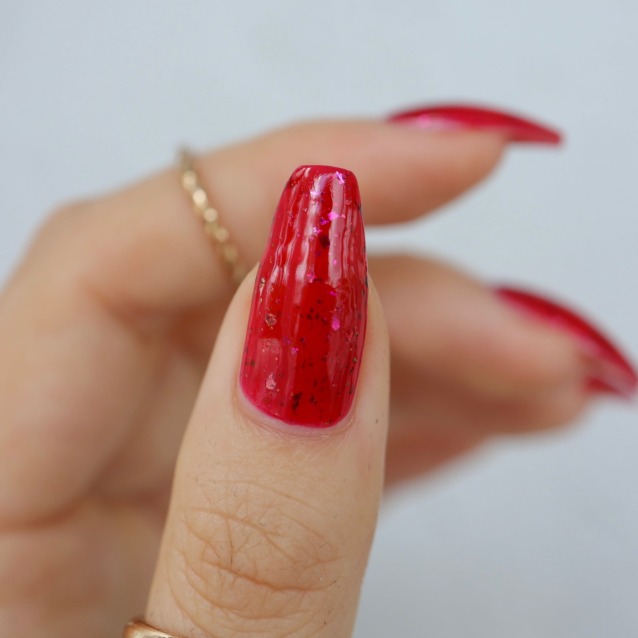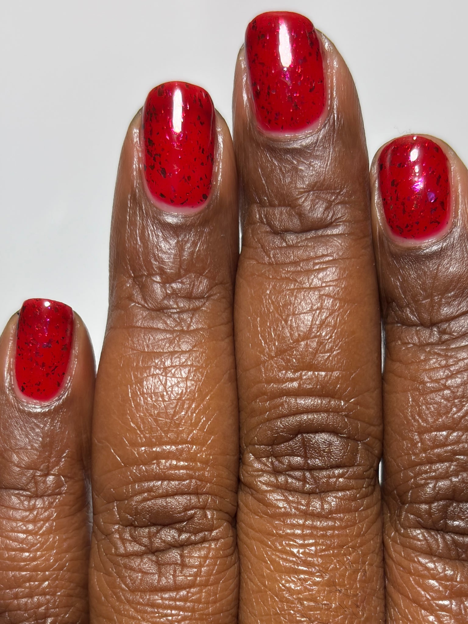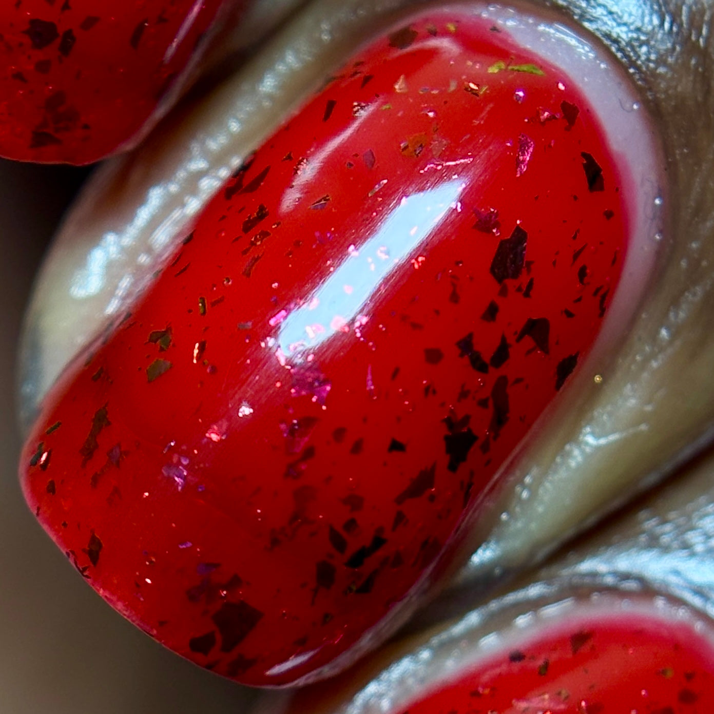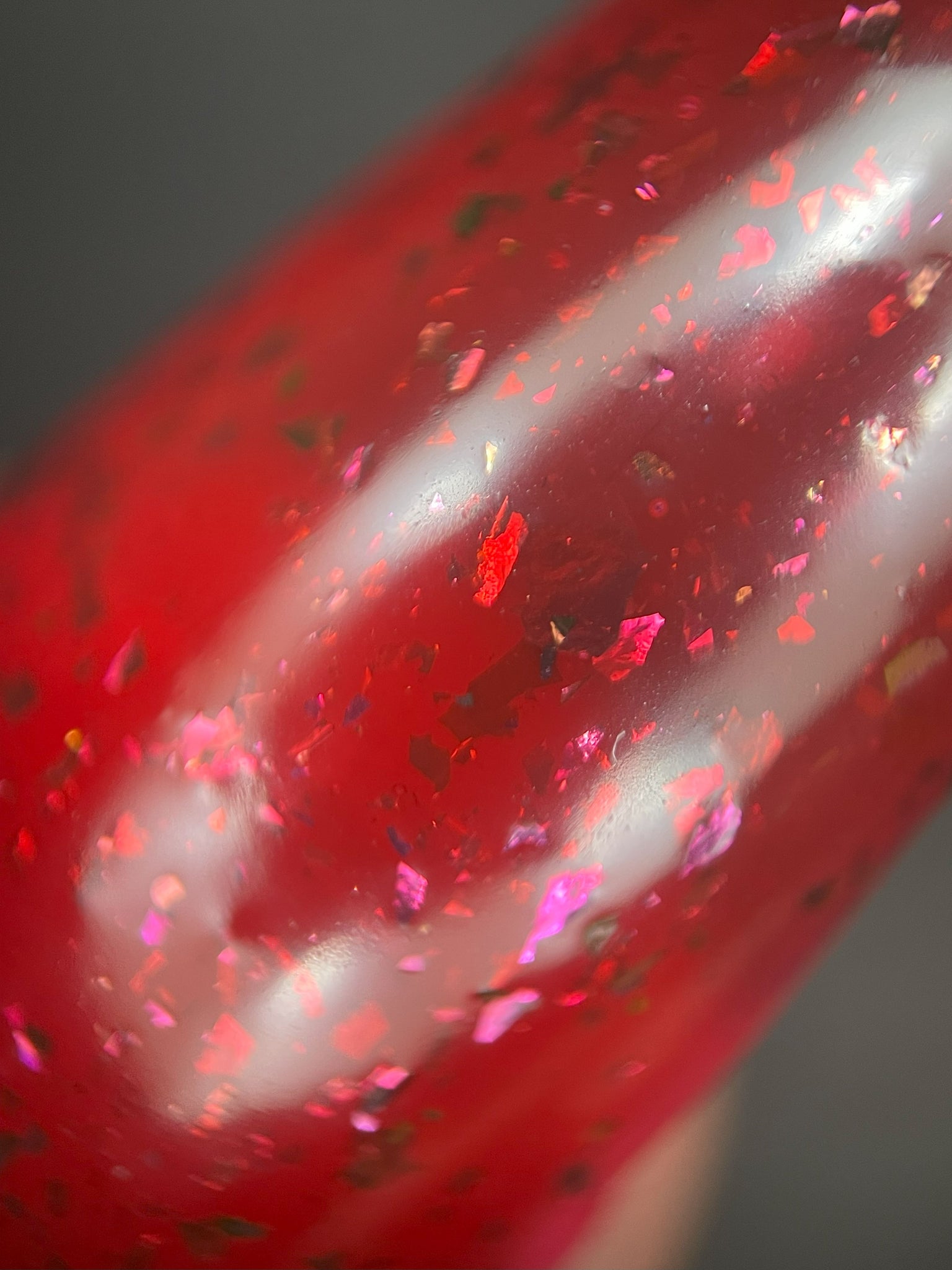 Description: Sound the alarms—Red Planet Panic has landed, and it's out-of-this-world stunning! This warm red jelly polish is packed with multichrome flakes that shift like a UFO in the night sky, flashing hints of green, gold, and magenta. It’s chaos, it’s beauty, it’s a red lover’s dream come true.