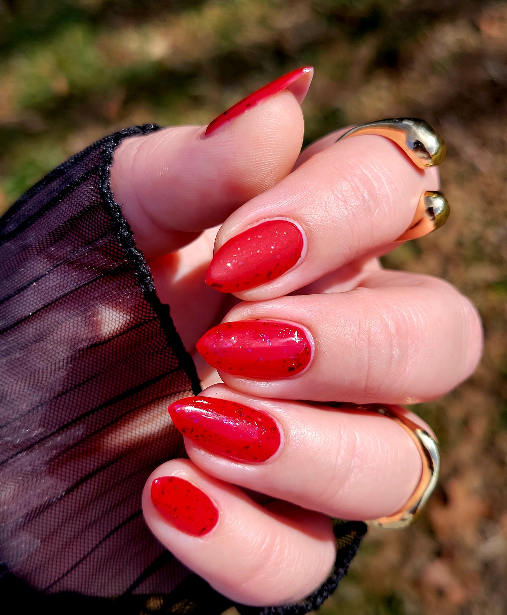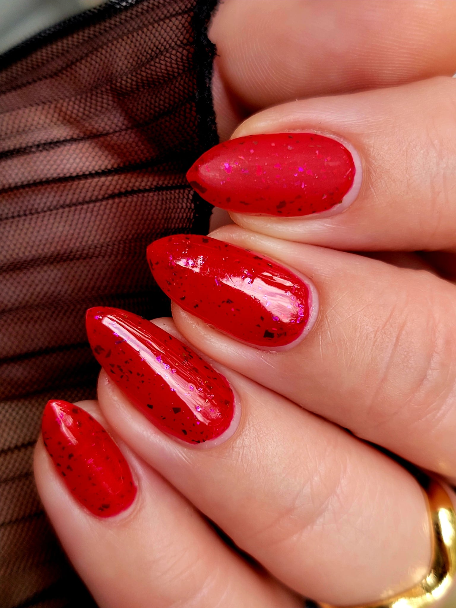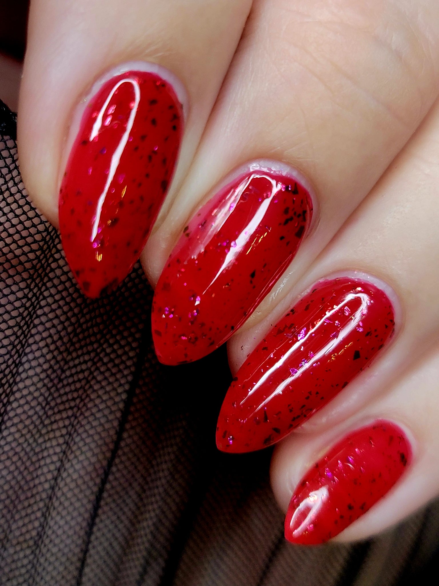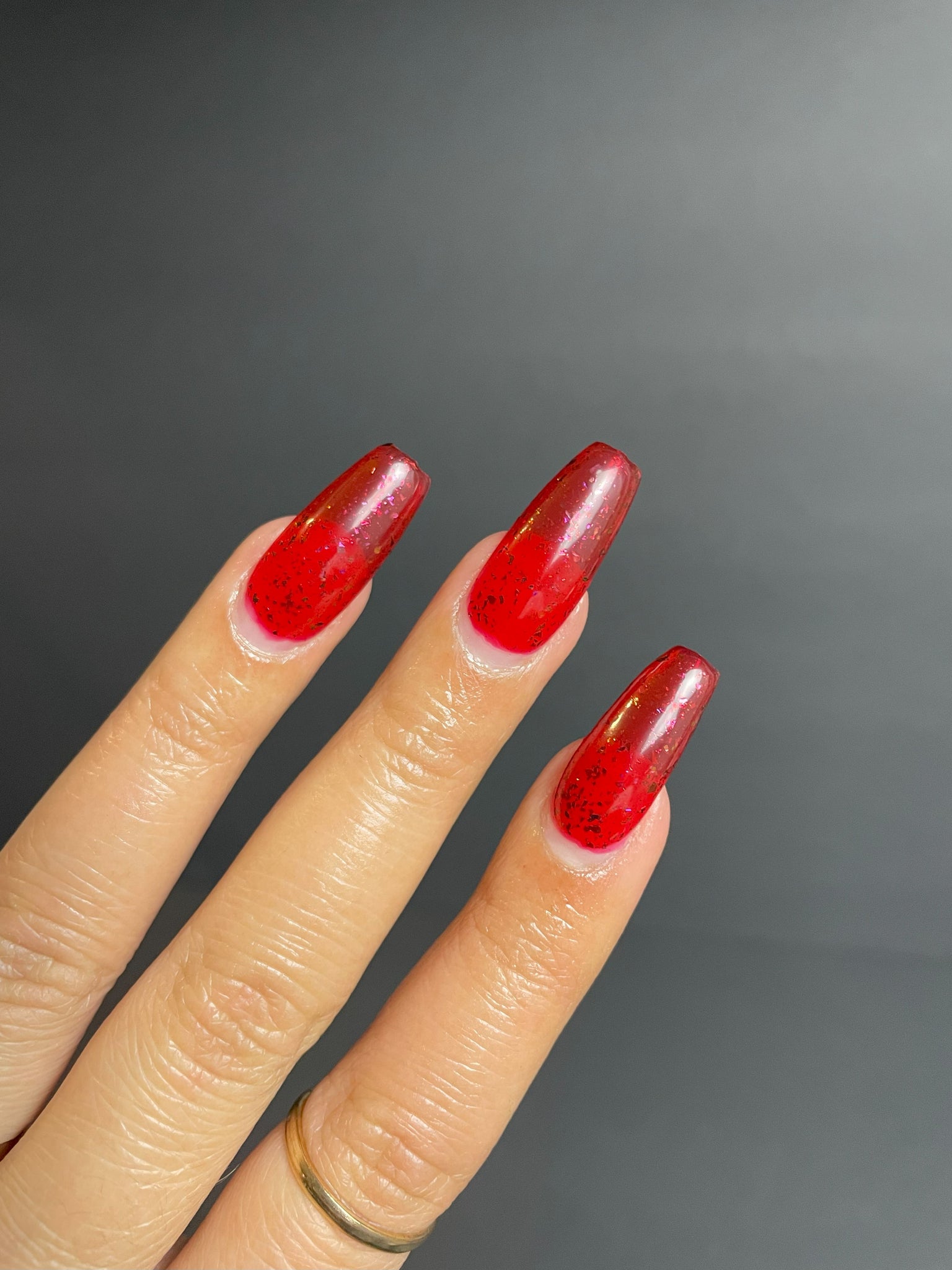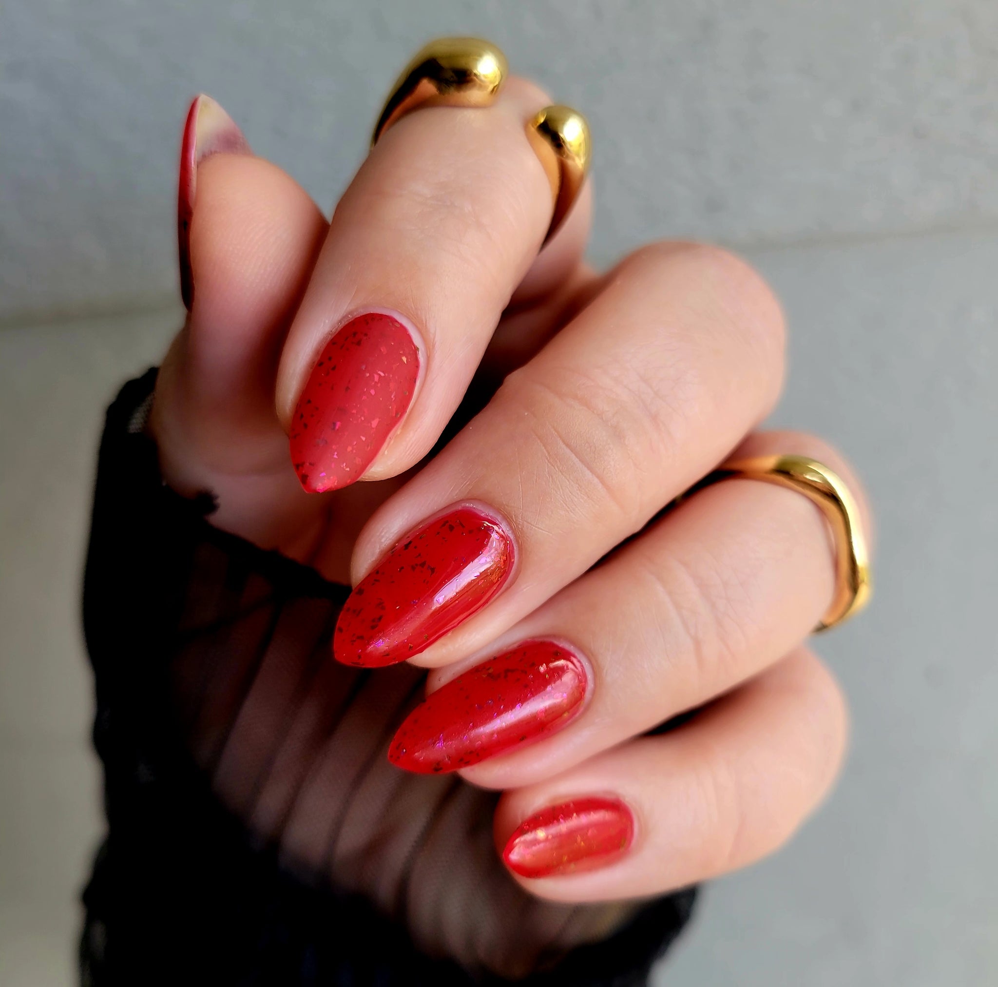 Description: Sound the alarms—Red Planet Panic has landed, and it's out-of-this-world stunning! This warm red jelly polish is packed with multichrome flakes that shift like a UFO in the night sky, flashing hints of green, gold, and magenta. It’s chaos, it’s beauty, it’s a red lover’s dream come true.