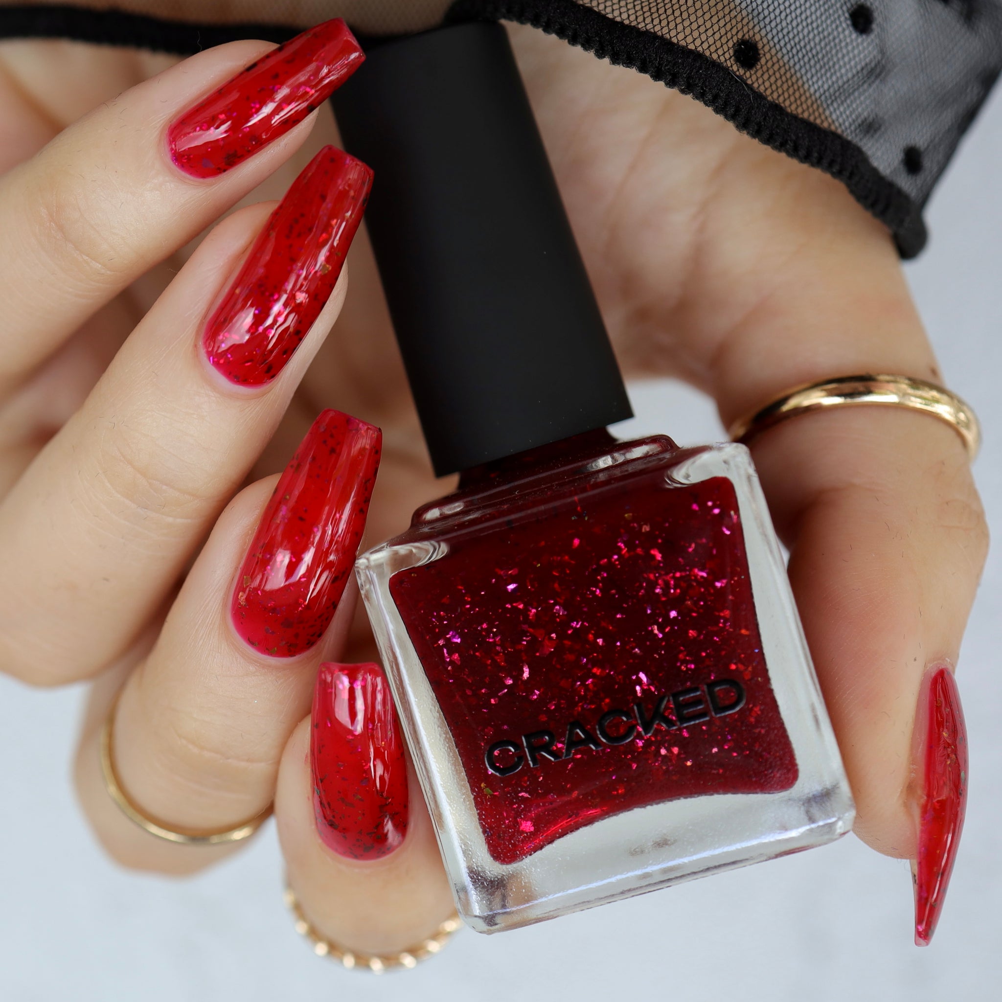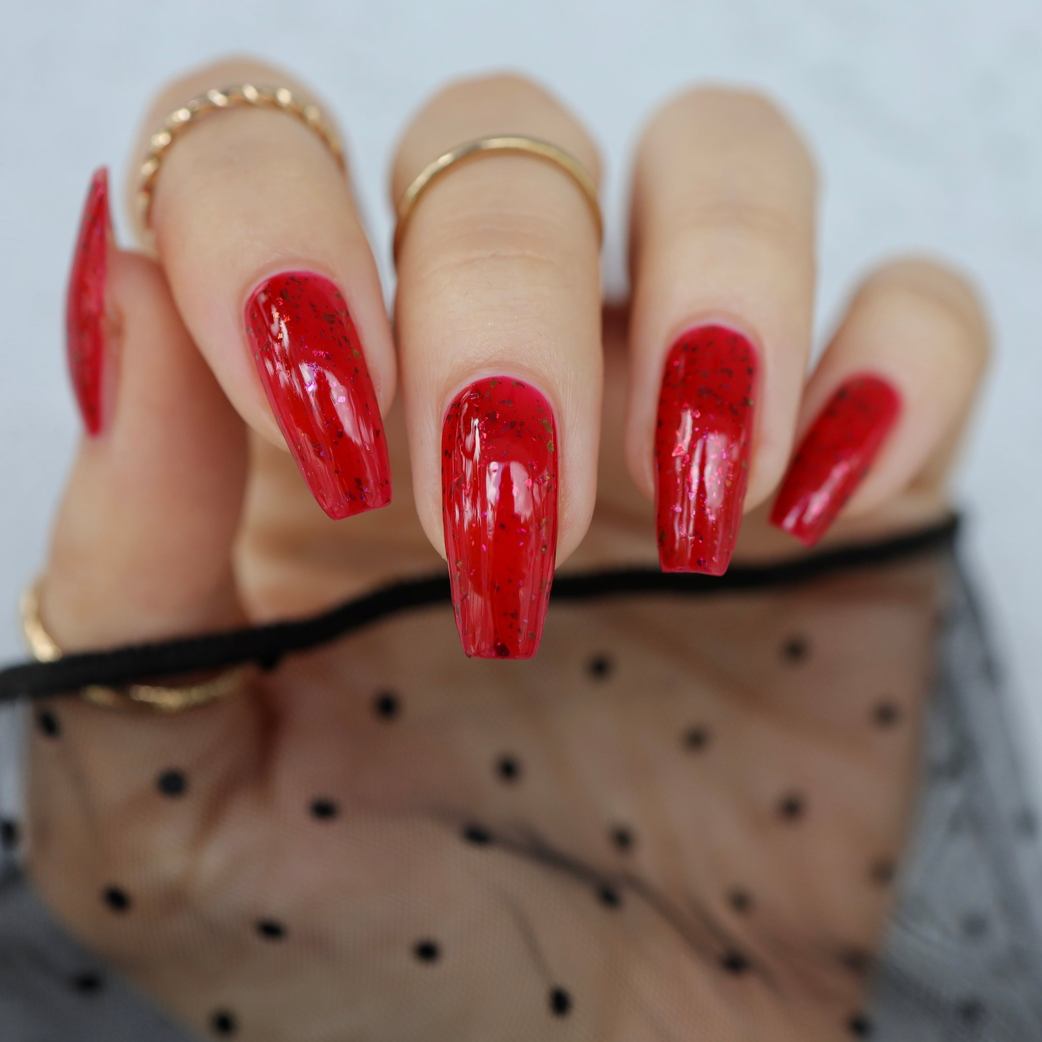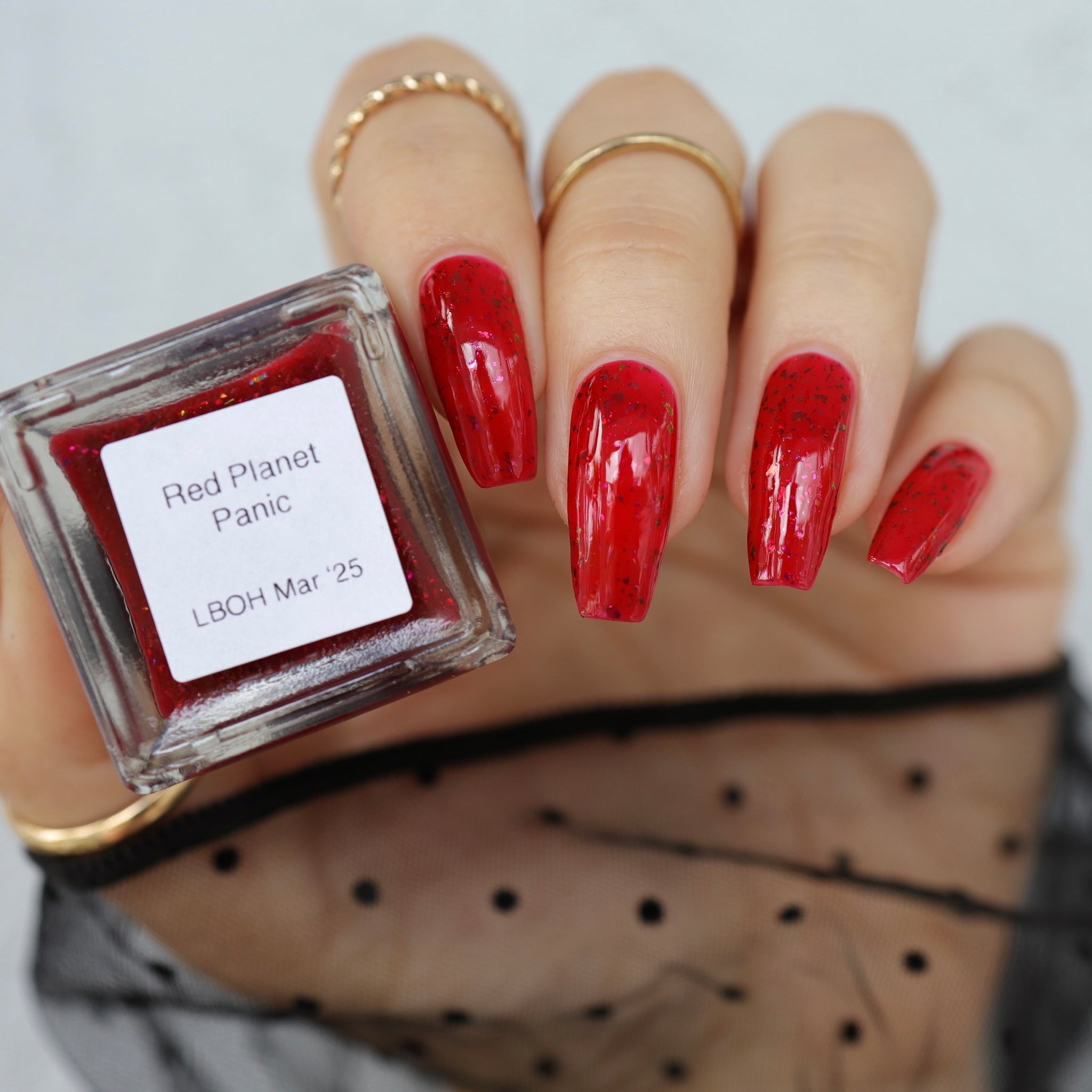 Inspired by Tim Burton’s cult classic Mars Attacks!, this shade is pure retro sci-fi magic—bold, eye-catching, and just a little bit dangerous. The squishy red base glows like a planetary invasion, while the shifting flakes create an intergalactic spectacle at your fingertips.