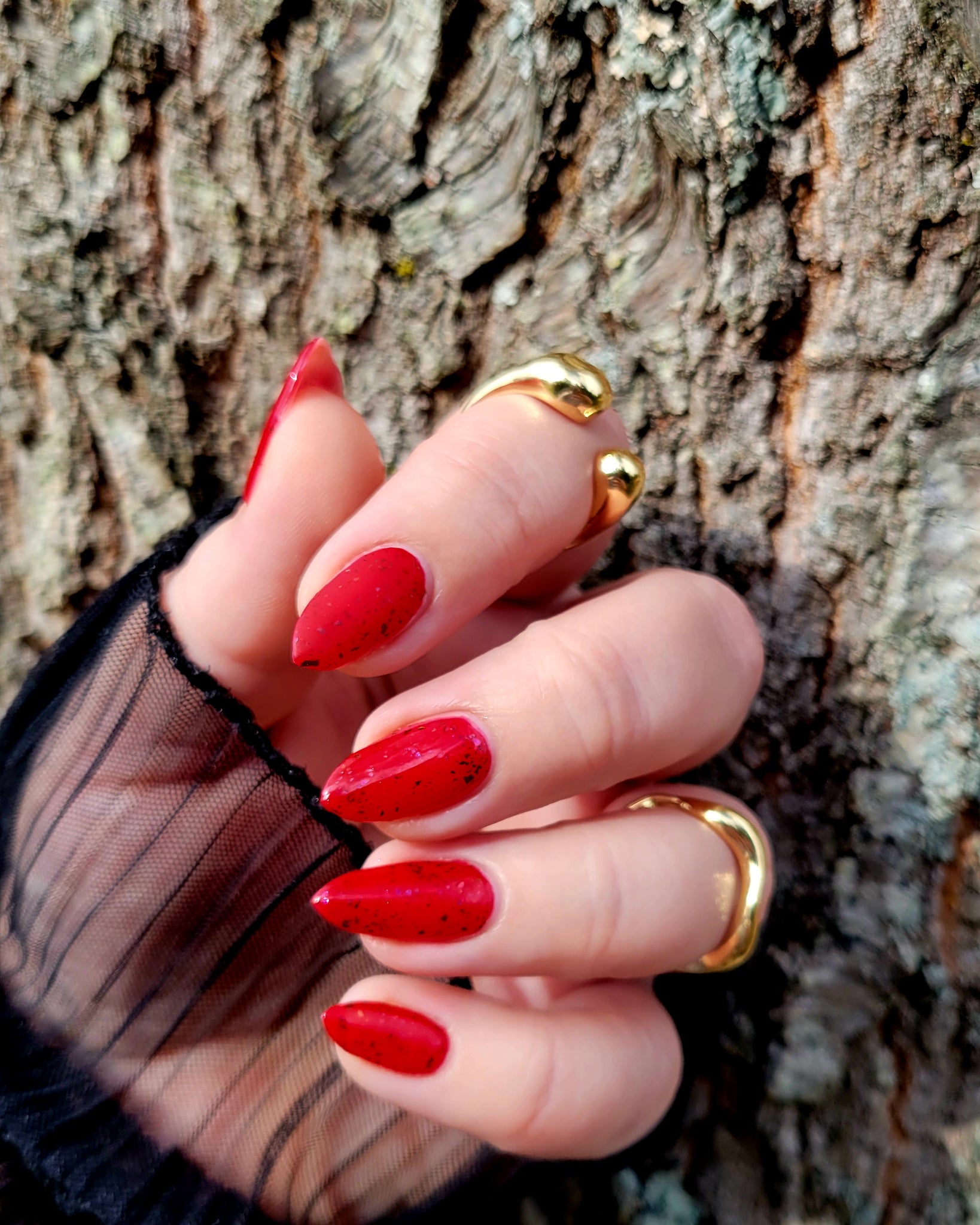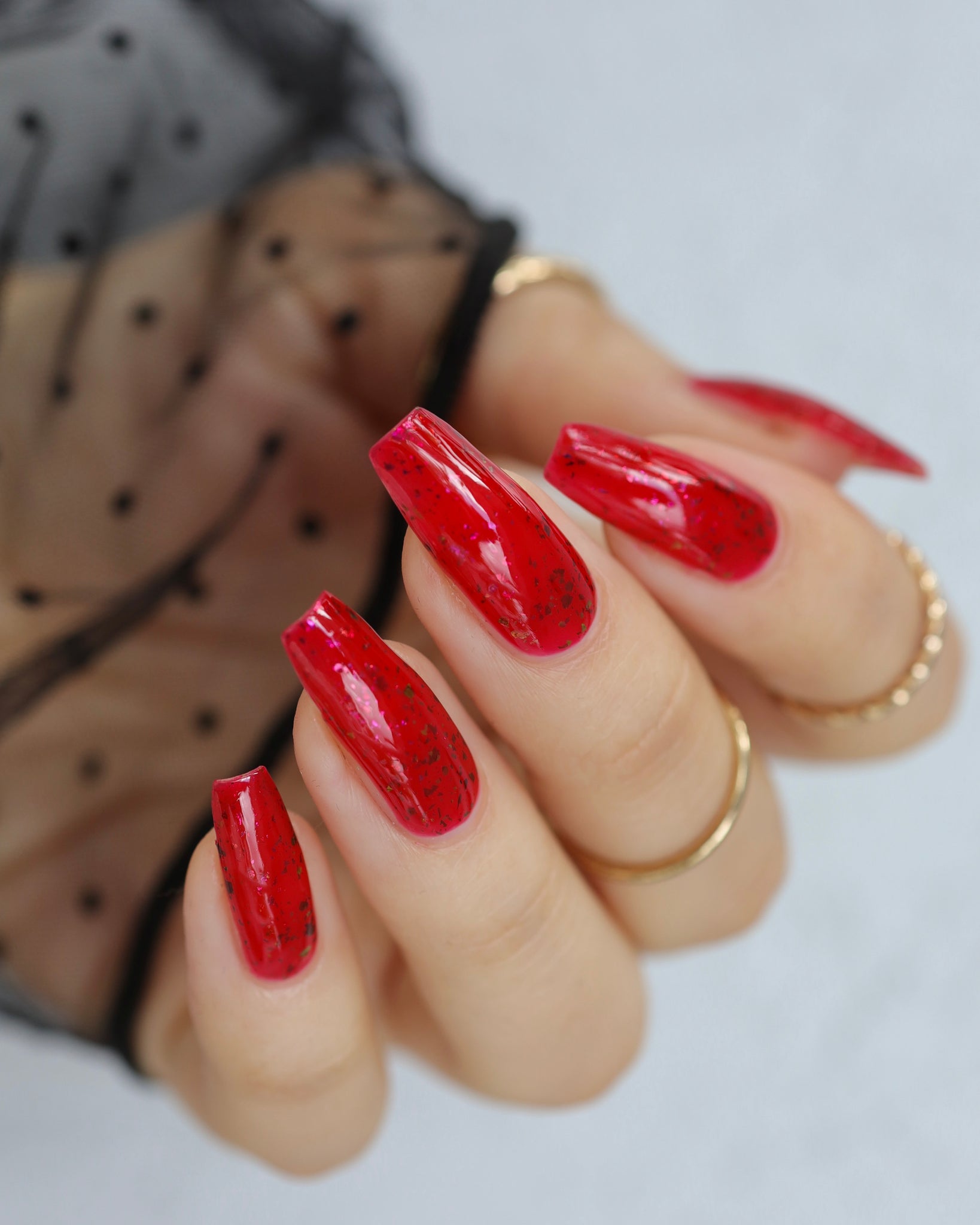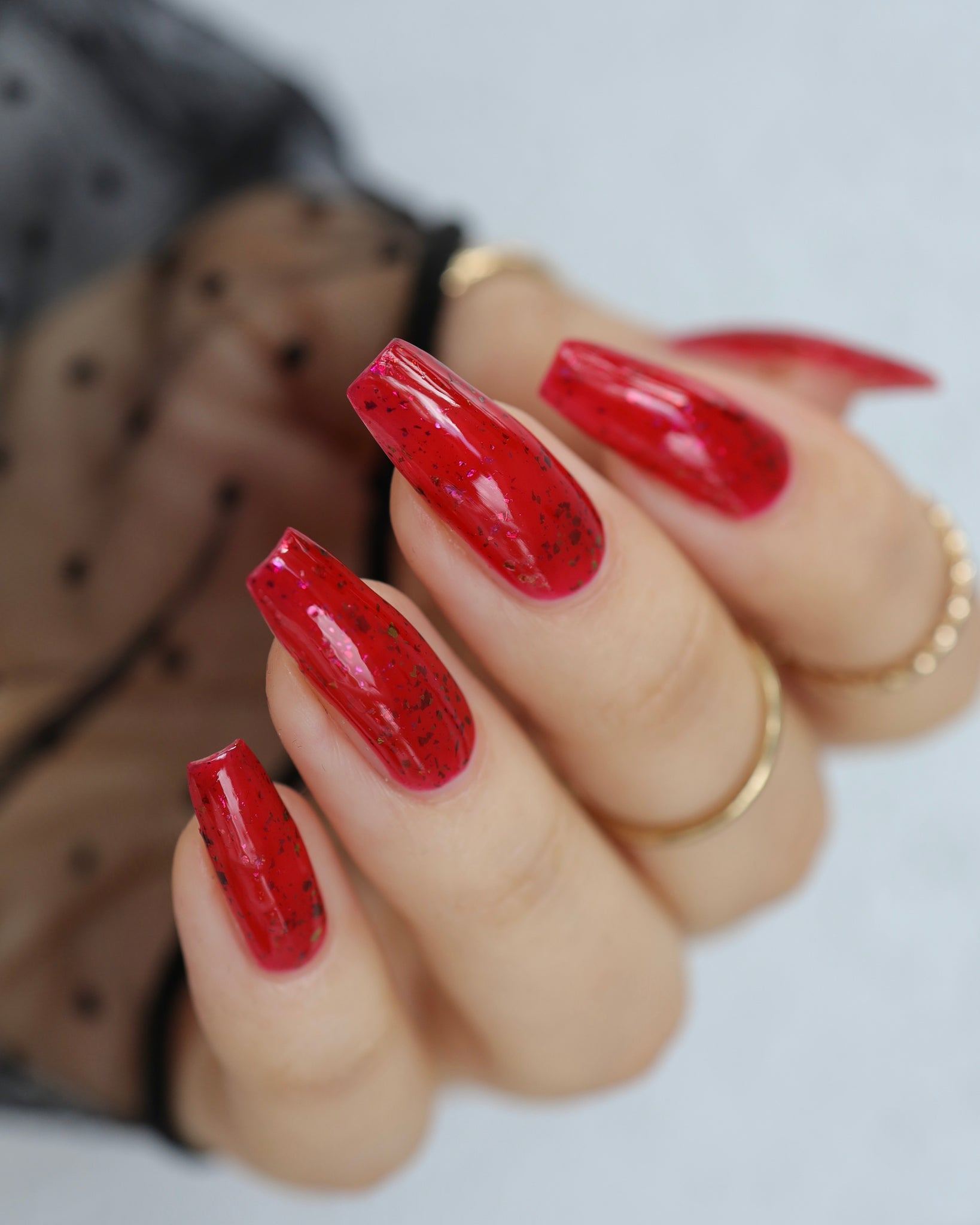 Inspired by Tim Burton’s cult classic Mars Attacks!, this shade is pure retro sci-fi magic—bold, eye-catching, and just a little bit dangerous. The squishy red base glows like a planetary invasion, while the shifting flakes create an intergalactic spectacle at your fingertips.