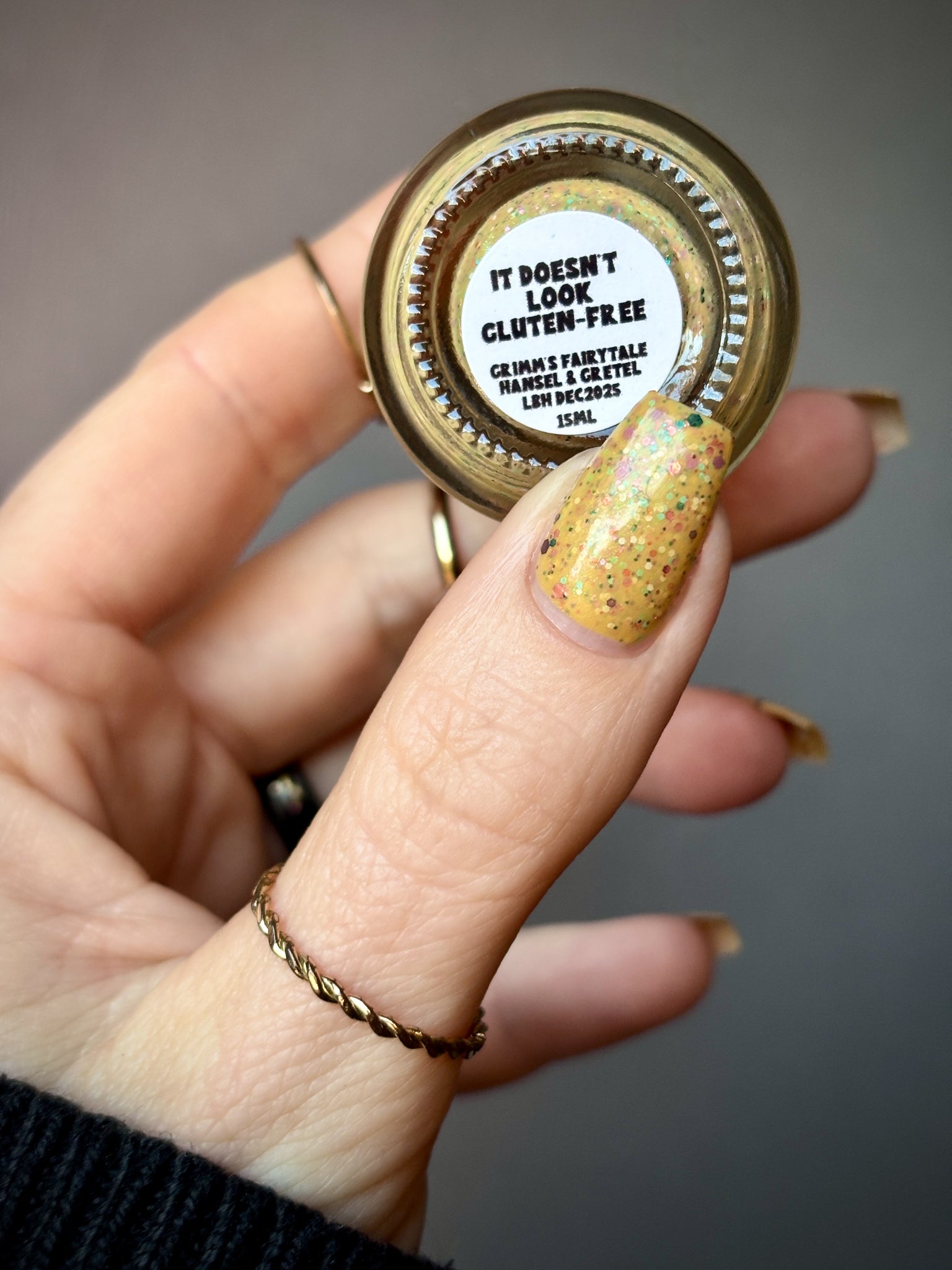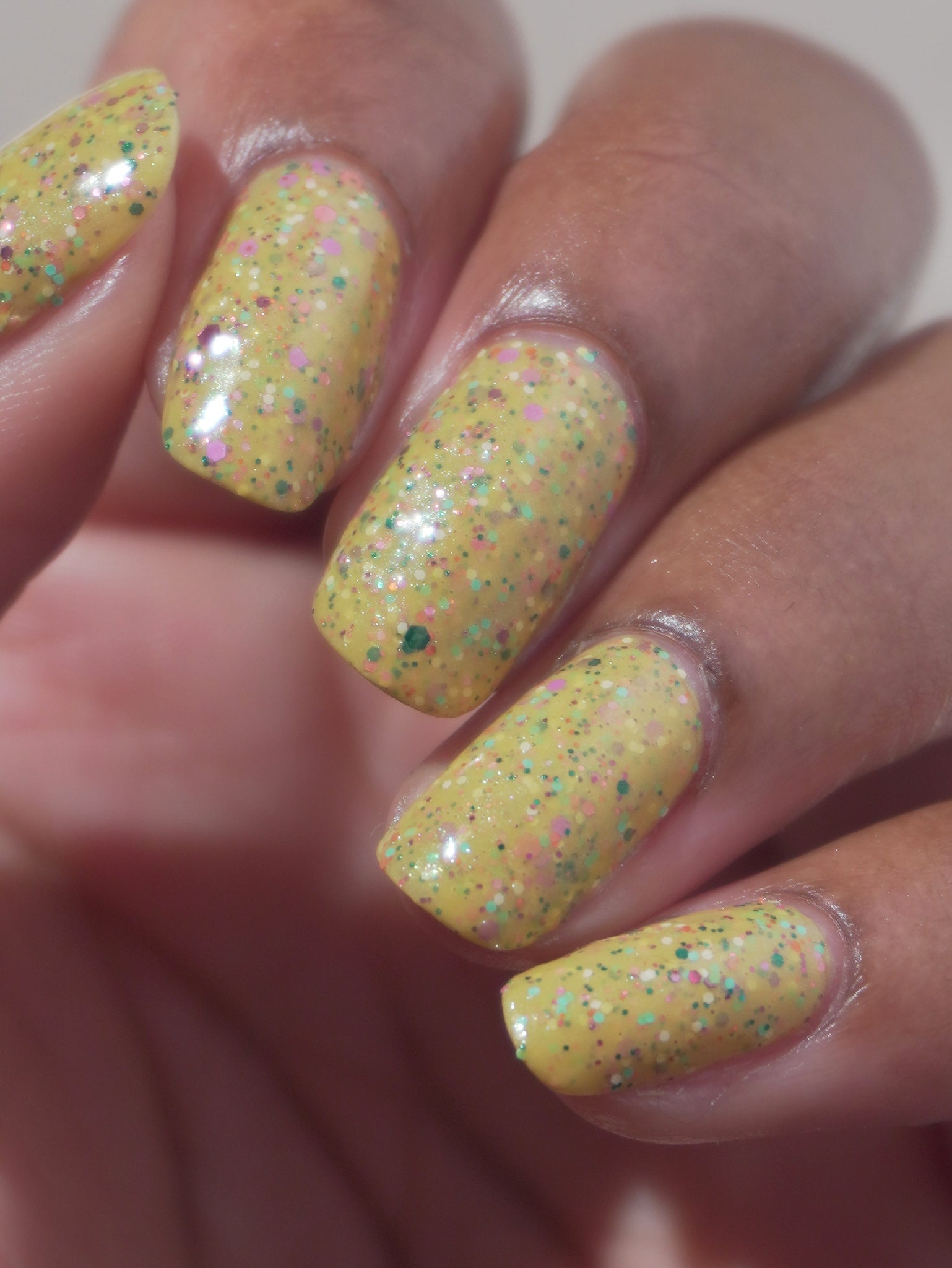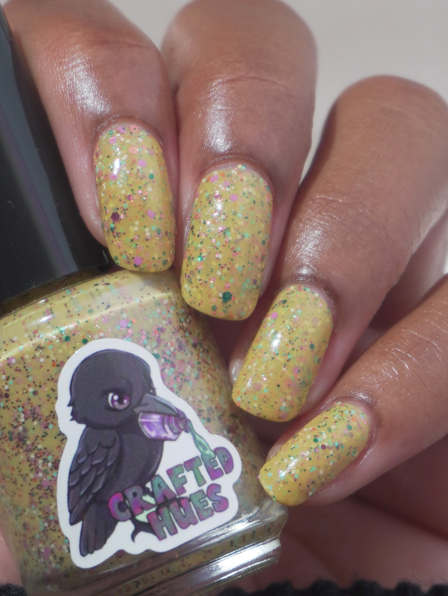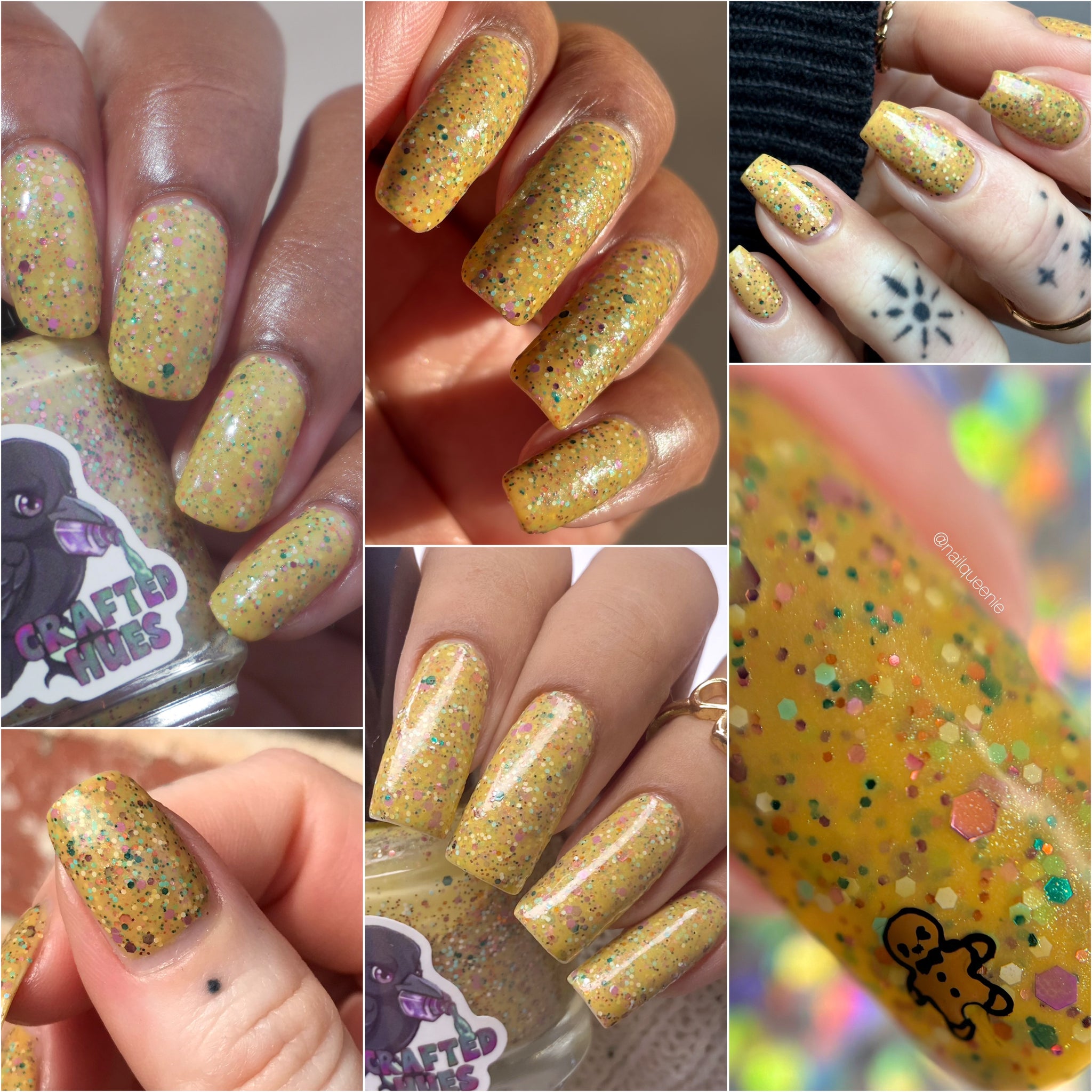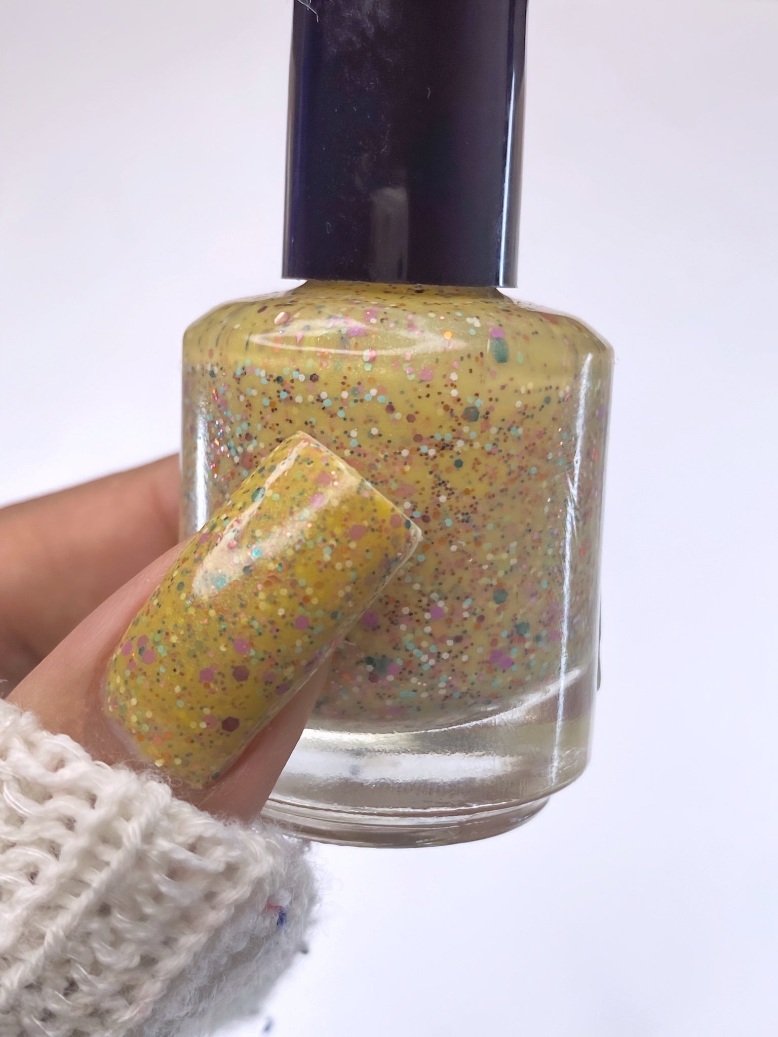 Description: It Doesn’t Look Gluten-Free is a mustard crelly with blue shimmer filled with colorful glitter hexes in various sizes.