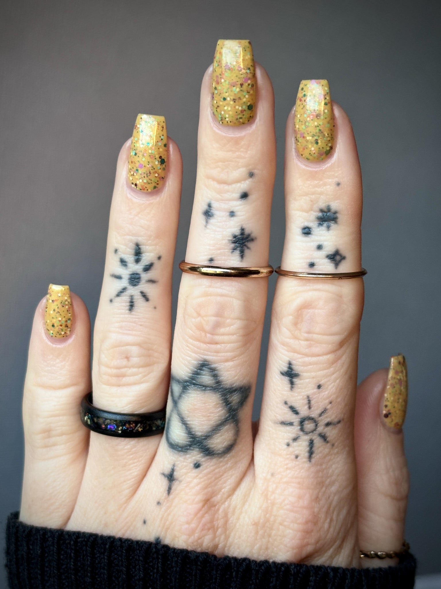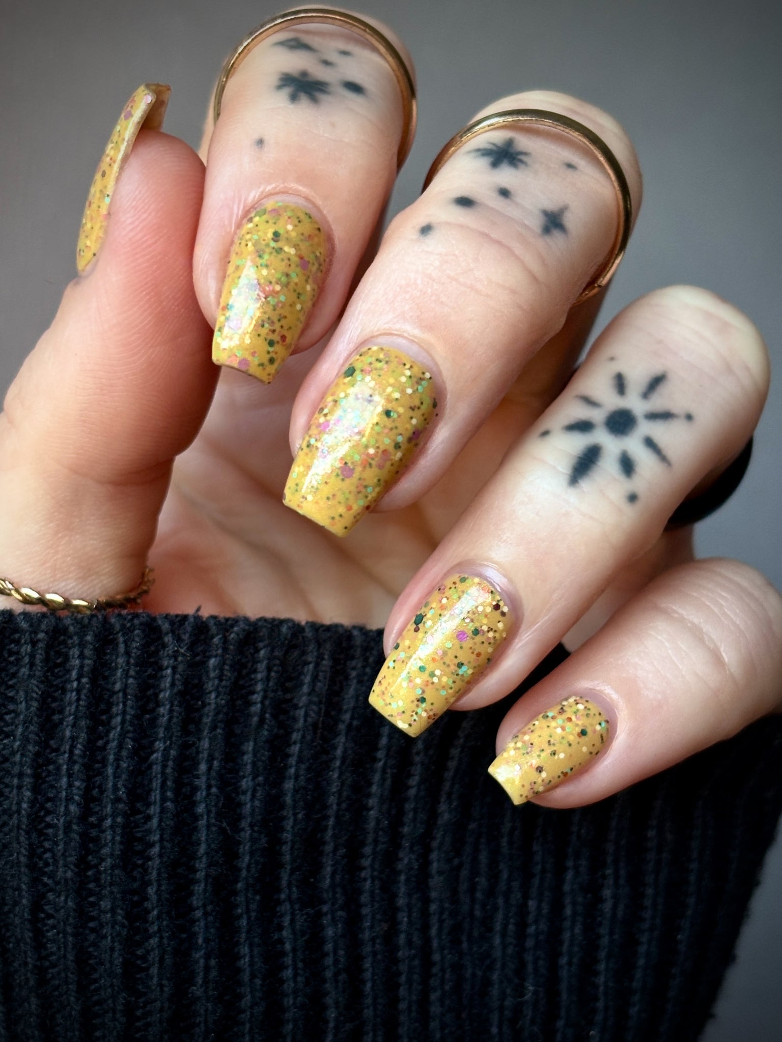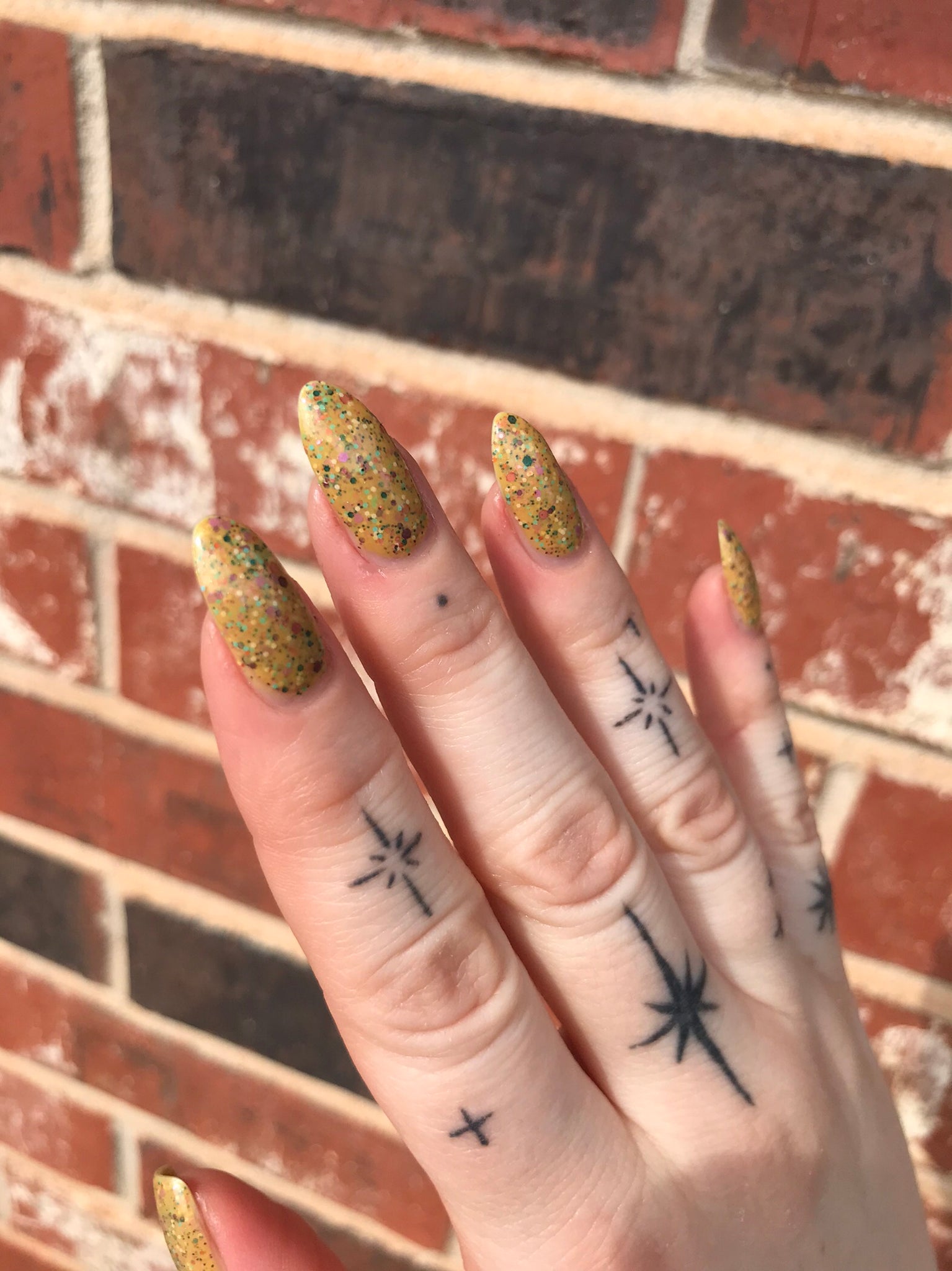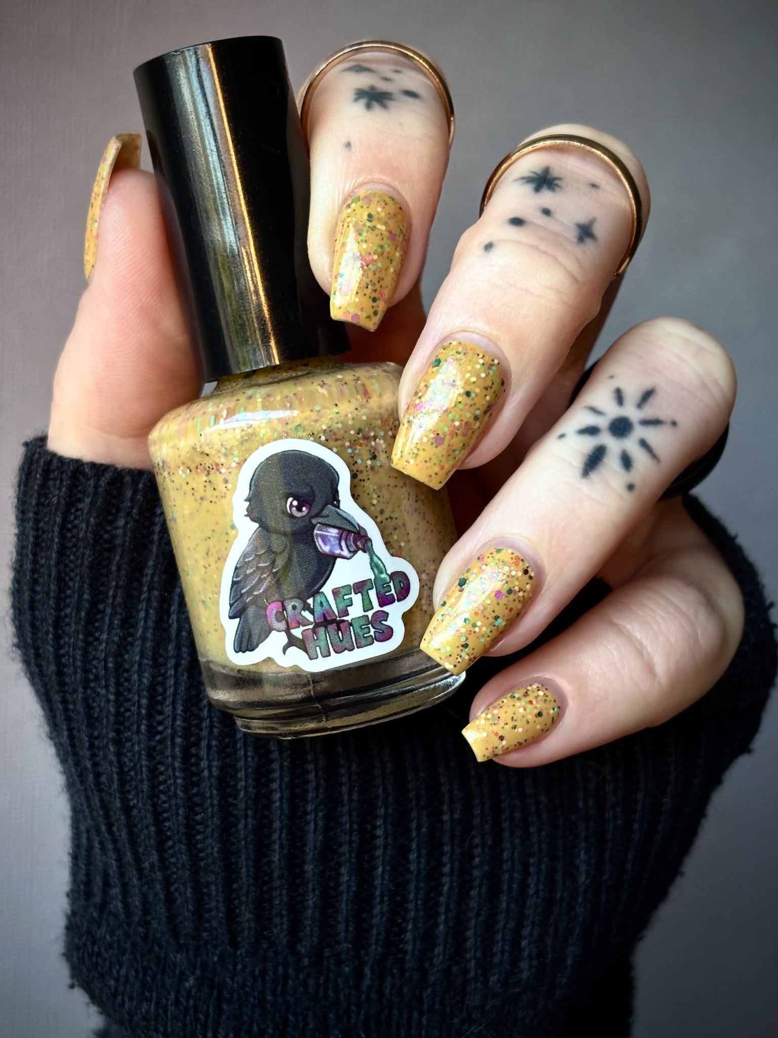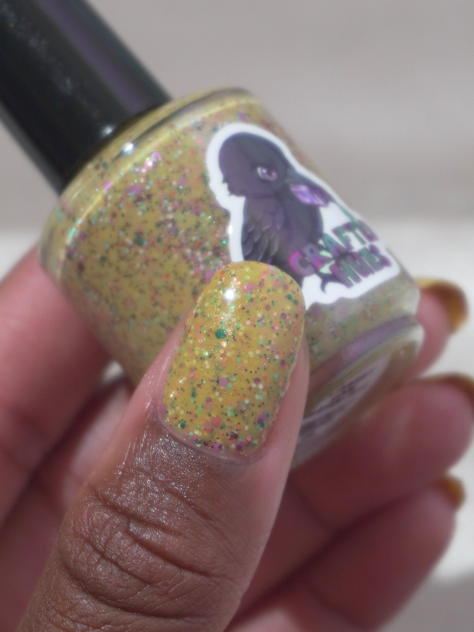 Description: It Doesn’t Look Gluten-Free is a mustard crelly with blue shimmer filled with colorful glitter hexes in various sizes.