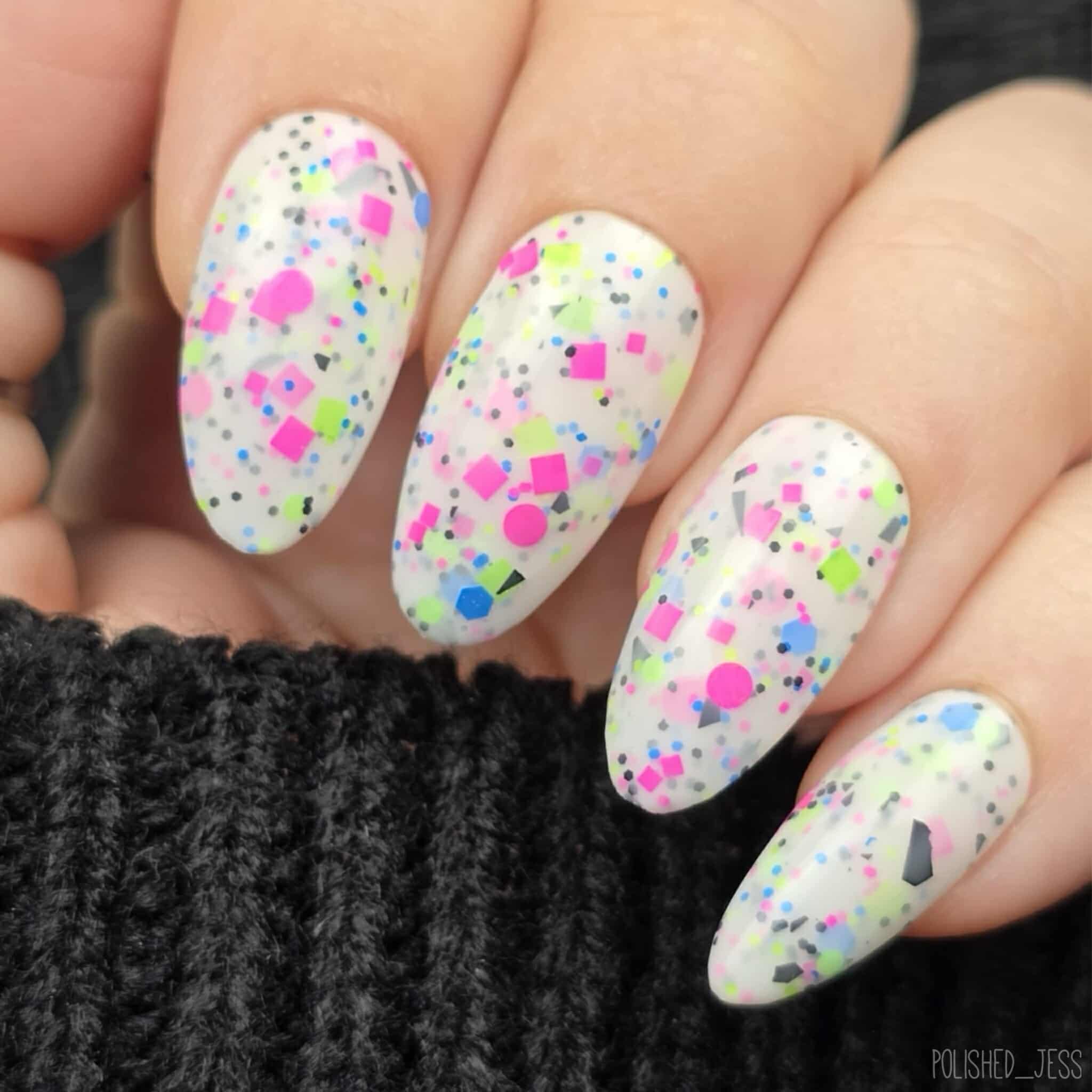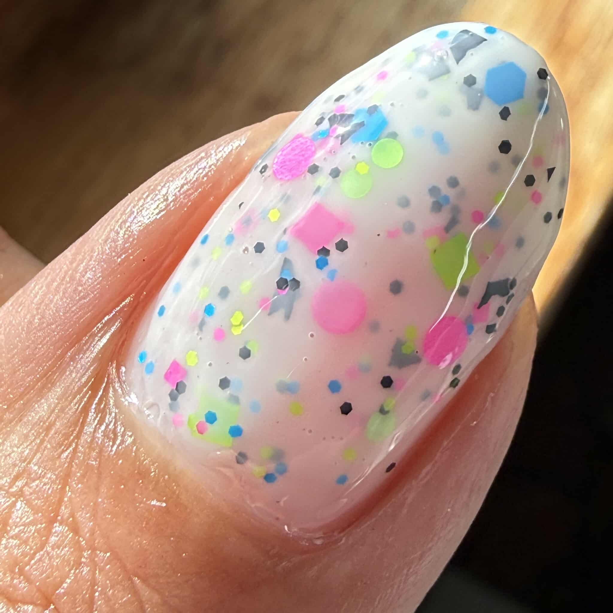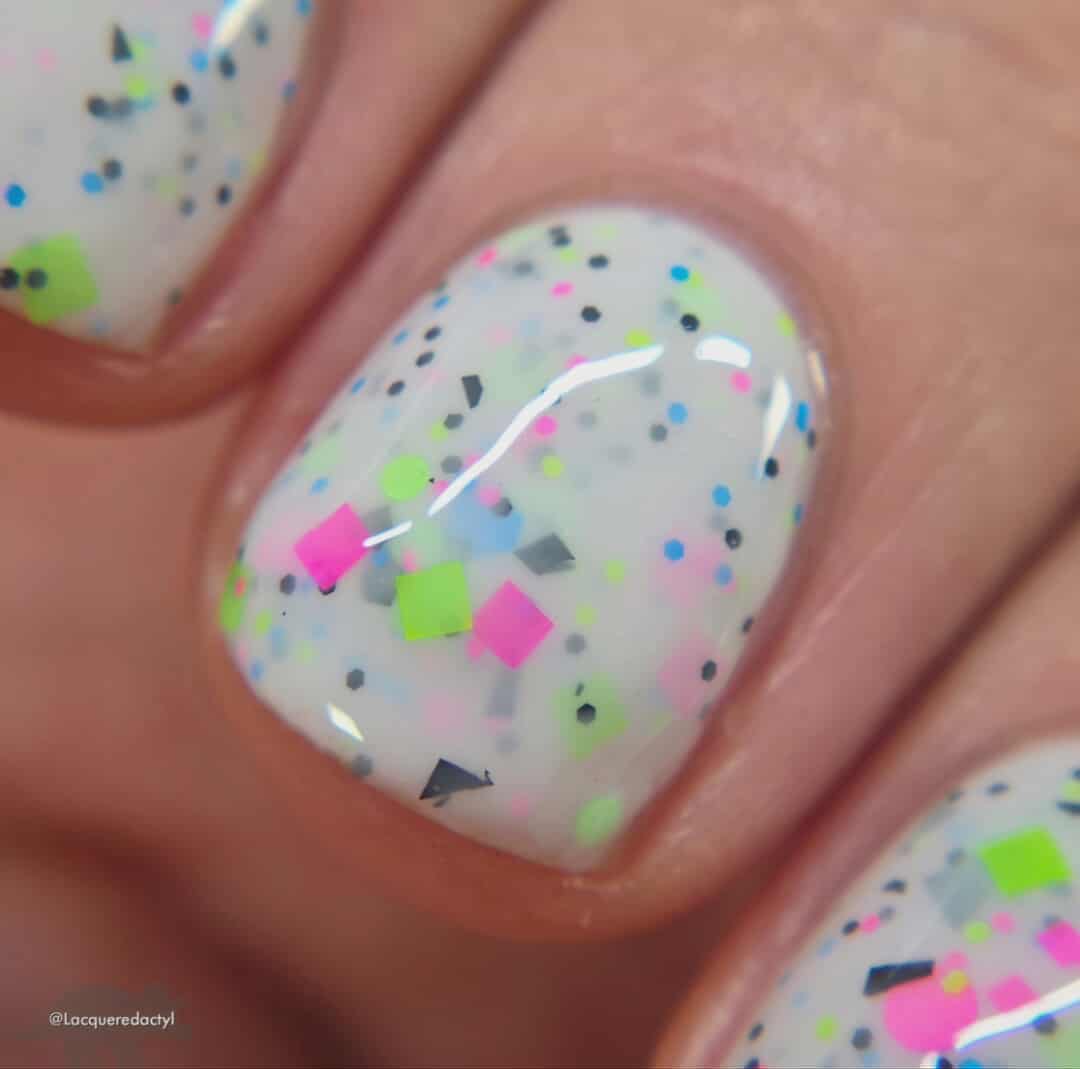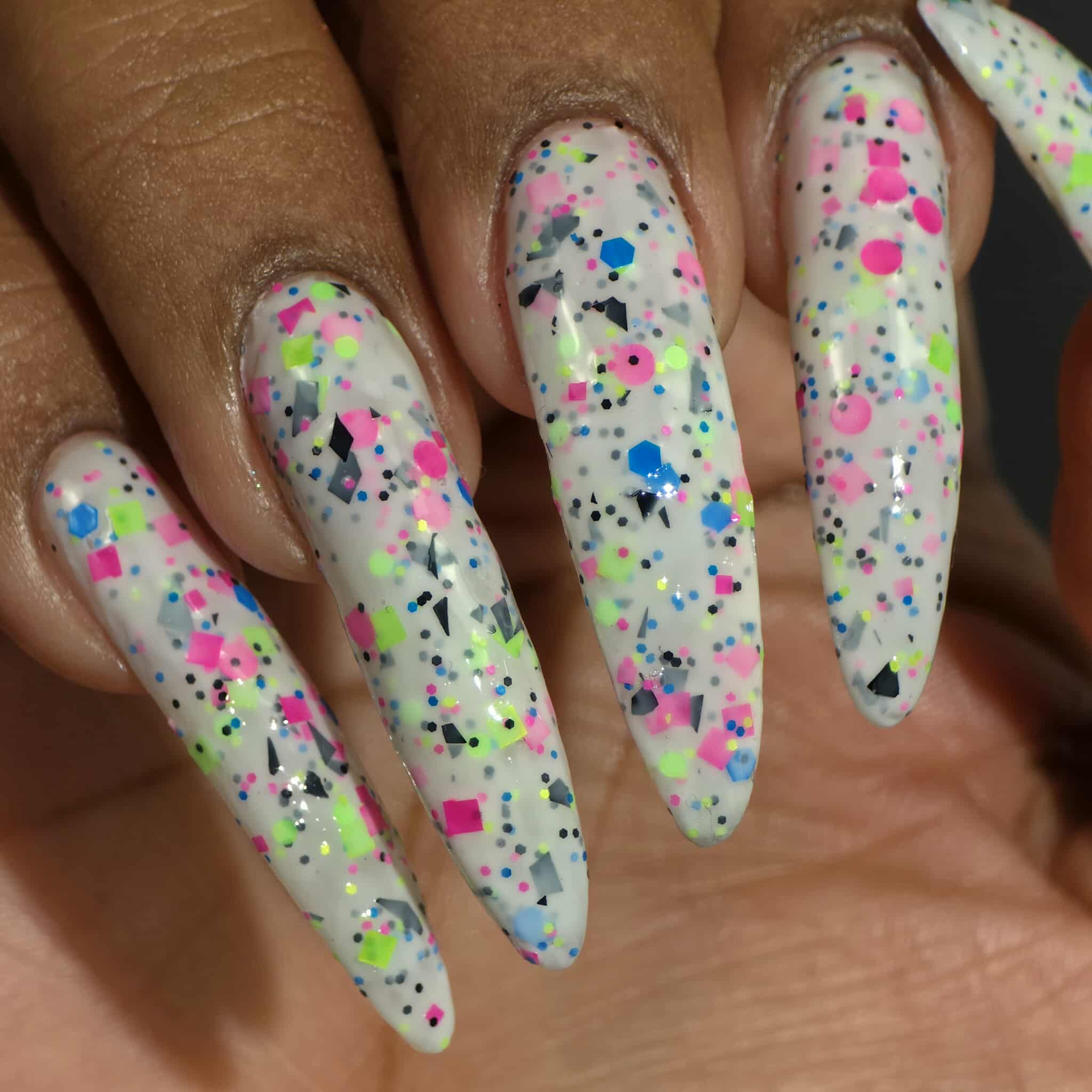 Description: This polish is a white crelly full of neon pink, green, blue, and black glitters, including squares and circles and shreds.