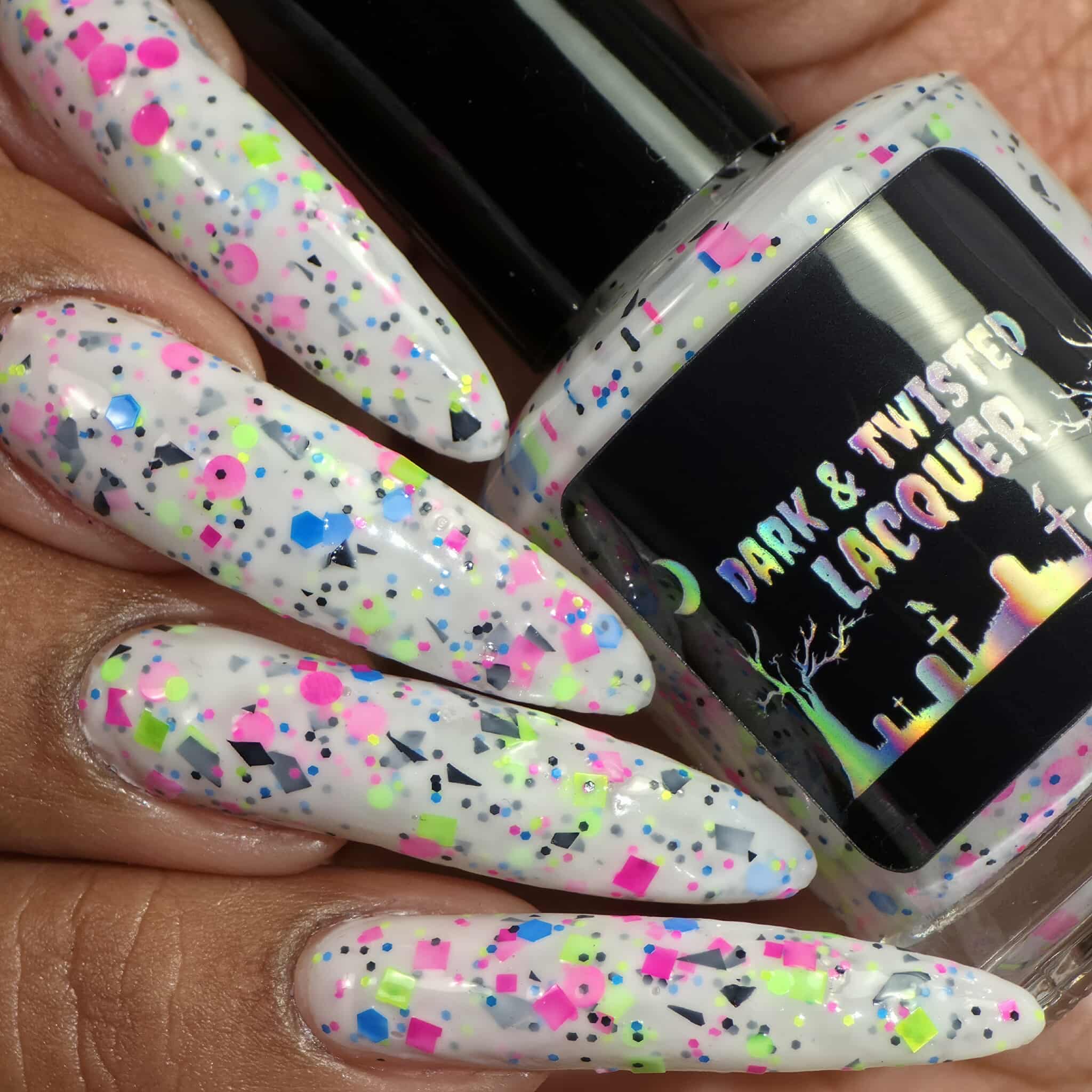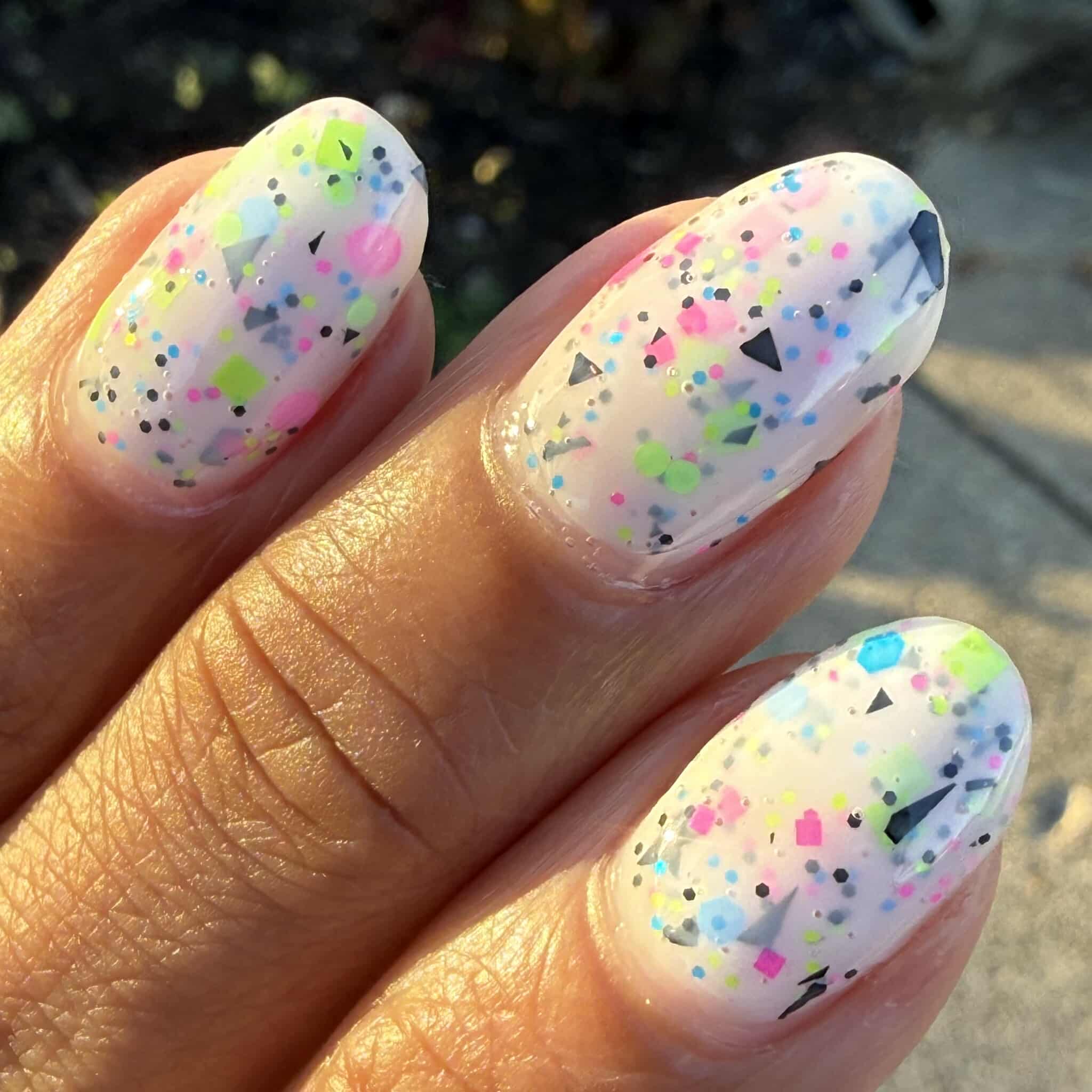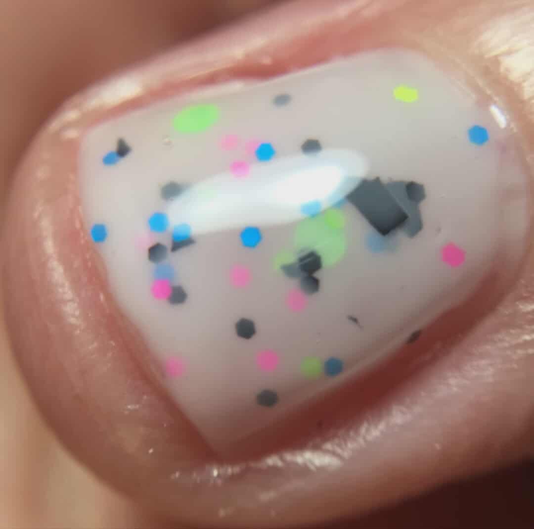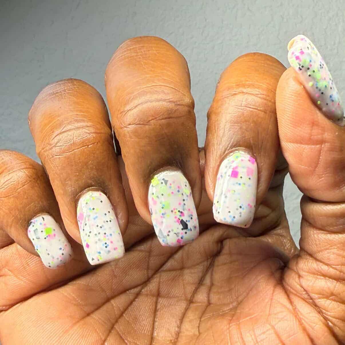 Description: This polish is a white crelly full of neon pink, green, blue, and black glitters, including squares and circles and shreds.