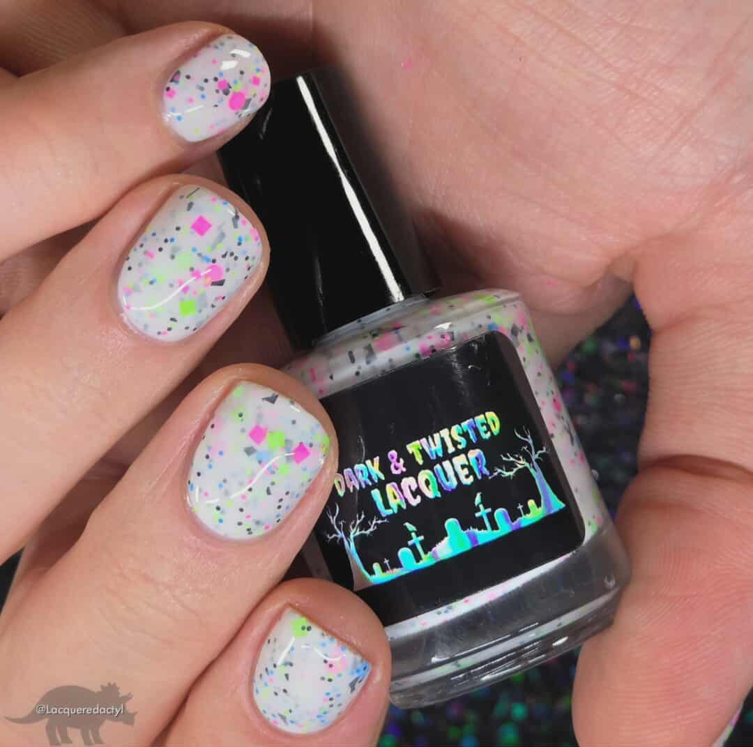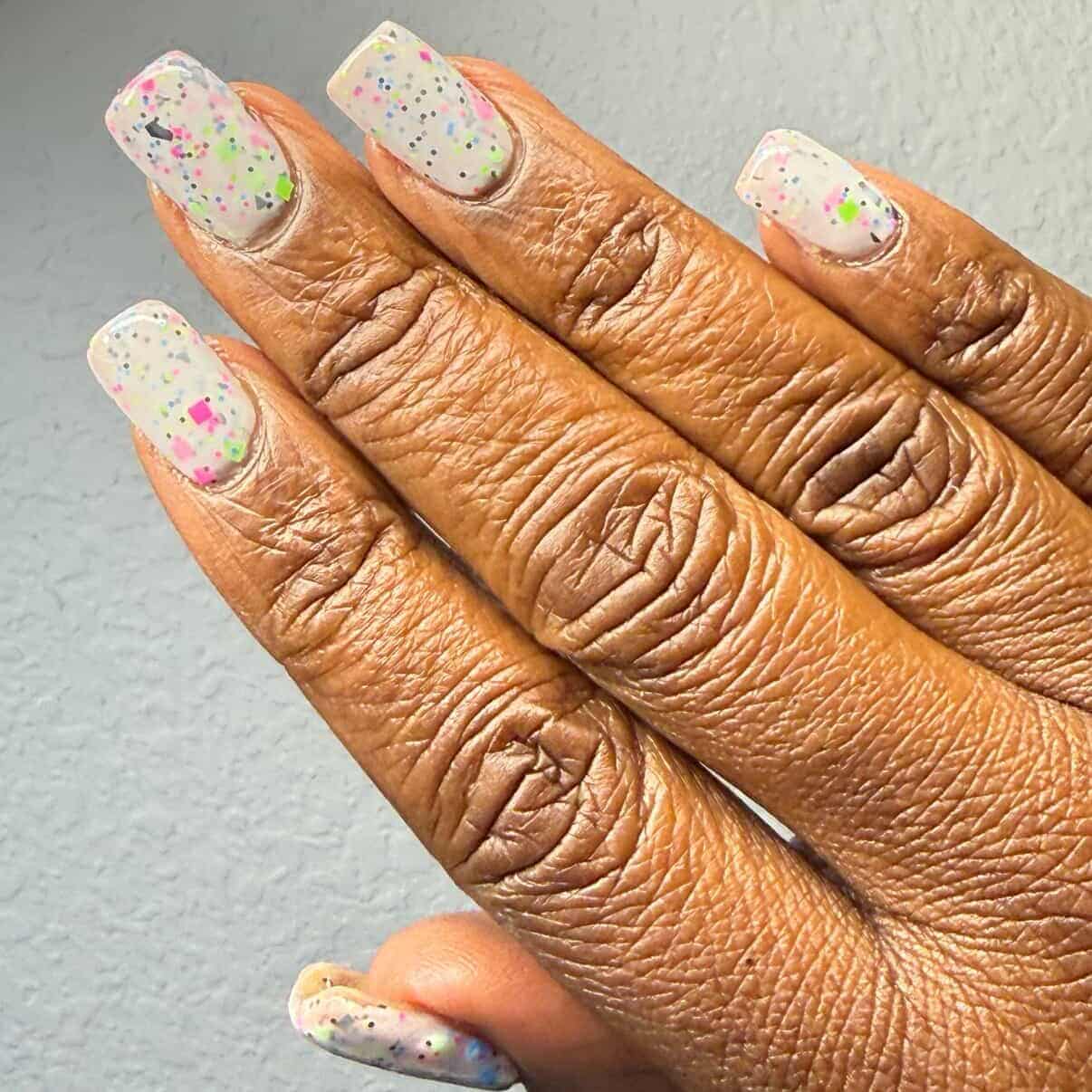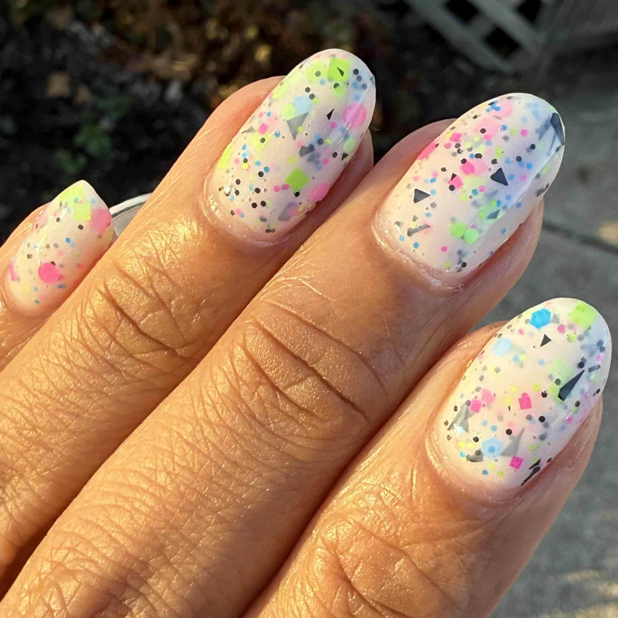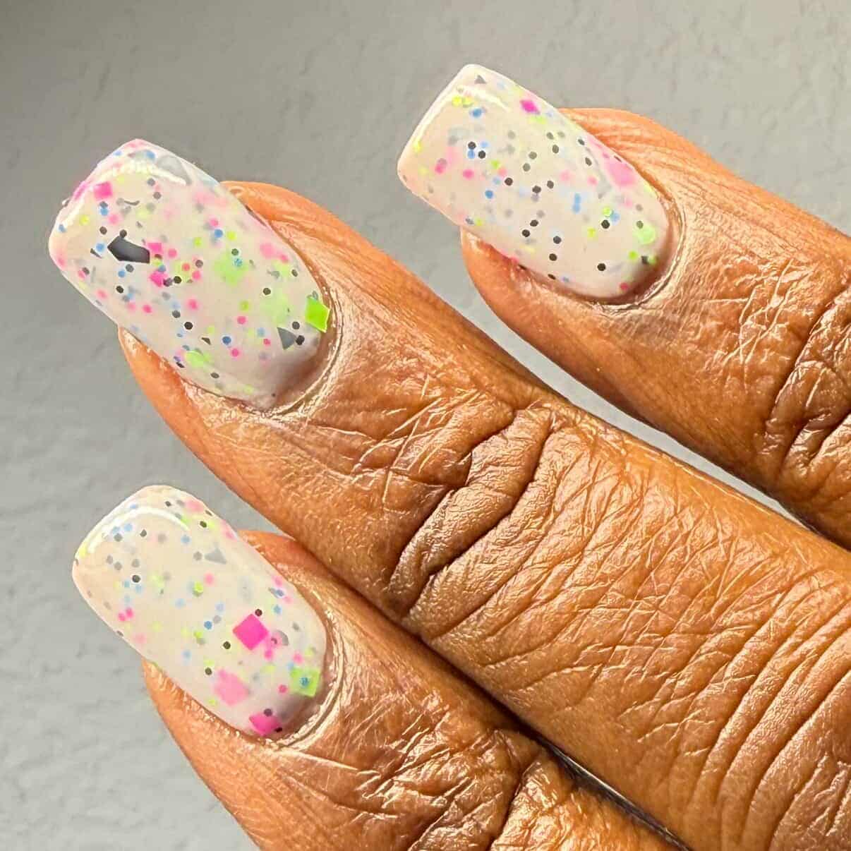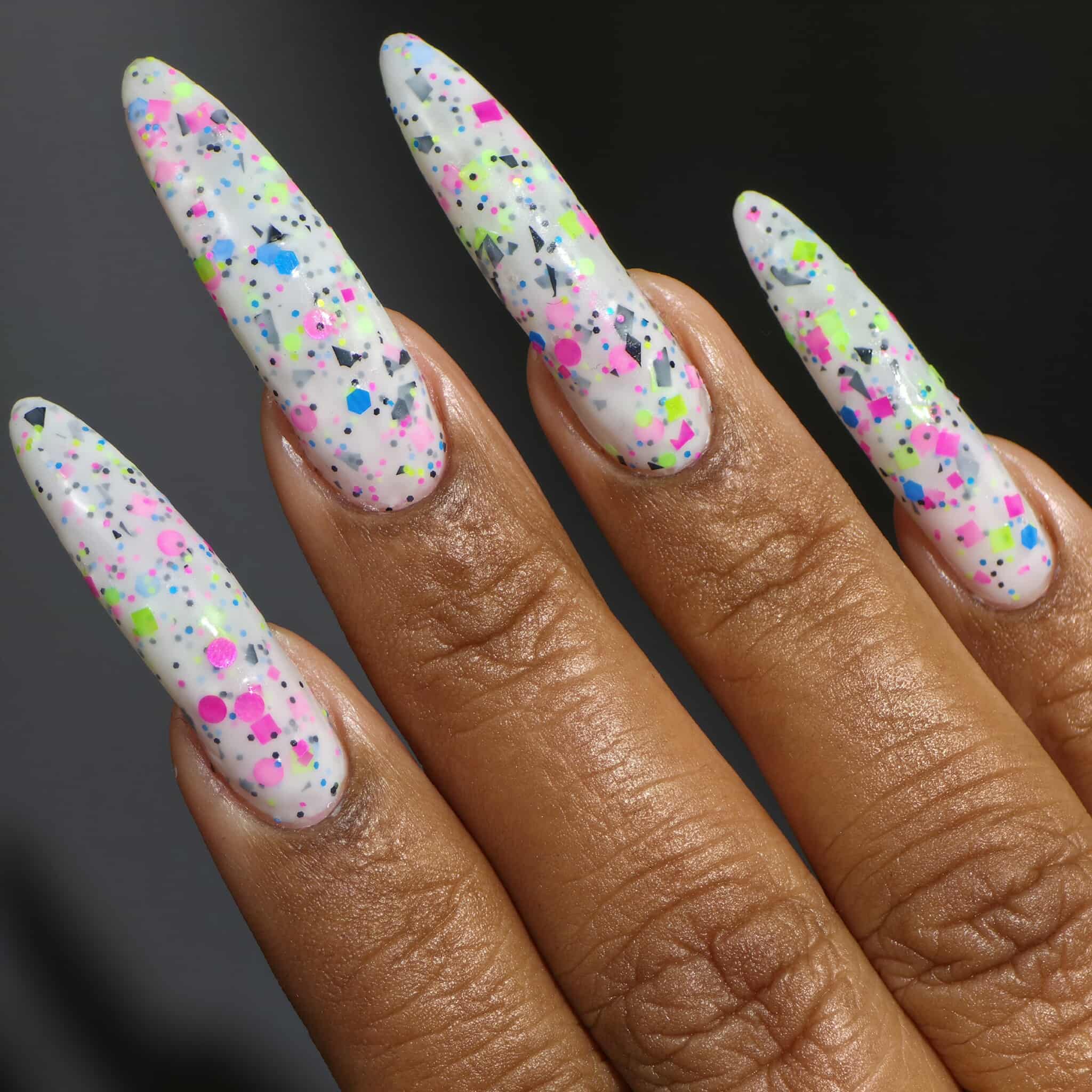 Description: This polish is a white crelly full of neon pink, green, blue, and black glitters, including squares and circles and shreds.