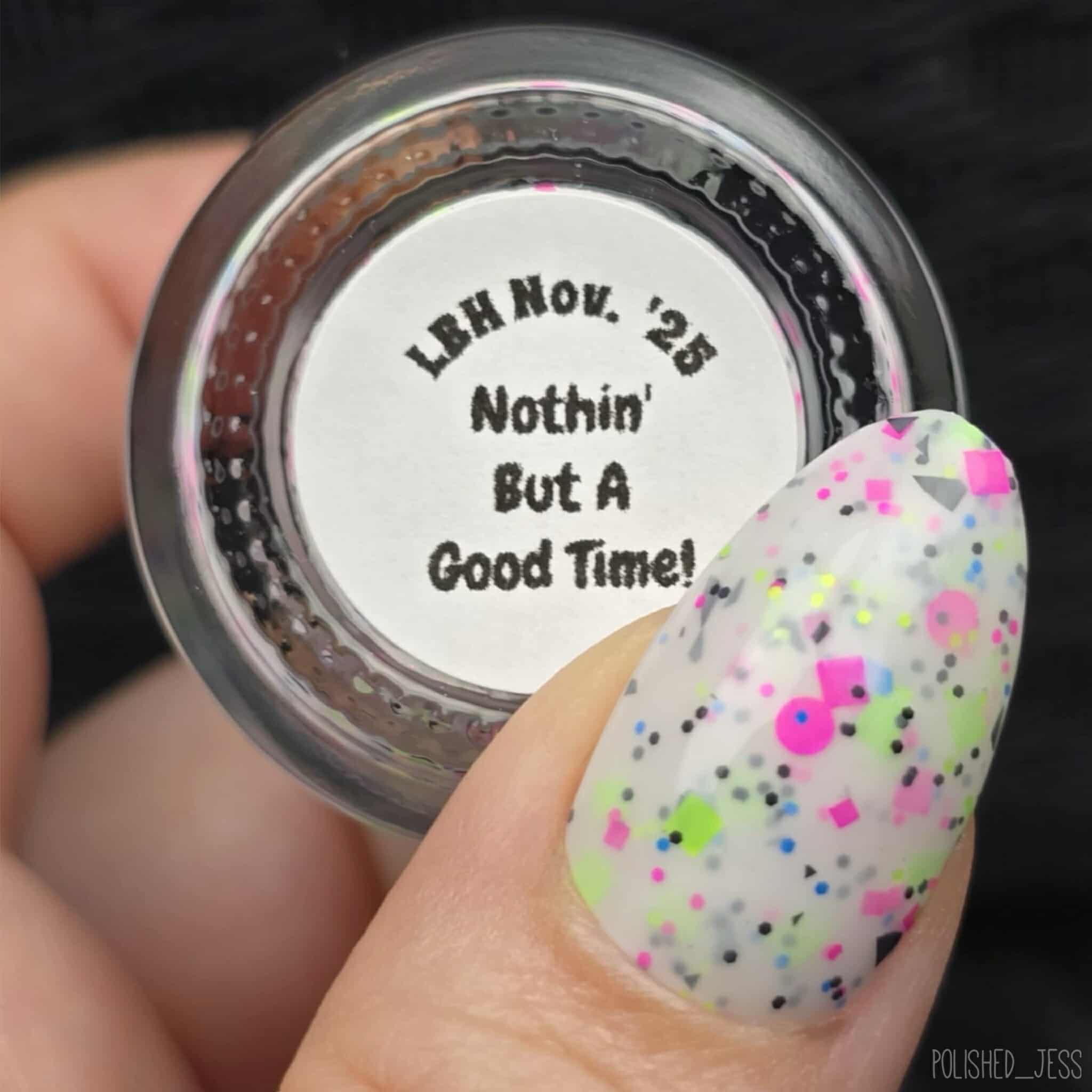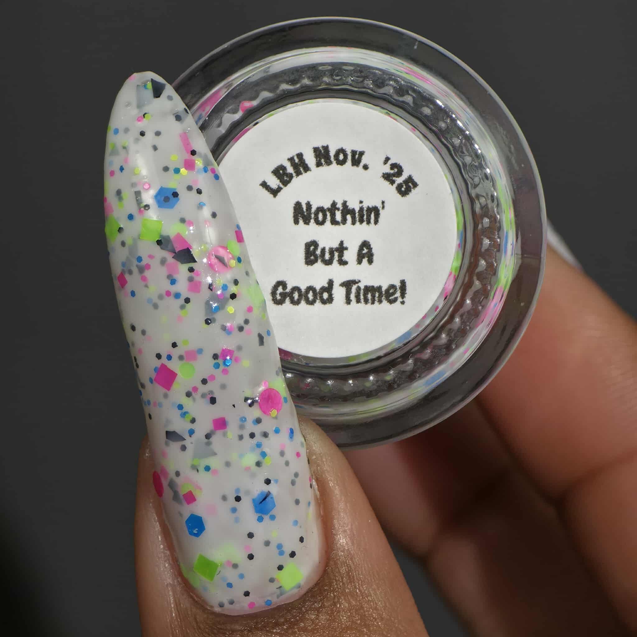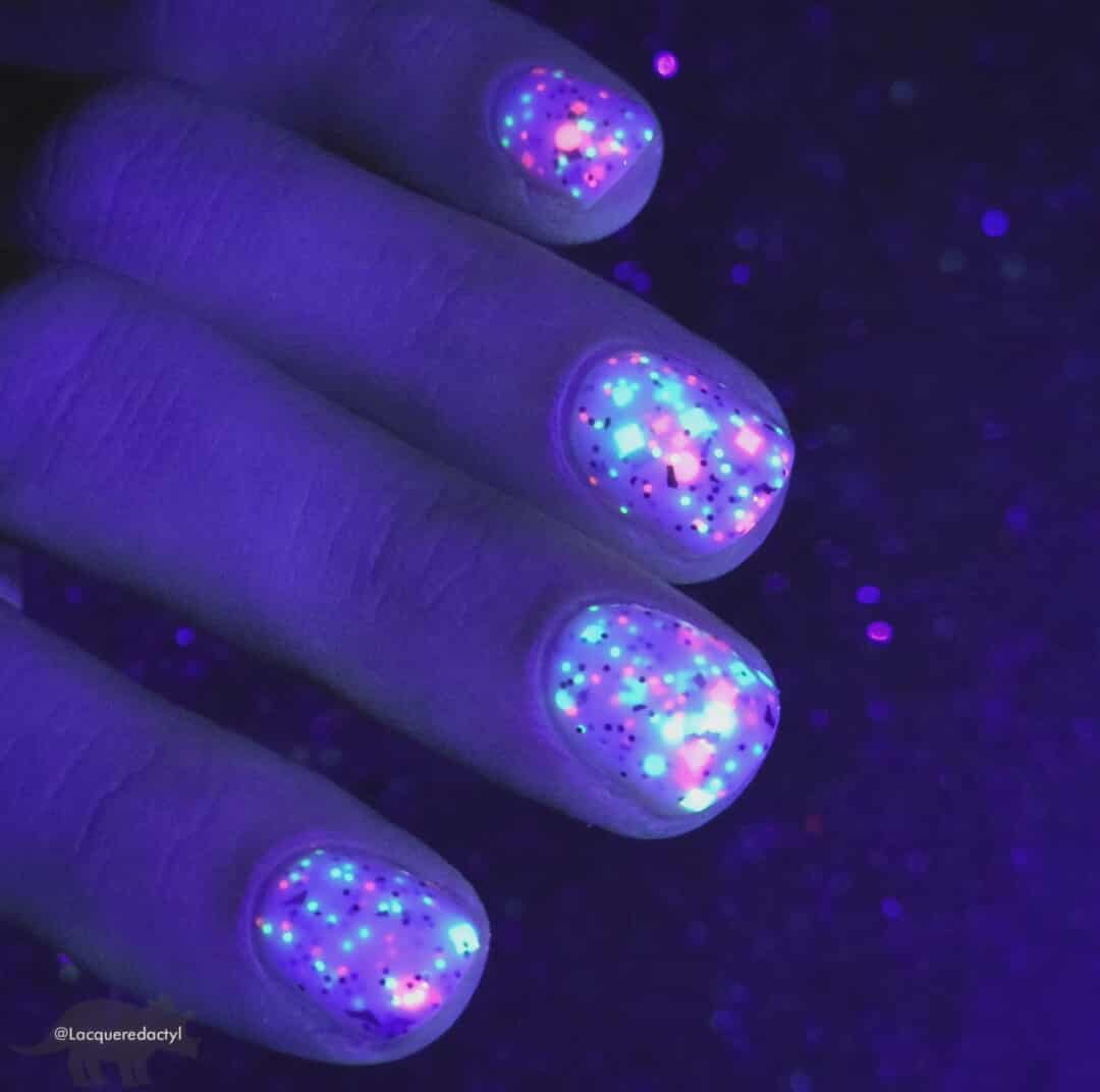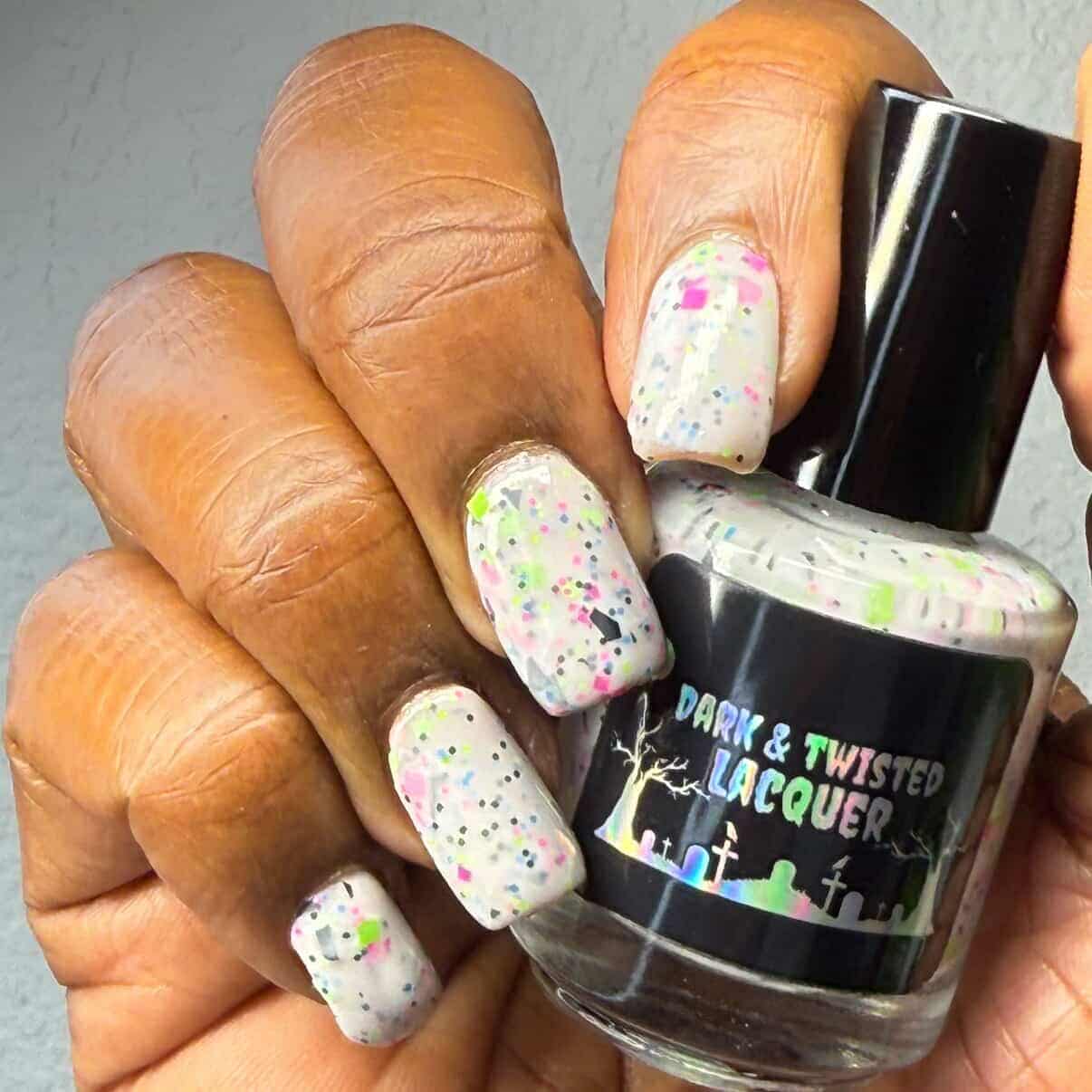Description: This polish is a white crelly full of neon pink, green, blue, and black glitters, including squares and circles and shreds.