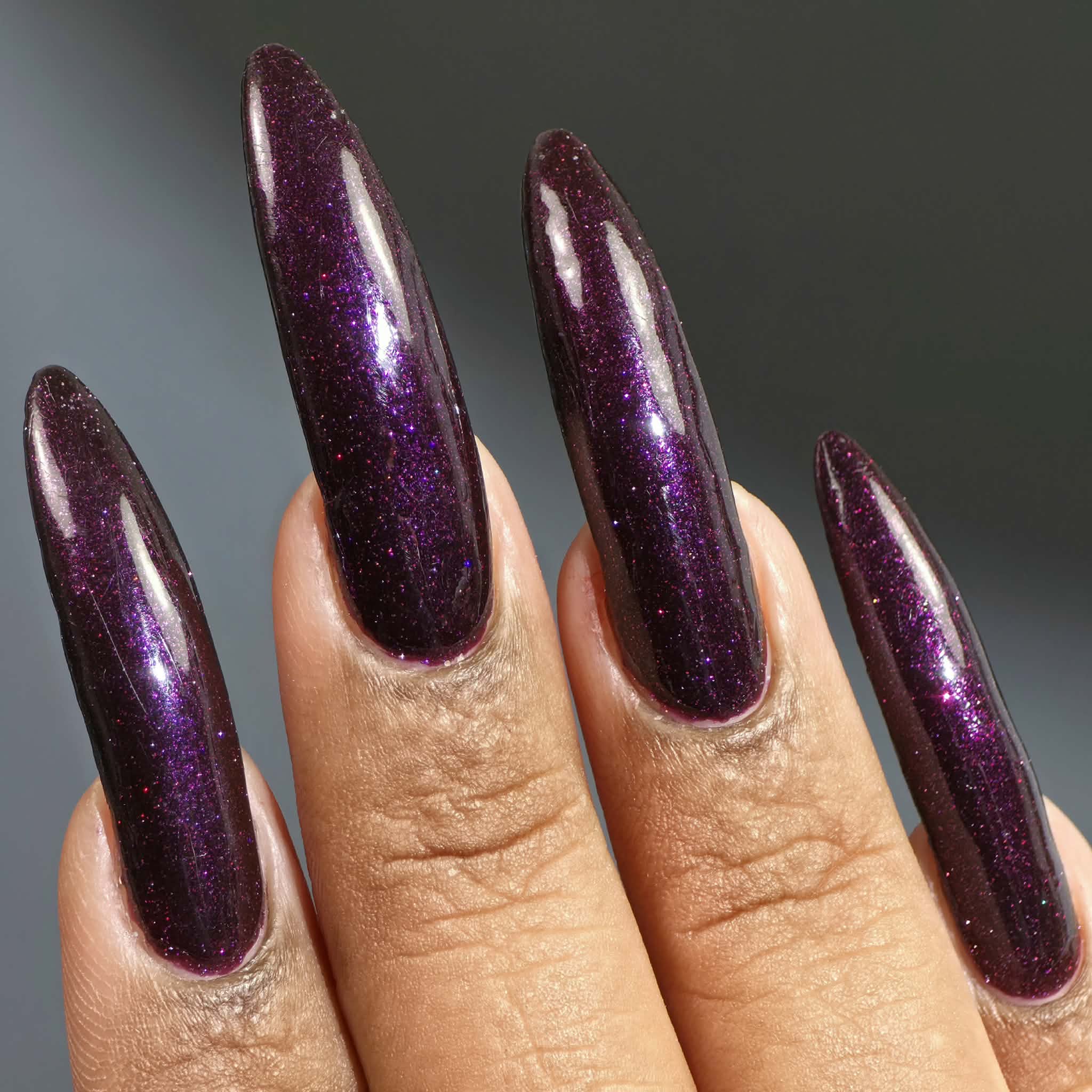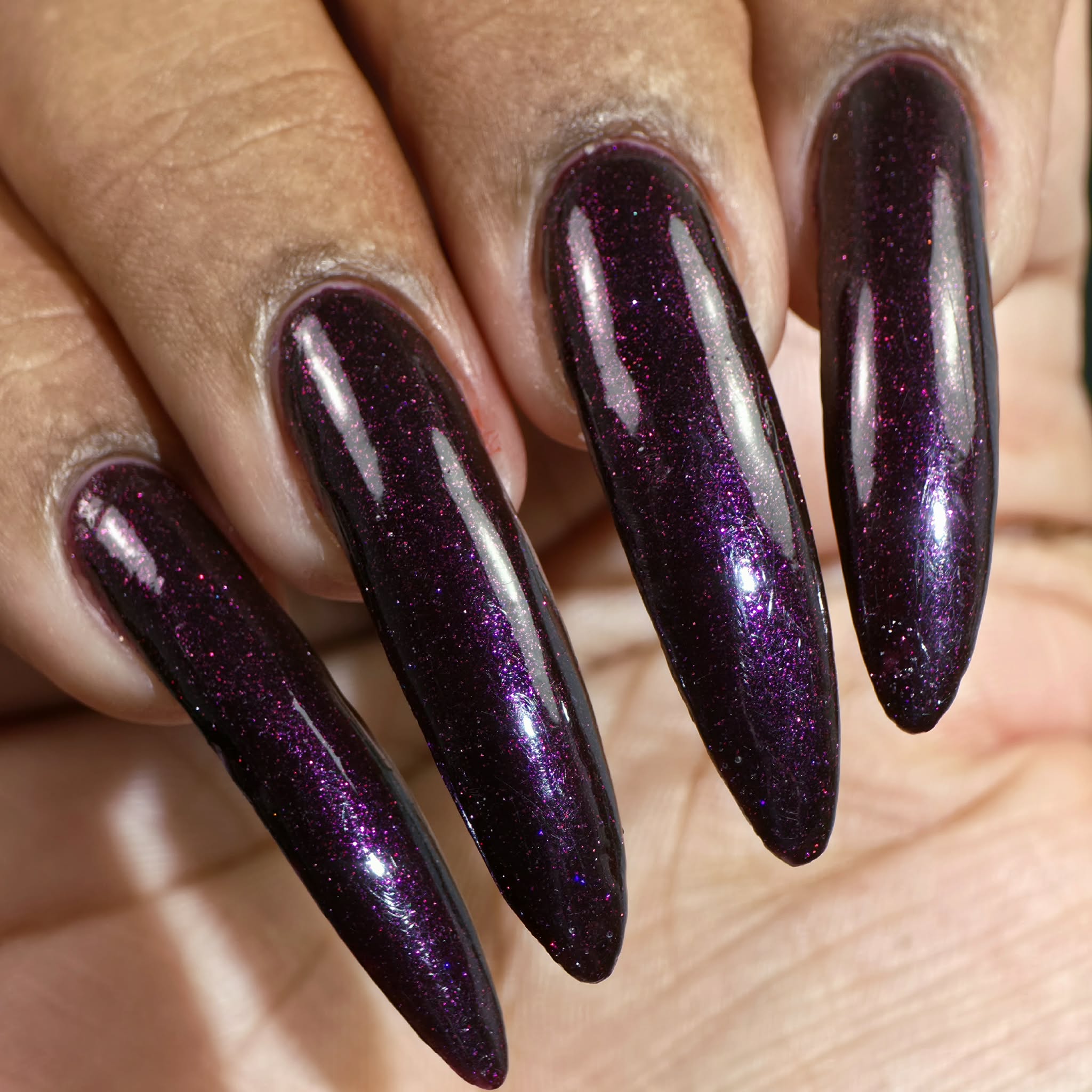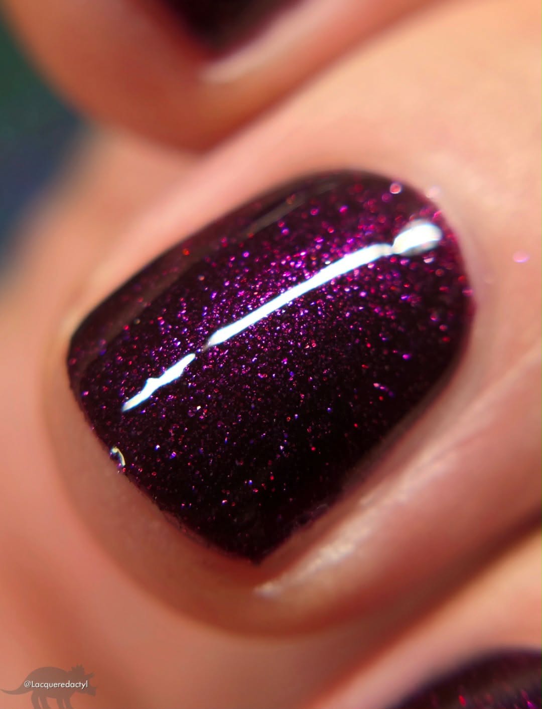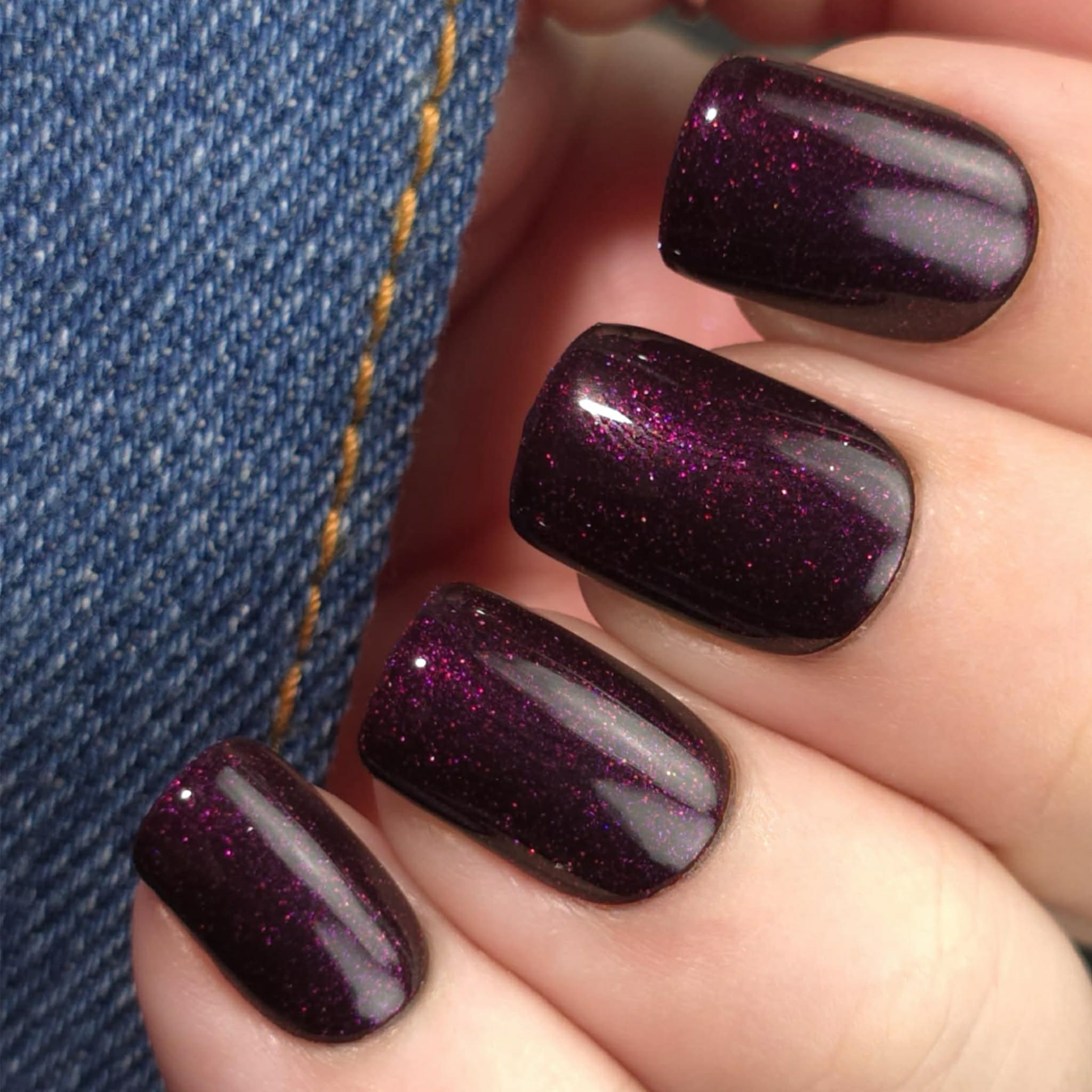 Description: This polish is a blackened berry base full of purple/red shimmer and lots of tiny silver reflective glitters and tiny pink glitters.
