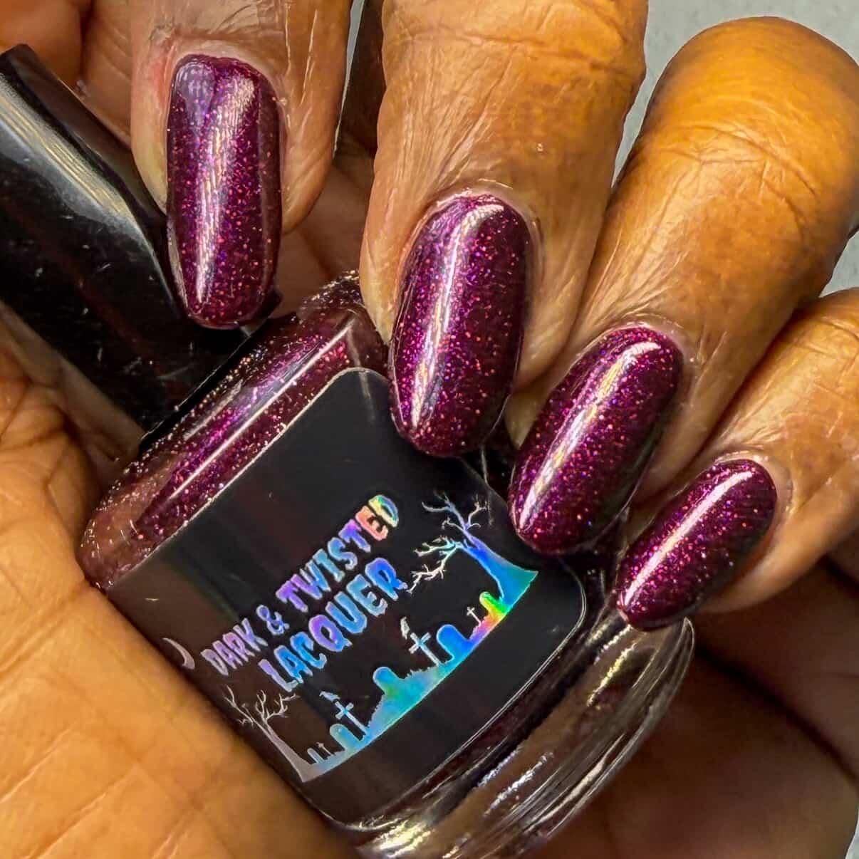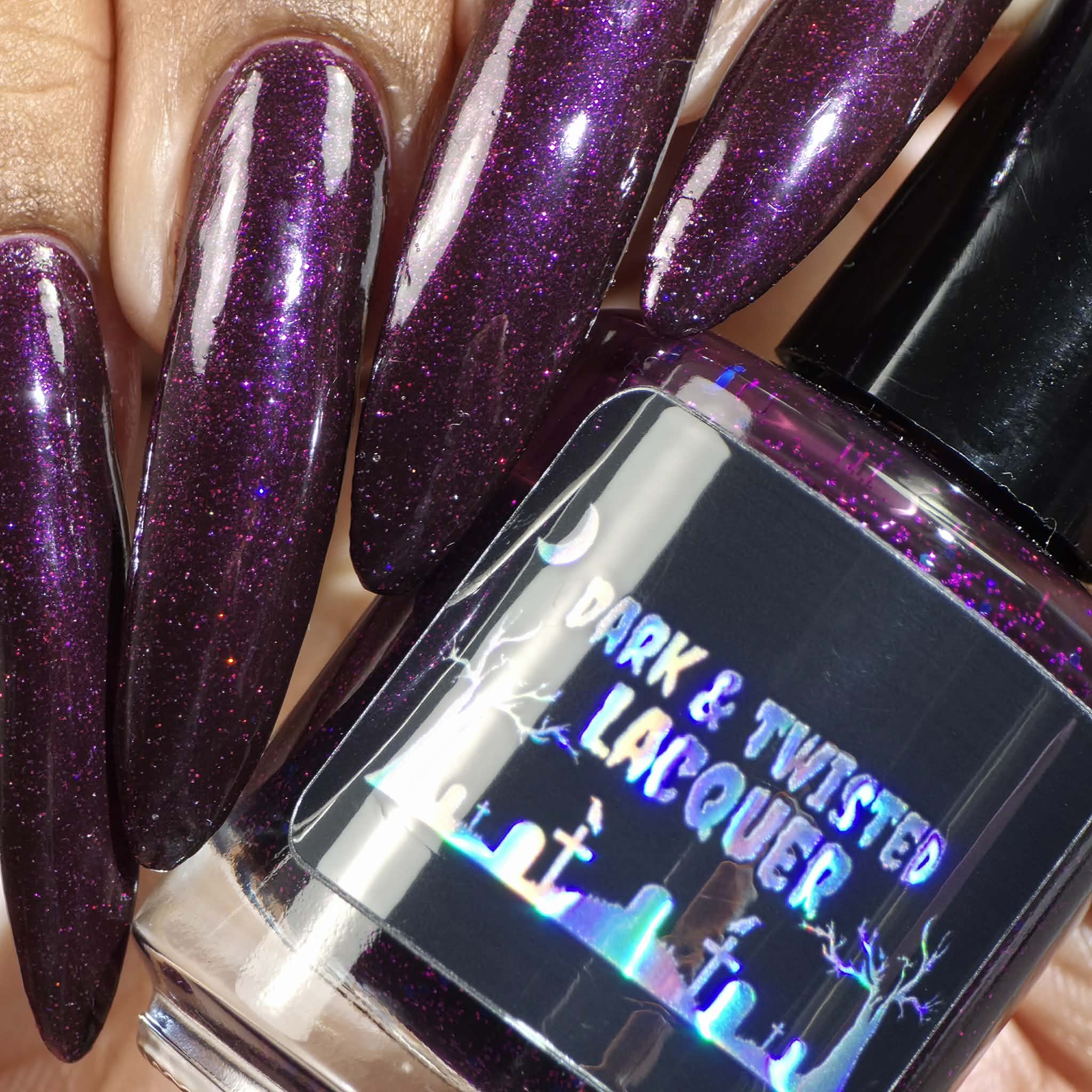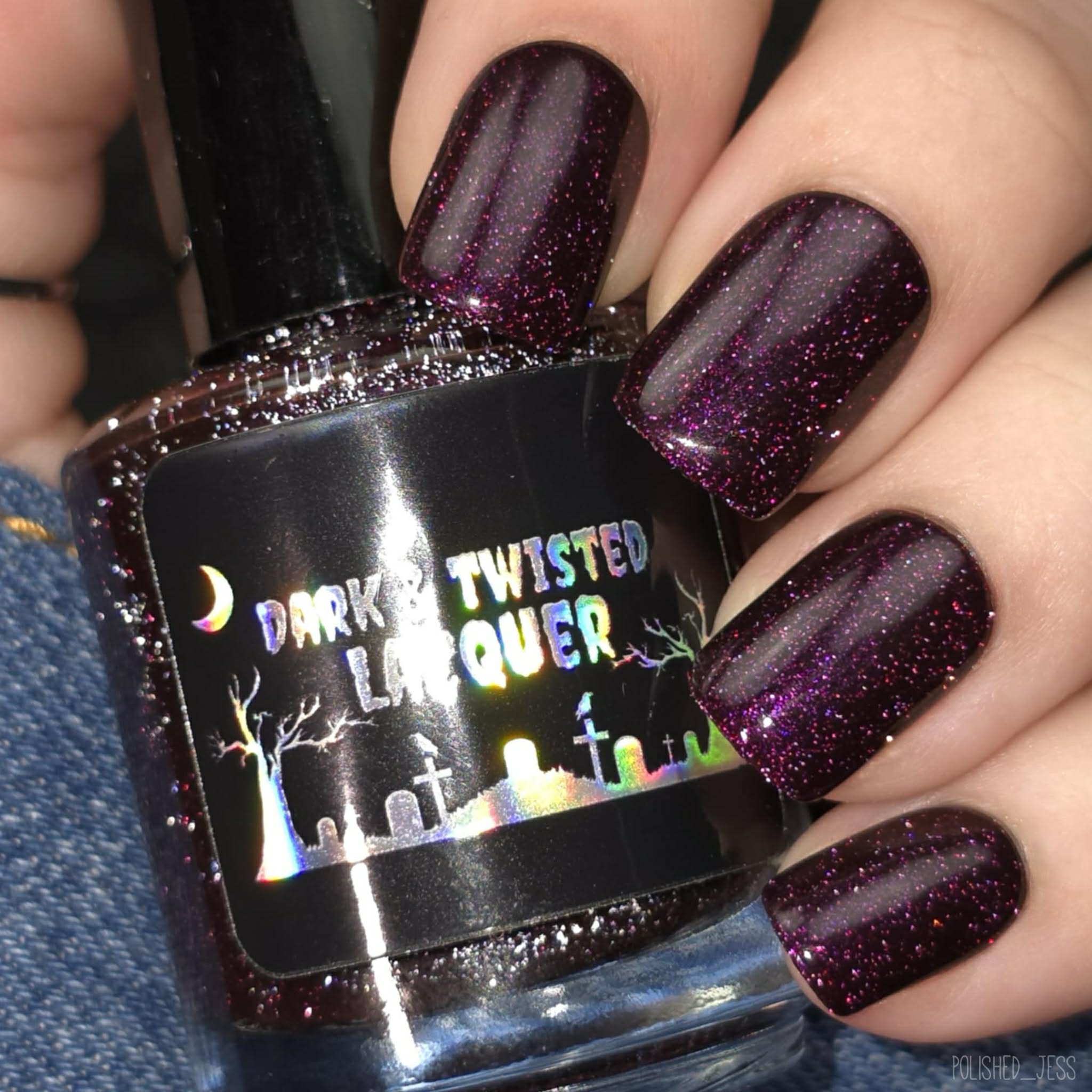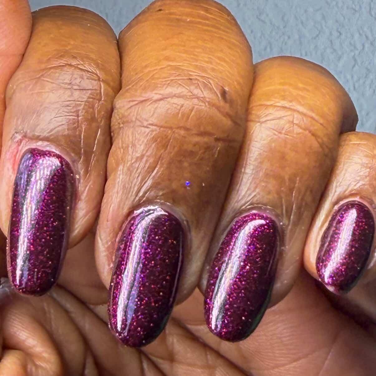 Description: This polish is a blackened berry base full of purple/red shimmer and lots of tiny silver reflective glitters and tiny pink glitters.