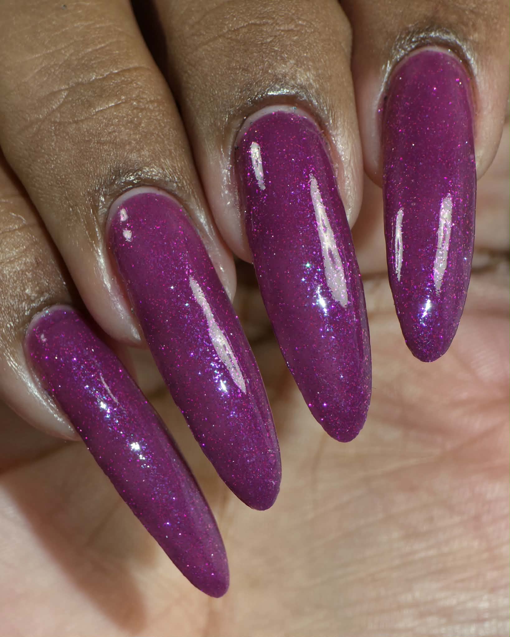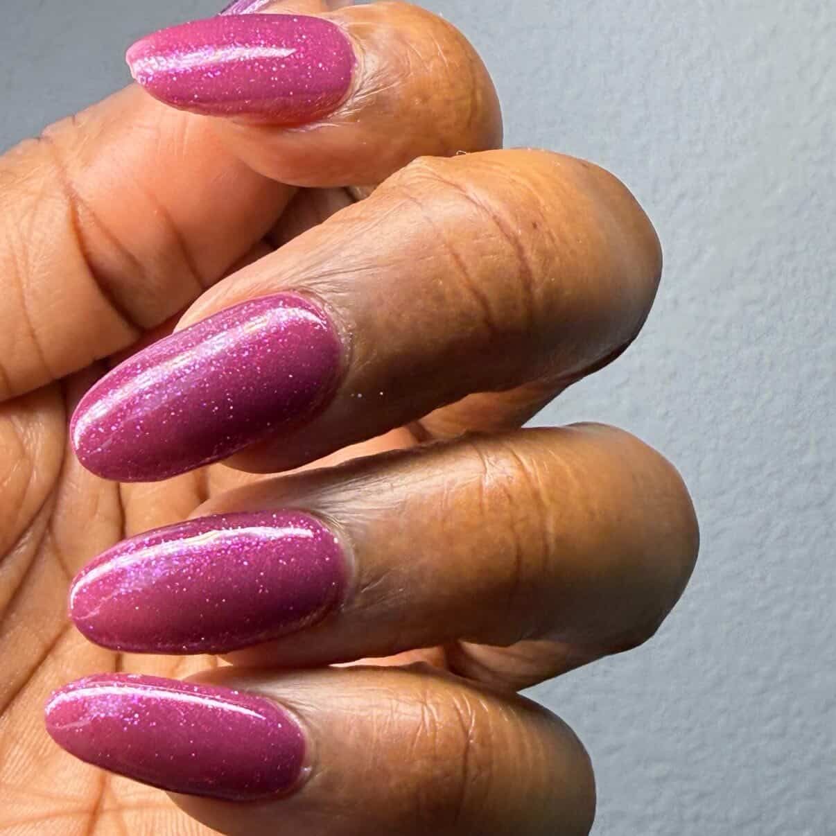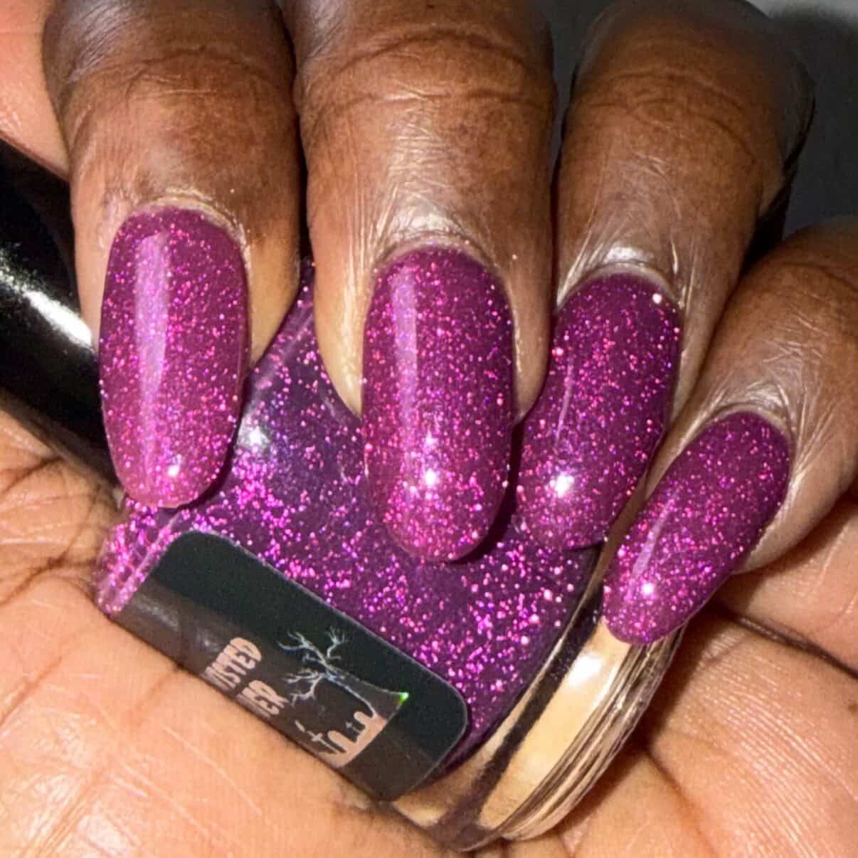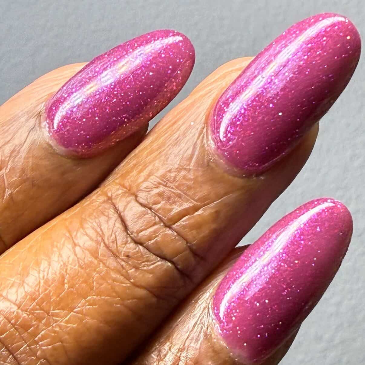 Description: This polish is a plum base full of reflective glitter and shimmer pink/purple.