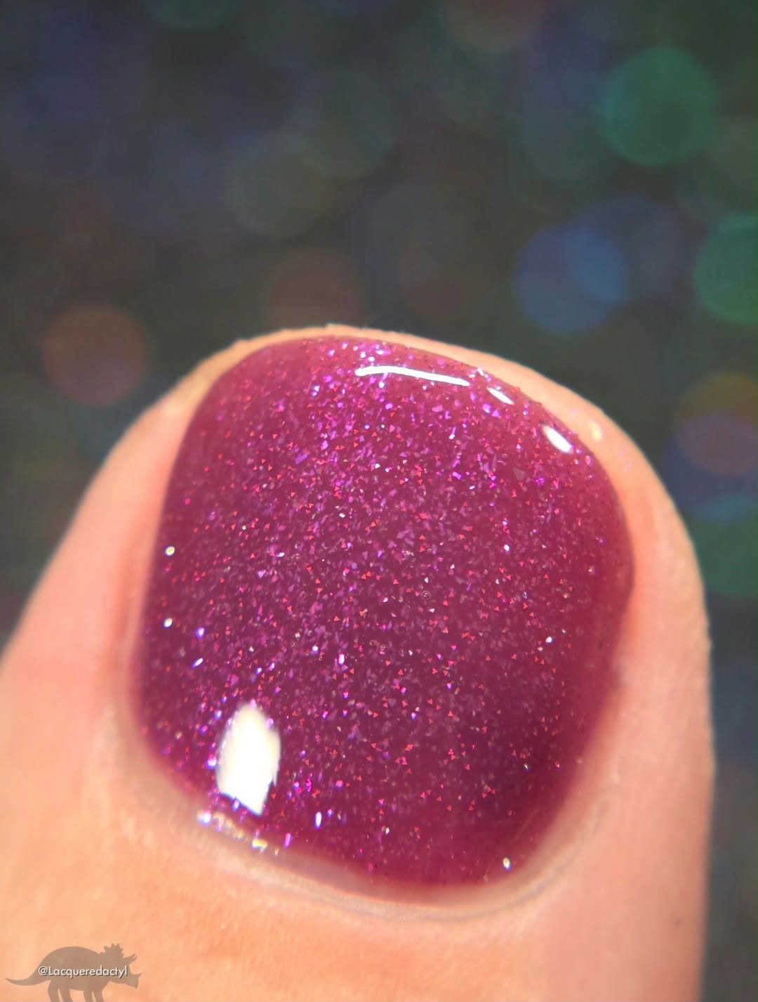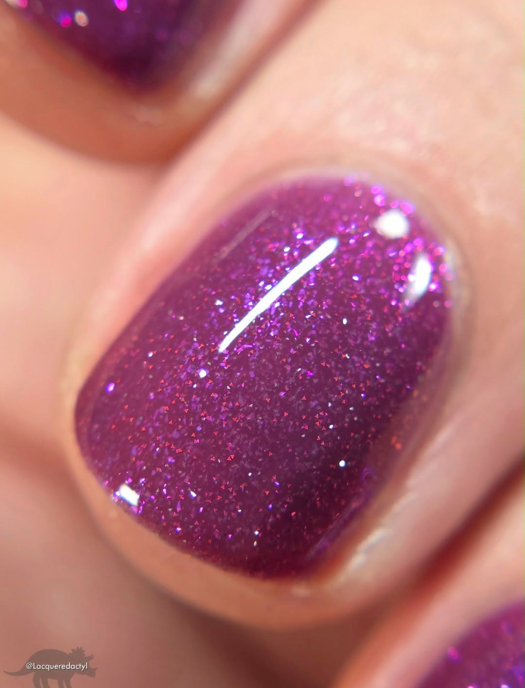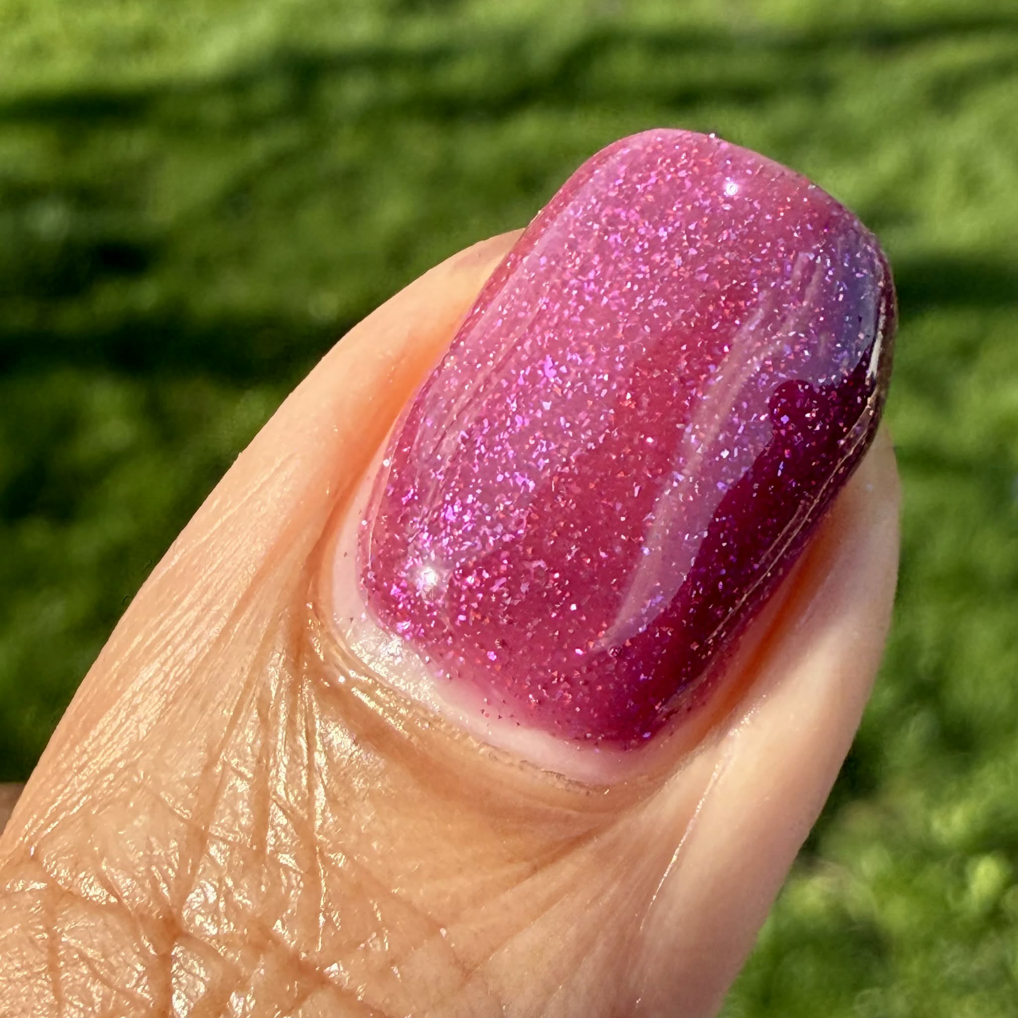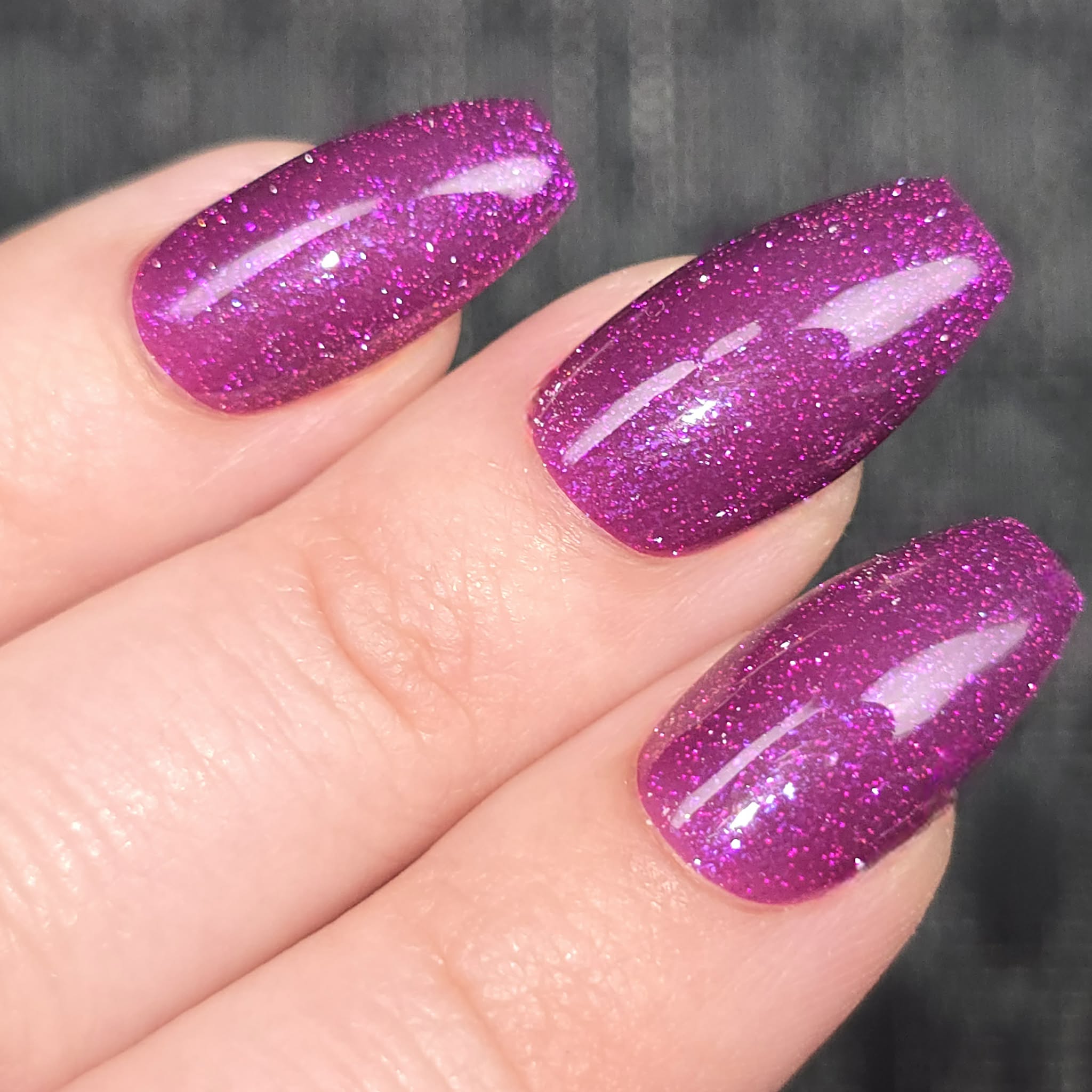 Description: This polish is a plum base full of reflective glitter and shimmer pink/purple.