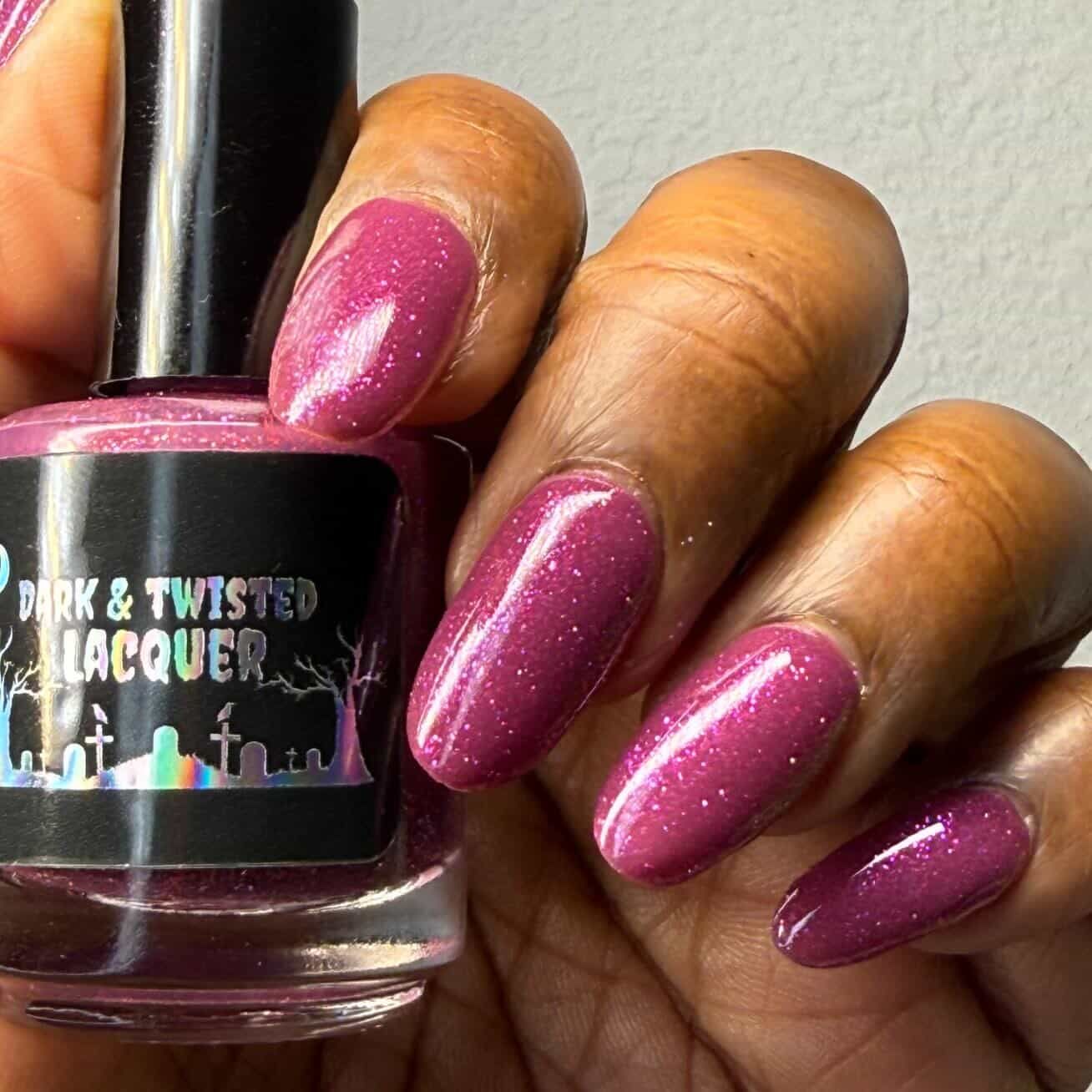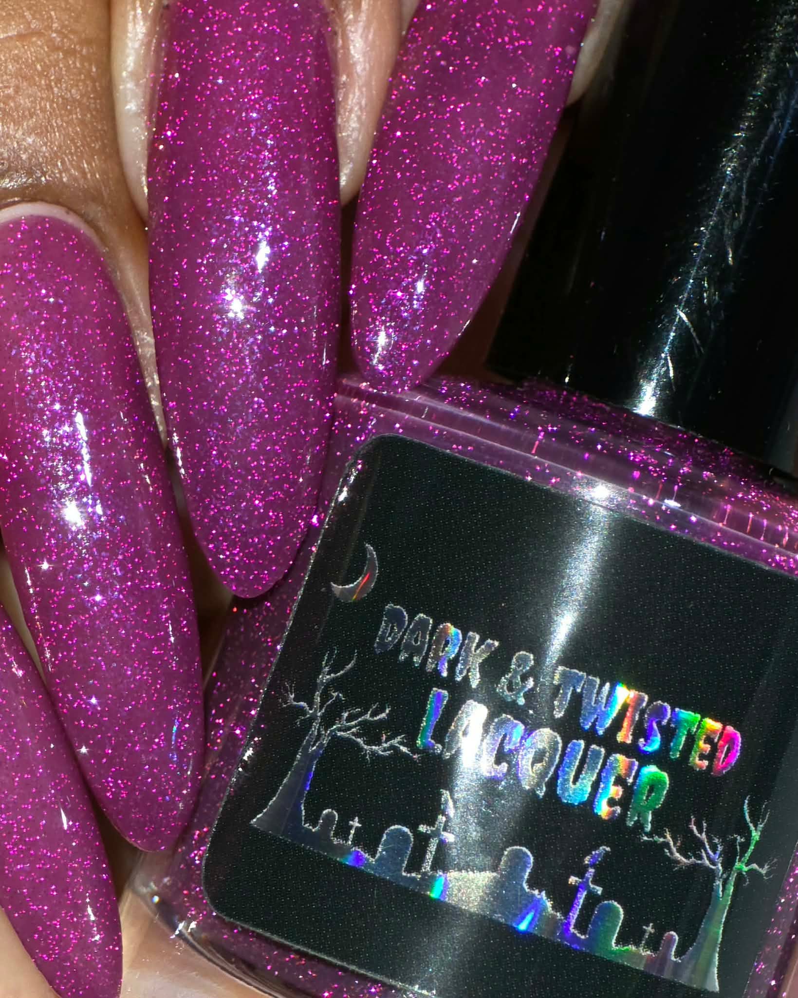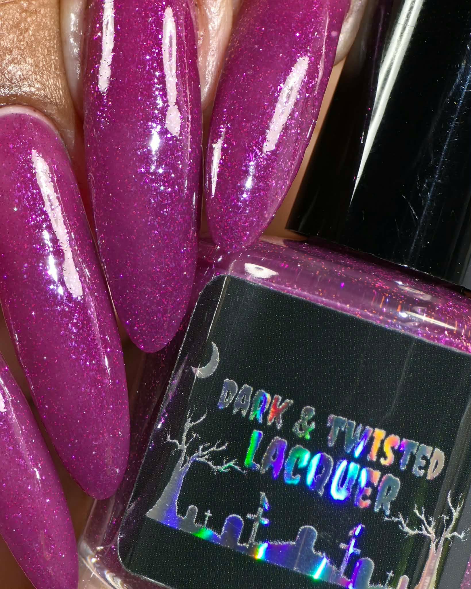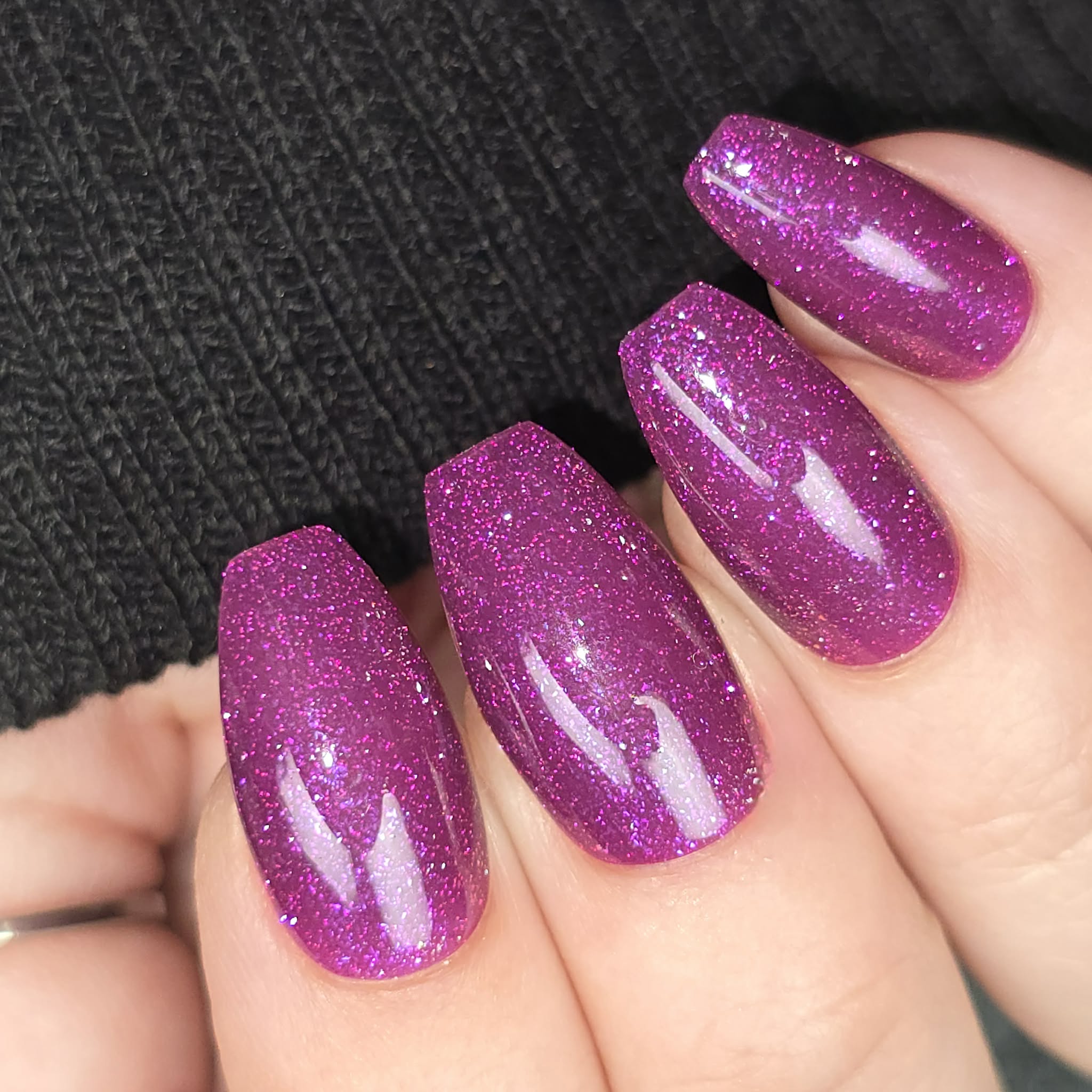 Description: This polish is a plum base full of reflective glitter and shimmer pink/purple.