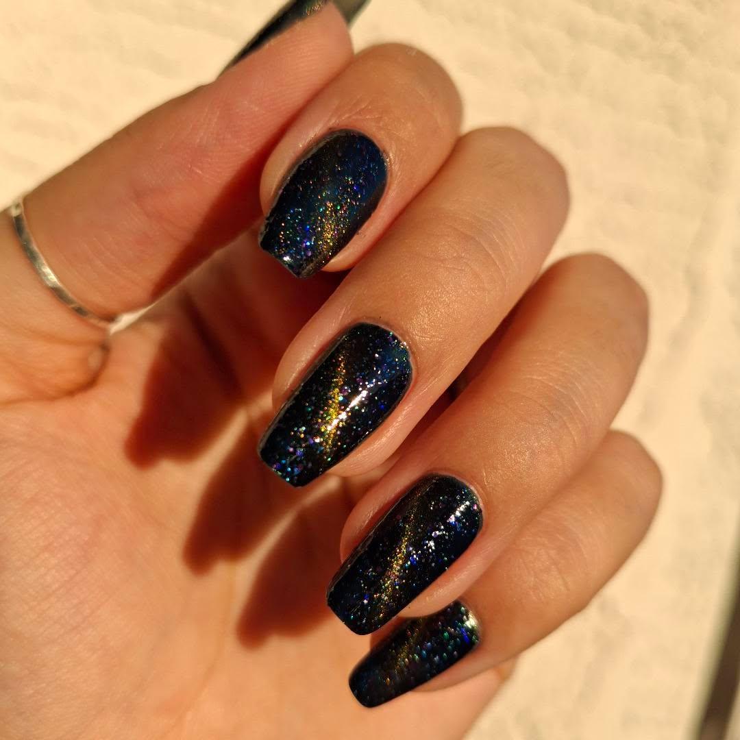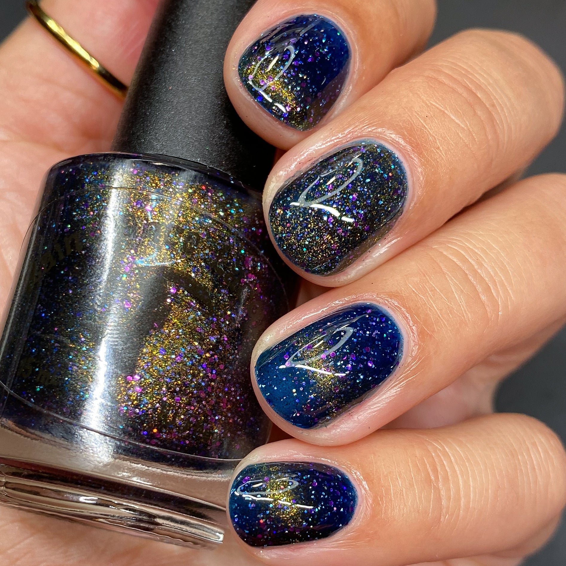 Description: Fear Inoculum is a midnight blue base with purple micro glitter, fuchsia hex glitters, scattered holo flakes and a gorgeous orange magnetic pigment.