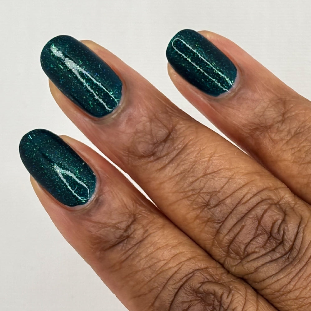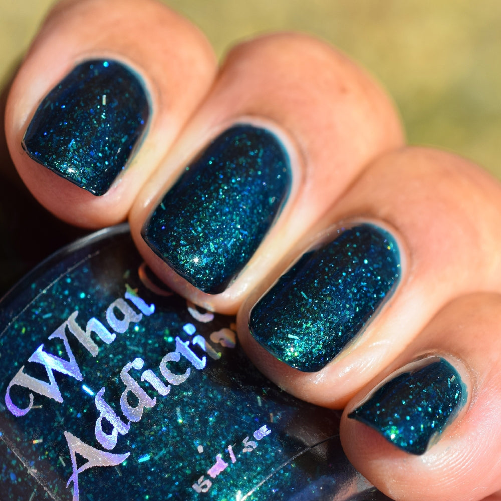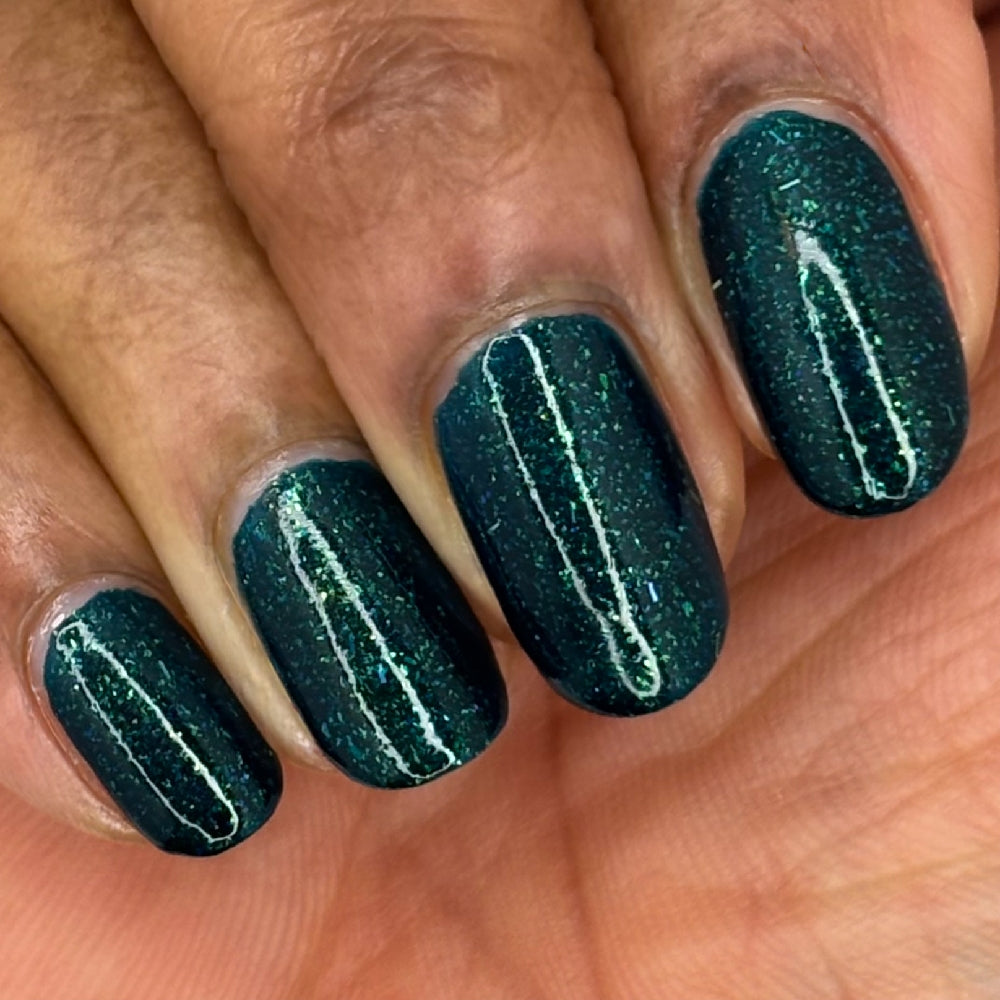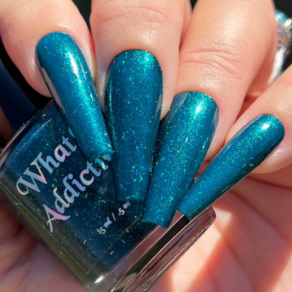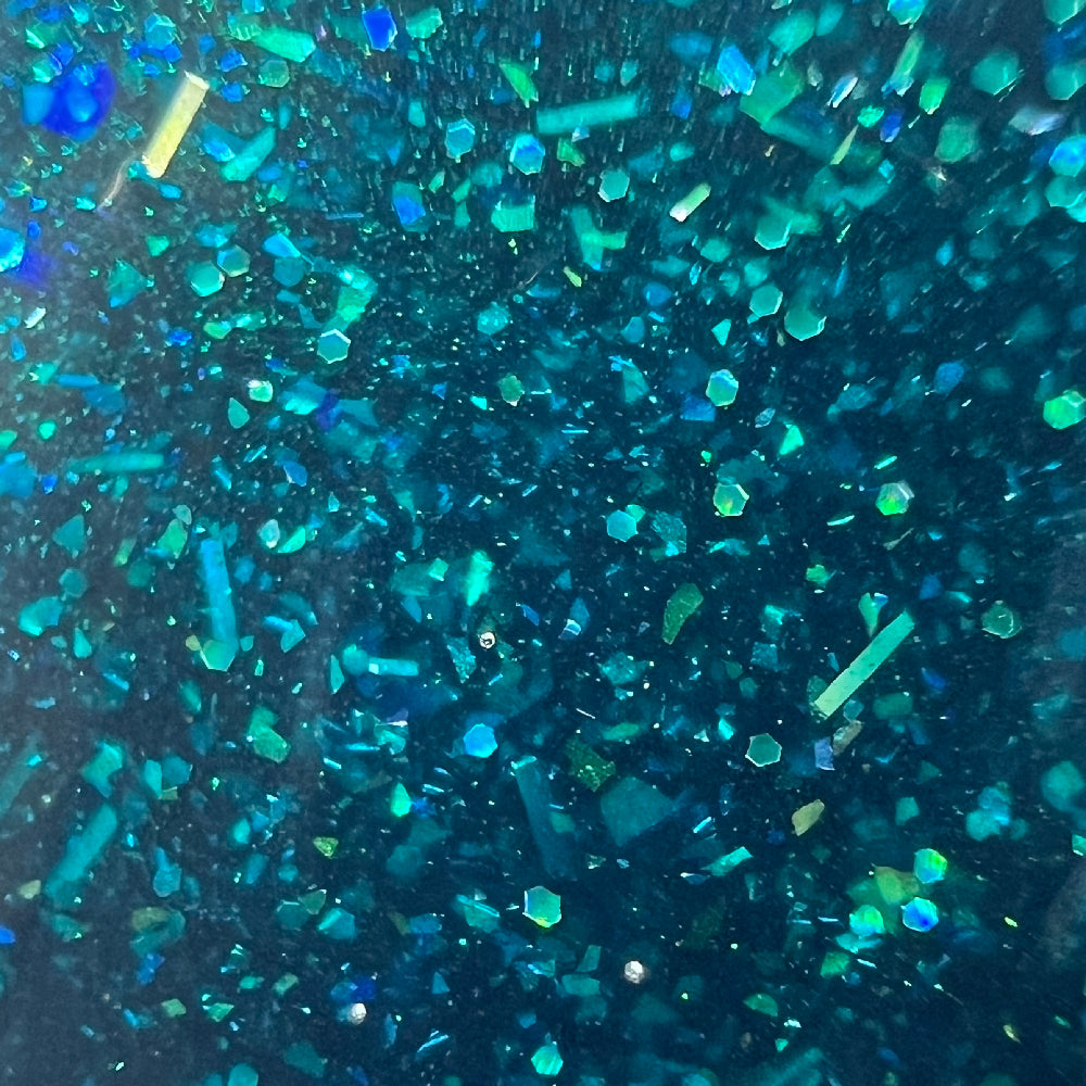 Description: A deep teal base filled with blue/green flakes, micro green holographic glitter and micro silver holographic tinsel.