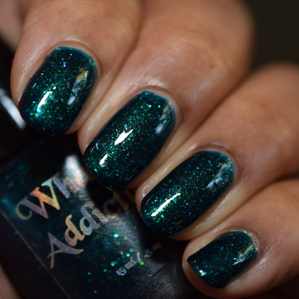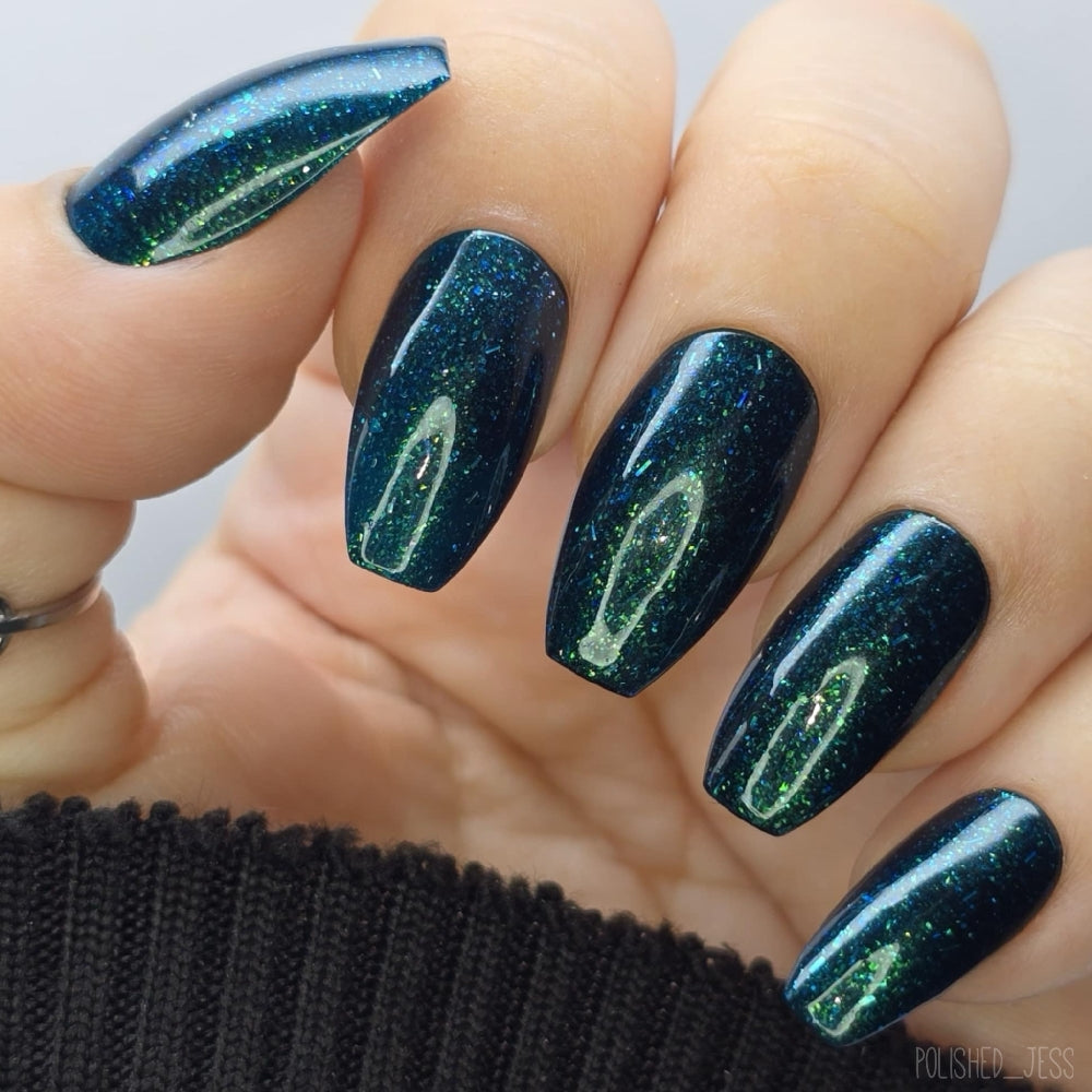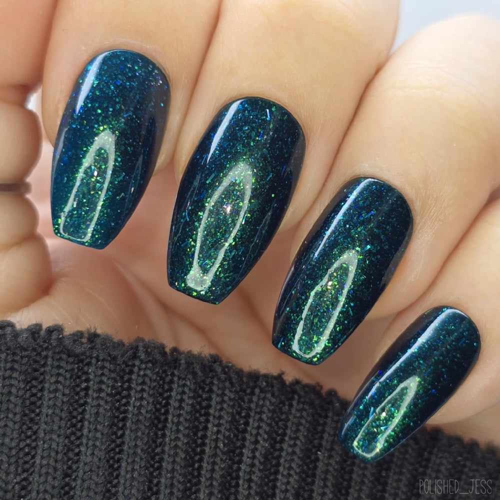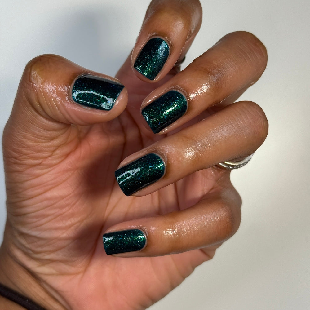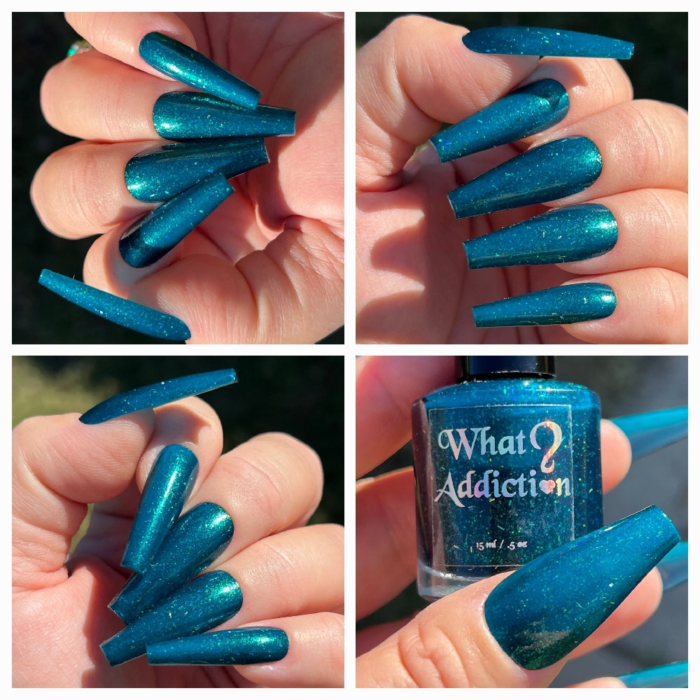 Description: A deep teal base filled with blue/green flakes, micro green holographic glitter and micro silver holographic tinsel.