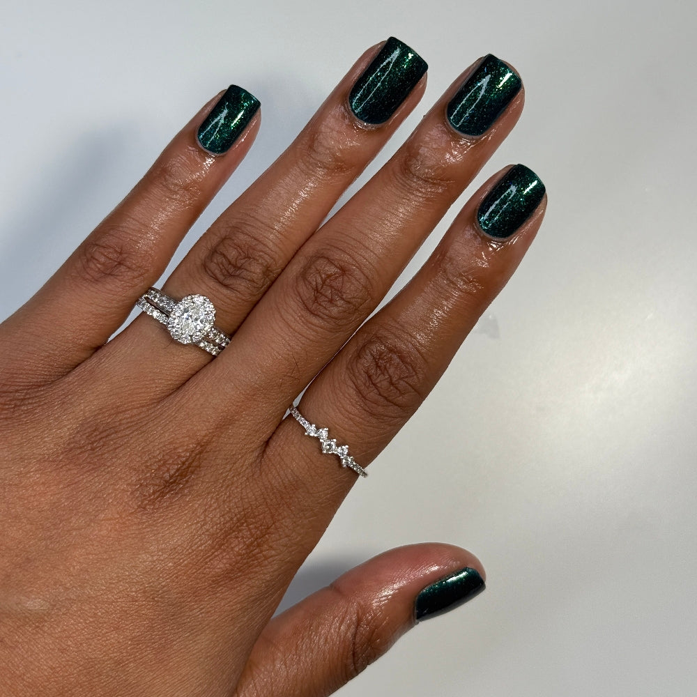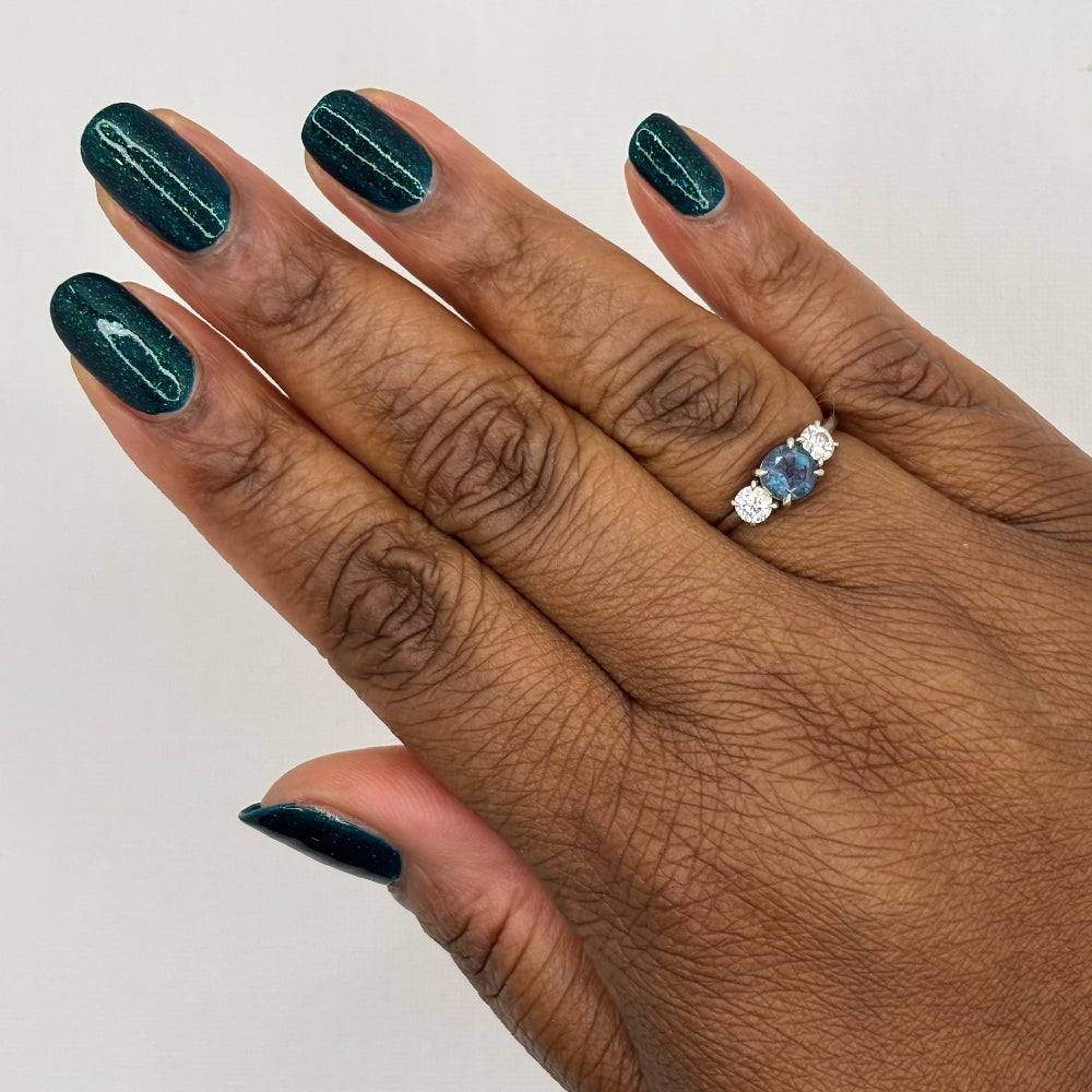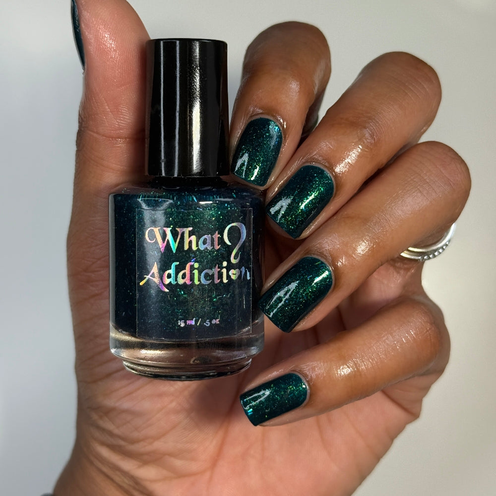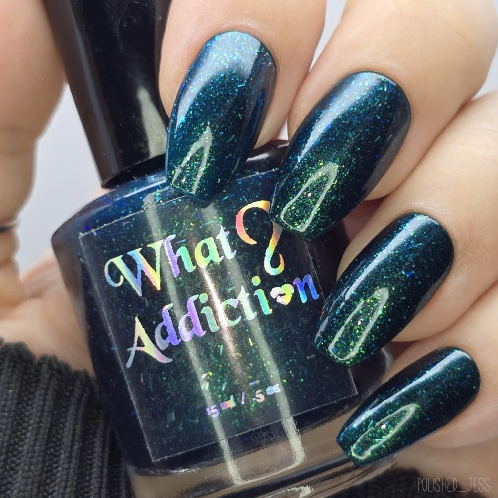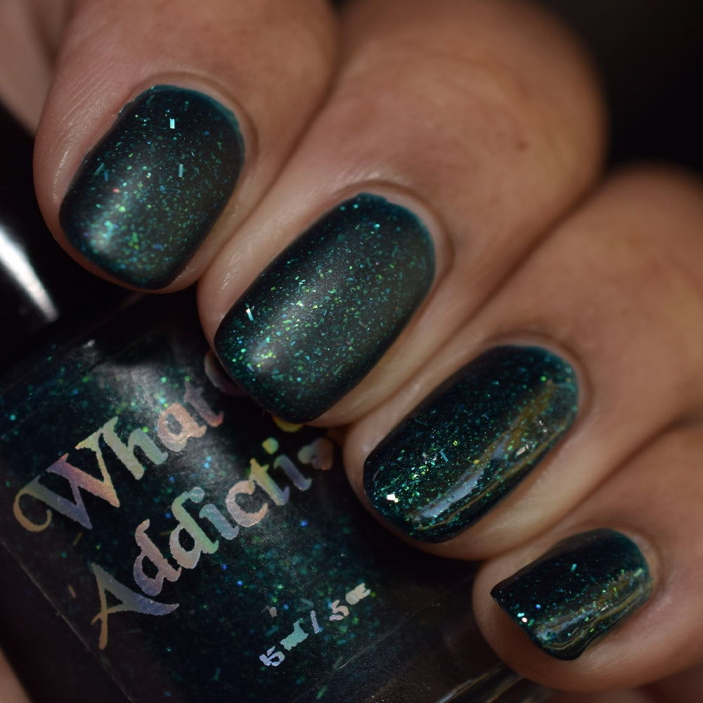 Description: A deep teal base filled with blue/green flakes, micro green holographic glitter and micro silver holographic tinsel.