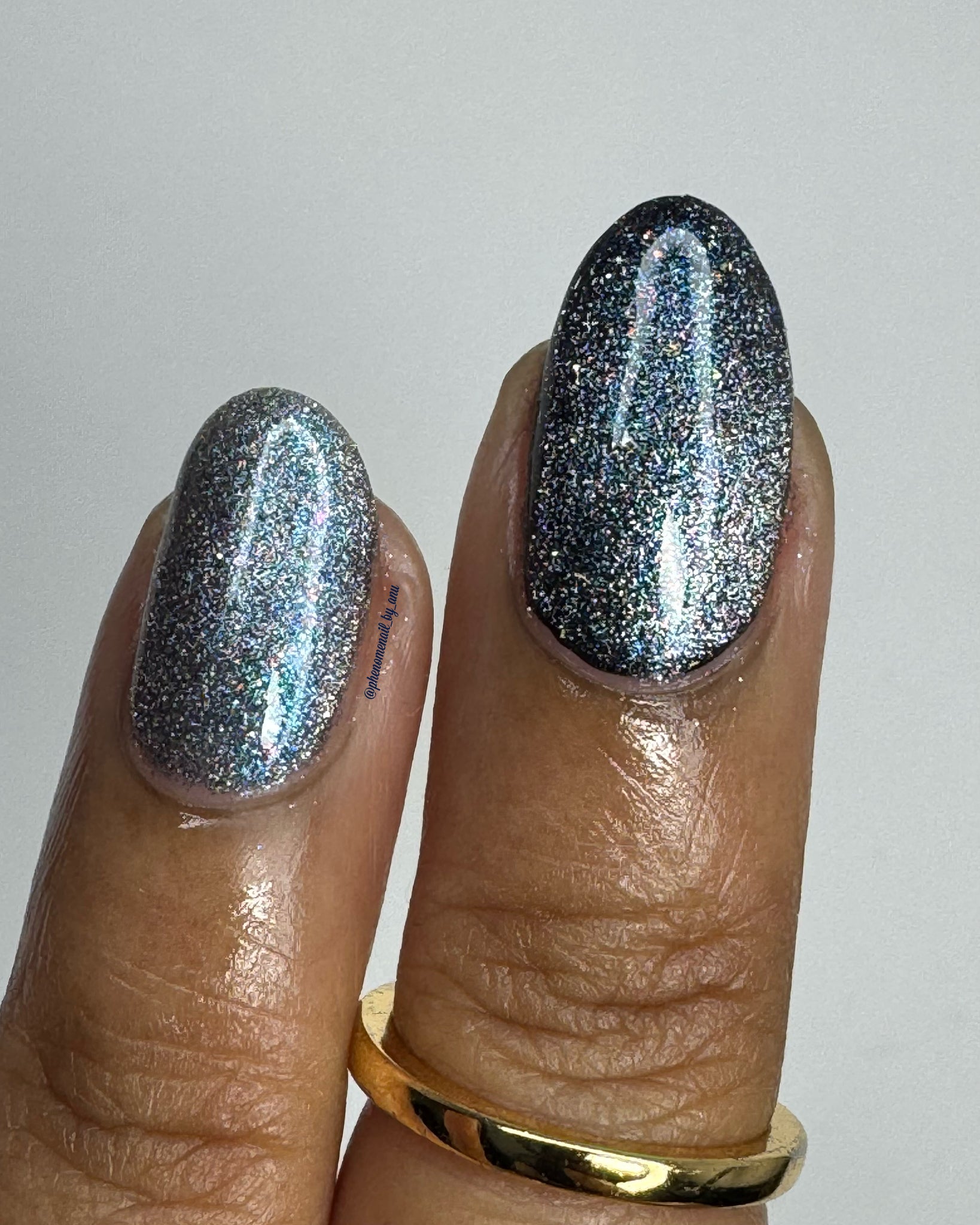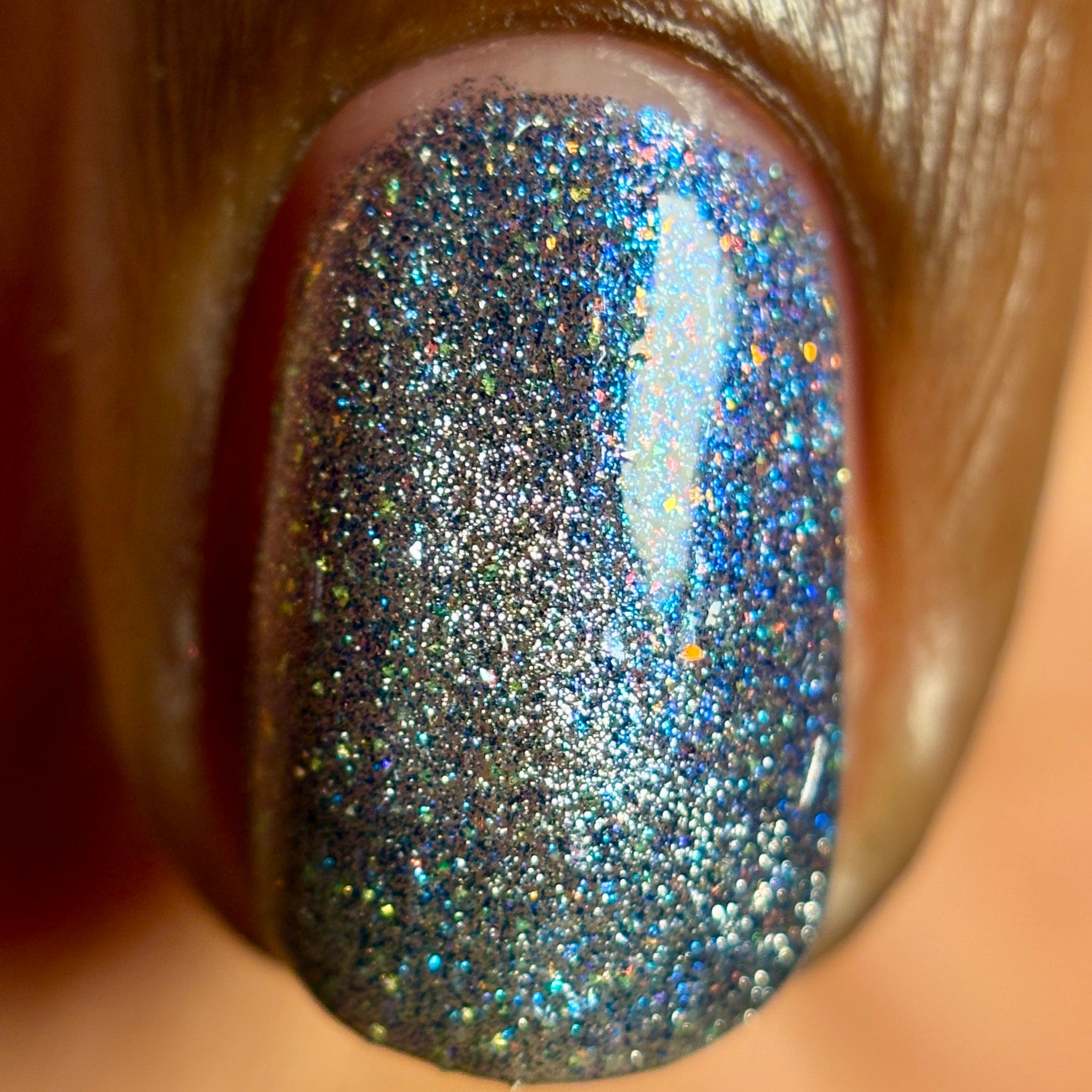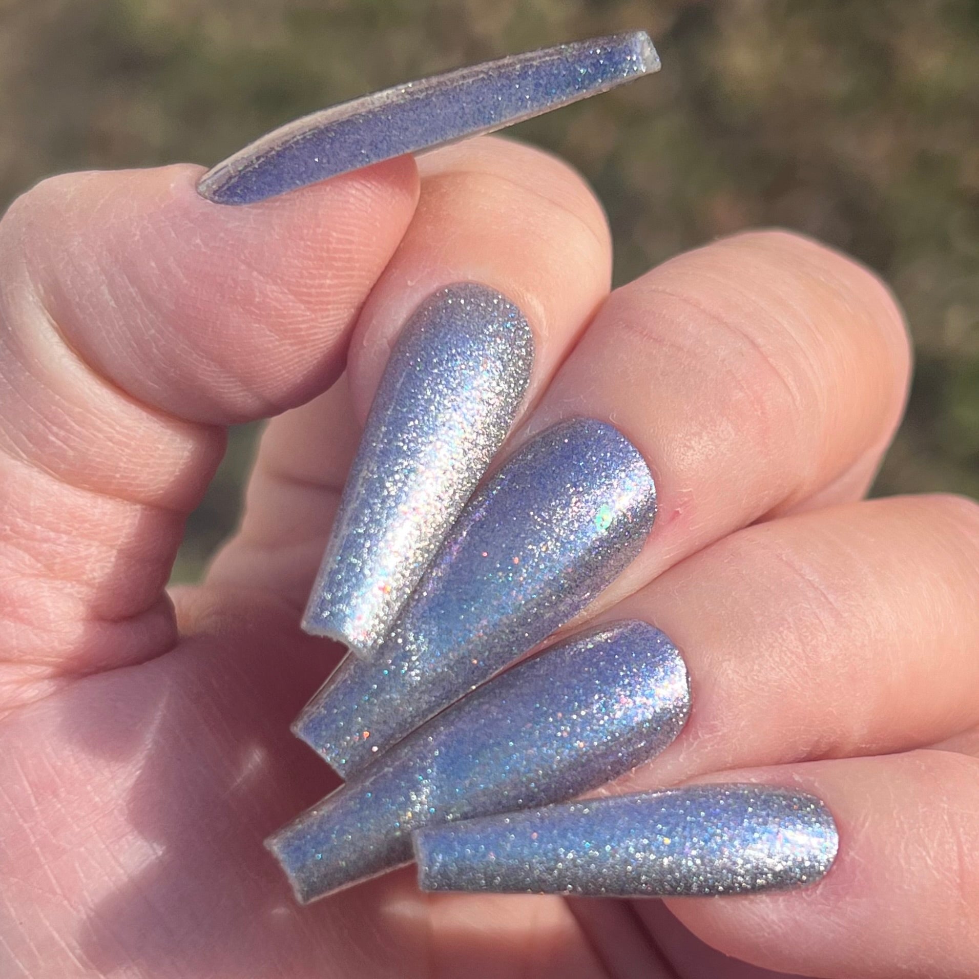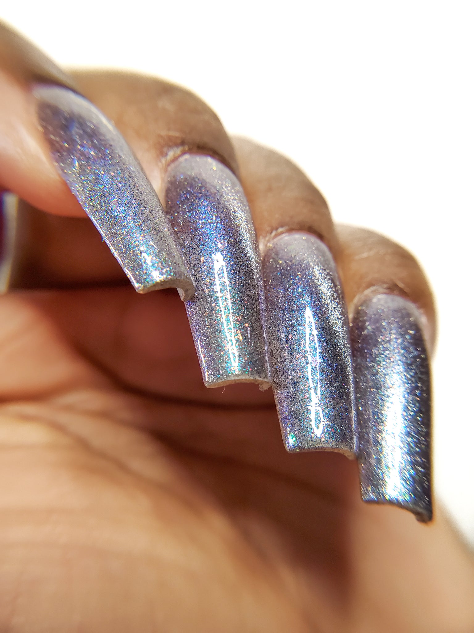 Description: This shade is a shimmery turquoise/indigo base with matching reflective glitters, color shifting crystal flakies and a silver line when magnetized.