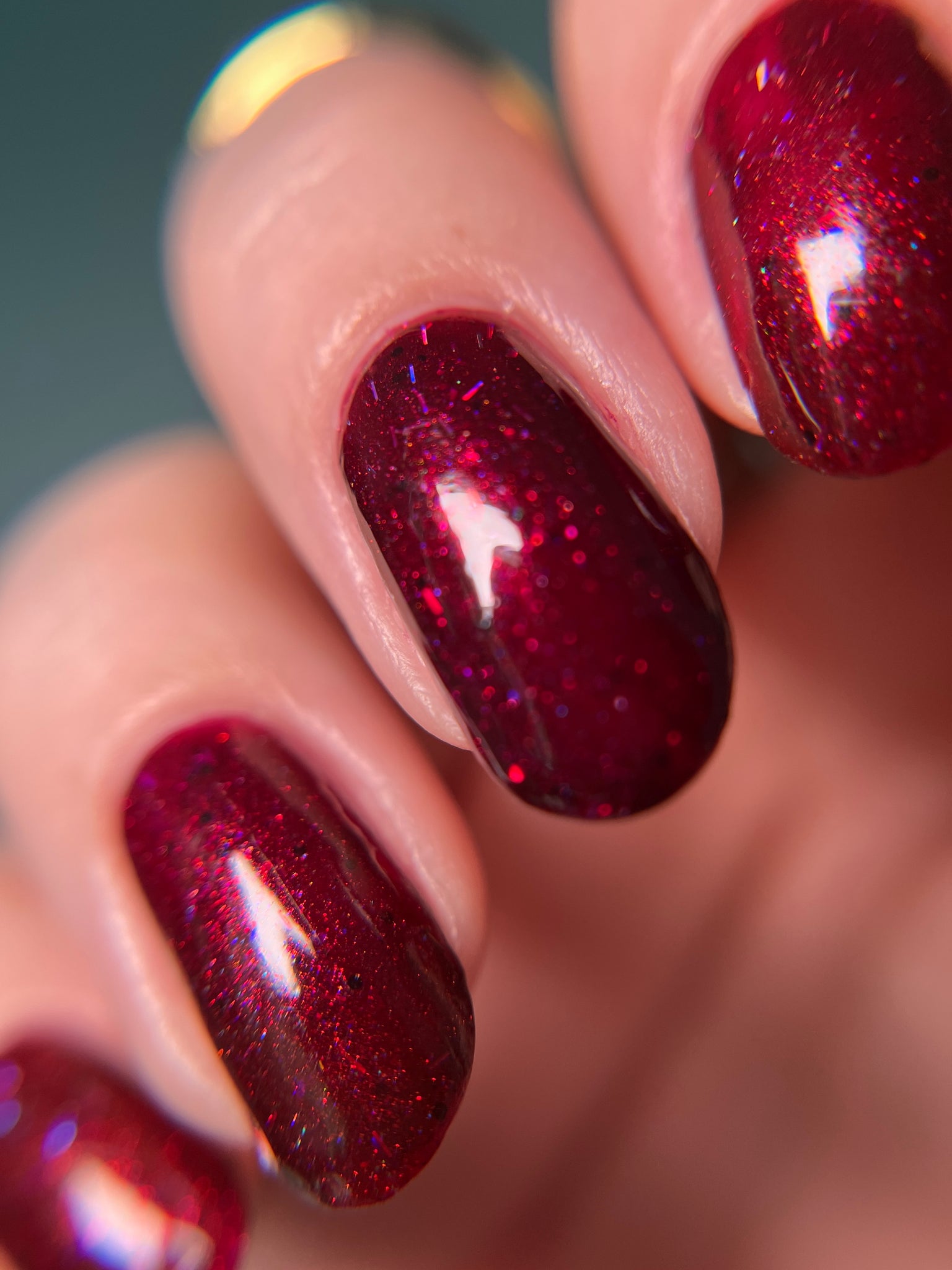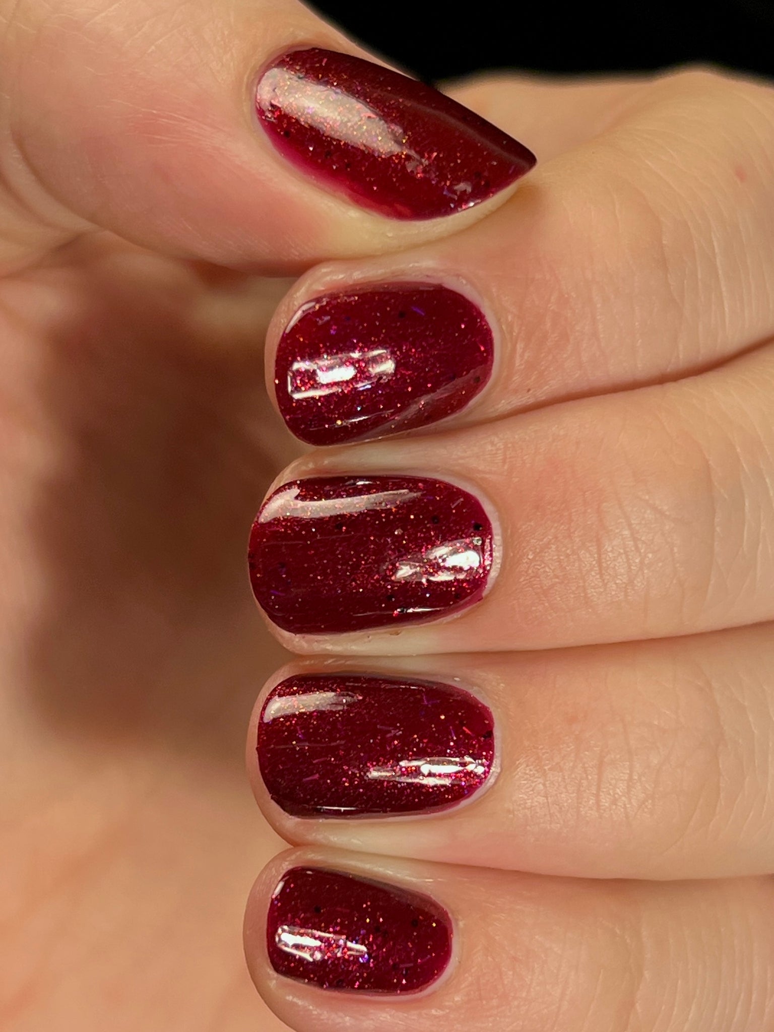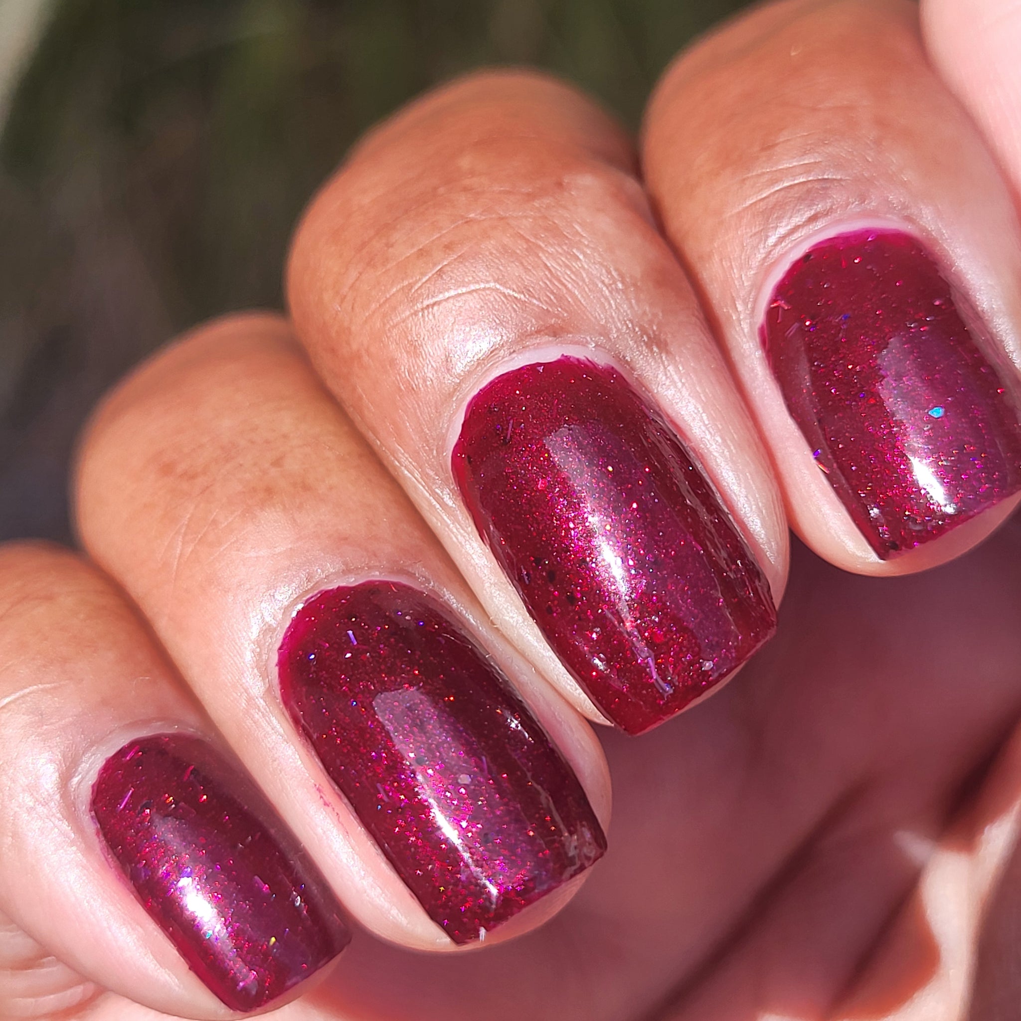 Description: Wichita is a deepened cranberry/burgundy based polish with a mix of micro glitters, bar glitters, aurora pigments and shimmers.