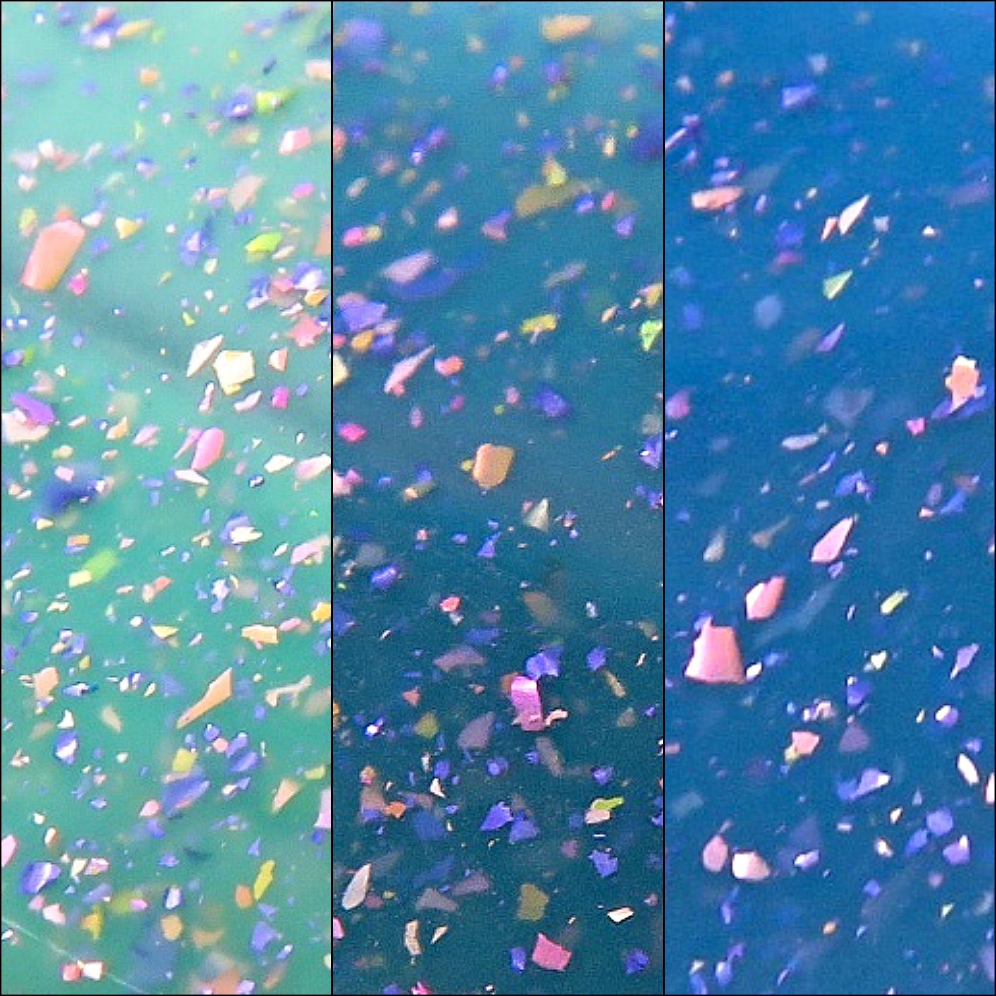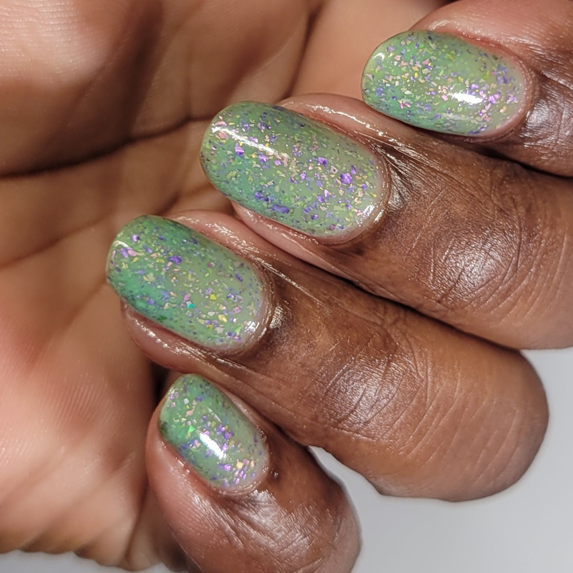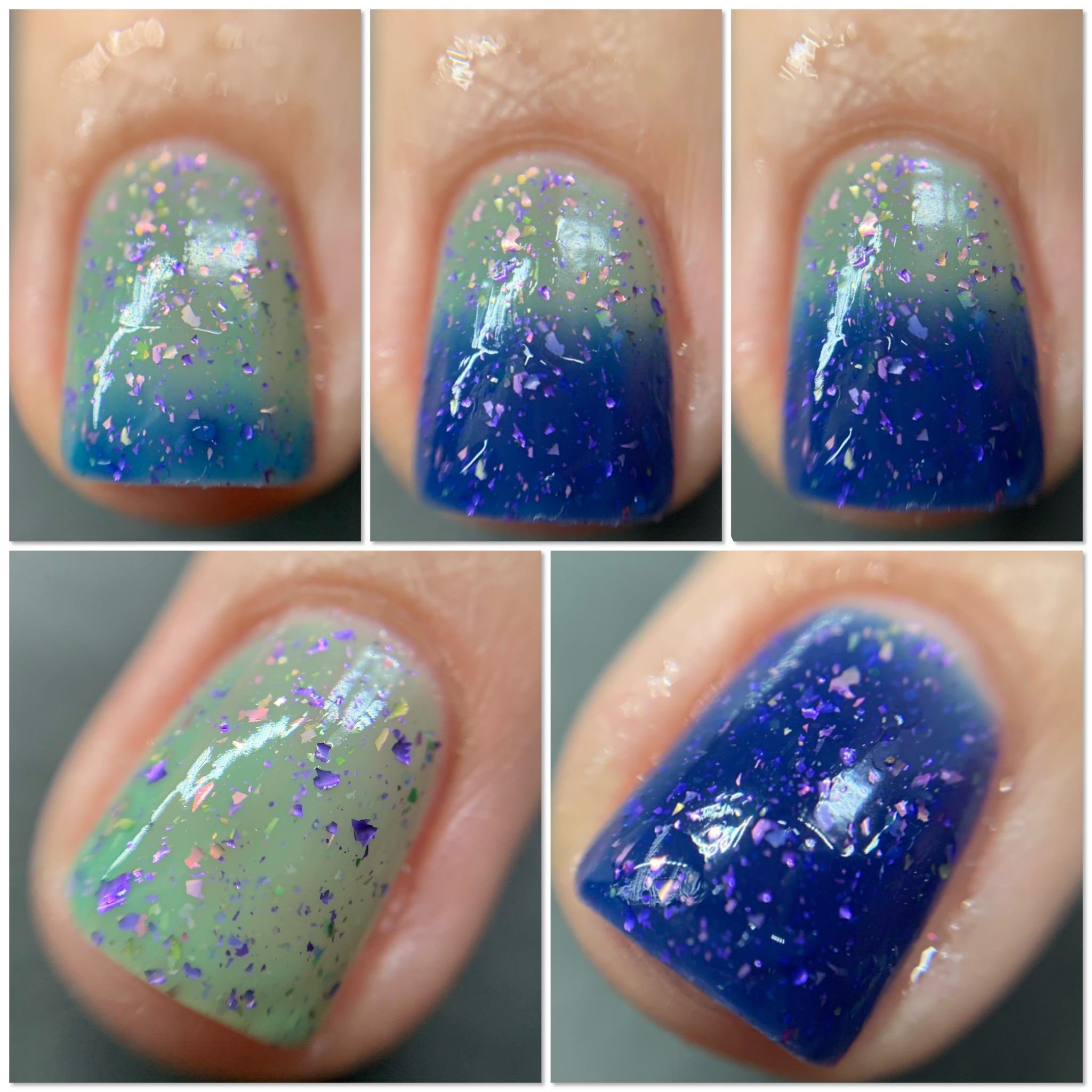 Description: This thermal flakie polish goes from a green when warm to a blue when cold, with metallic pink, blue and purple flakes.