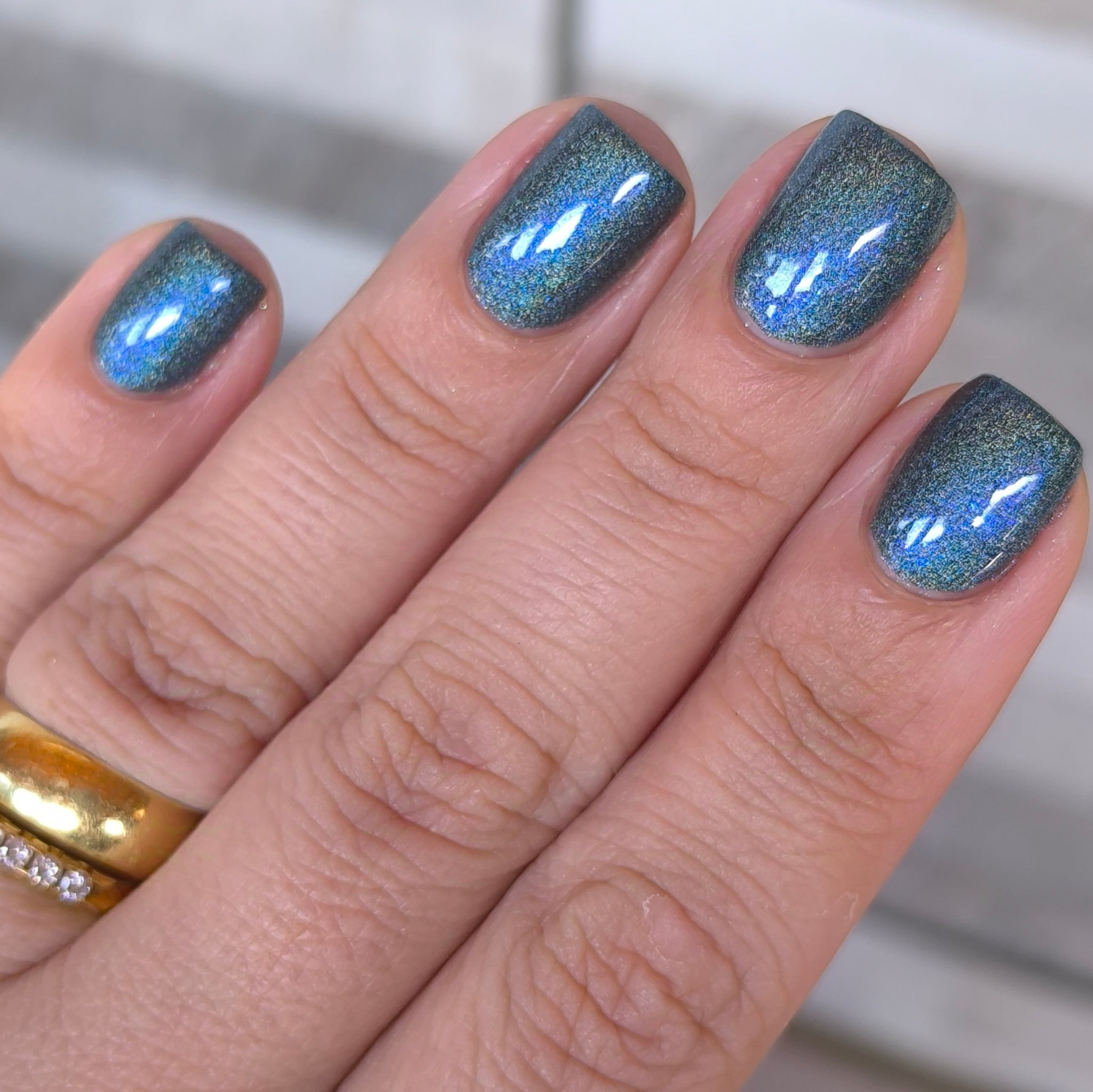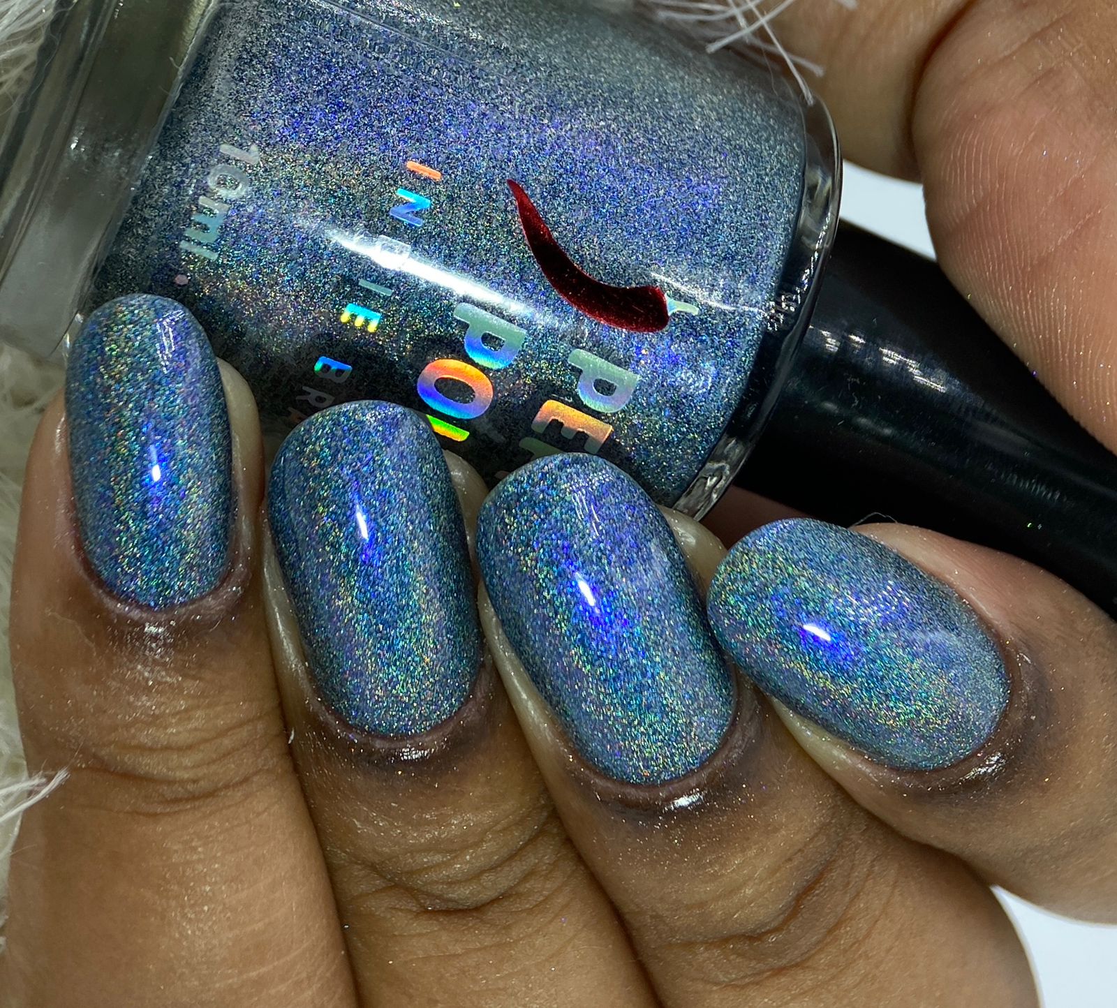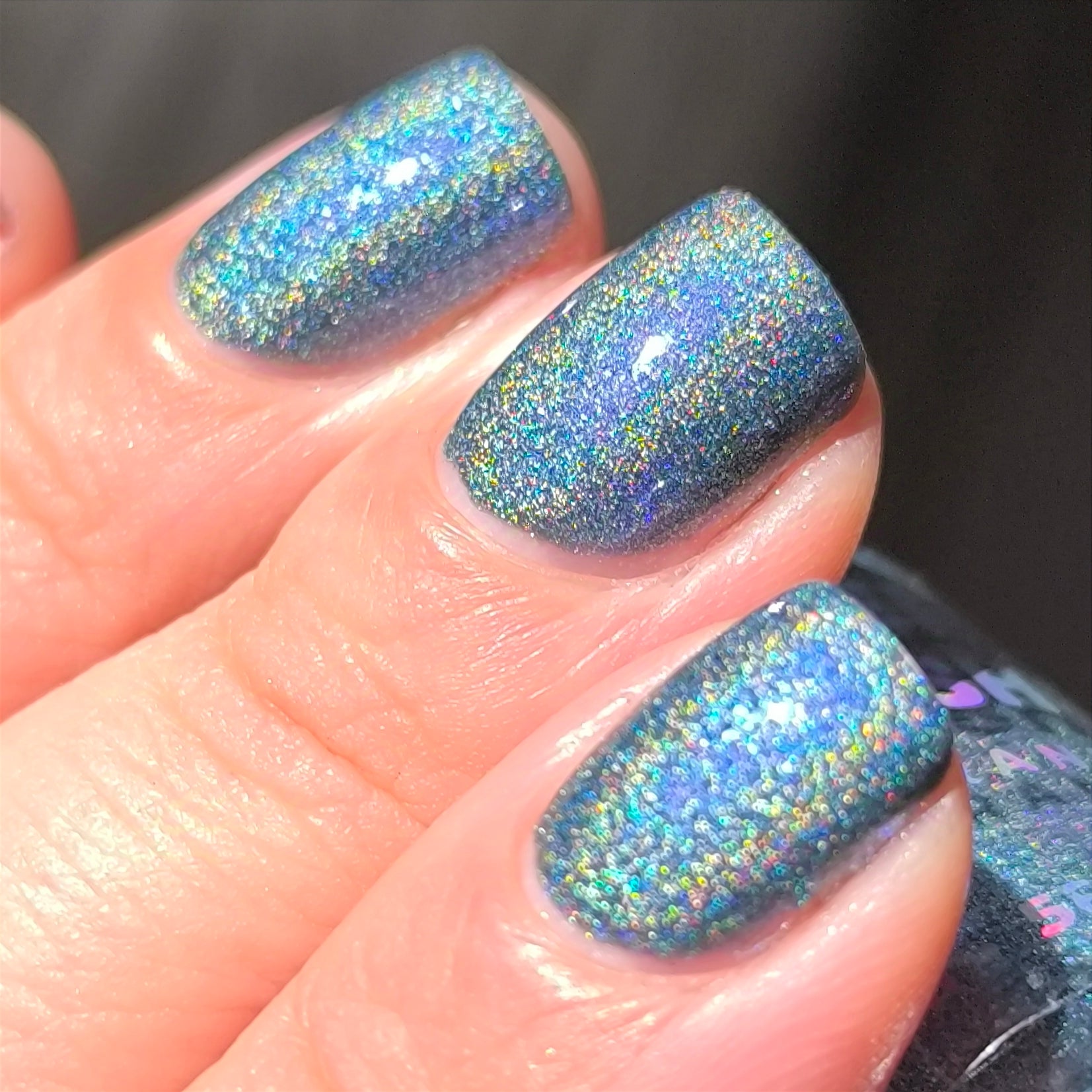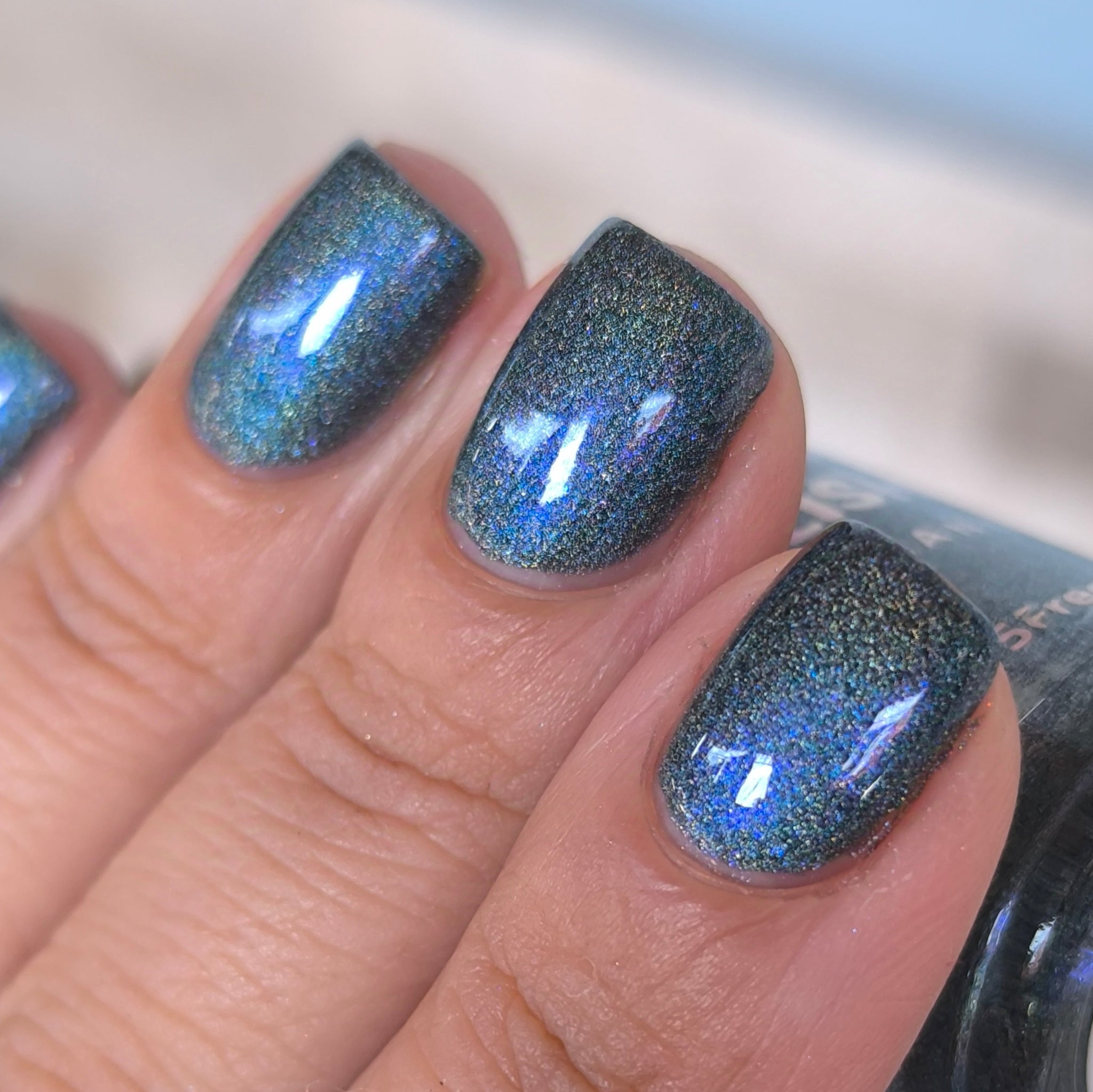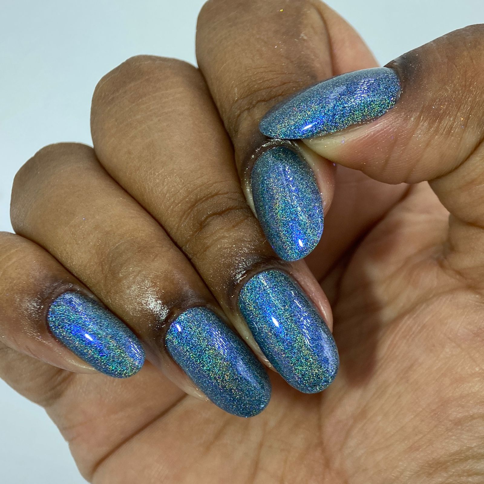 Description: Iara is a deep blue prismatic holographic nail polish with blue aurora pigment.