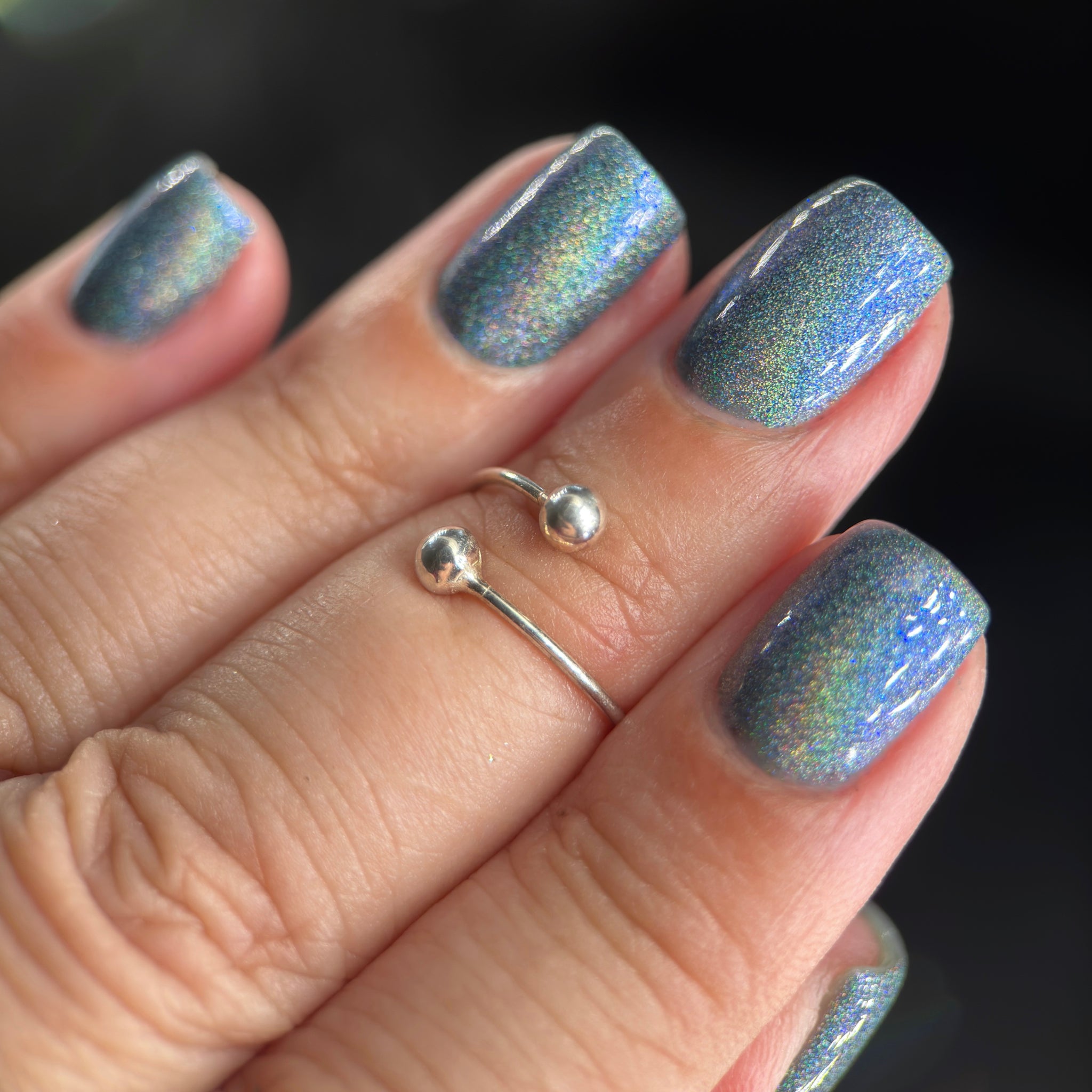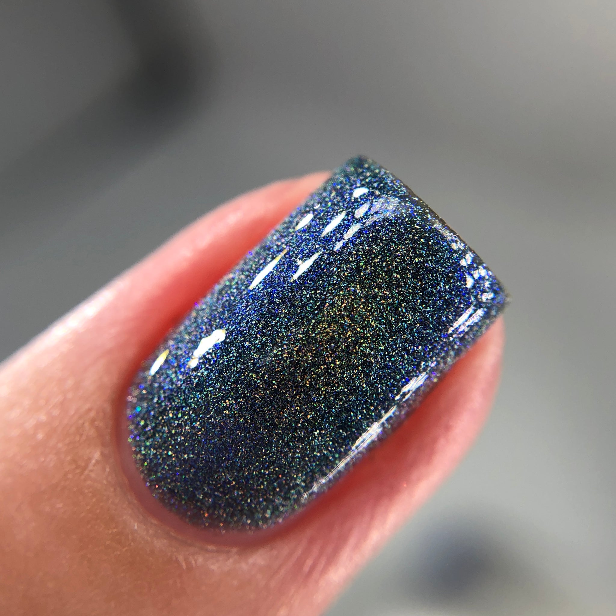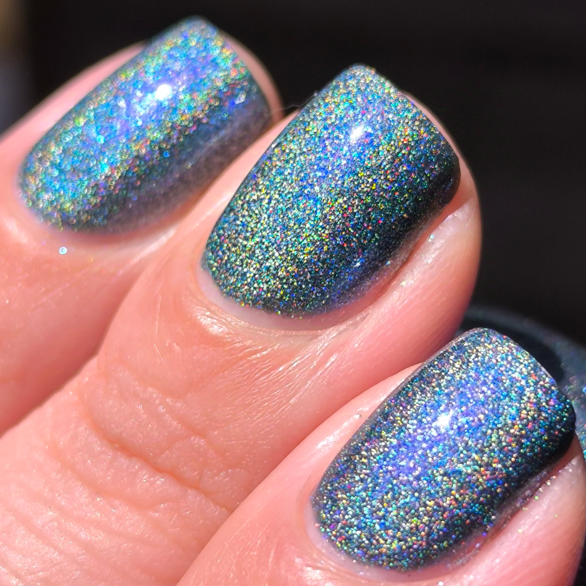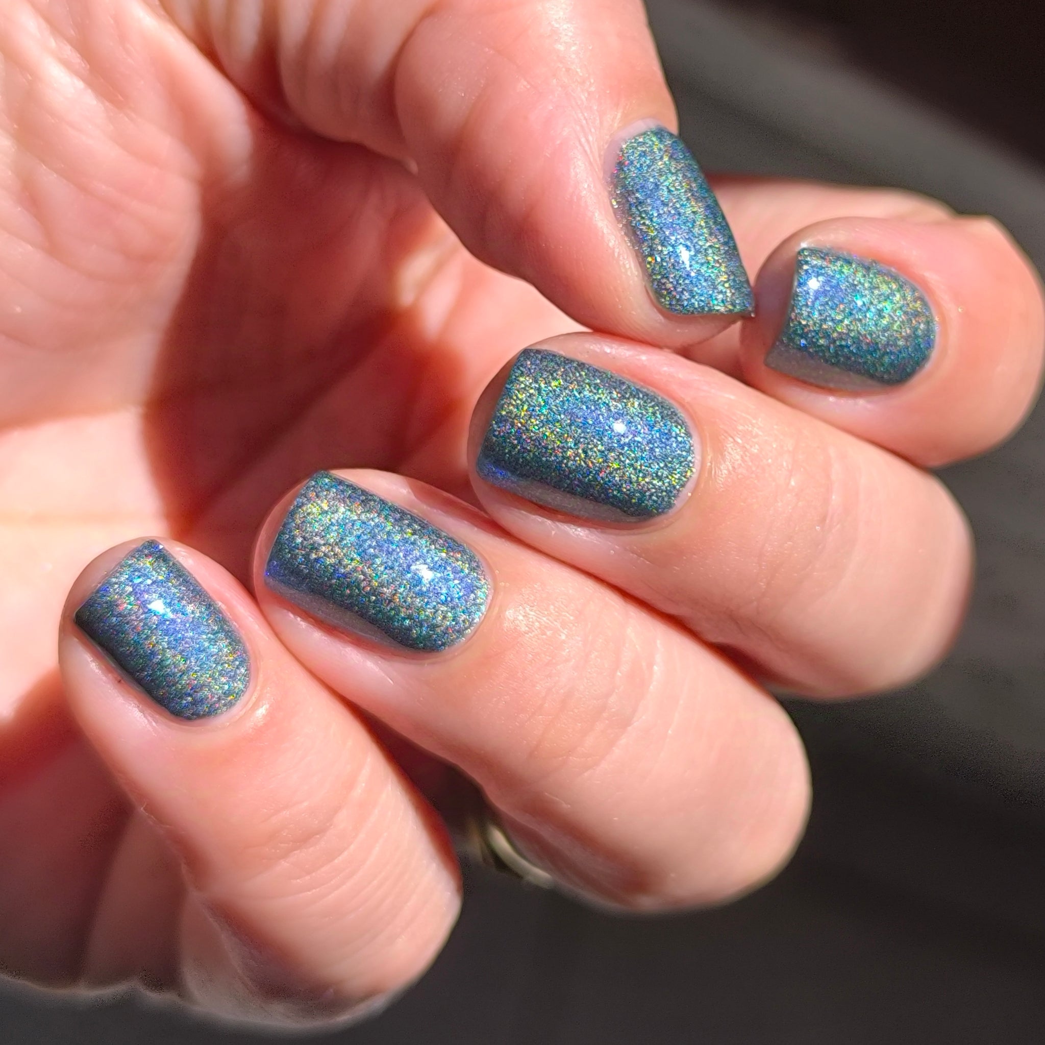 Description: Iara is a deep blue prismatic holographic nail polish with blue aurora pigment.
