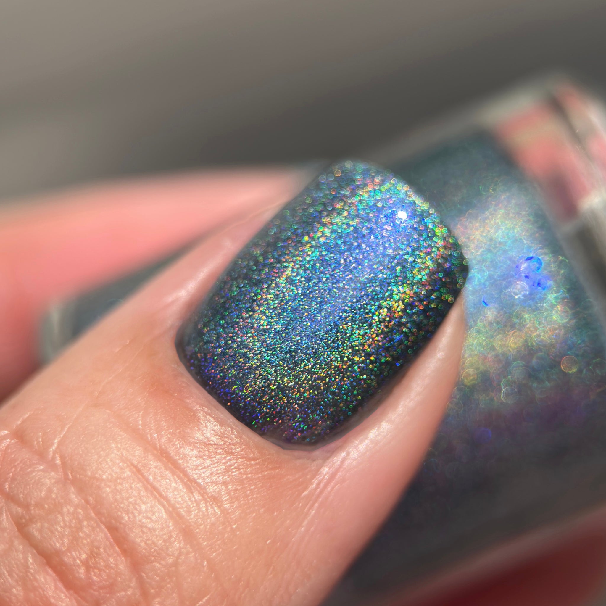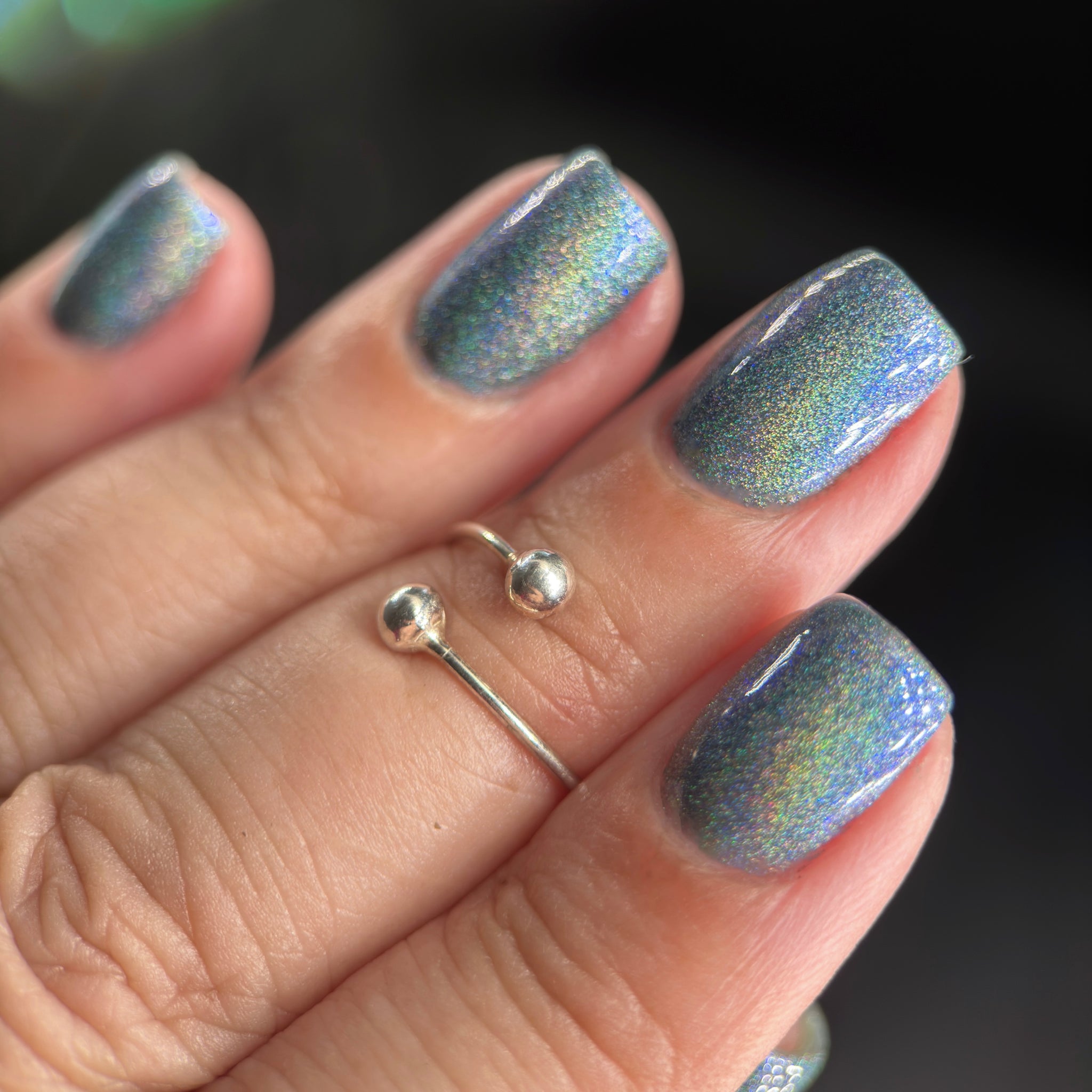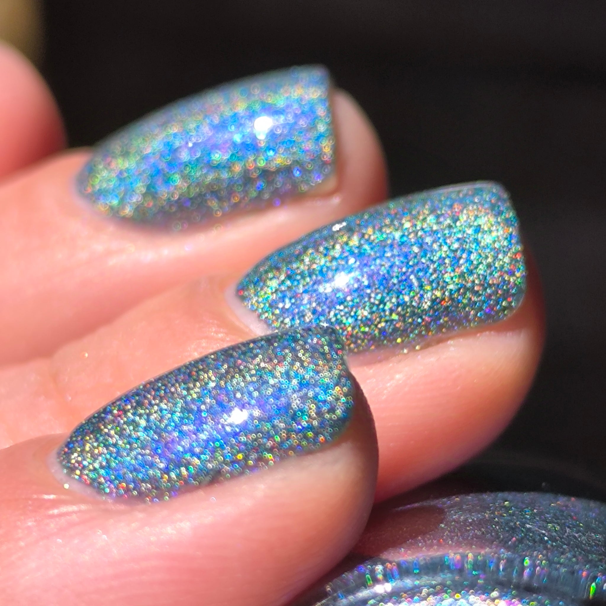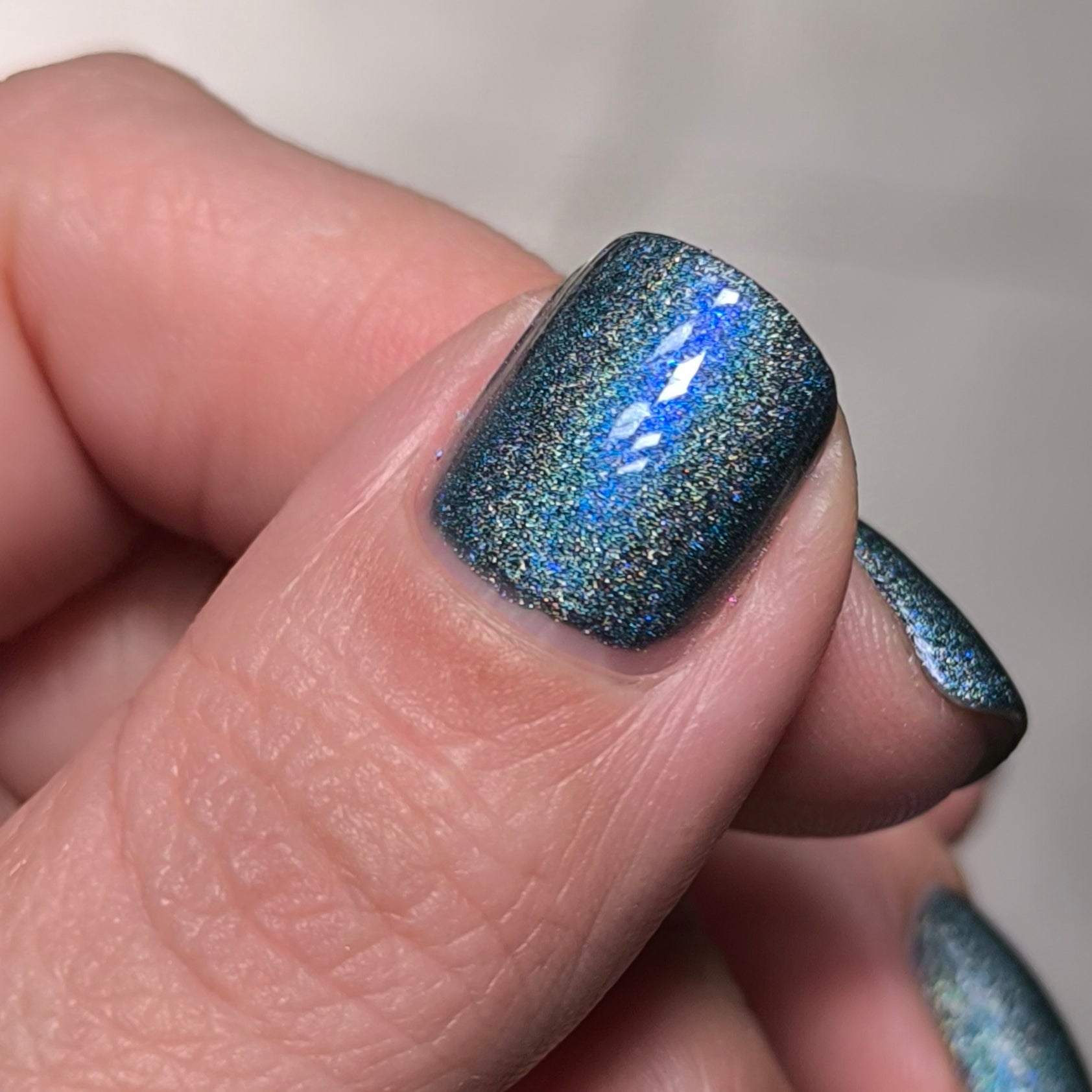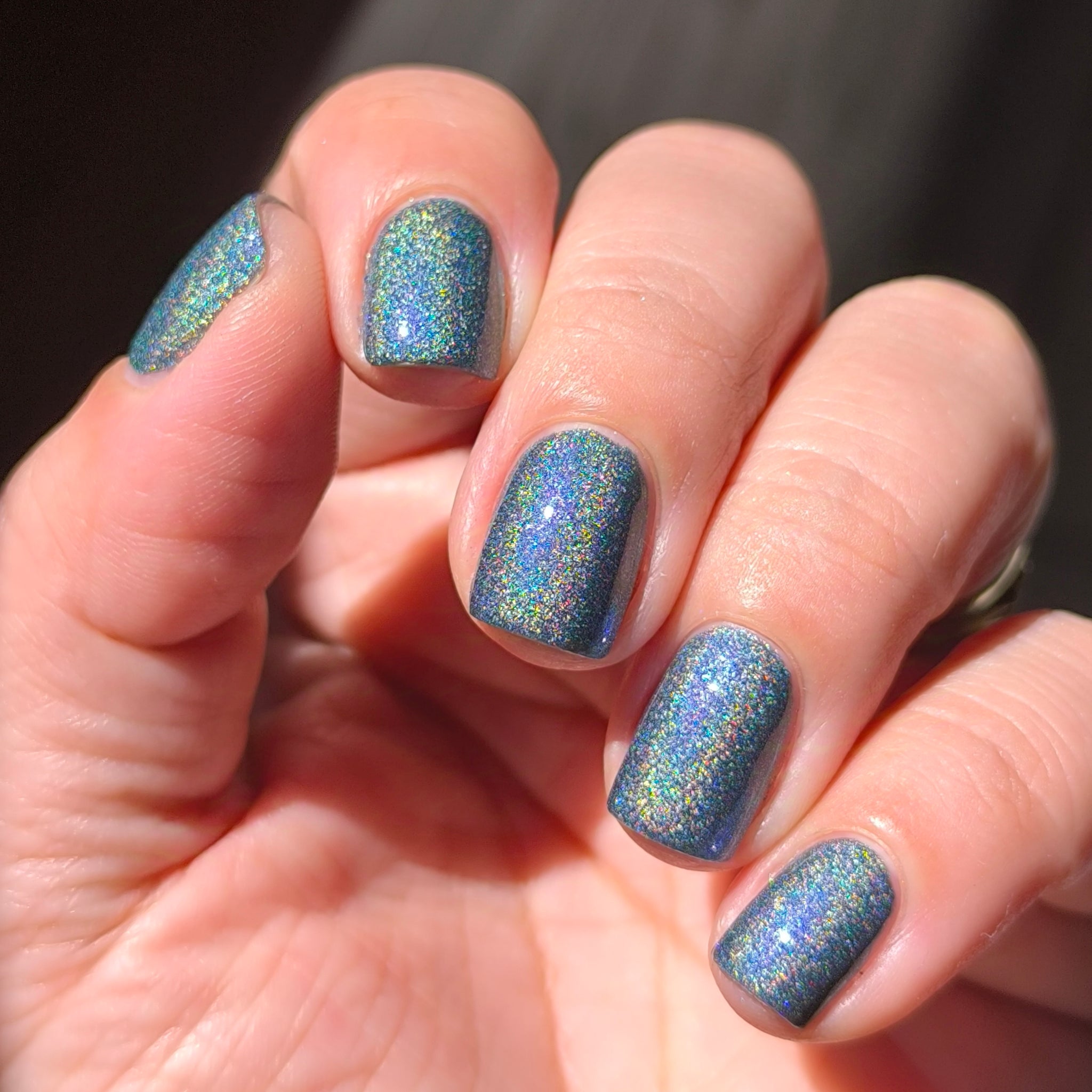 Description: Iara is a deep blue prismatic holographic nail polish with blue aurora pigment.