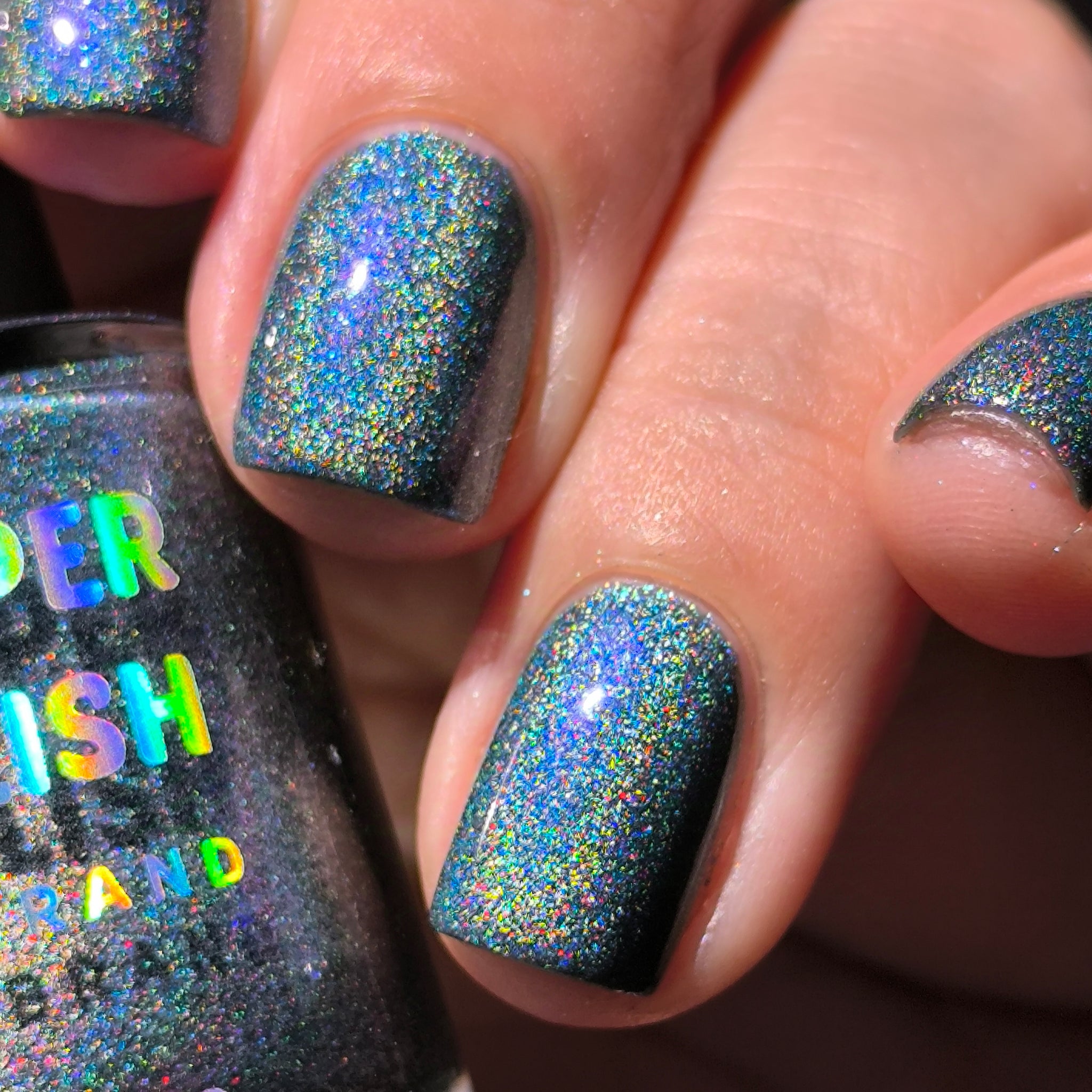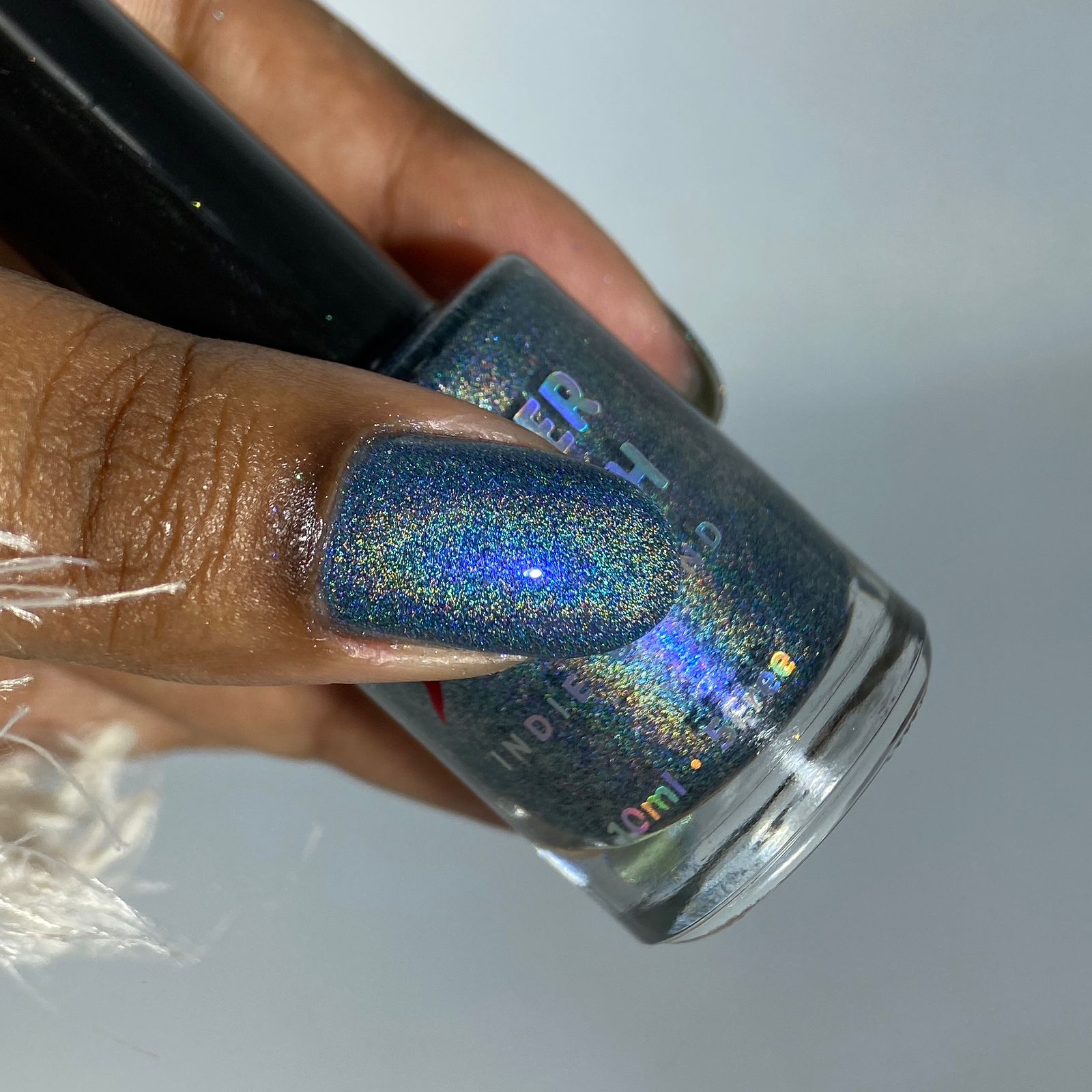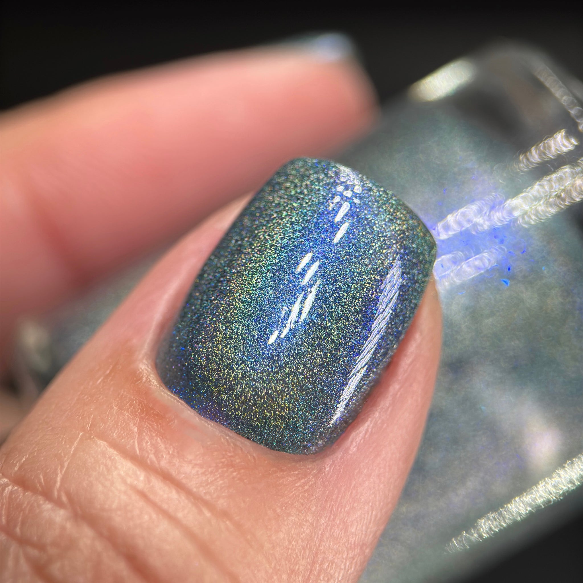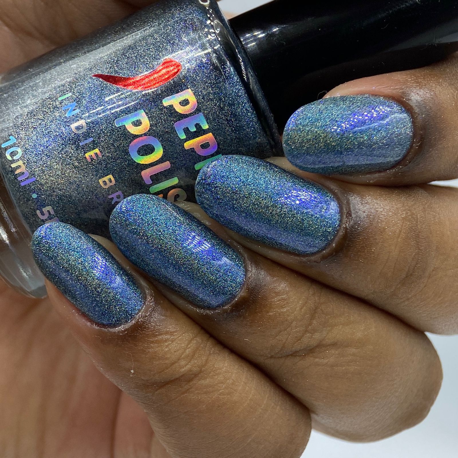 Description: Iara is a deep blue prismatic holographic nail polish with blue aurora pigment.