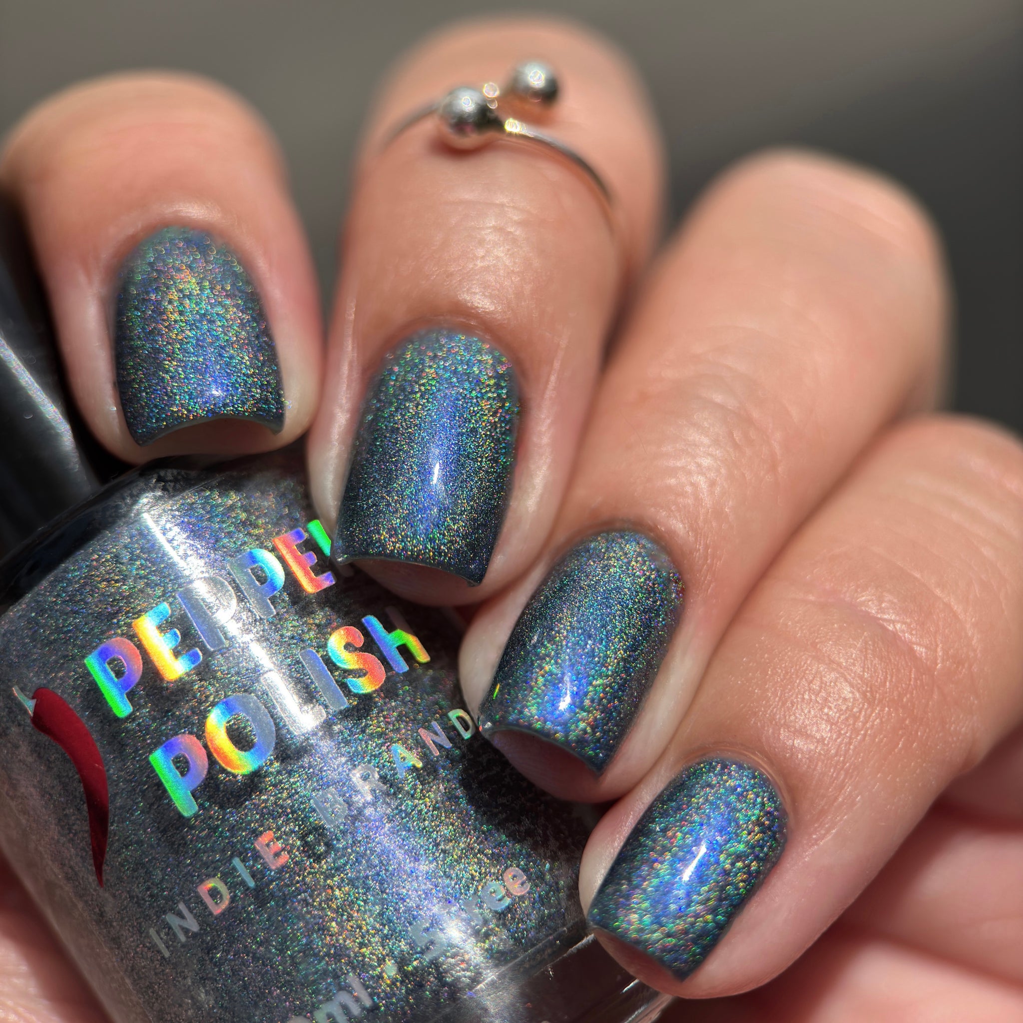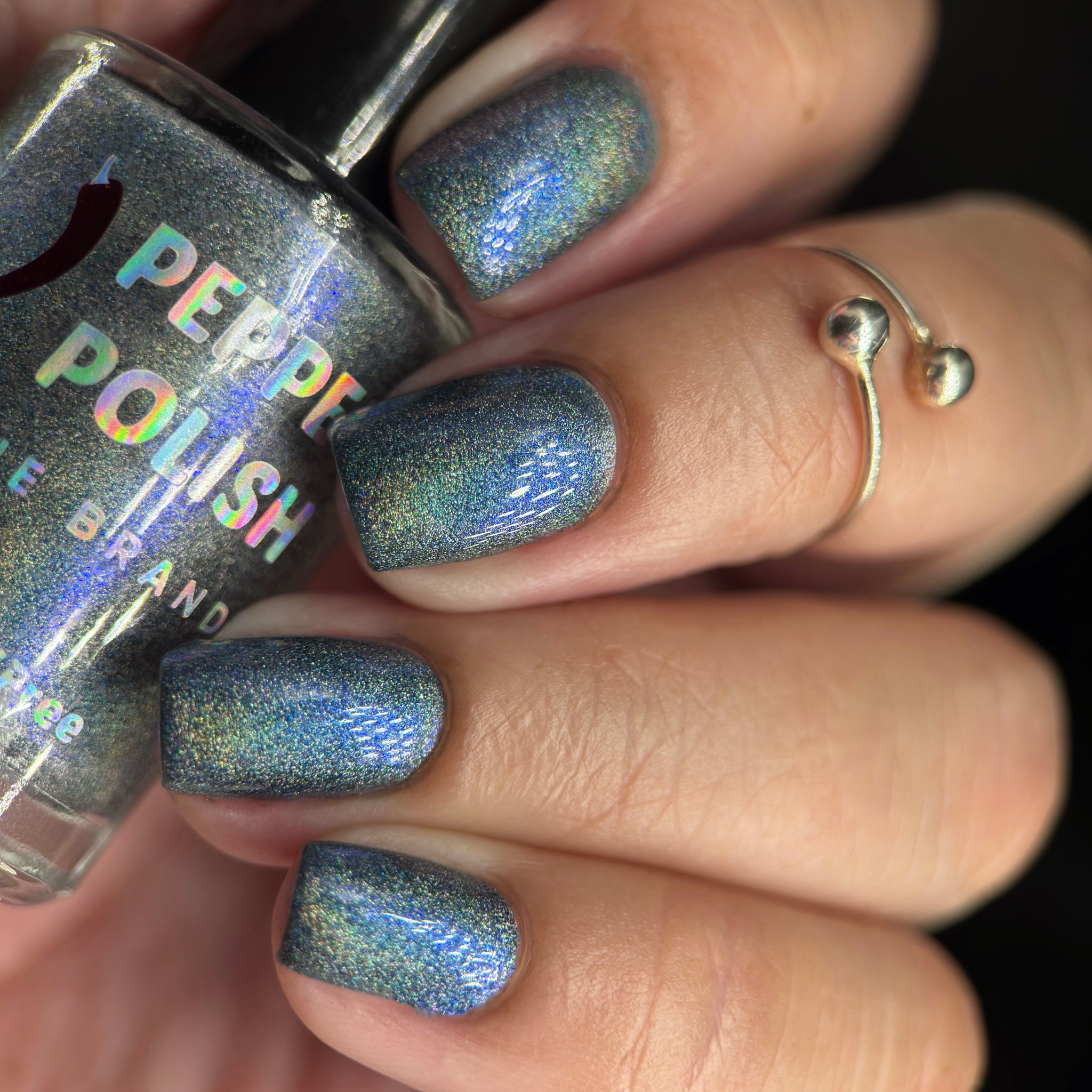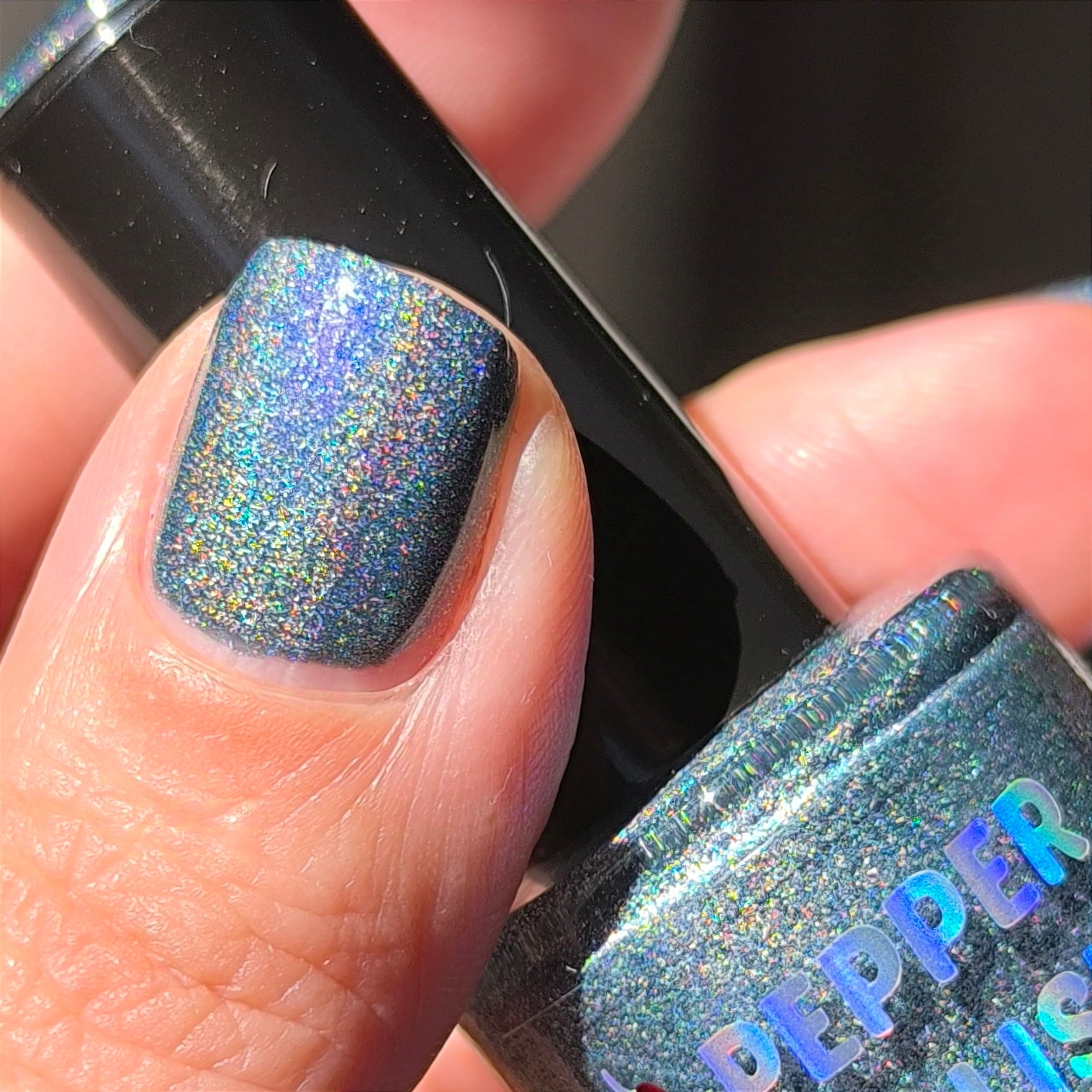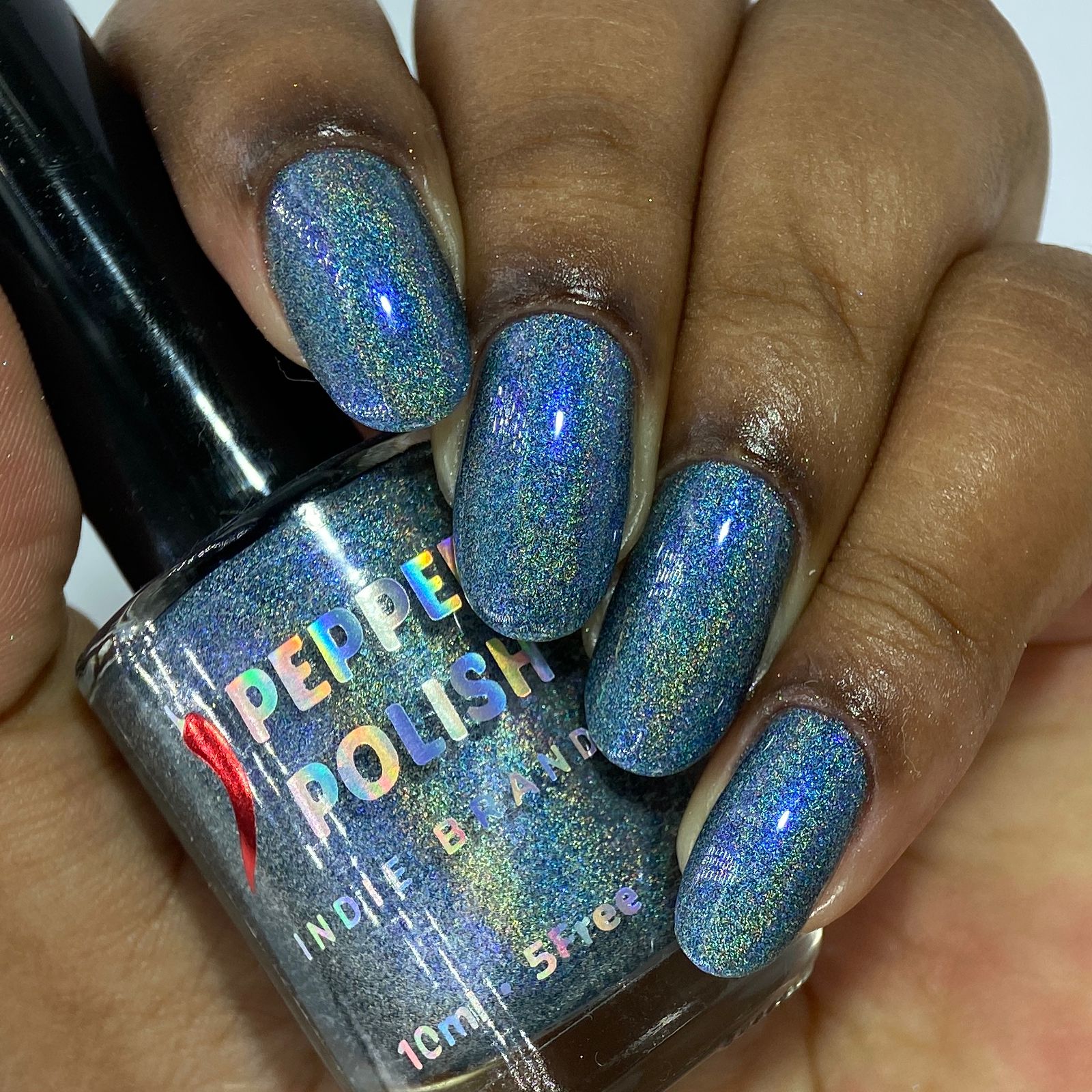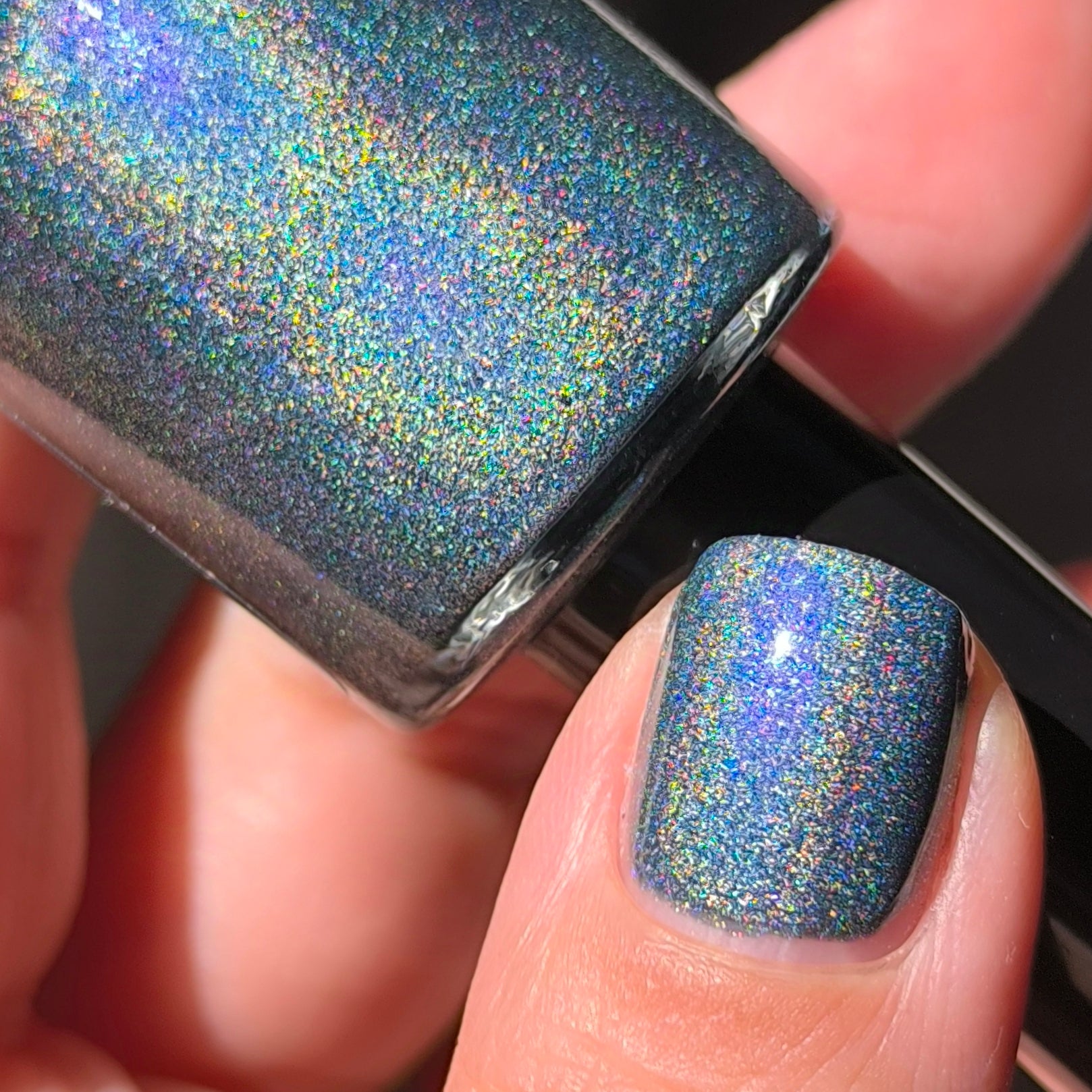 Description: Iara is a deep blue prismatic holographic nail polish with blue aurora pigment.