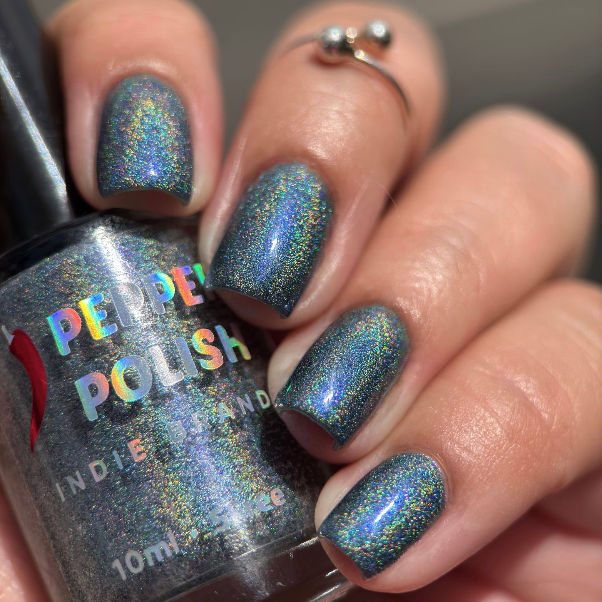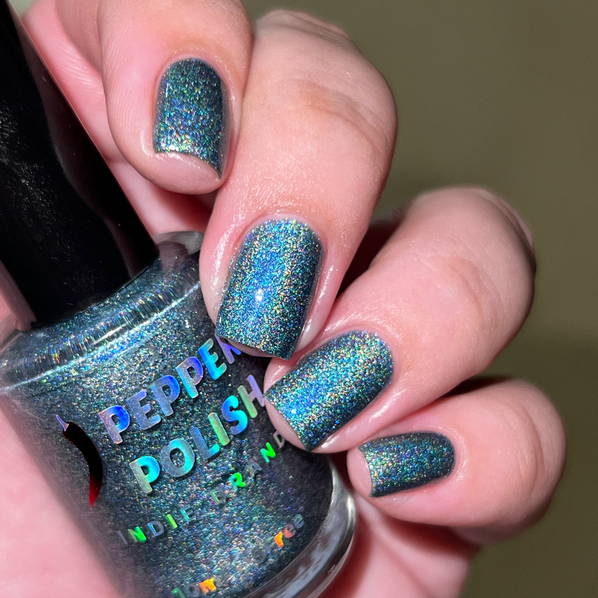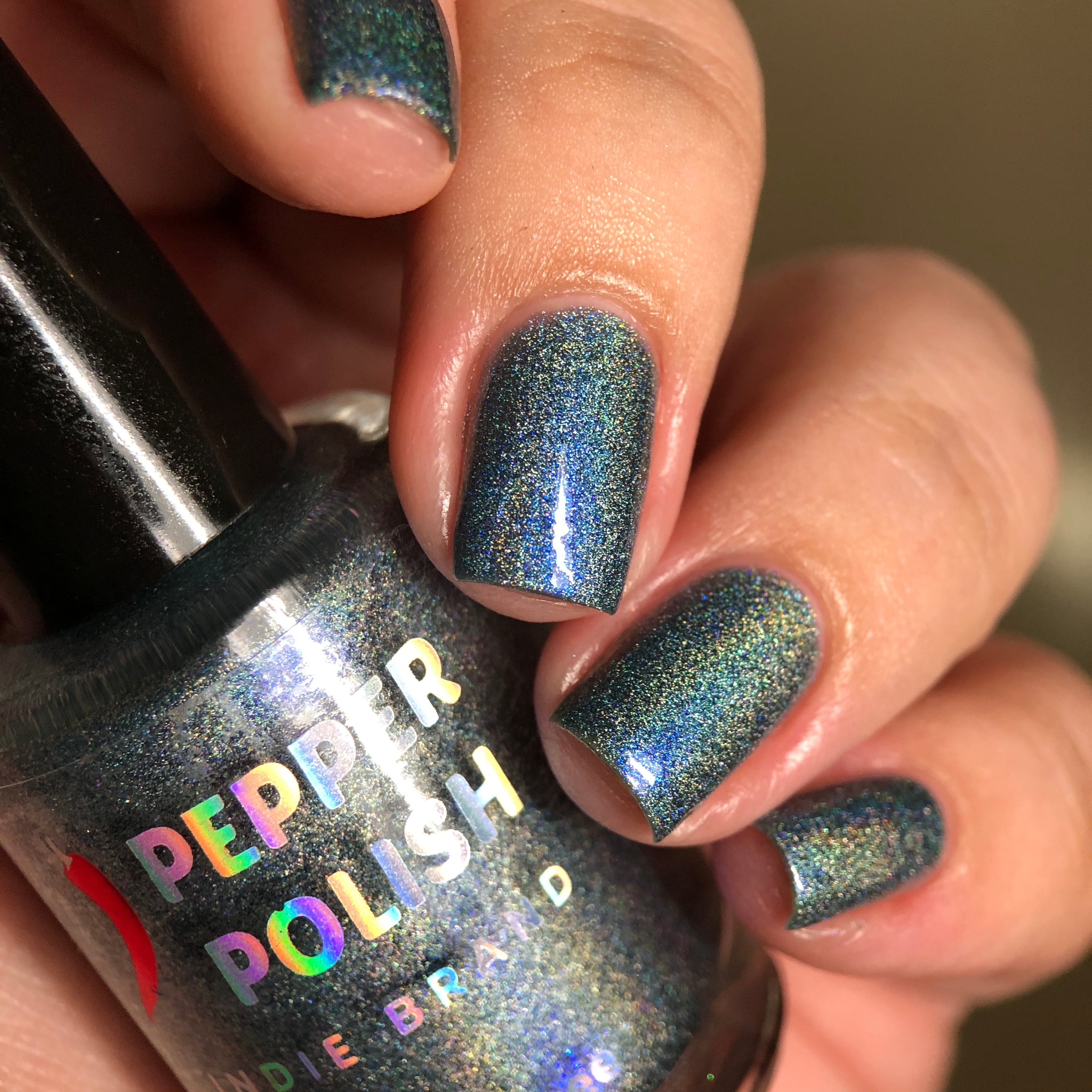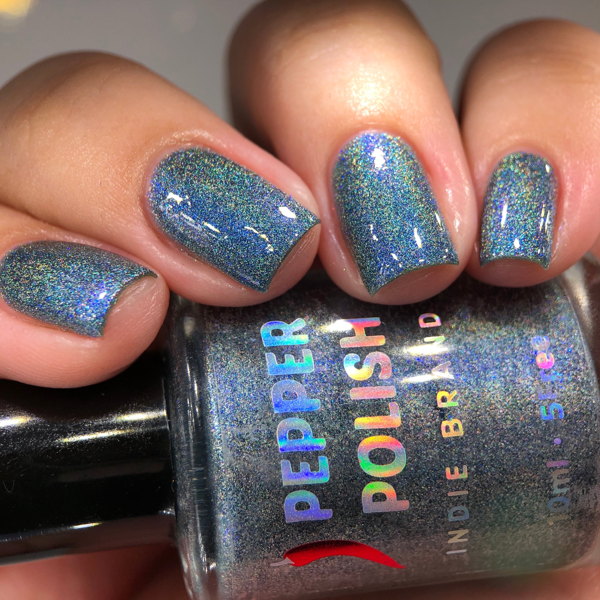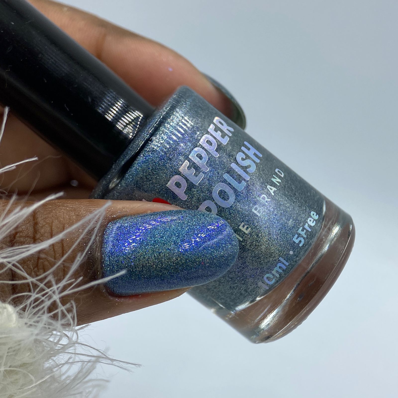 Description: Iara is a deep blue prismatic holographic nail polish with blue aurora pigment.