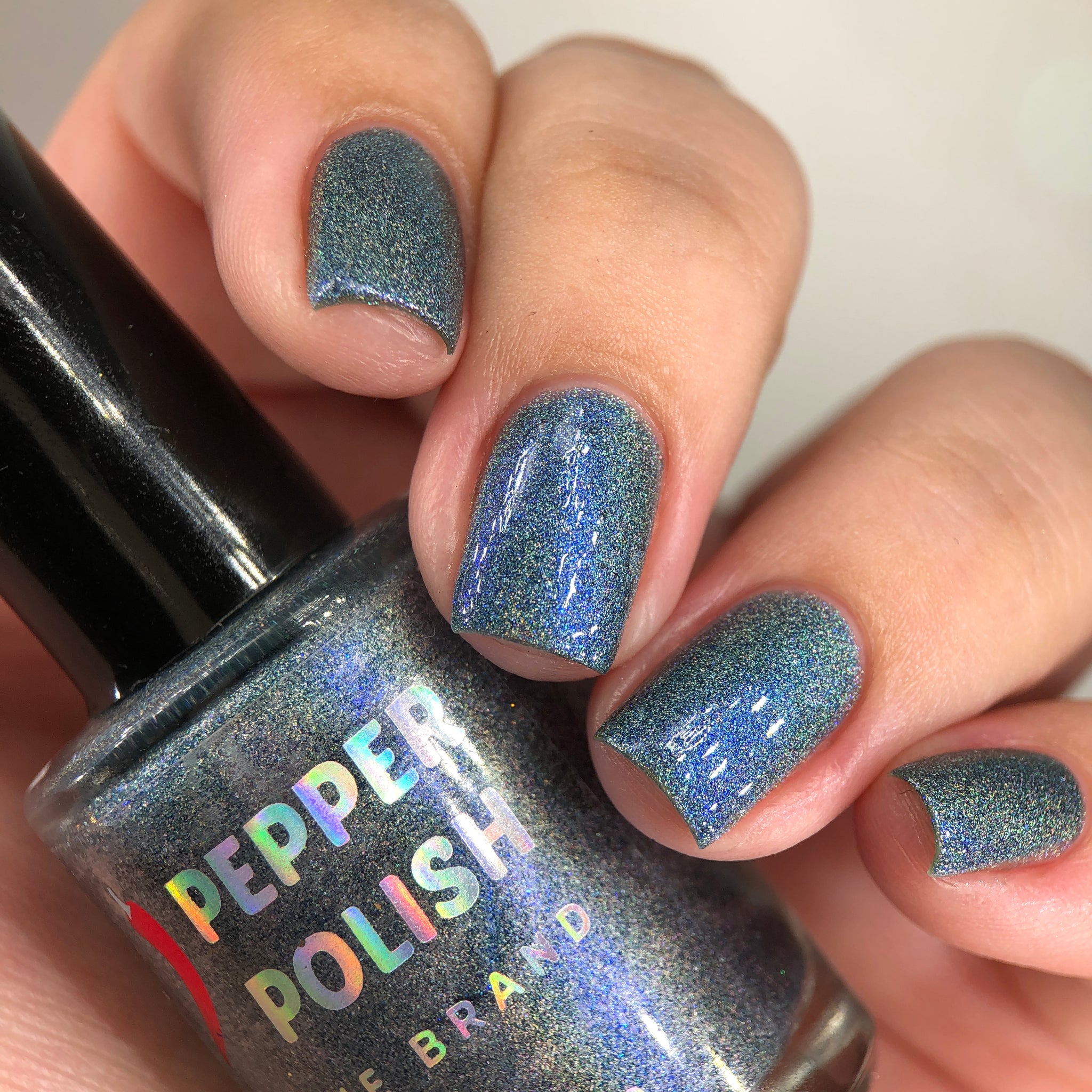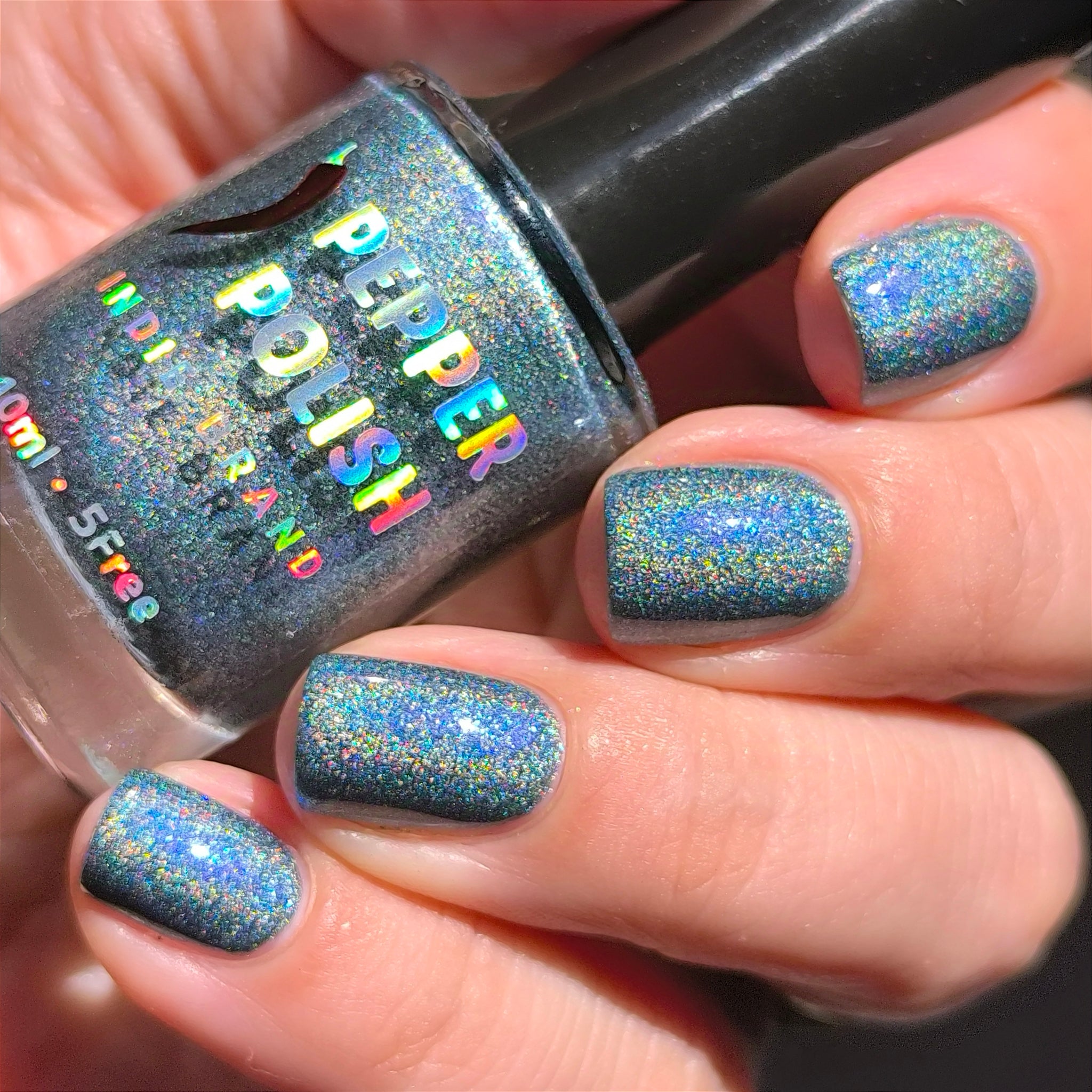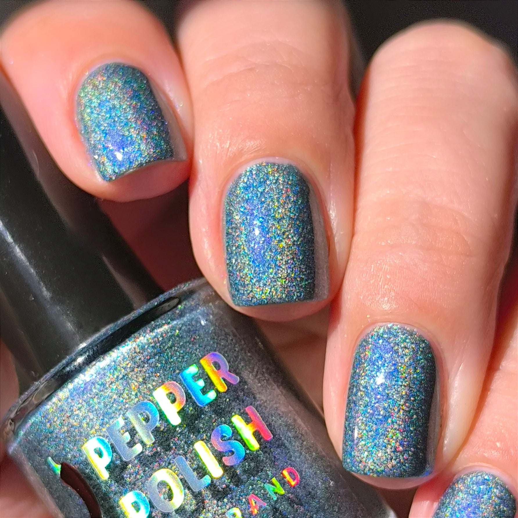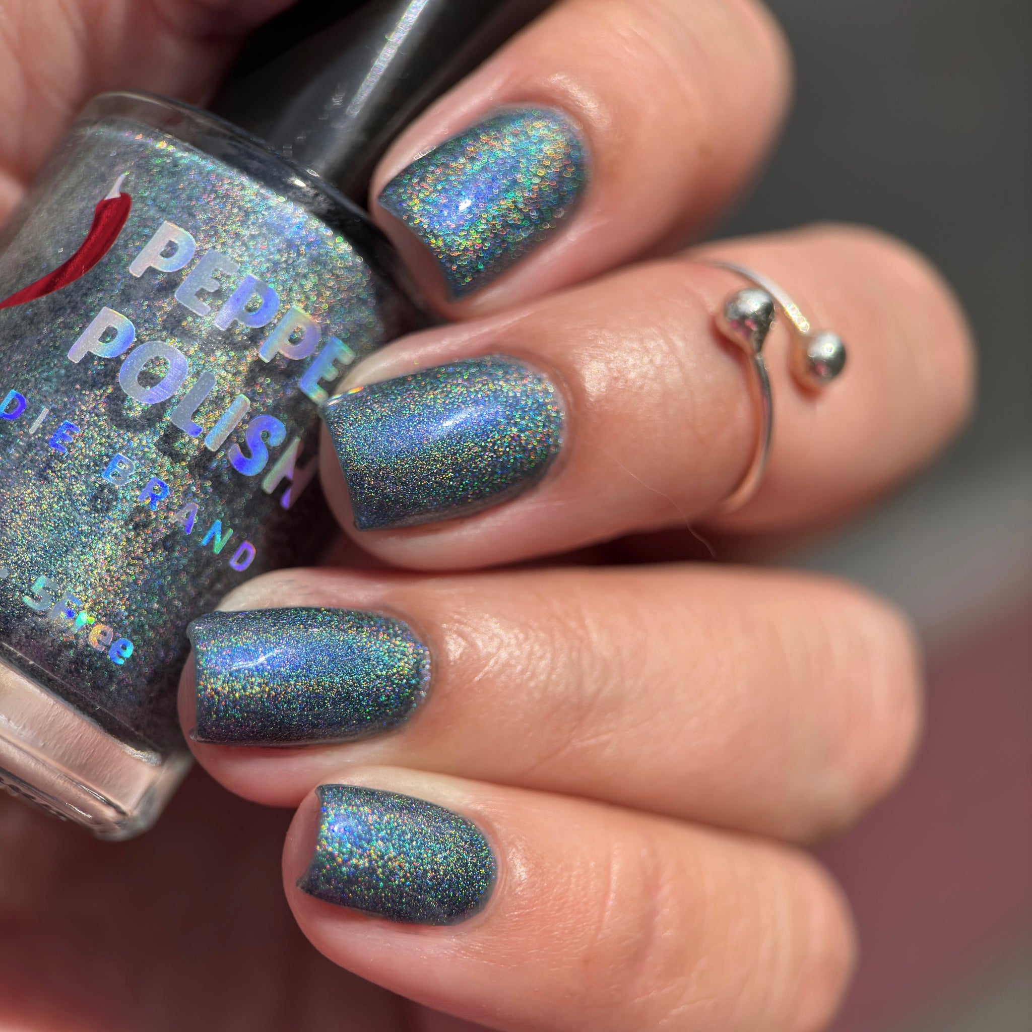 Description: Iara is a deep blue prismatic holographic nail polish with blue aurora pigment.