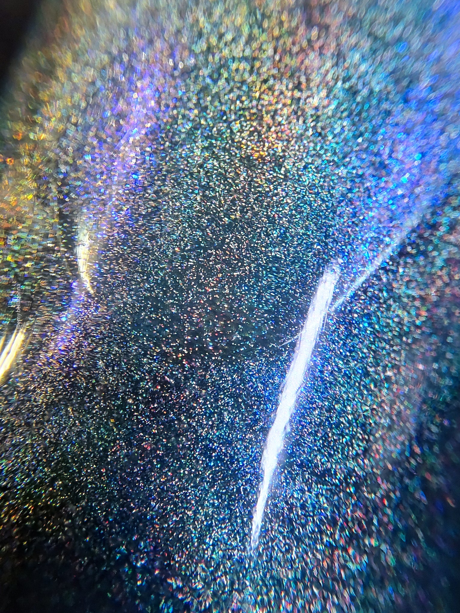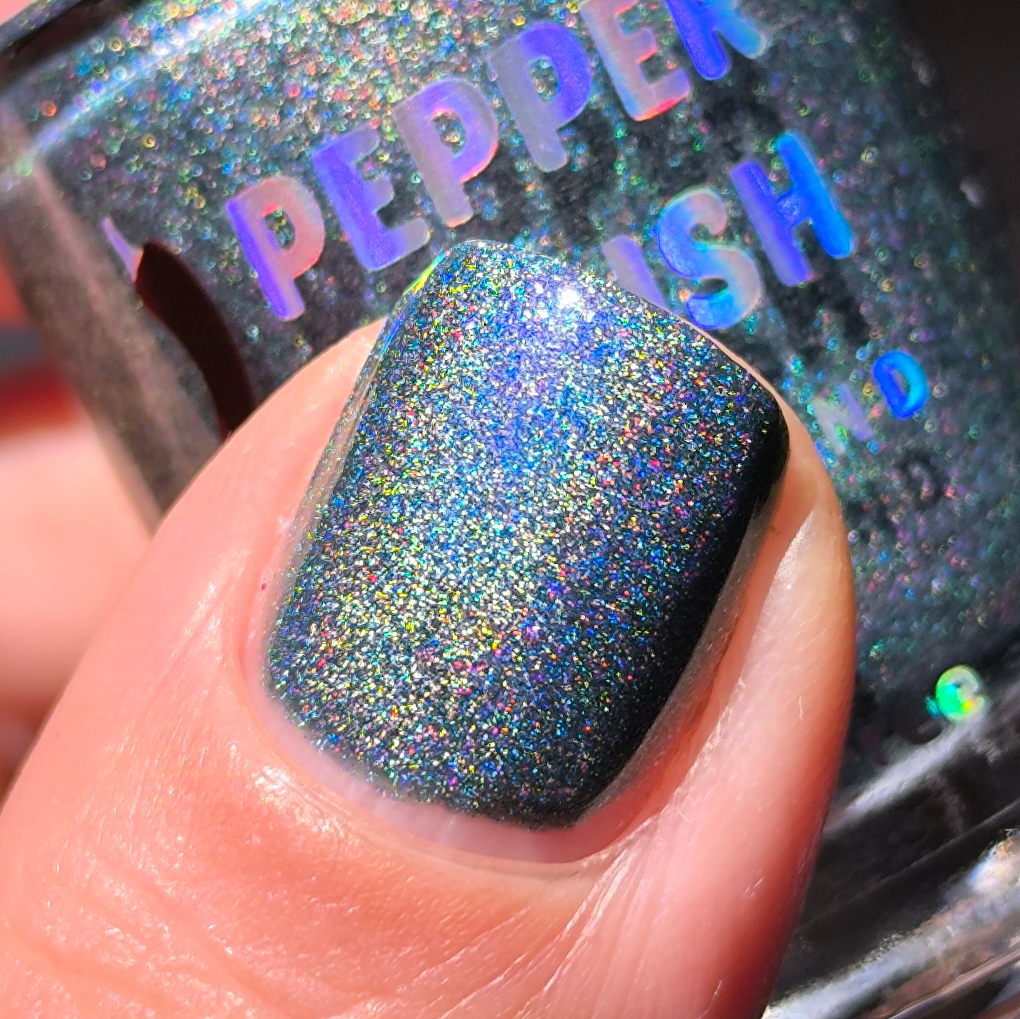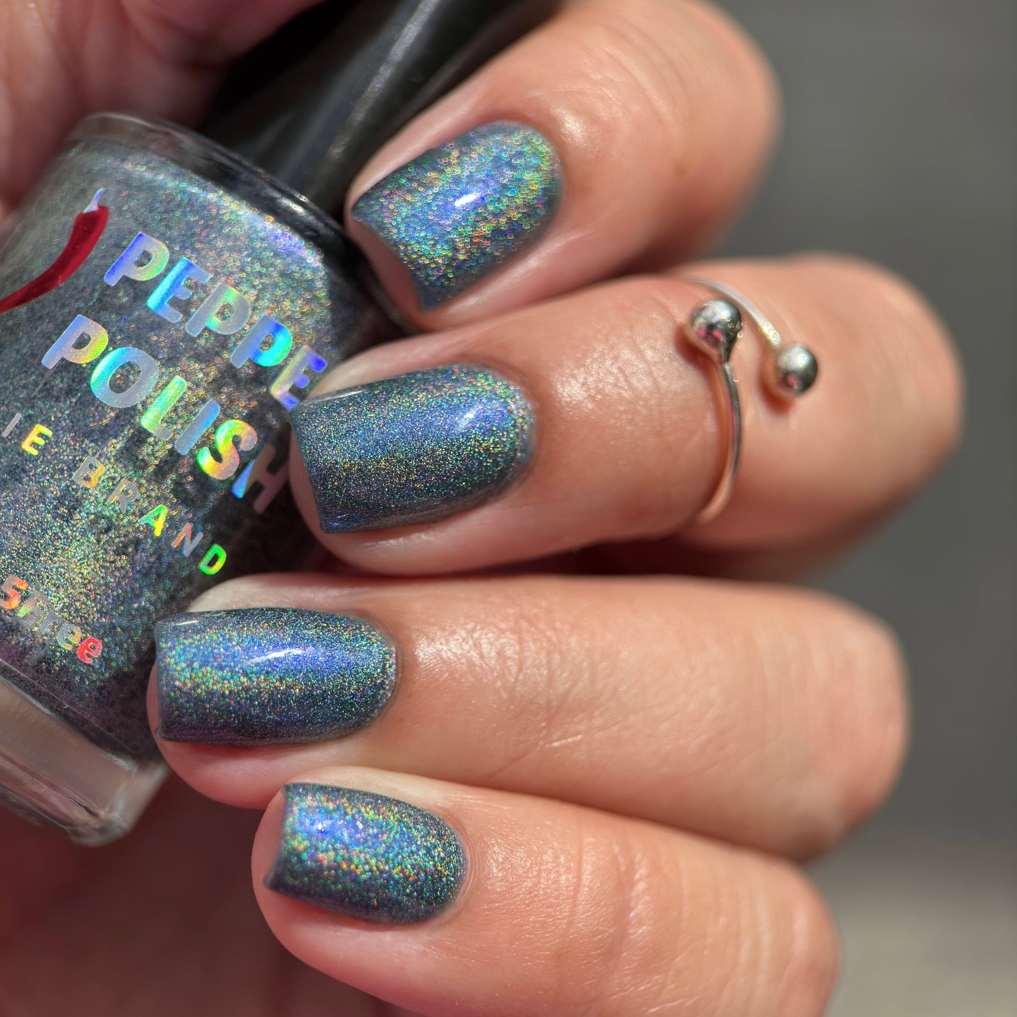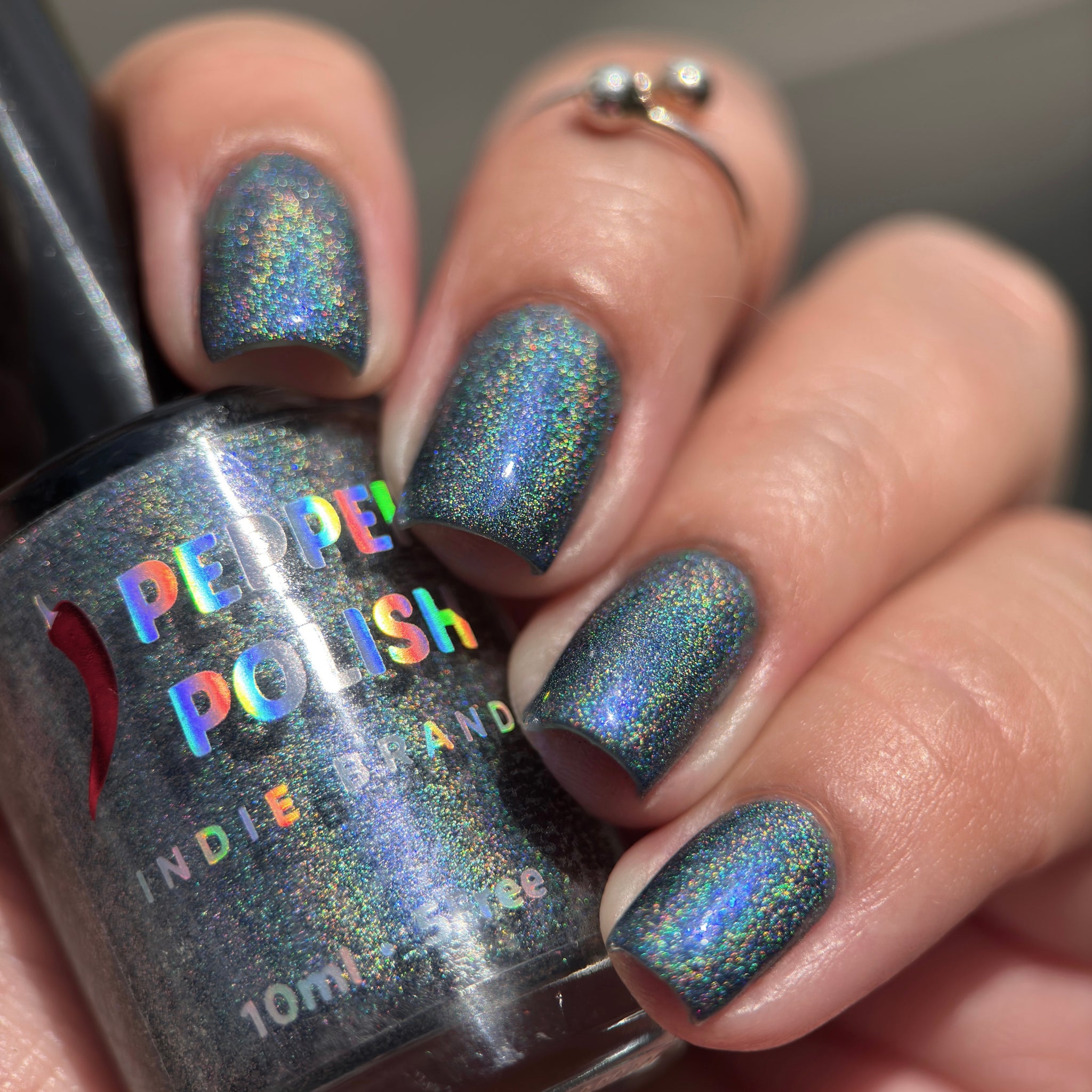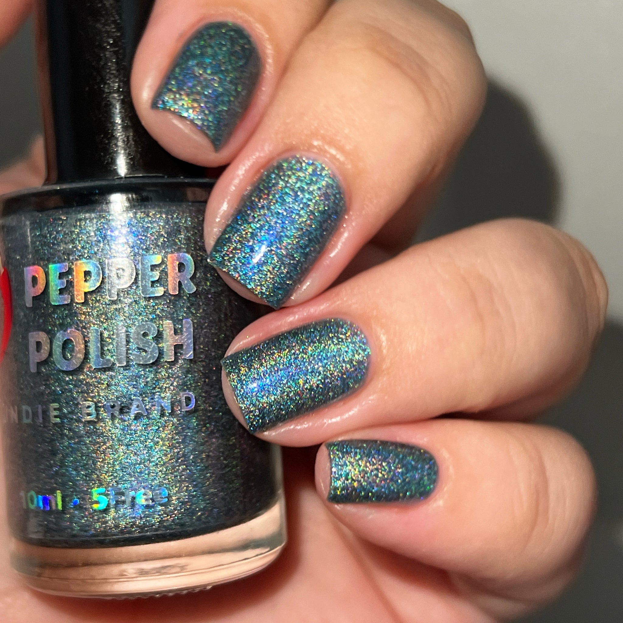 Description: Iara is a deep blue prismatic holographic nail polish with blue aurora pigment.
