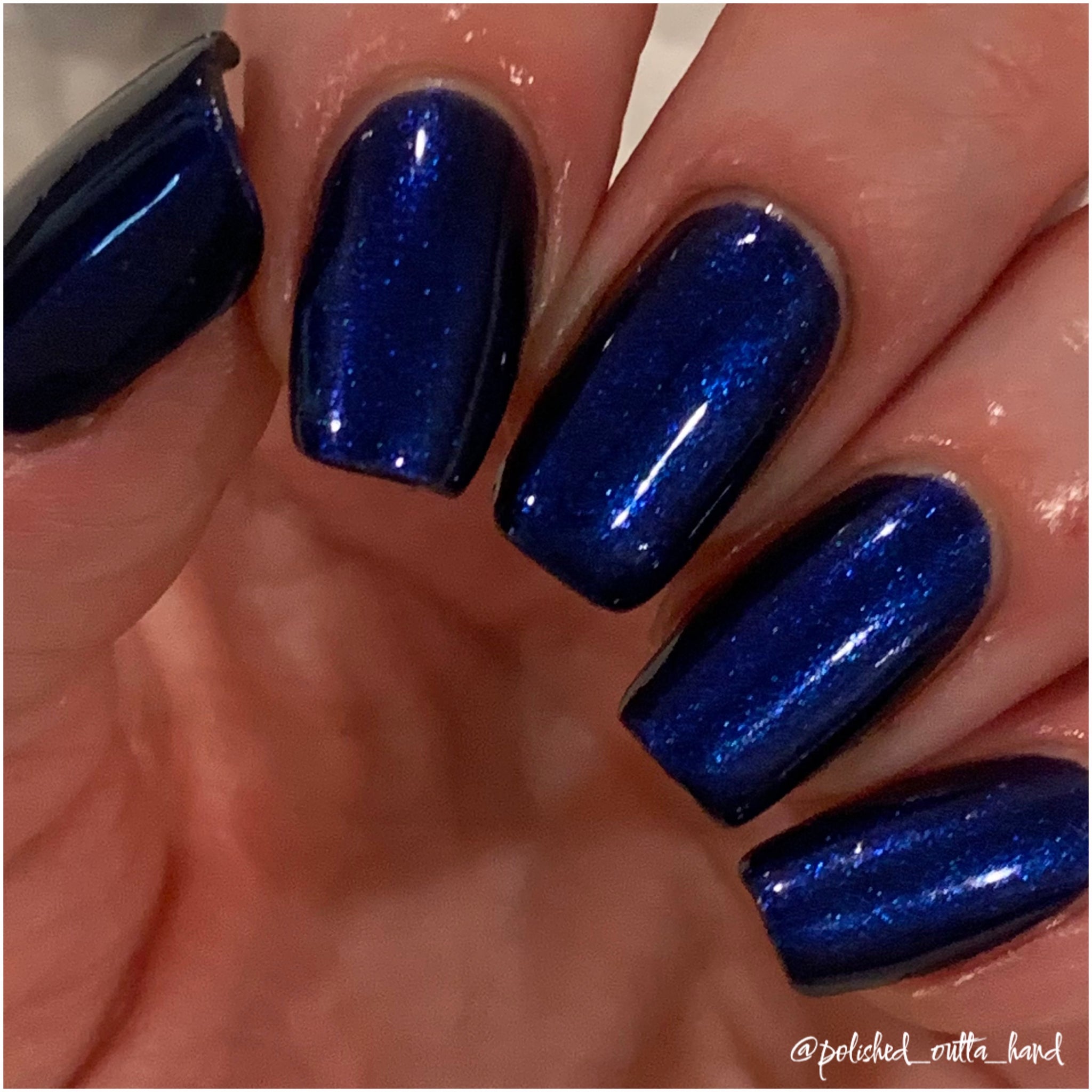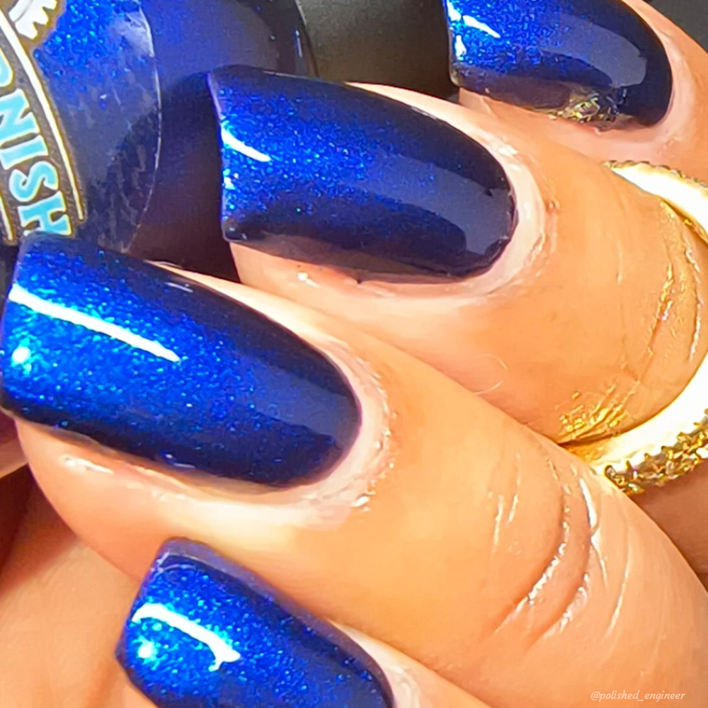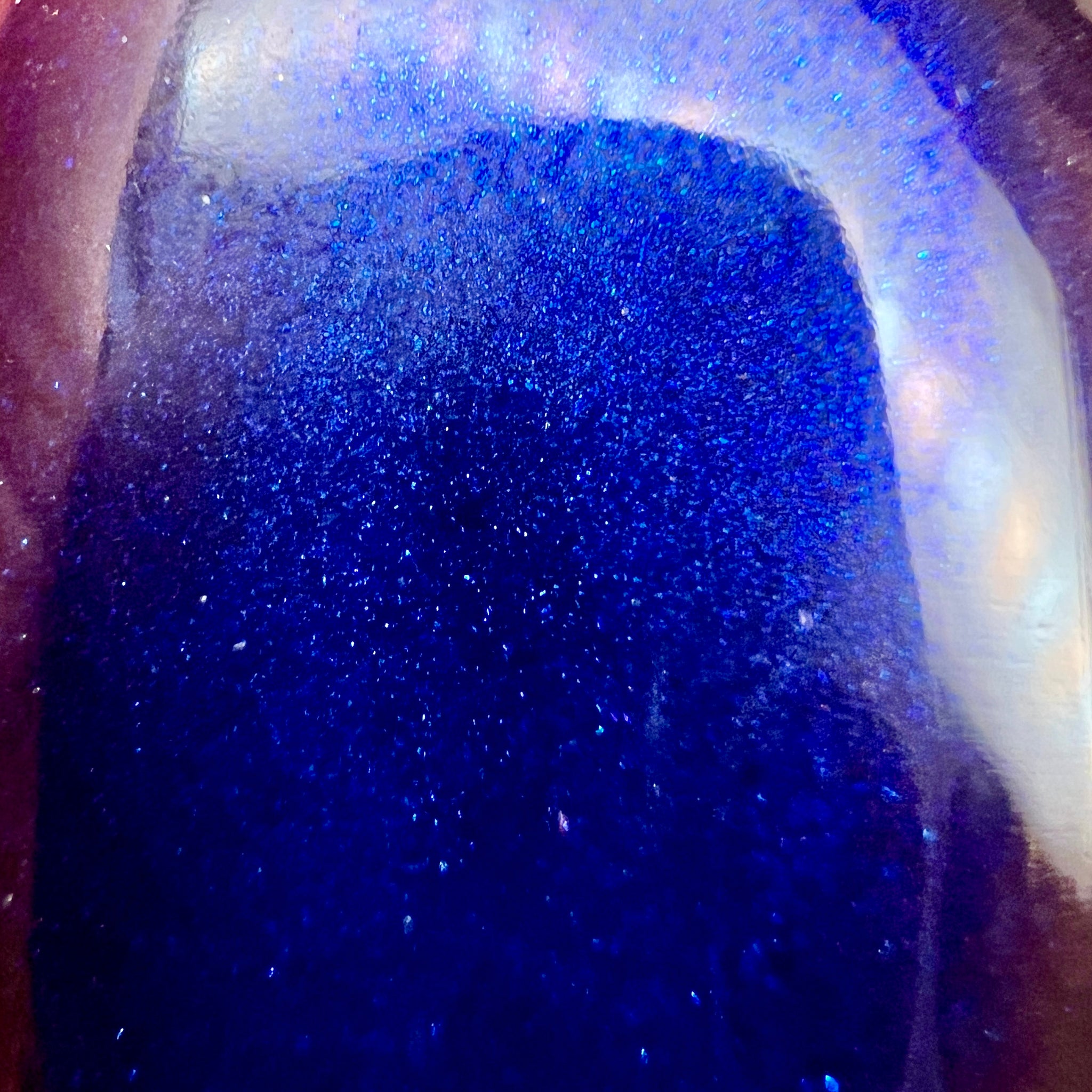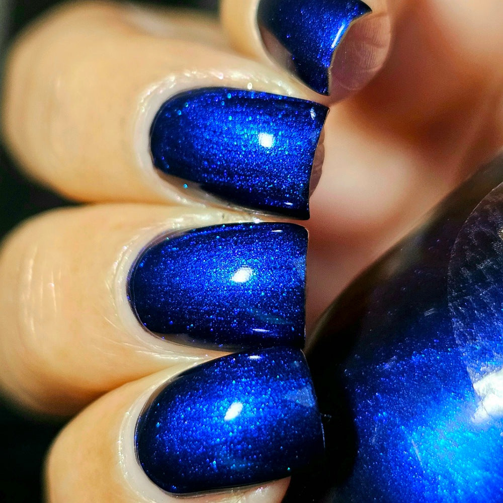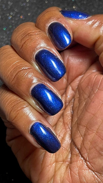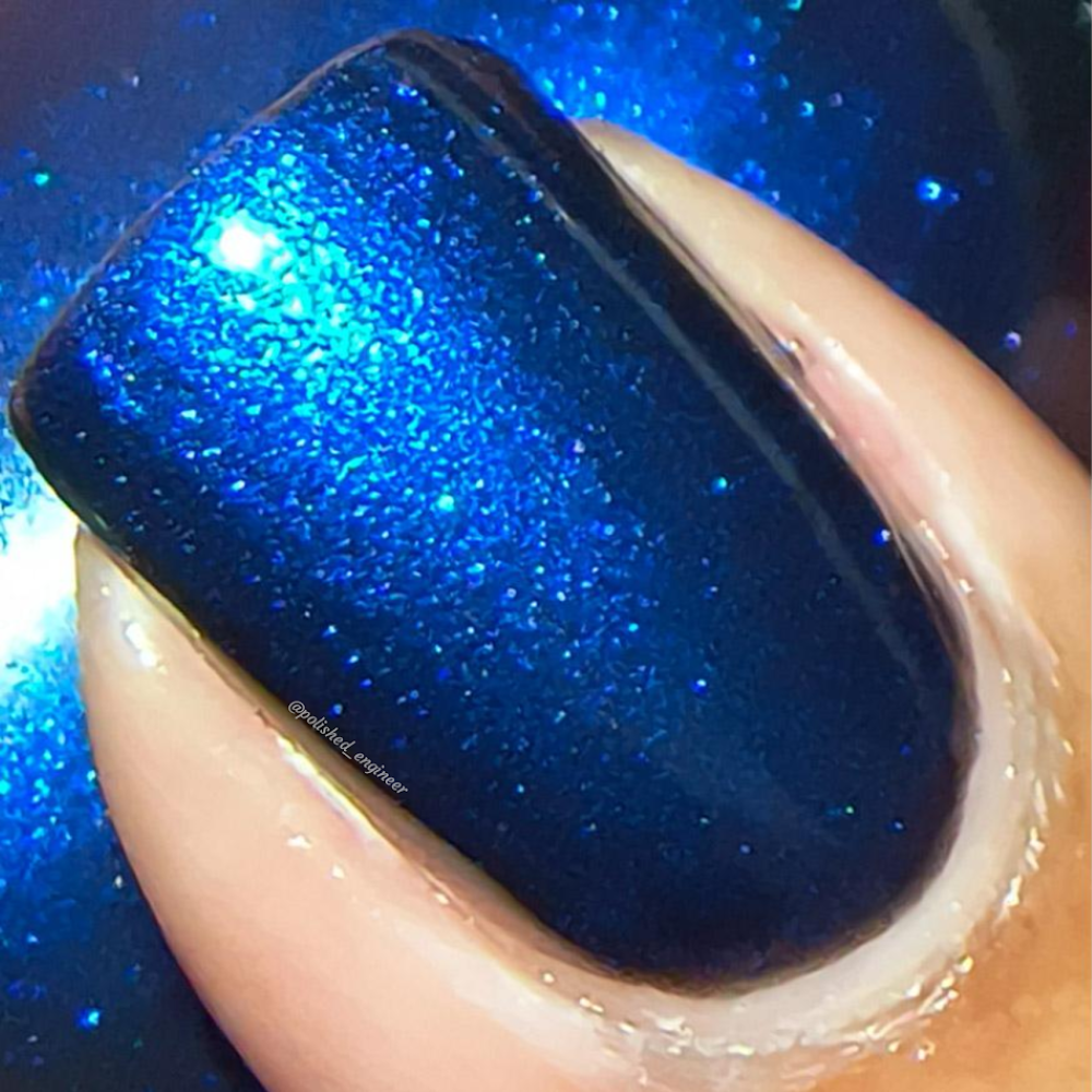 Description: A black jelly base with Blue to Black multi-chrome shimmer along with large particle shimmers in blue/purple.
