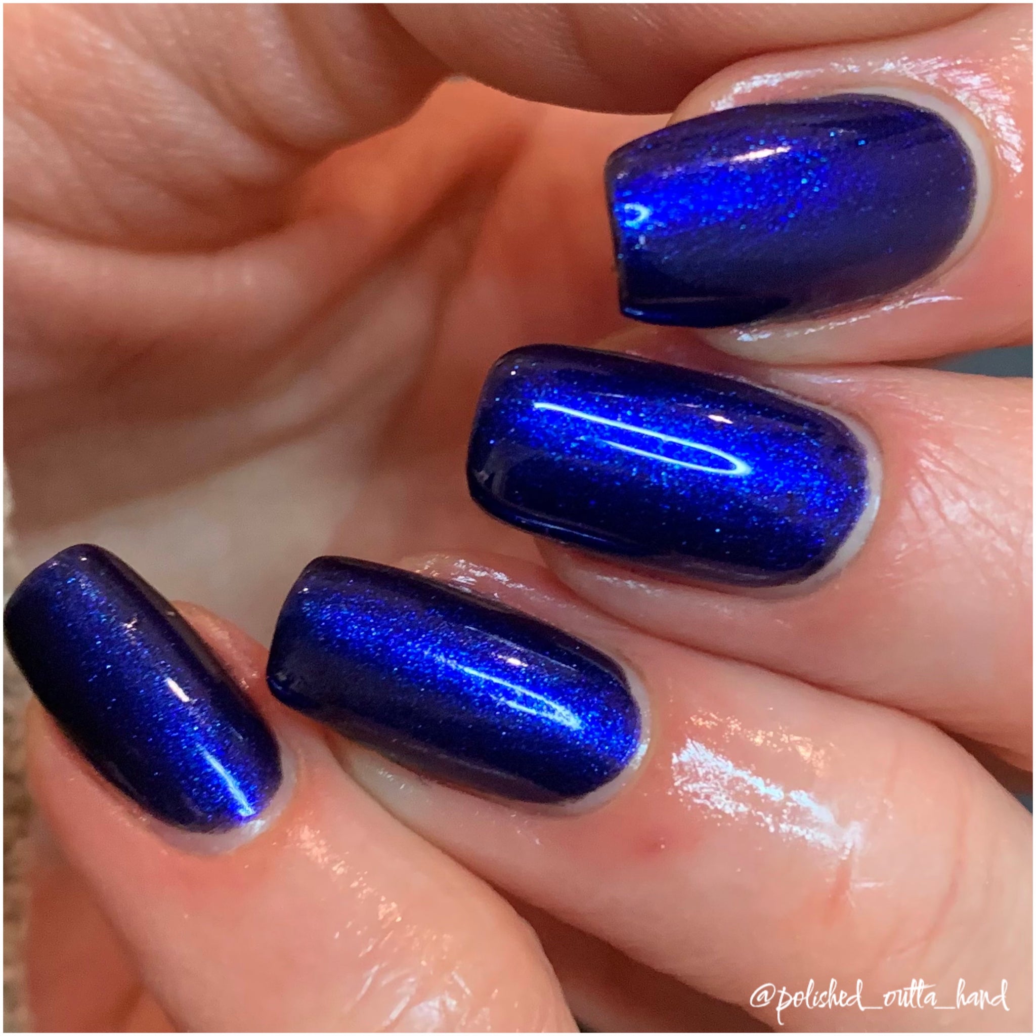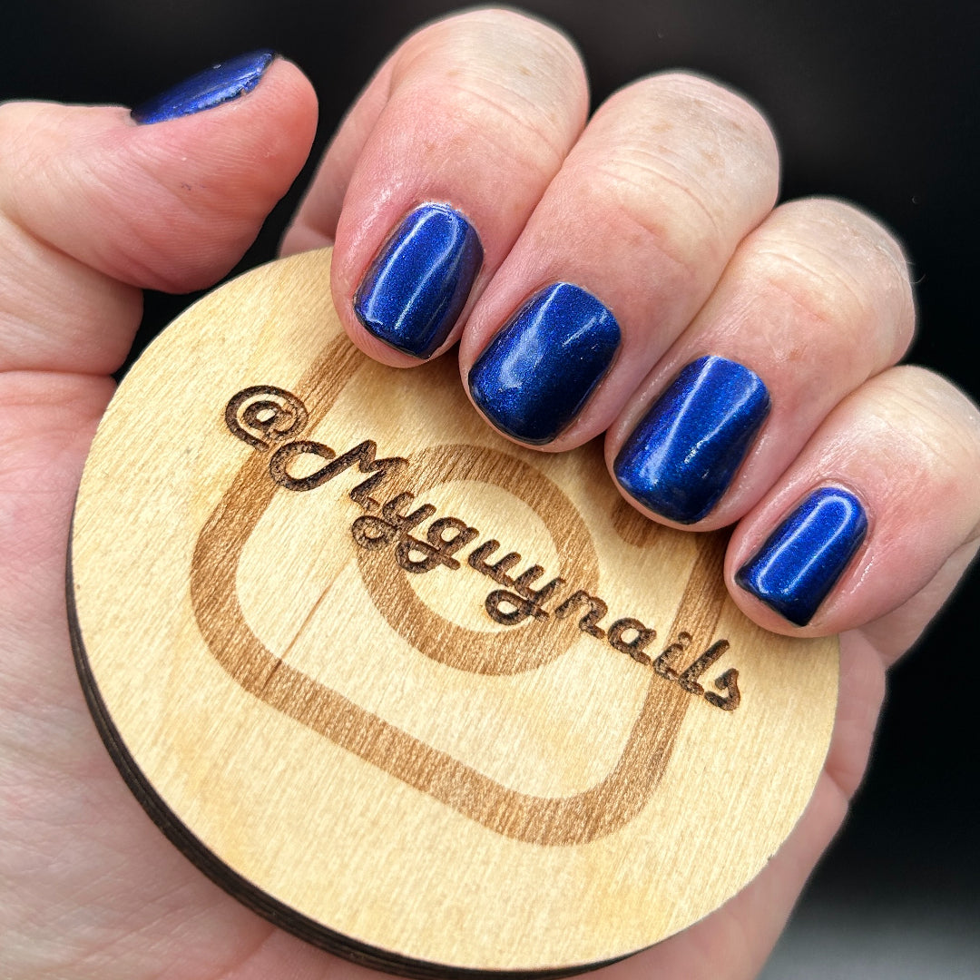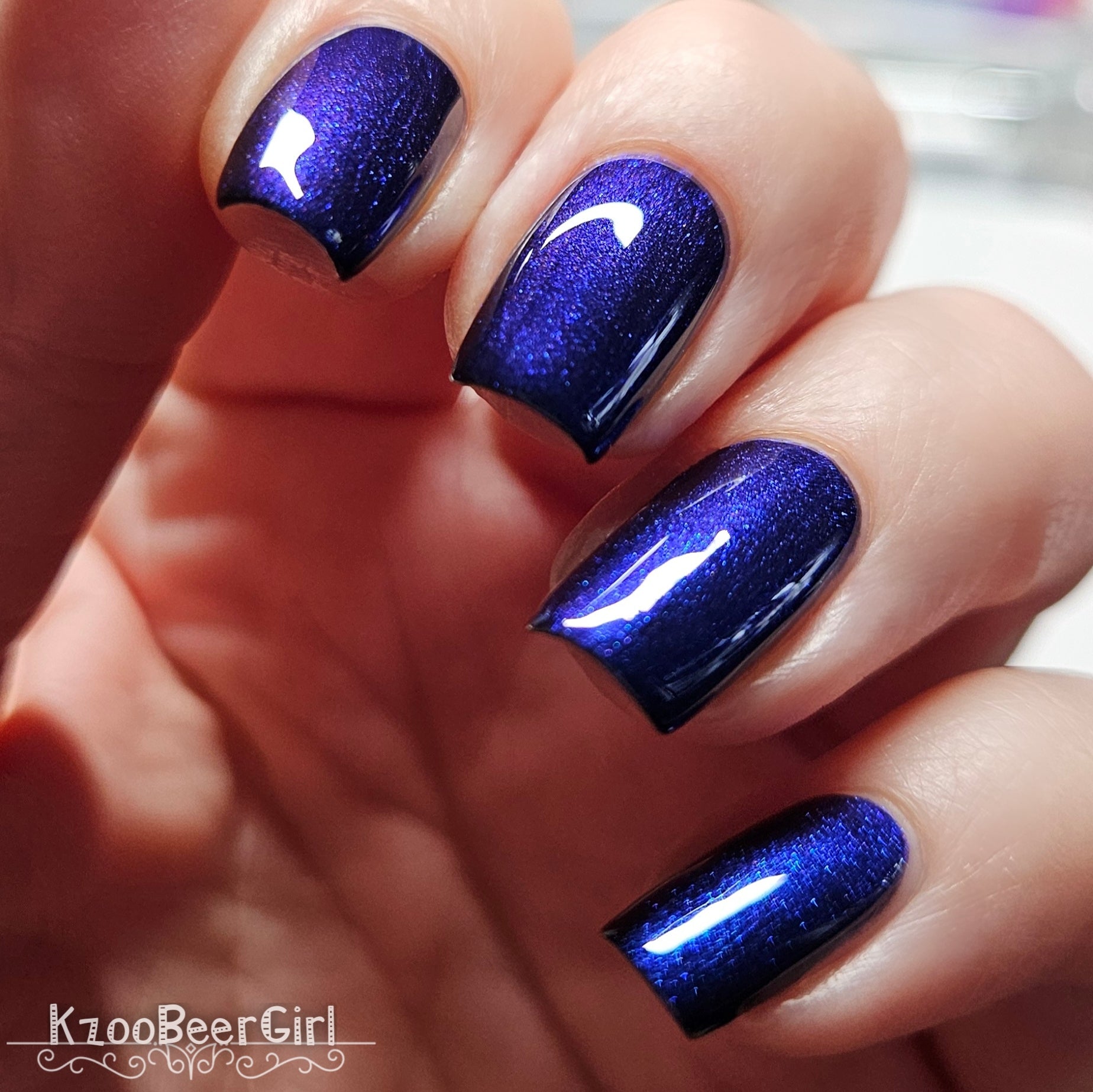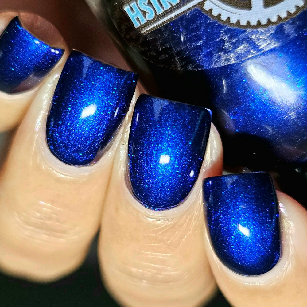 Description: A black jelly base with Blue to Black multi-chrome shimmer along with large particle shimmers in blue/purple.