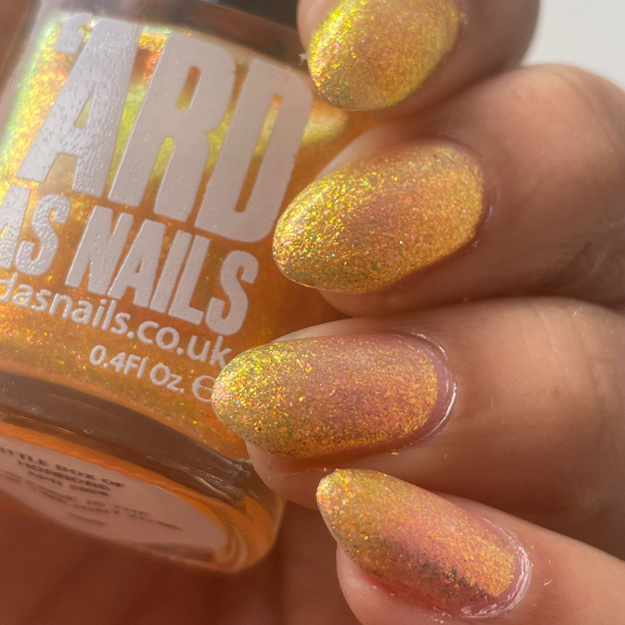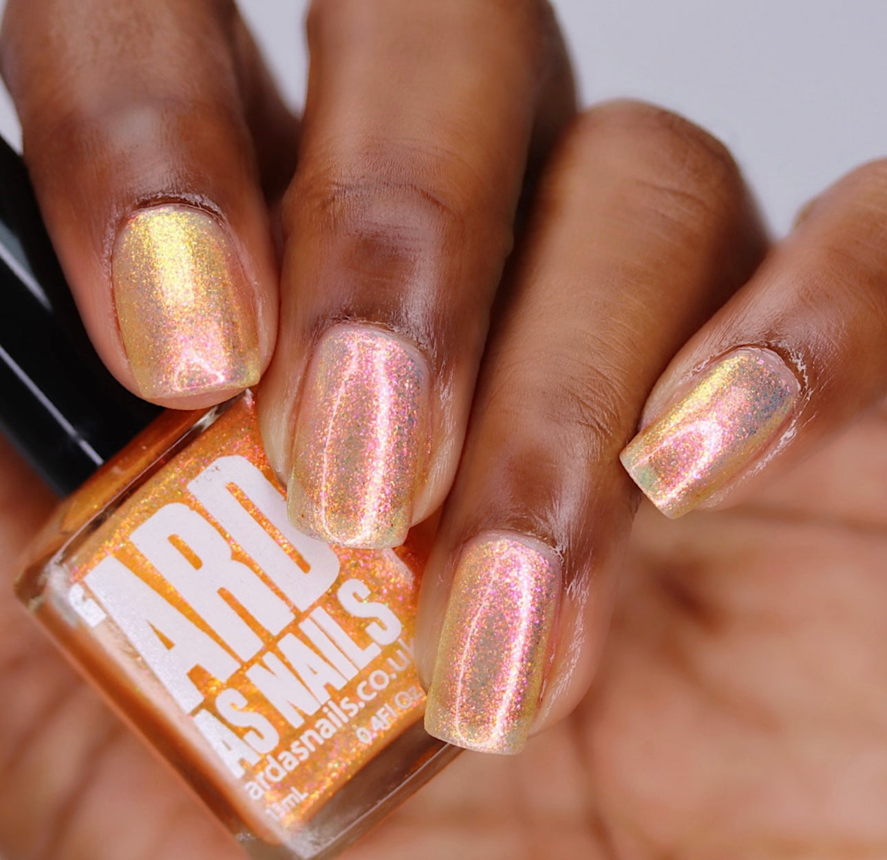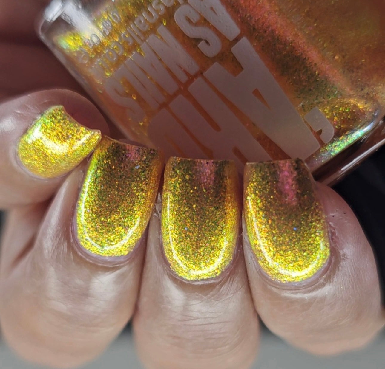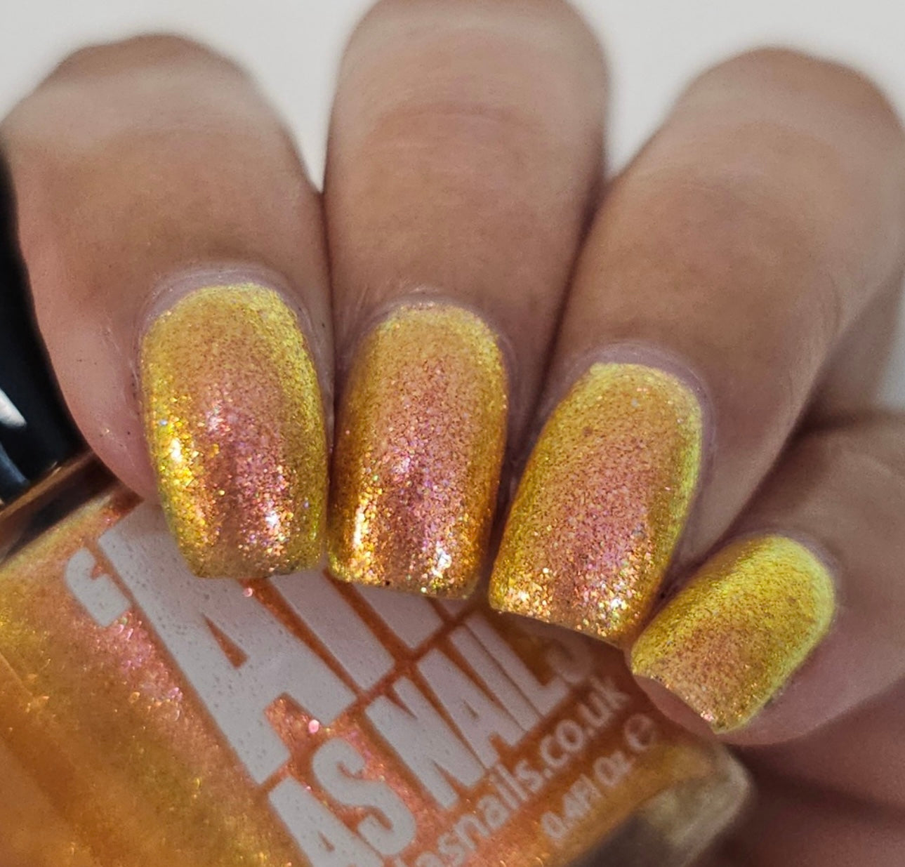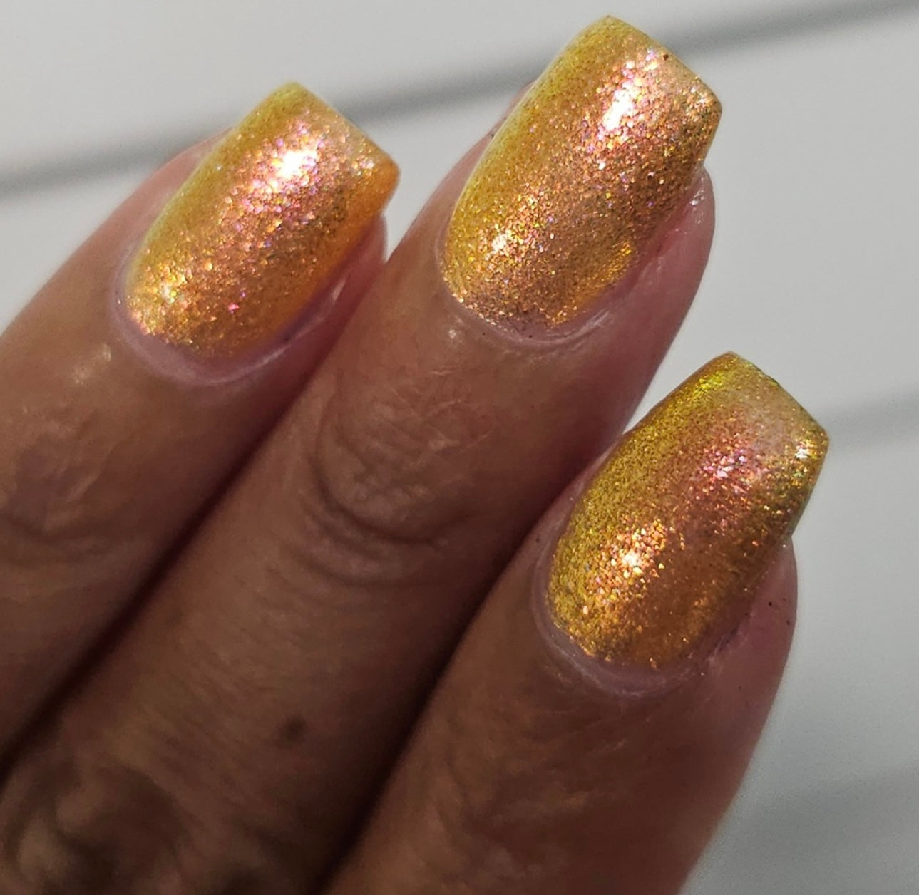 Description: This polish is a predominantly gold base with bronze and red shimmer. This can be worn alone or used over a base colour for a completely different look