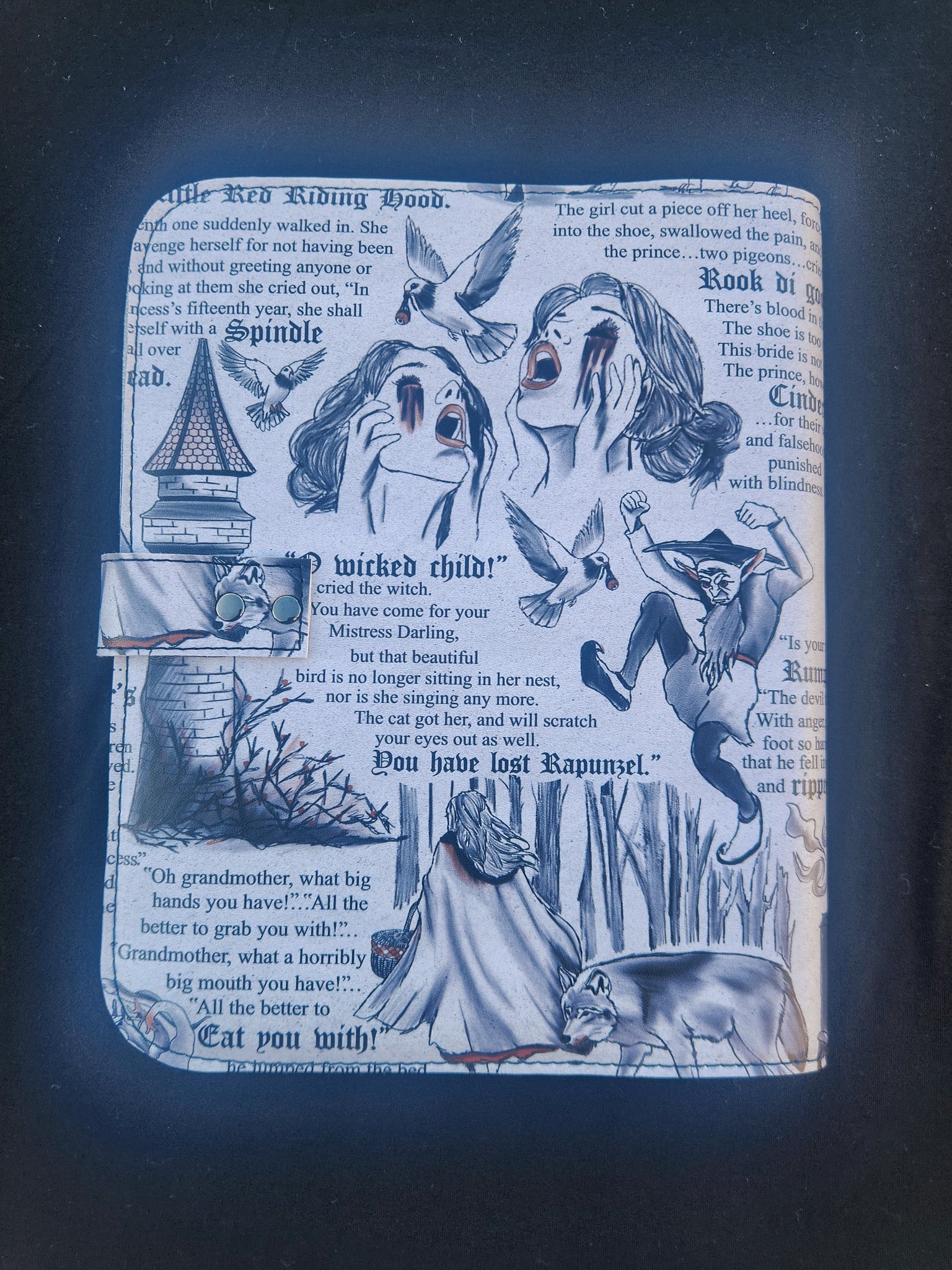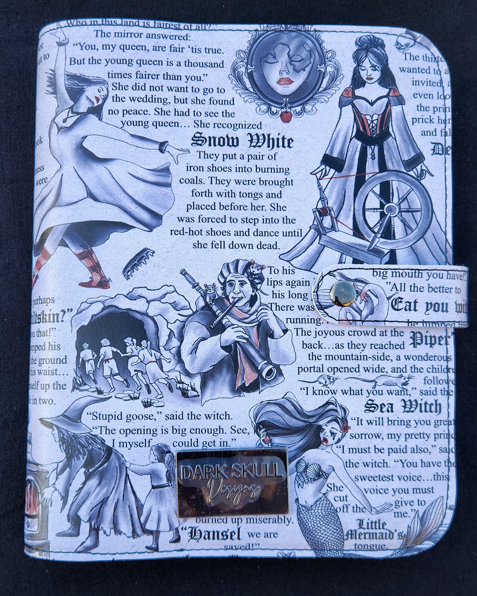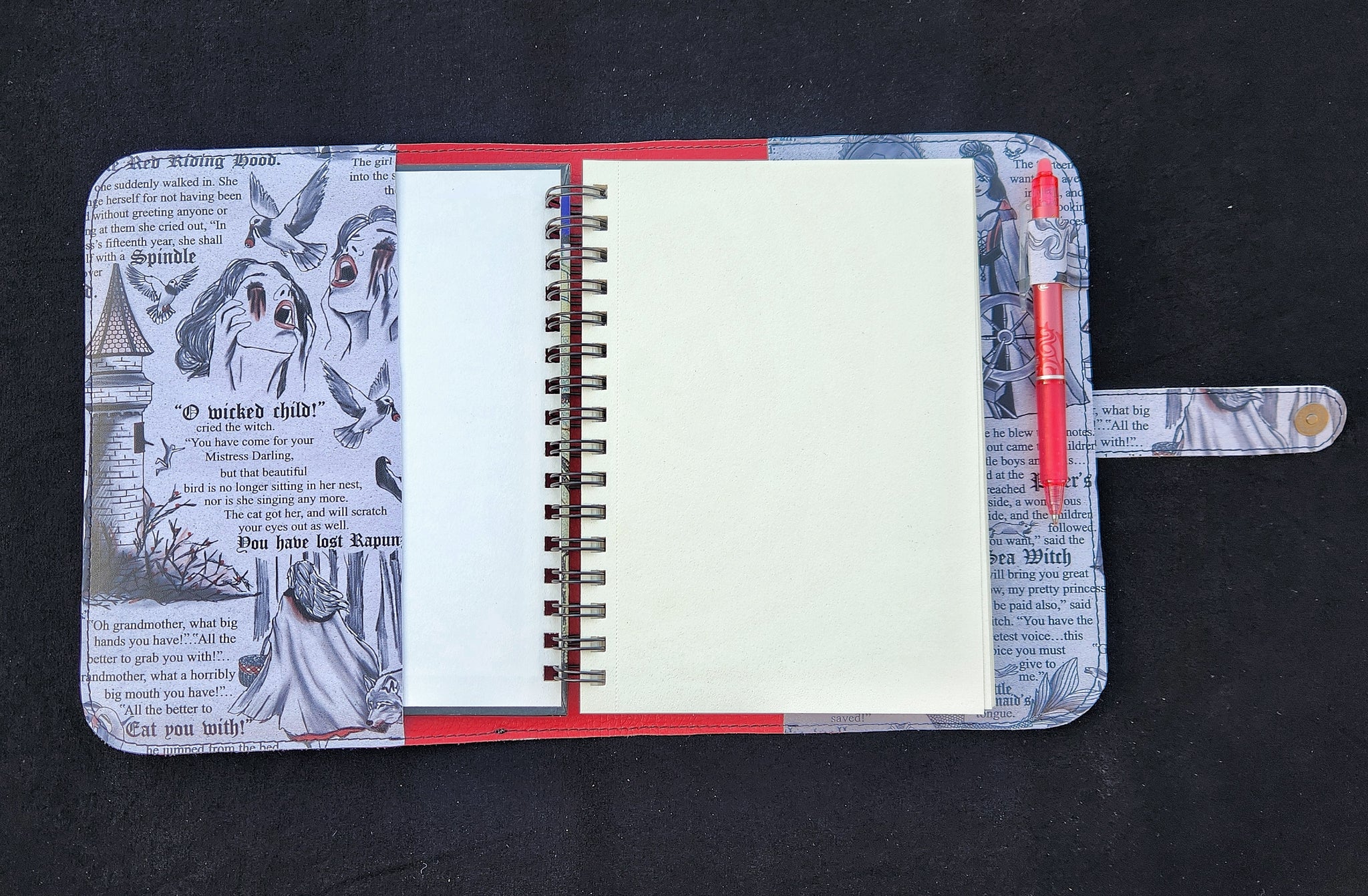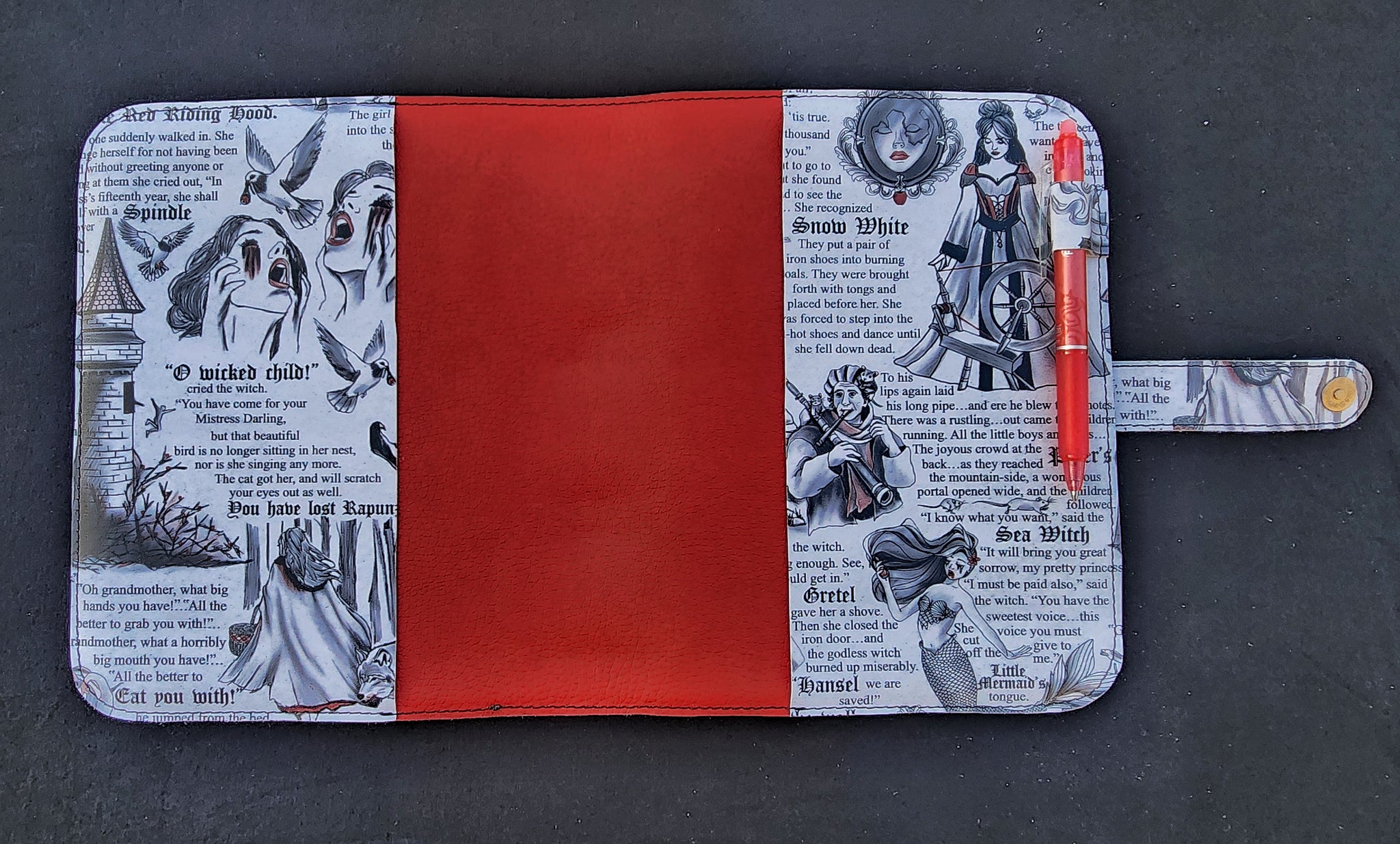 Description: The Grimm Journal Holder features a Grimm's Fairy Tale print vinyl in a black and white color scheme with pops of dark red. Journals are secured by two interior pockets. Easily carry a pen with you using the convenient pen holder.