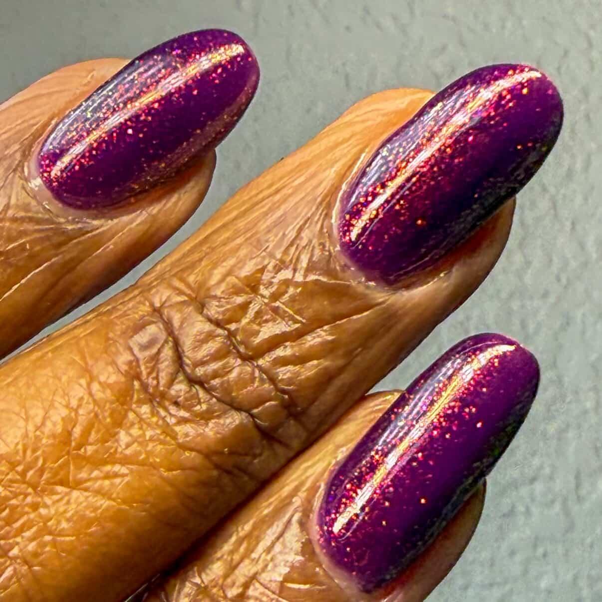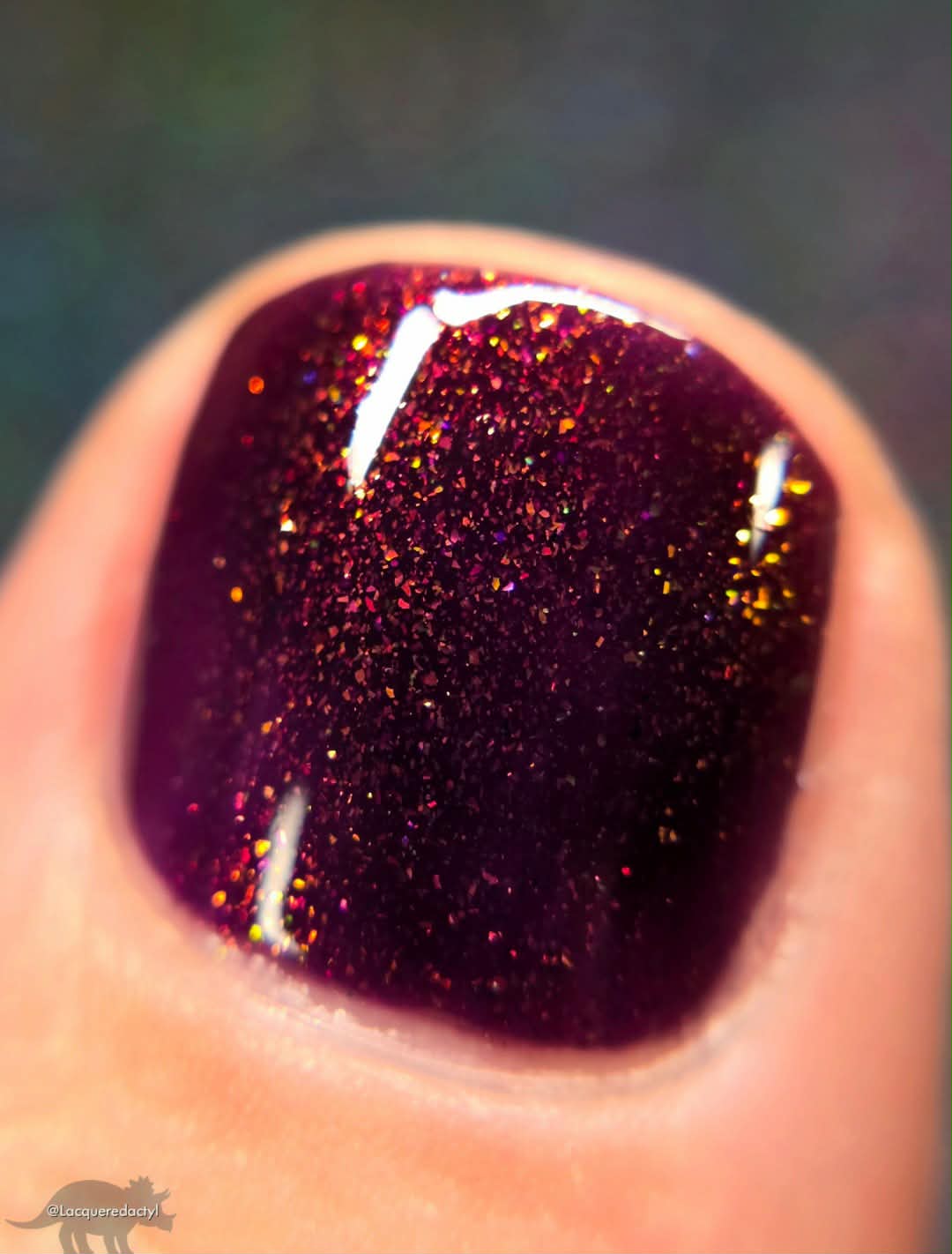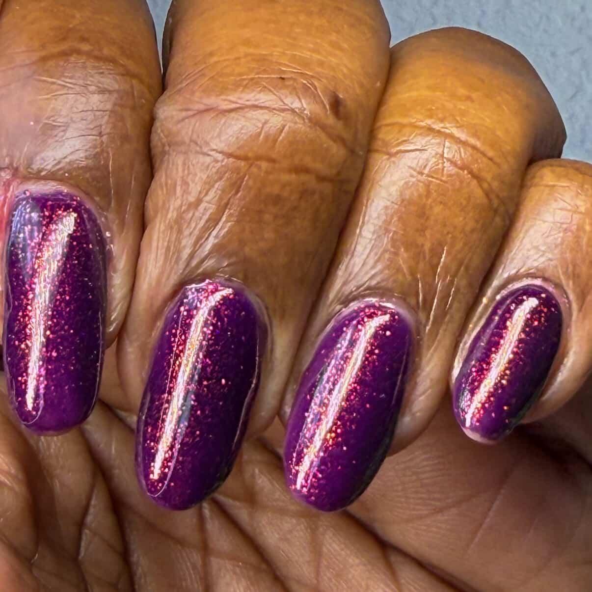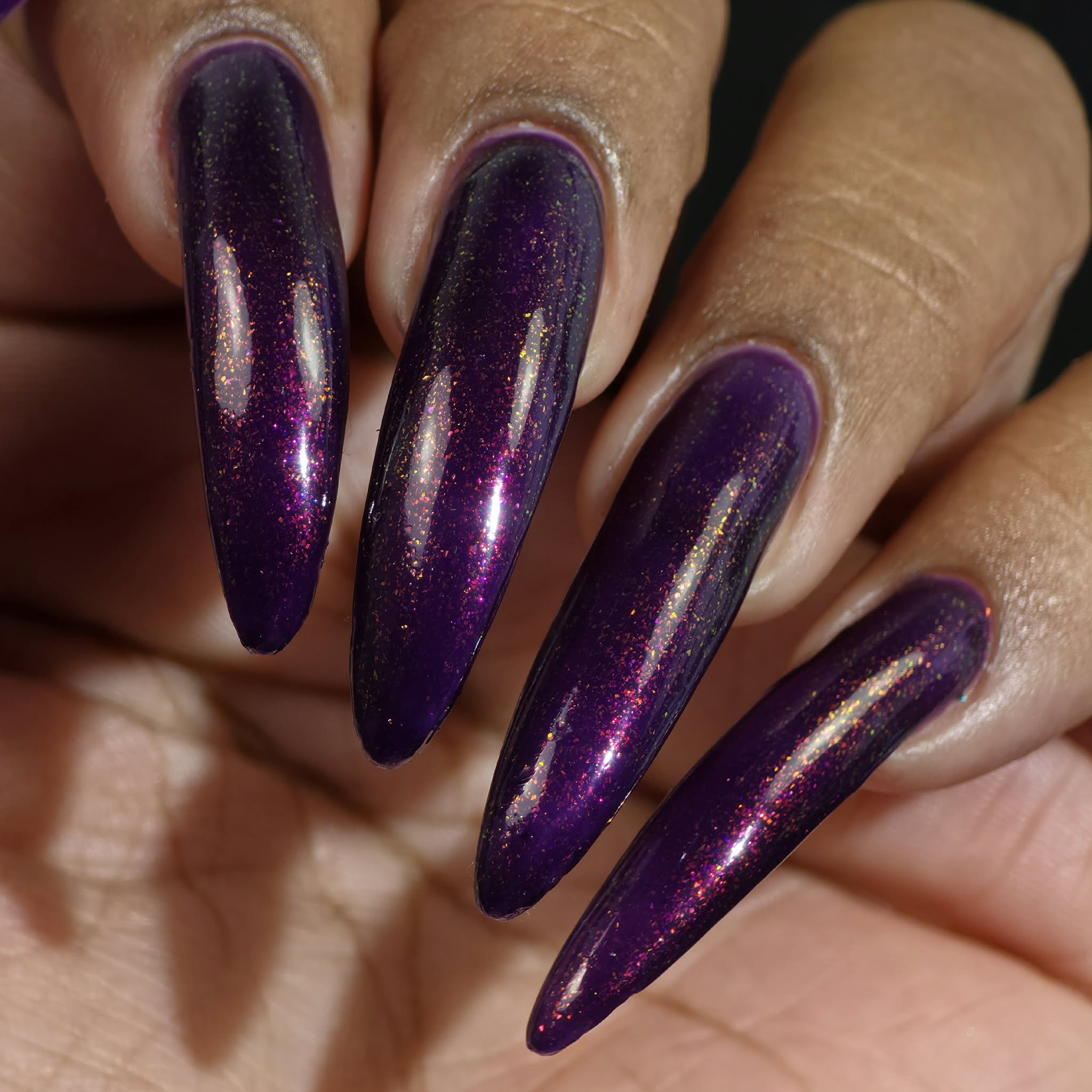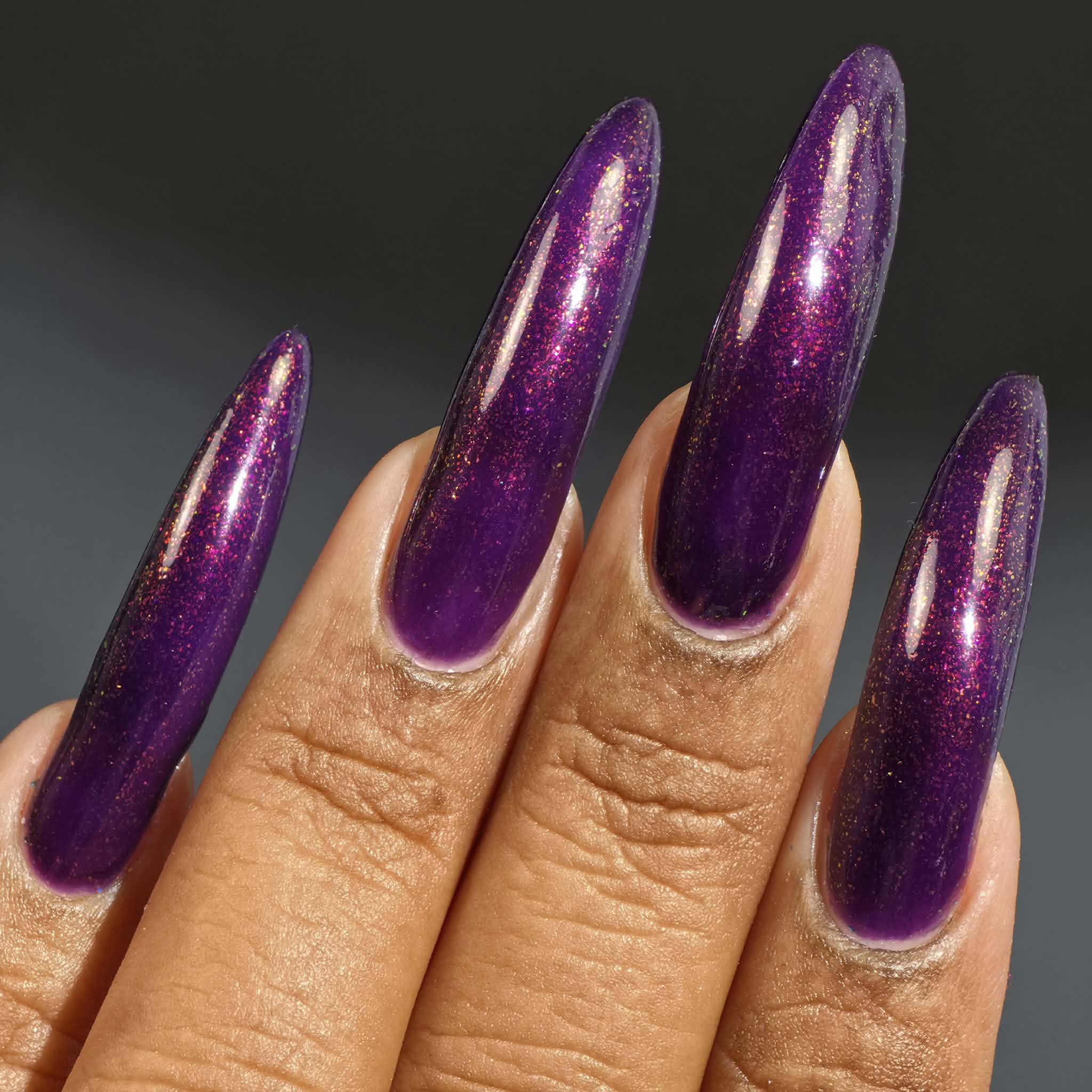 Description: This polish is a dark purple full of pink/purple/gold larger particle shimmer.