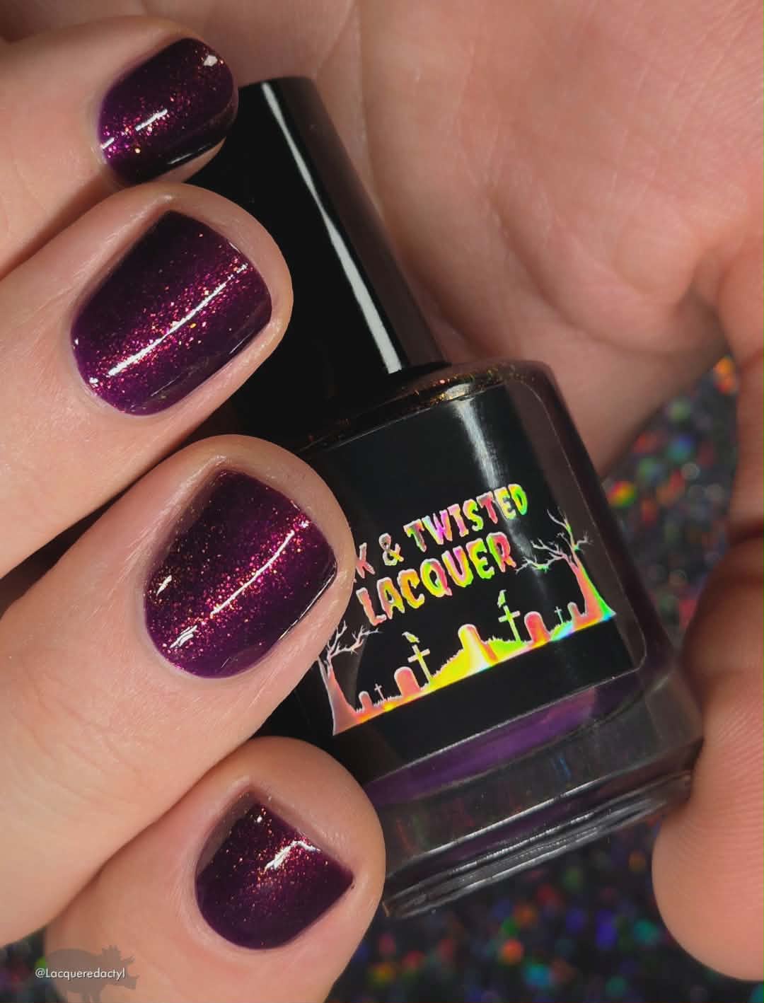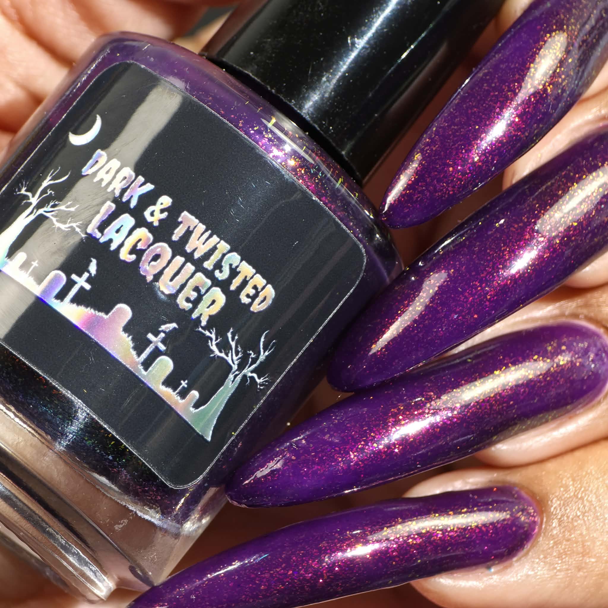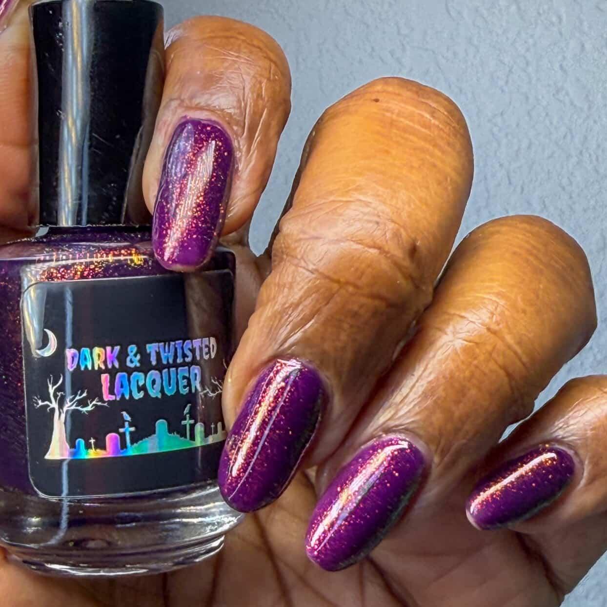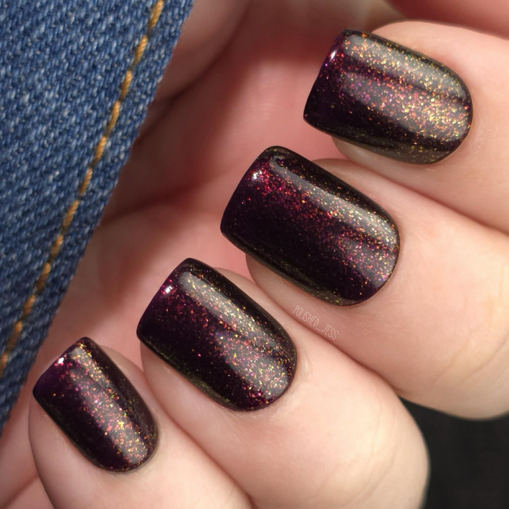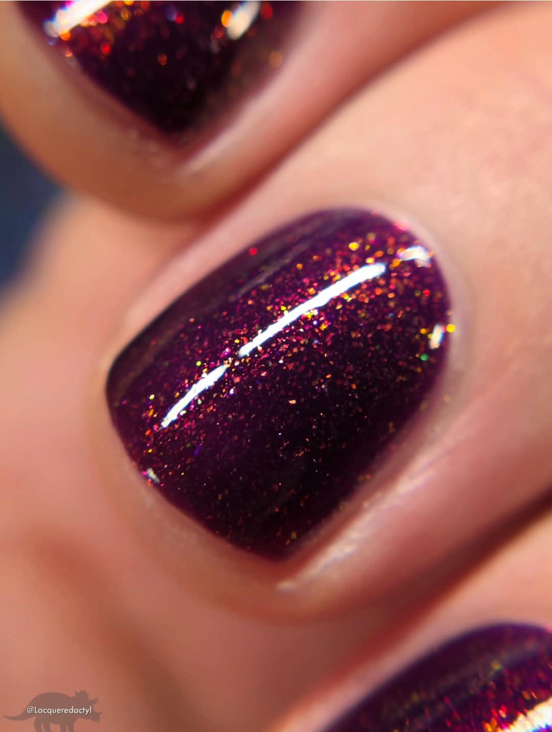 Description: This polish is a dark purple full of pink/purple/gold larger particle shimmer.