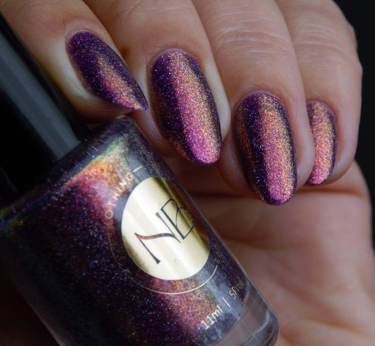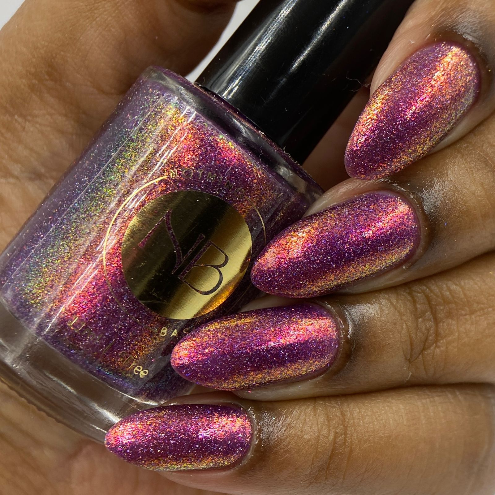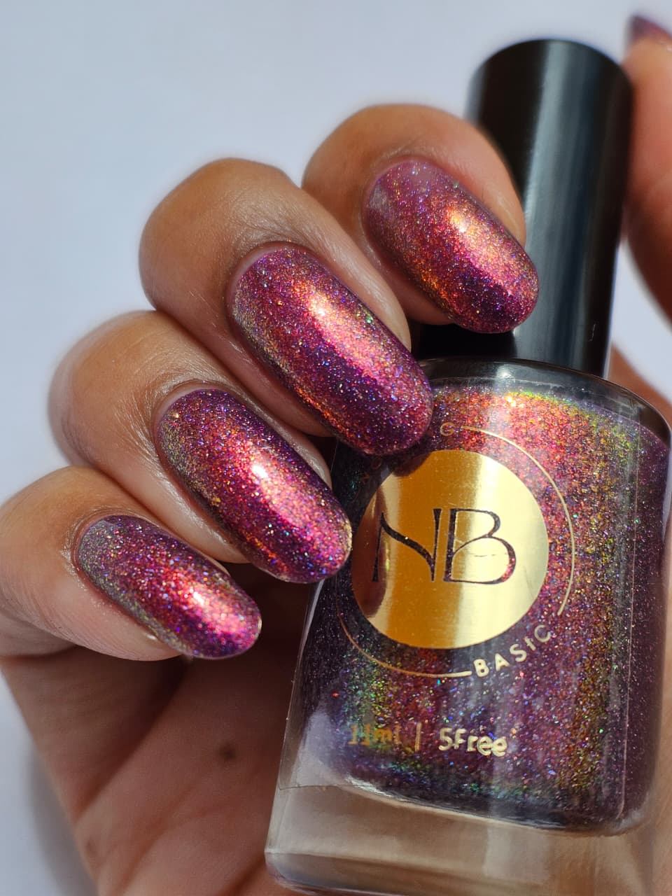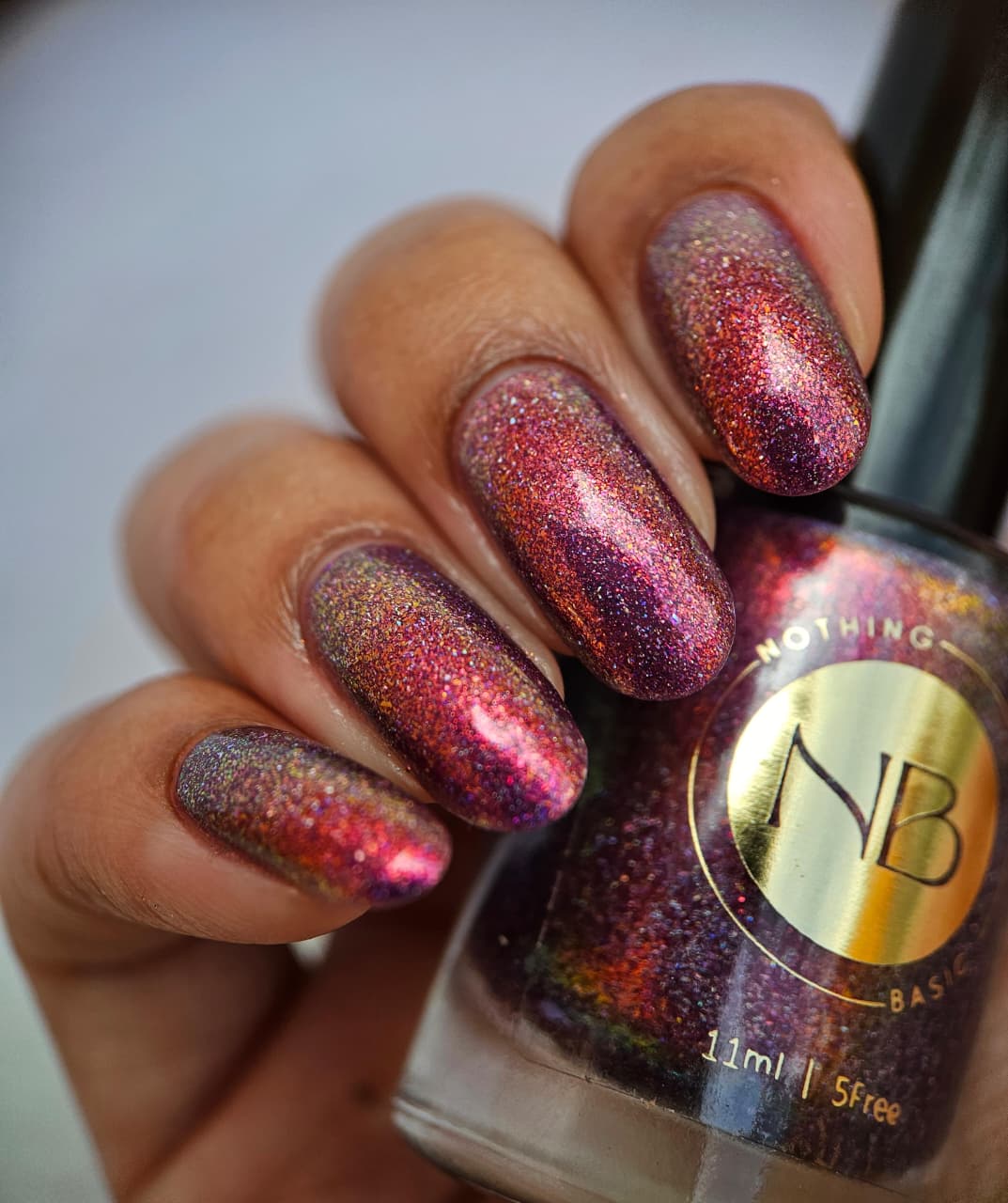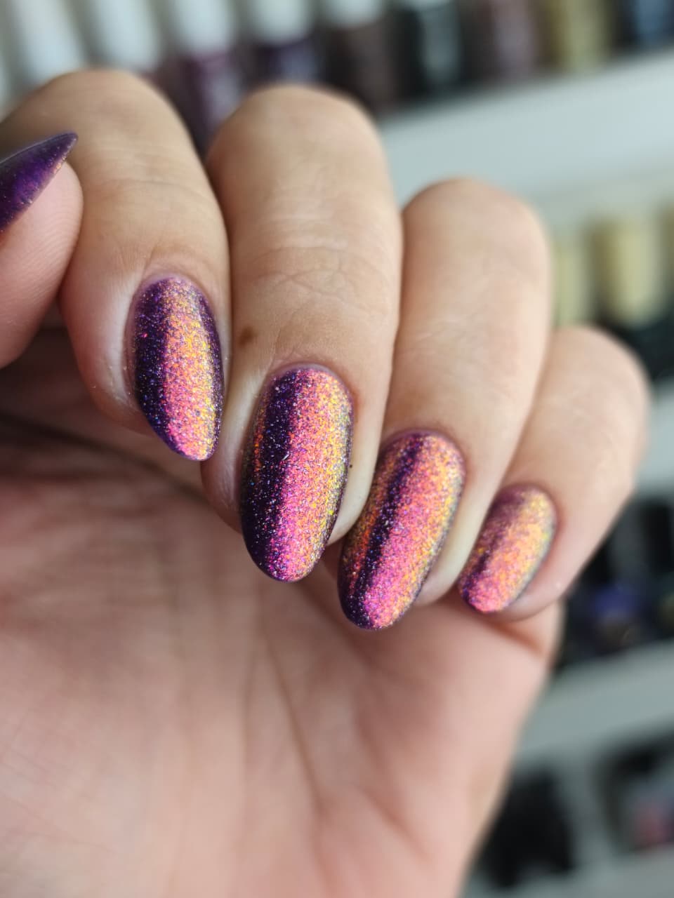 Description: red base with yellow/pink micro flakie and holographic micro flakie