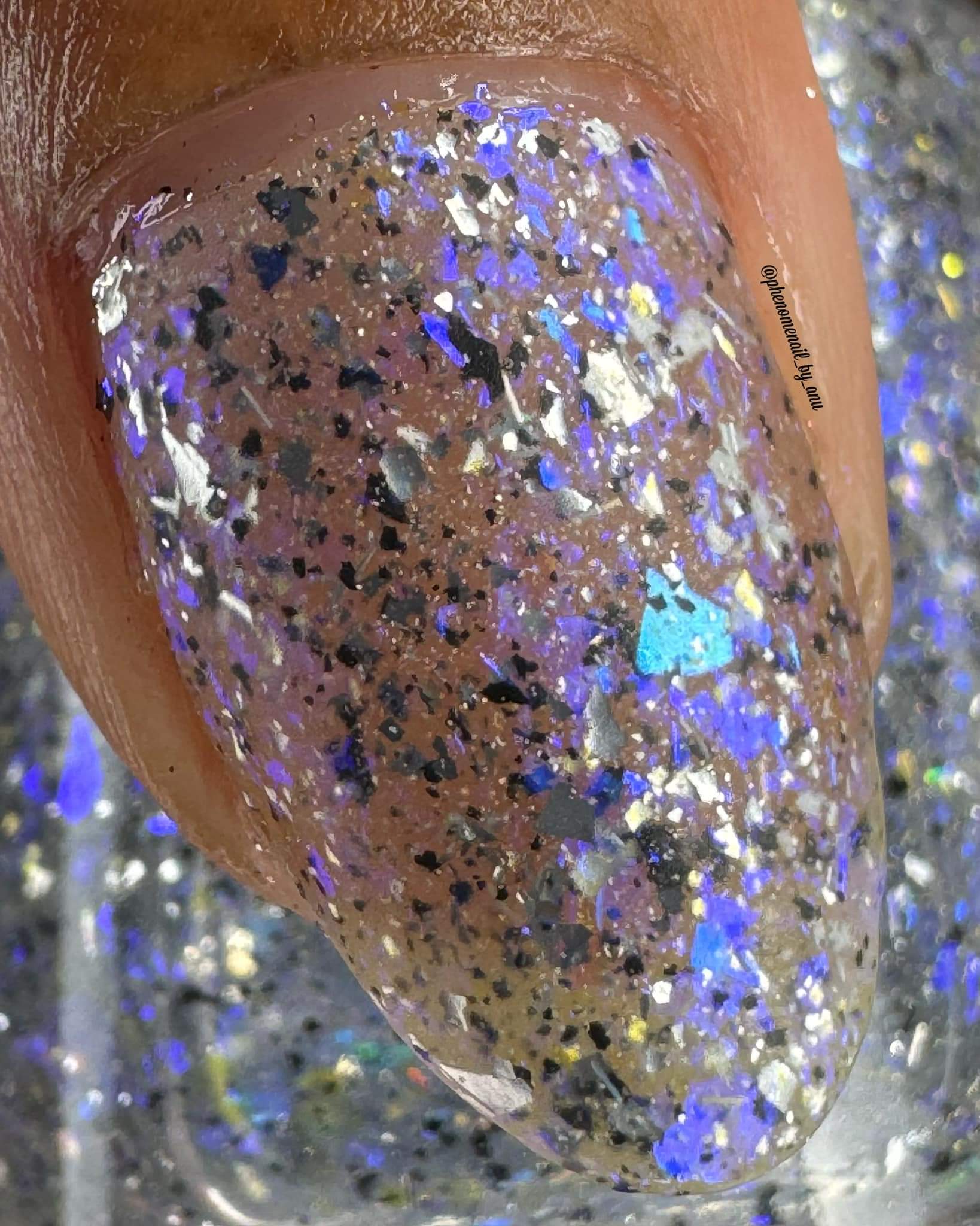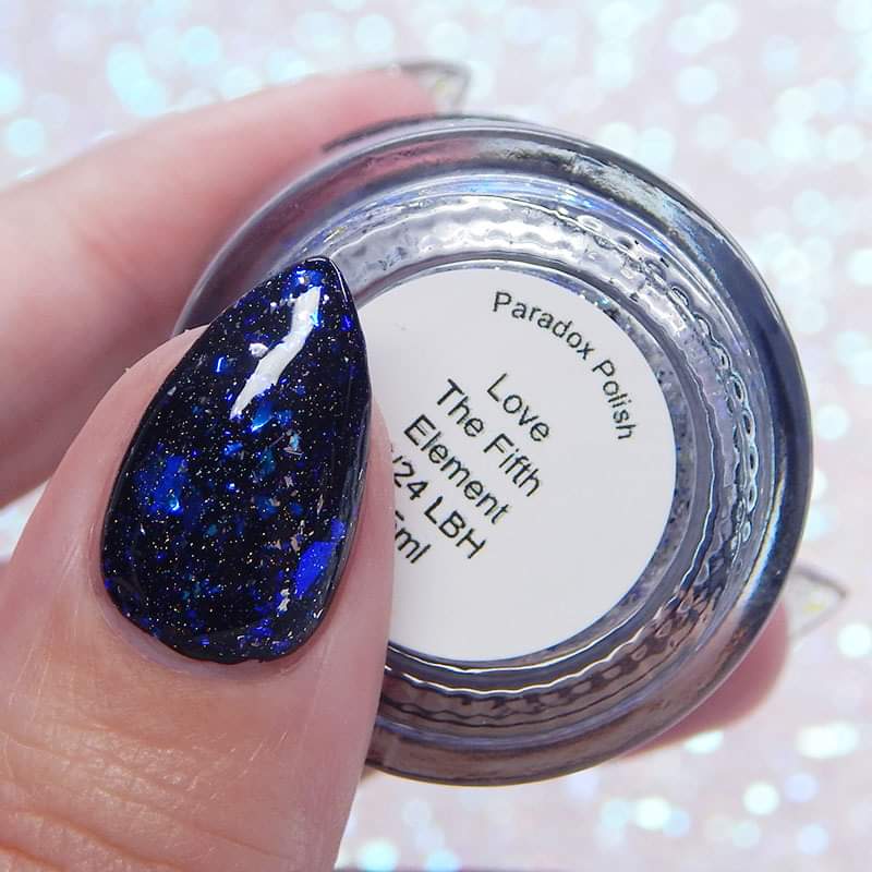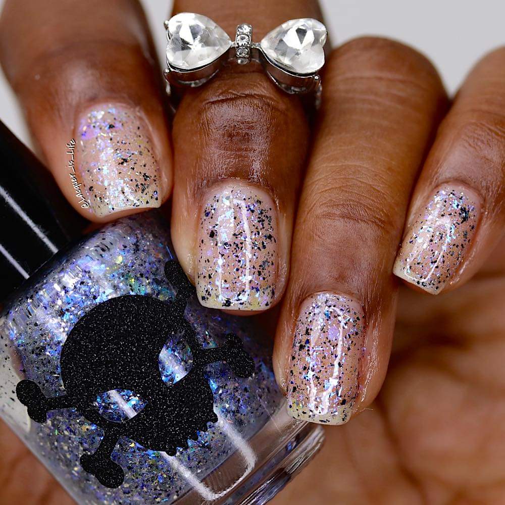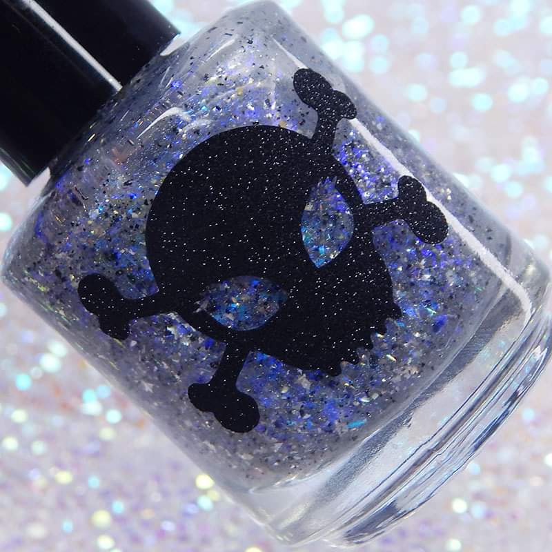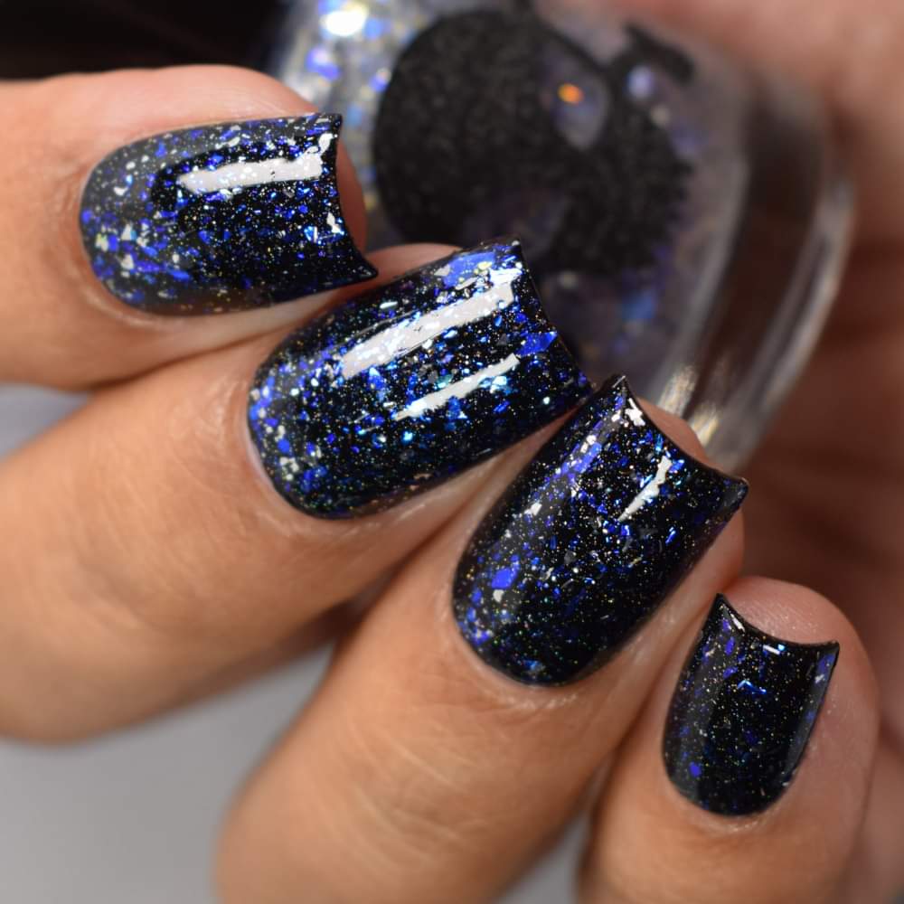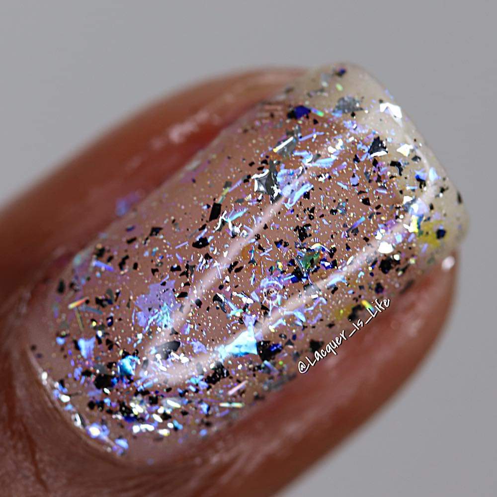 Description: Shifty blue to teal iridescent flake, black and silver flake. Wear alone or as a topper