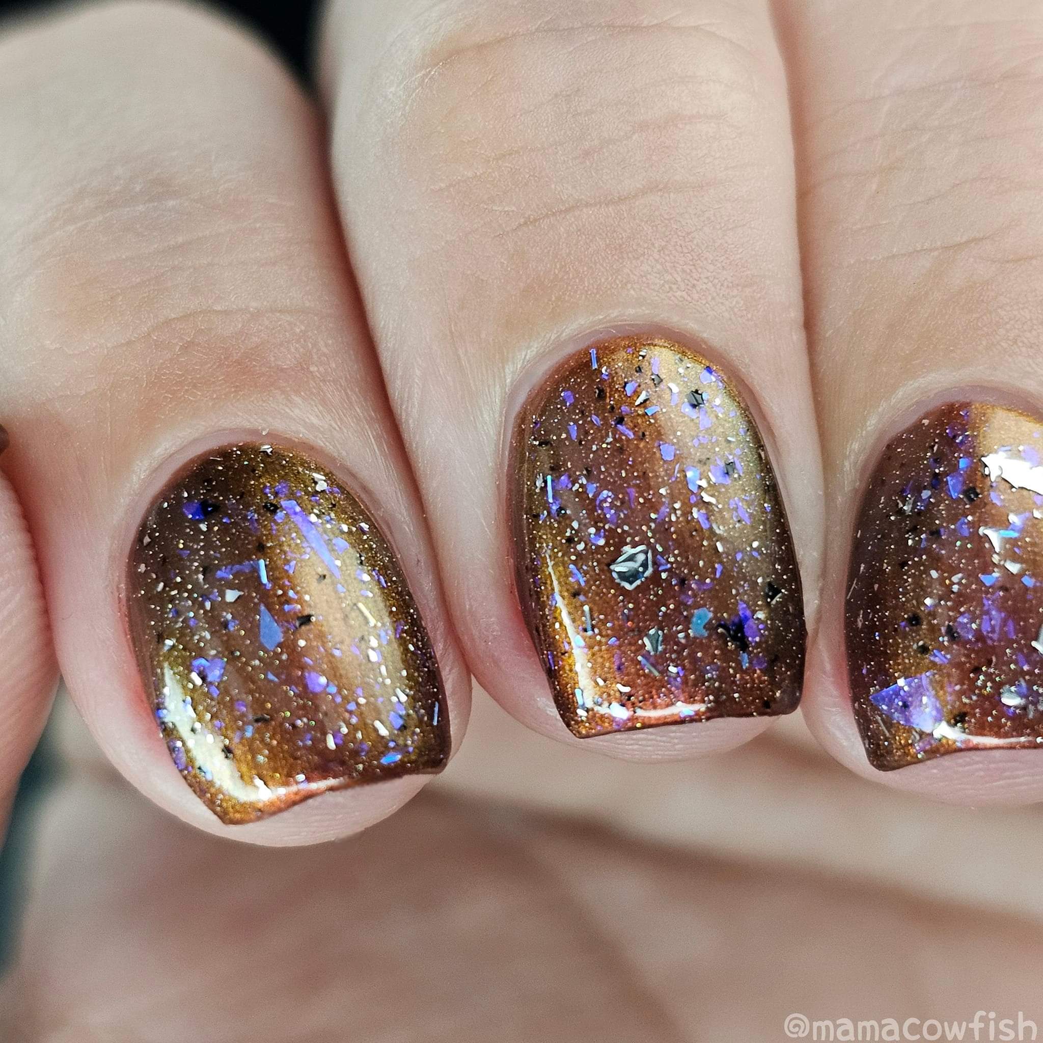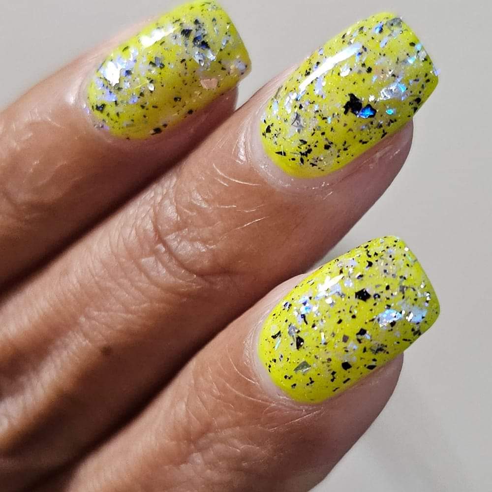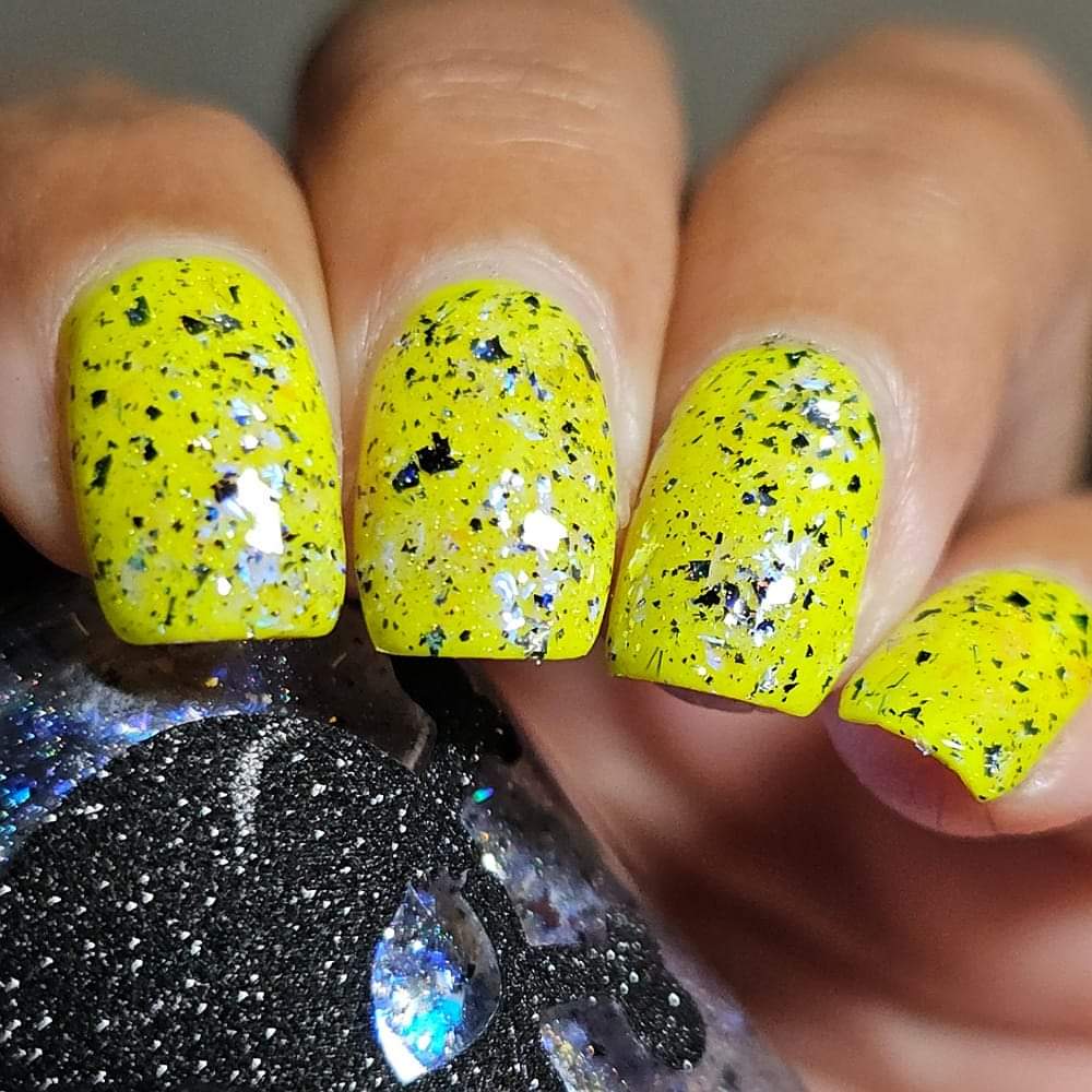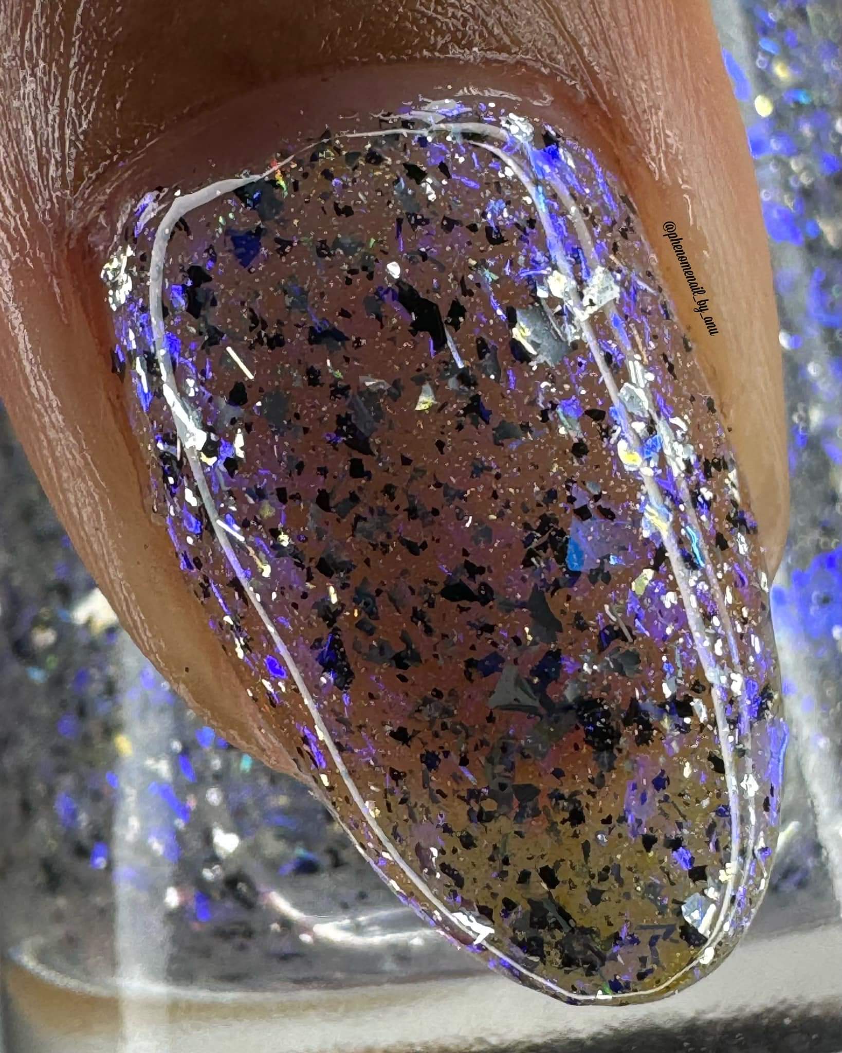Description: Shifty blue to teal iridescent flake, black and silver flake. Wear alone or as a topper