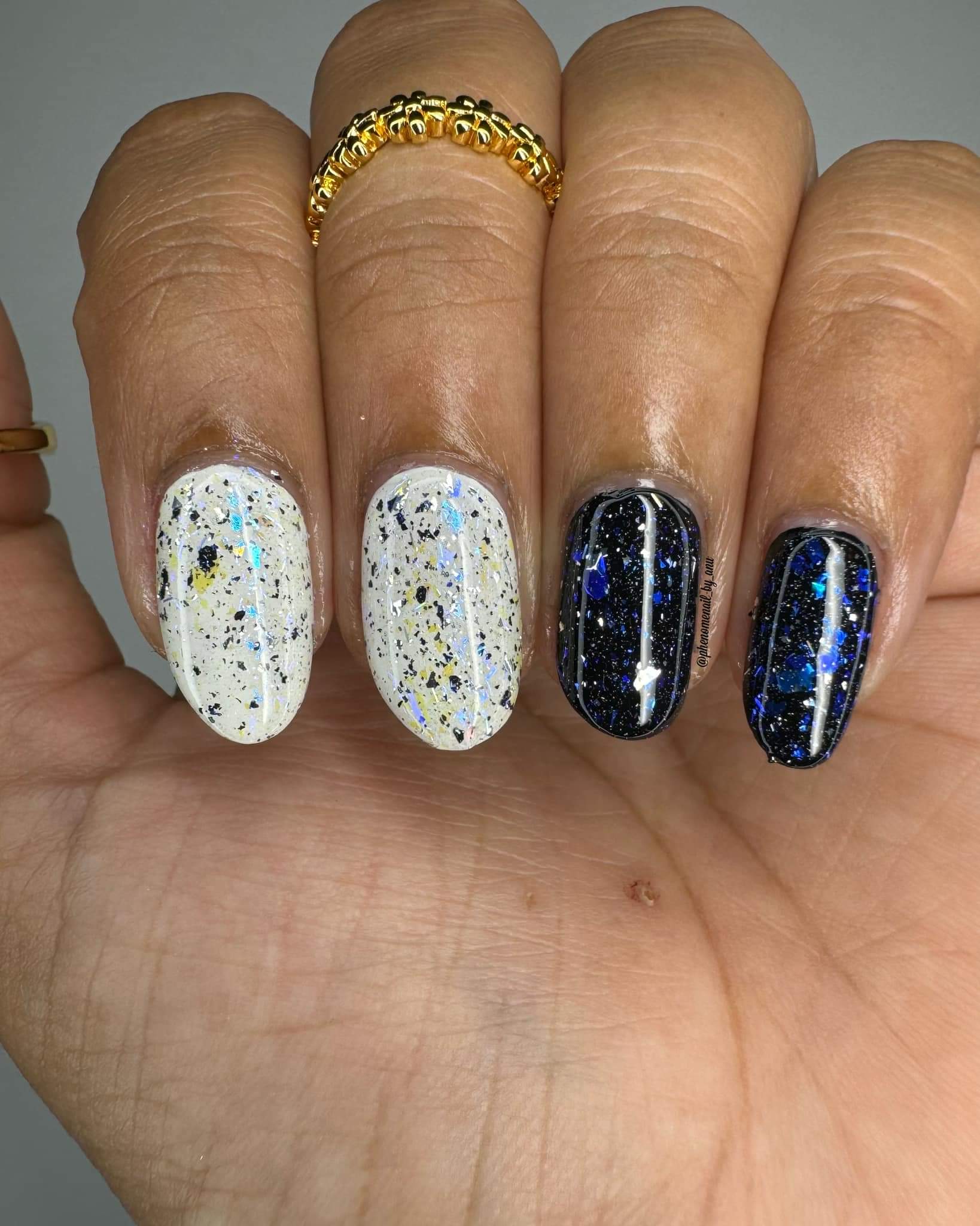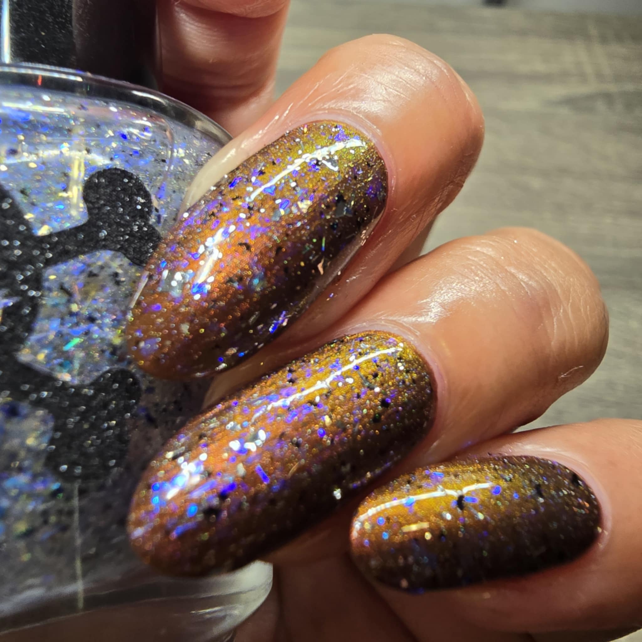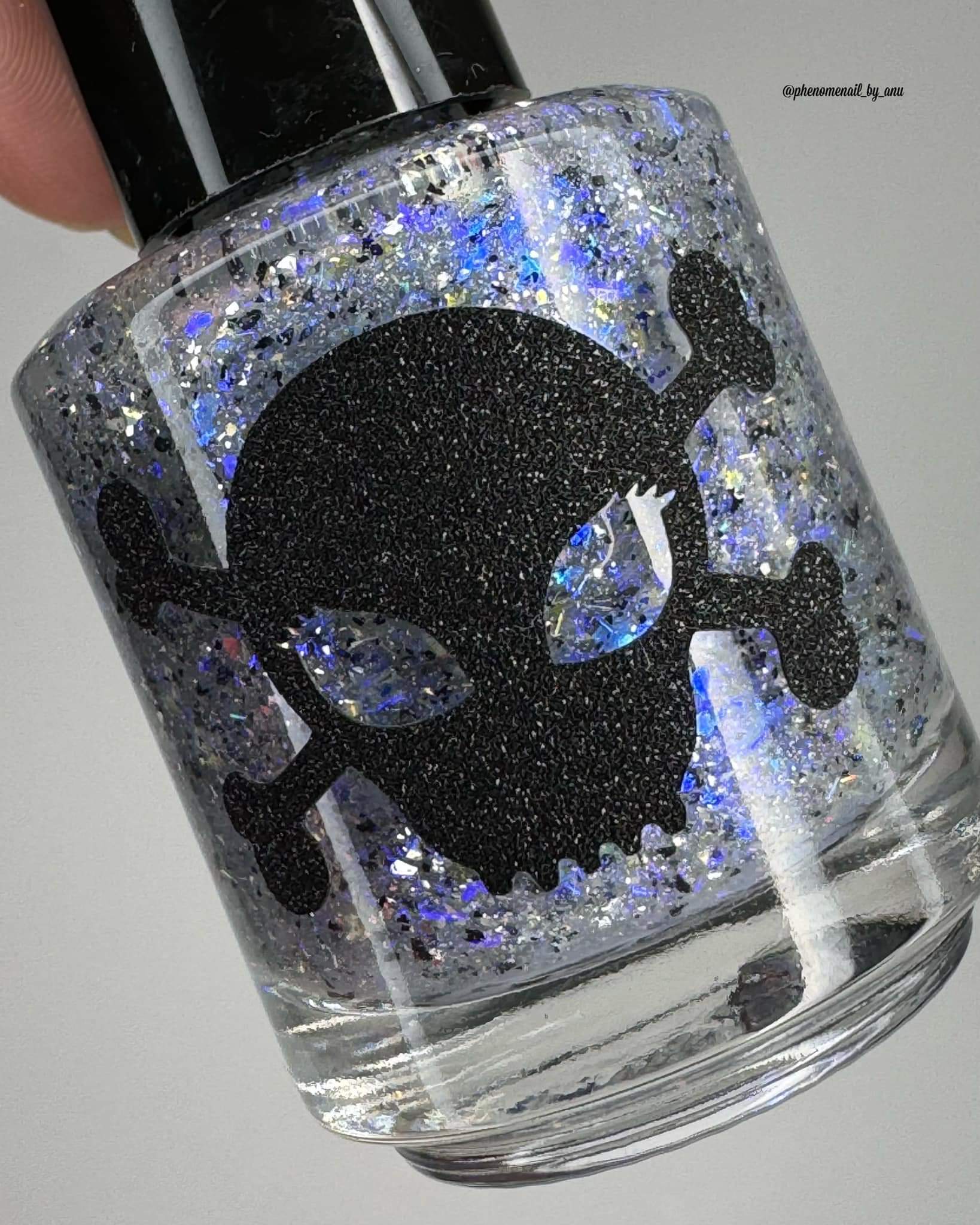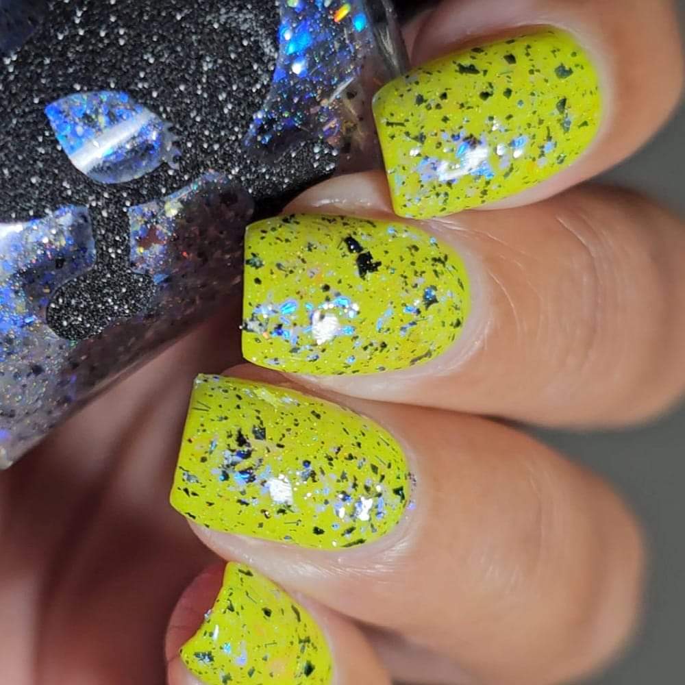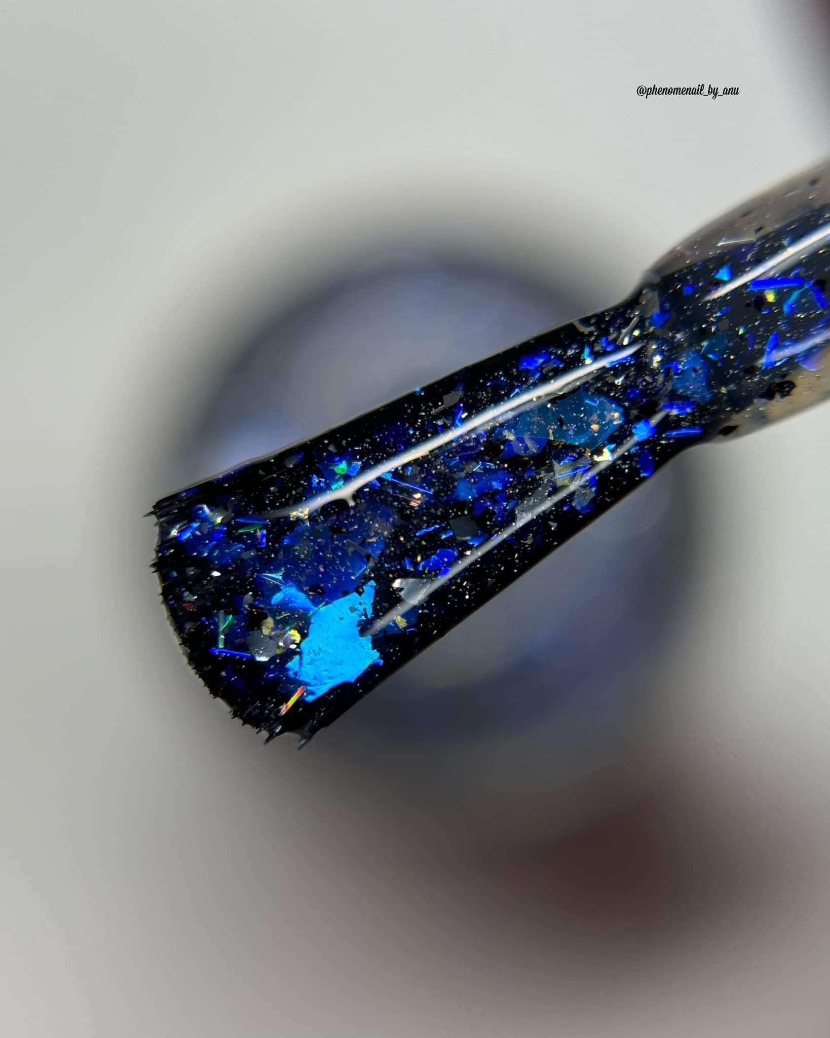 Description: Shifty blue to teal iridescent flake, black and silver flake. Wear alone or as a topper