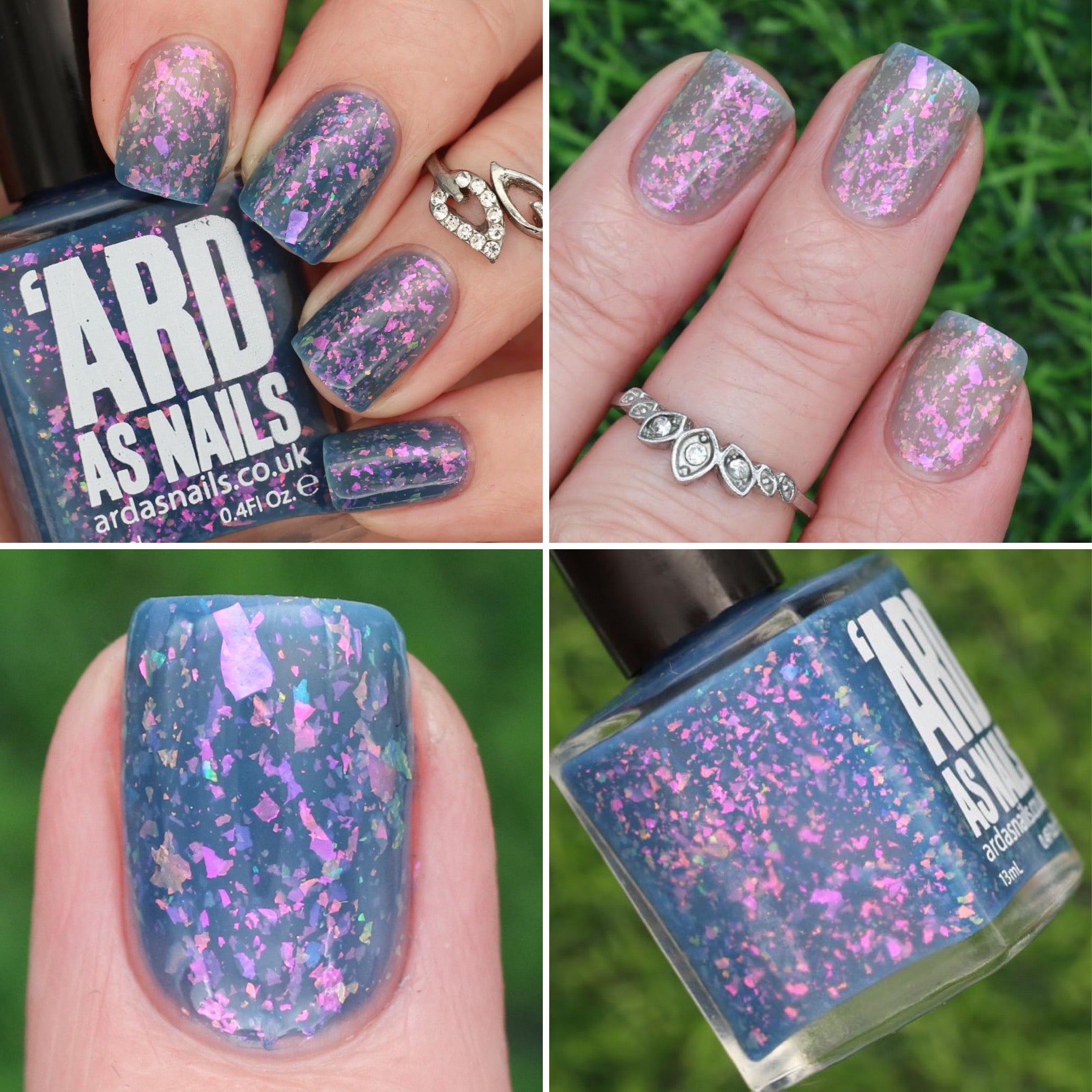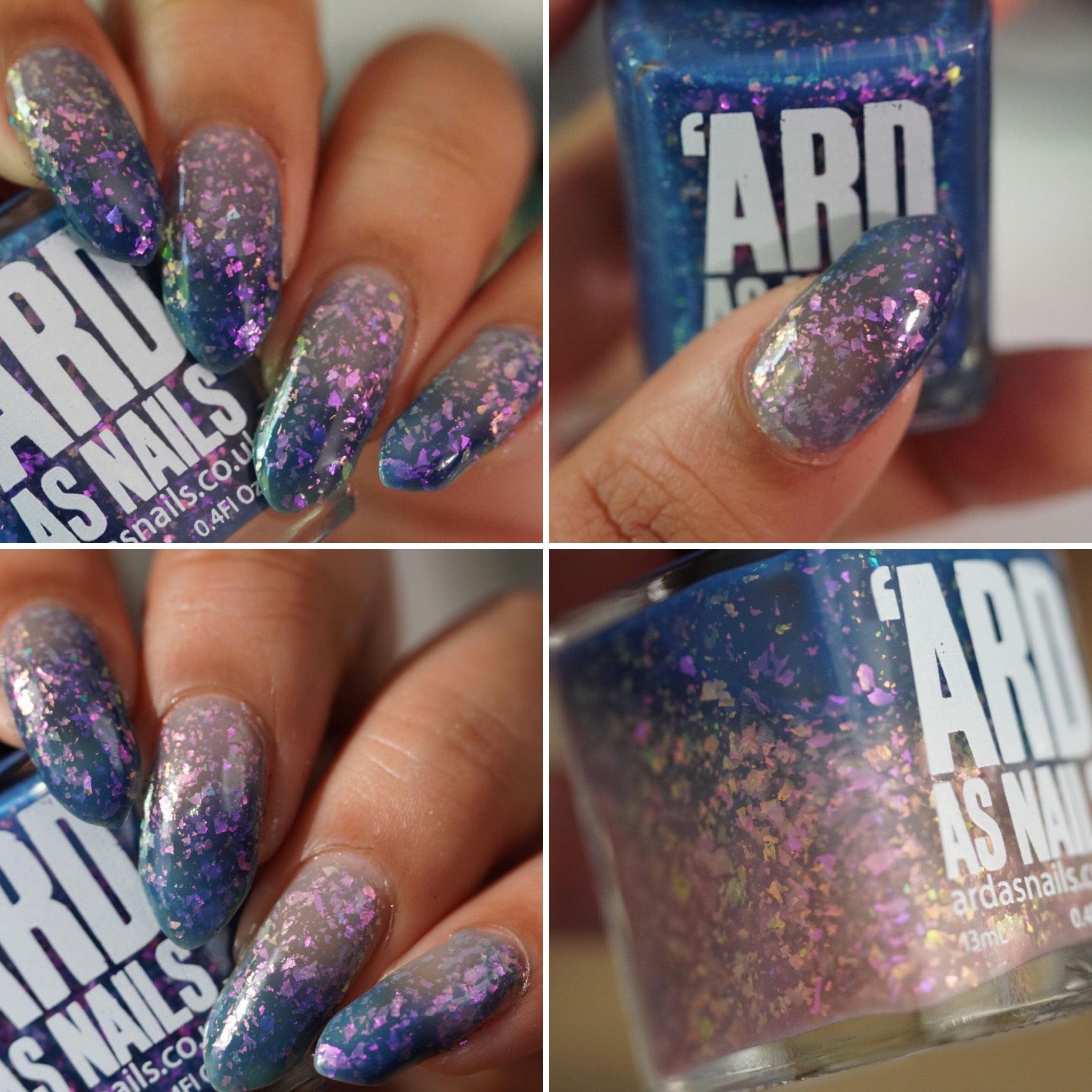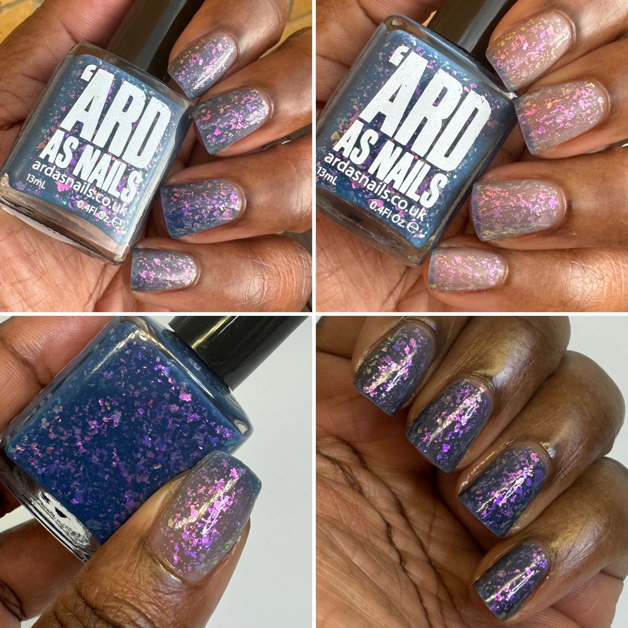 Description: This polish is a blue to vanilla thermal packed with pink and purple chameleon flakes