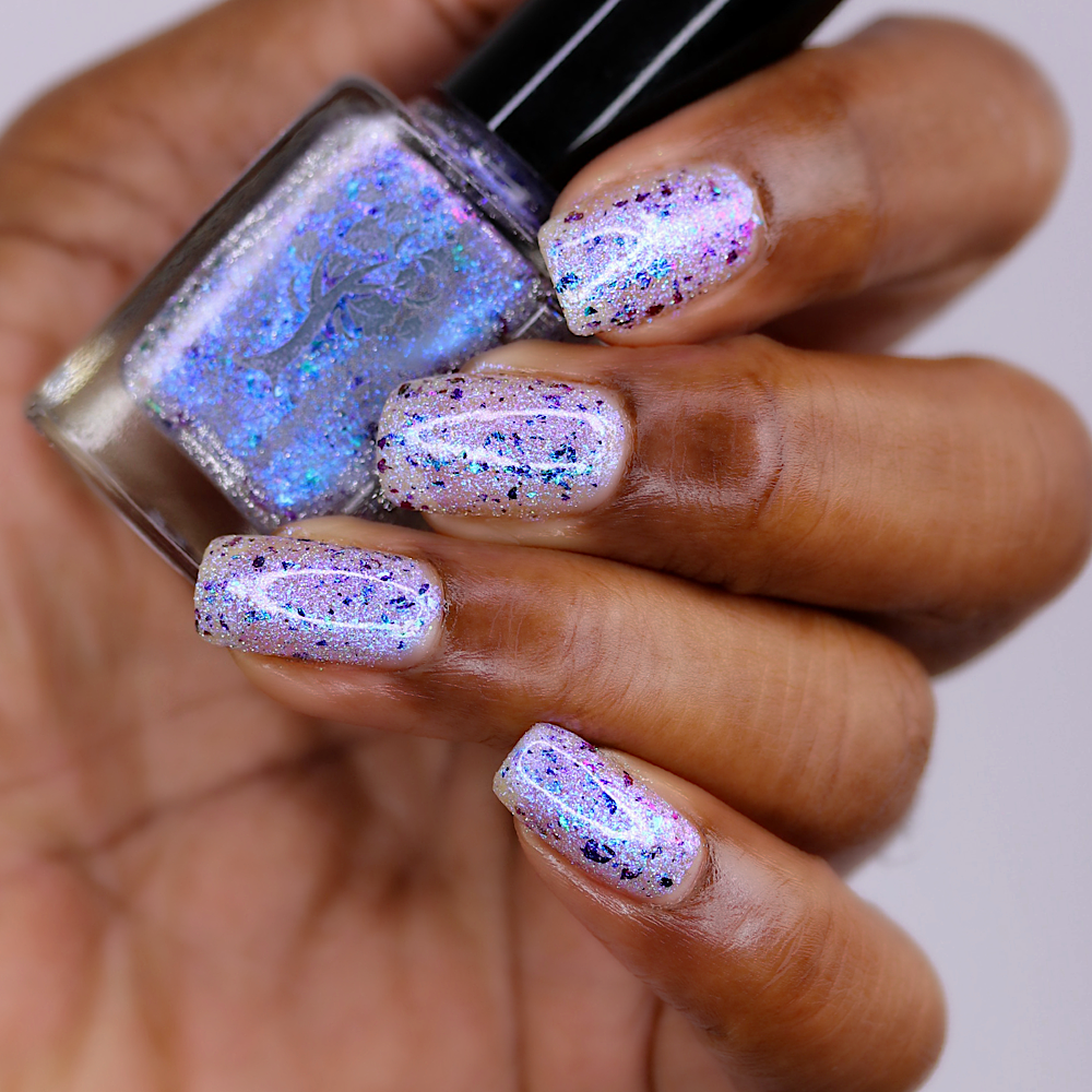 Description: A purple/blue/pink shimmer with silence reflective glitter and purple/blue multichrome flakes.