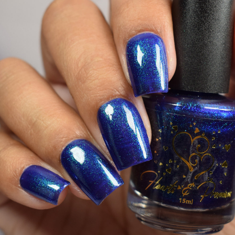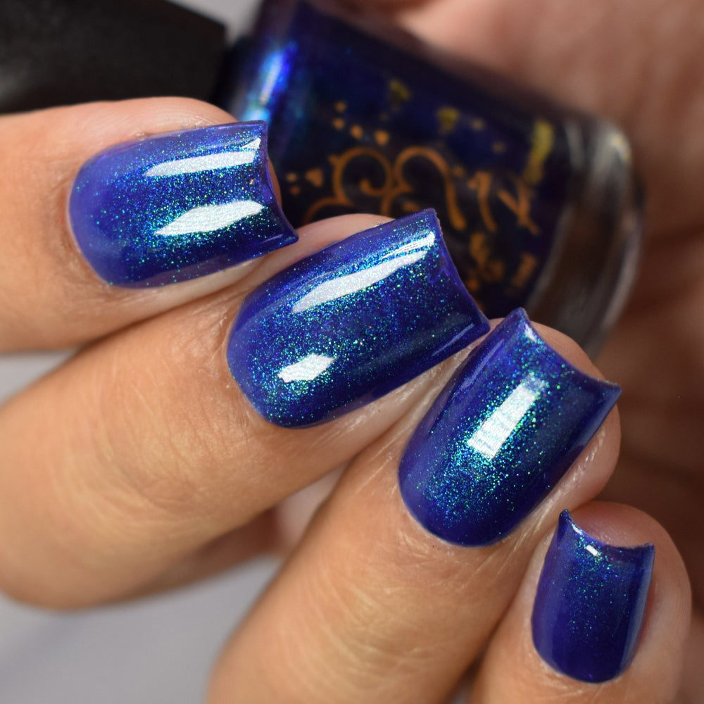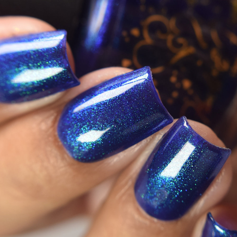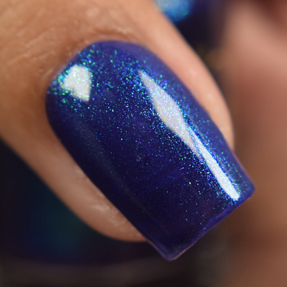 Description: This polish is a blurple base with green and purple shifting chameleon shimmer